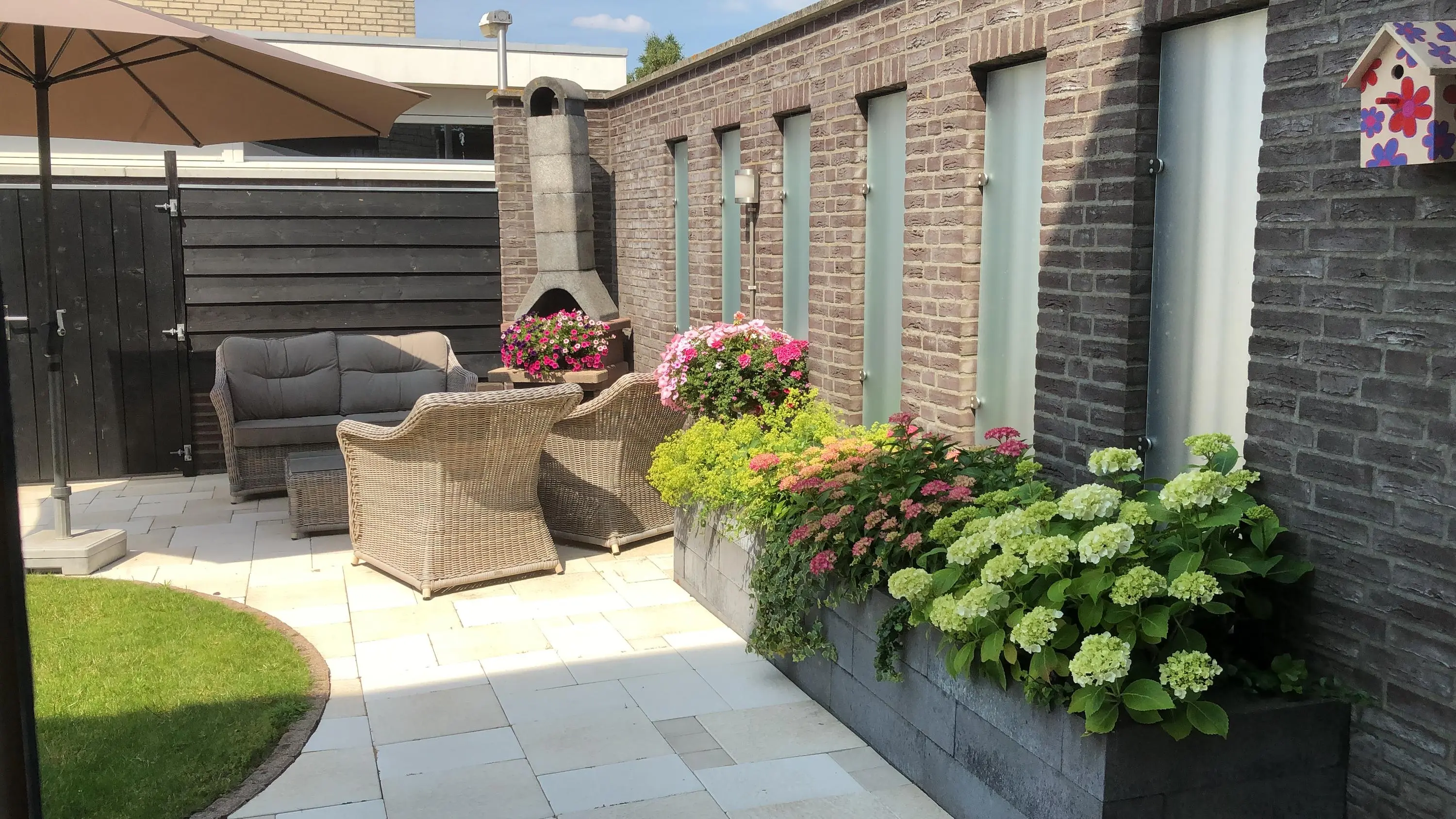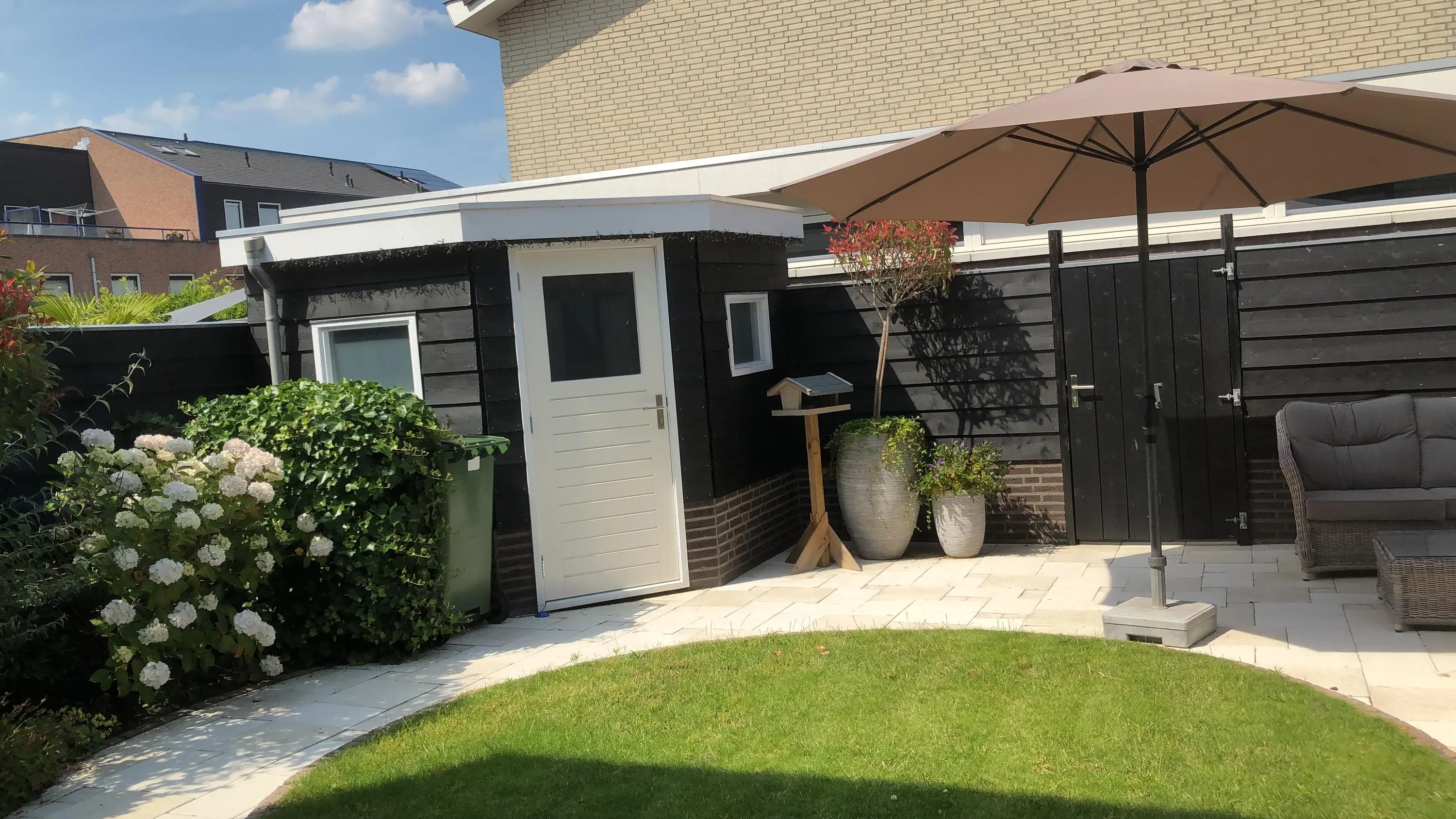 De achtertuin heeft een verzorgde en sfeervolle uitstraling. In het midden ligt een mooi groen gazon, omringd door beplanting en een plantenbak die samen voor een natuurlijke, rustige sfeer zorgen. De ruimte leent zich uitstekend voor het creëren van een fijne zitplek waar je heerlijk kunt genieten van de buitenlucht. Achter in de tuin bevindt zich een berging met elektra en ook hier is een buitenkraan aanwezig. Via de achterom is de tuin bovendien gemakkelijk bereikbaar.