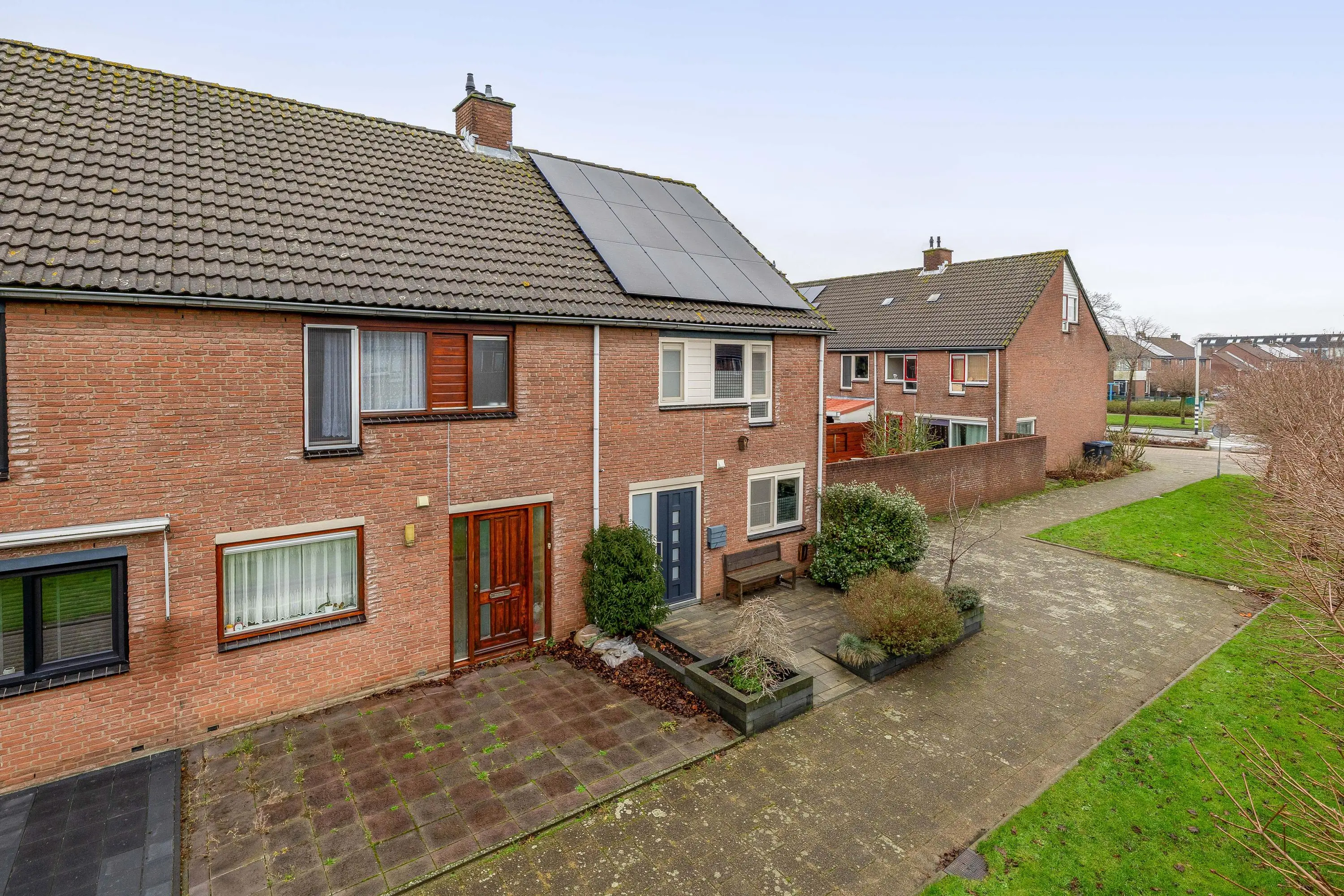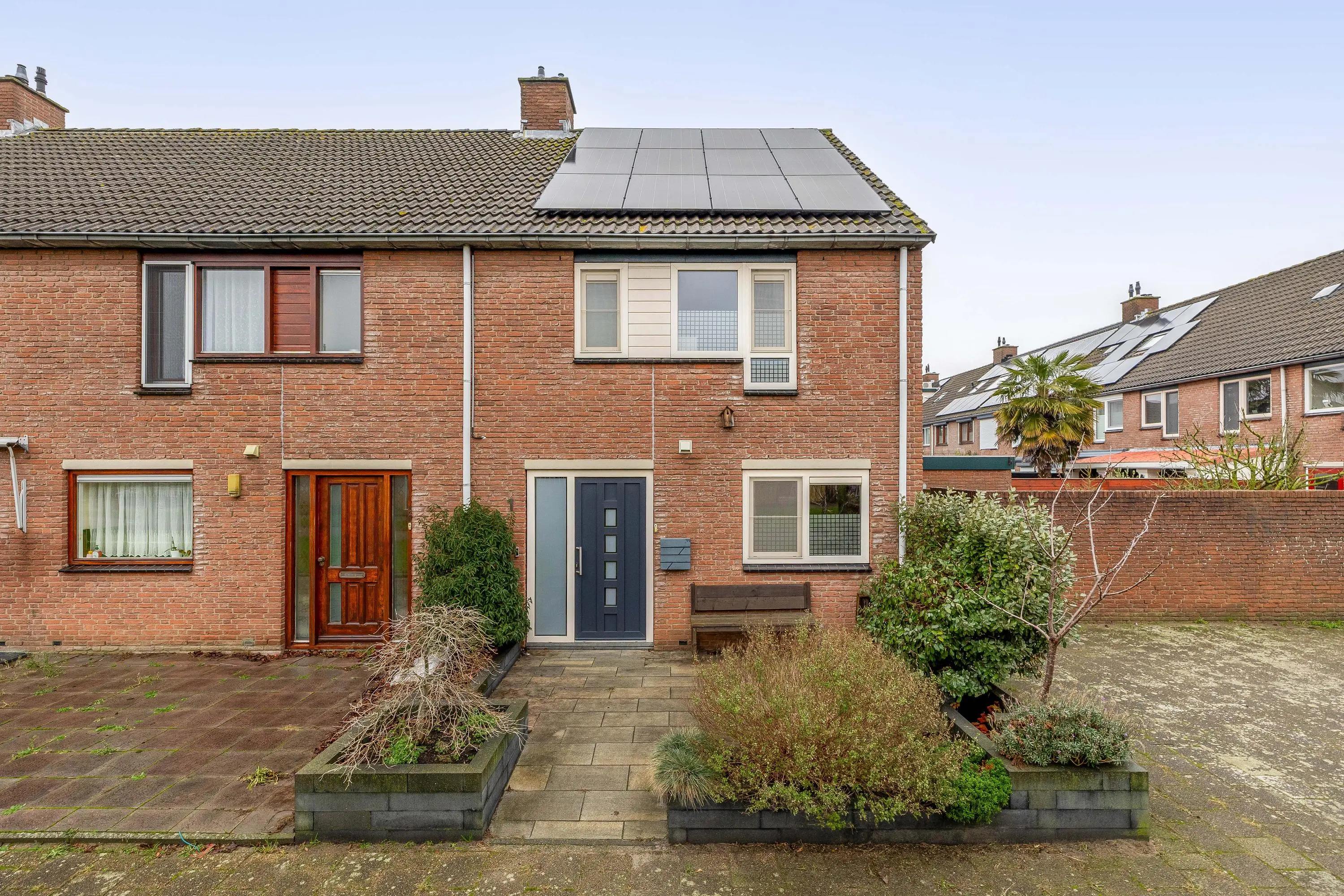 De voortuin is volledig bestraat en afgewerkt met plantenbakken voor een groene uitstraling.