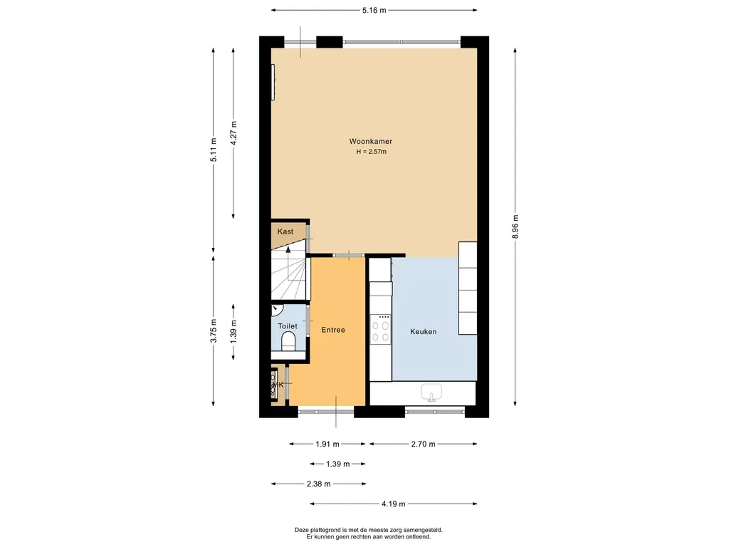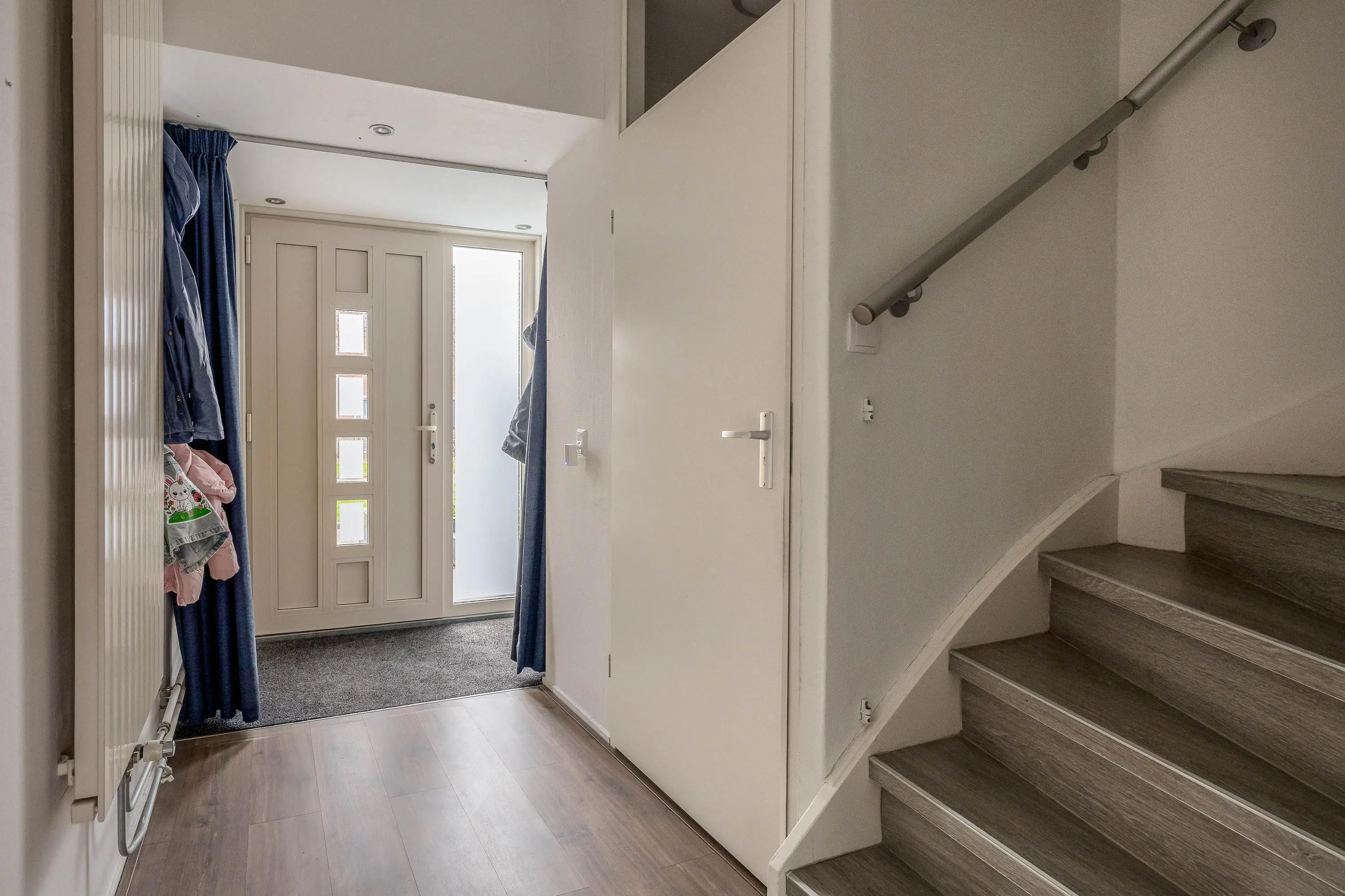Bij binnenkomst betreedt u de hal, welke is voorzien van een nette laminaatvloer die doorloopt over de gehele begane grond. In de hal bevinden zich de meterkast, een separaat toilet met fonteintje en de trapopgang naar de eerste verdieping.