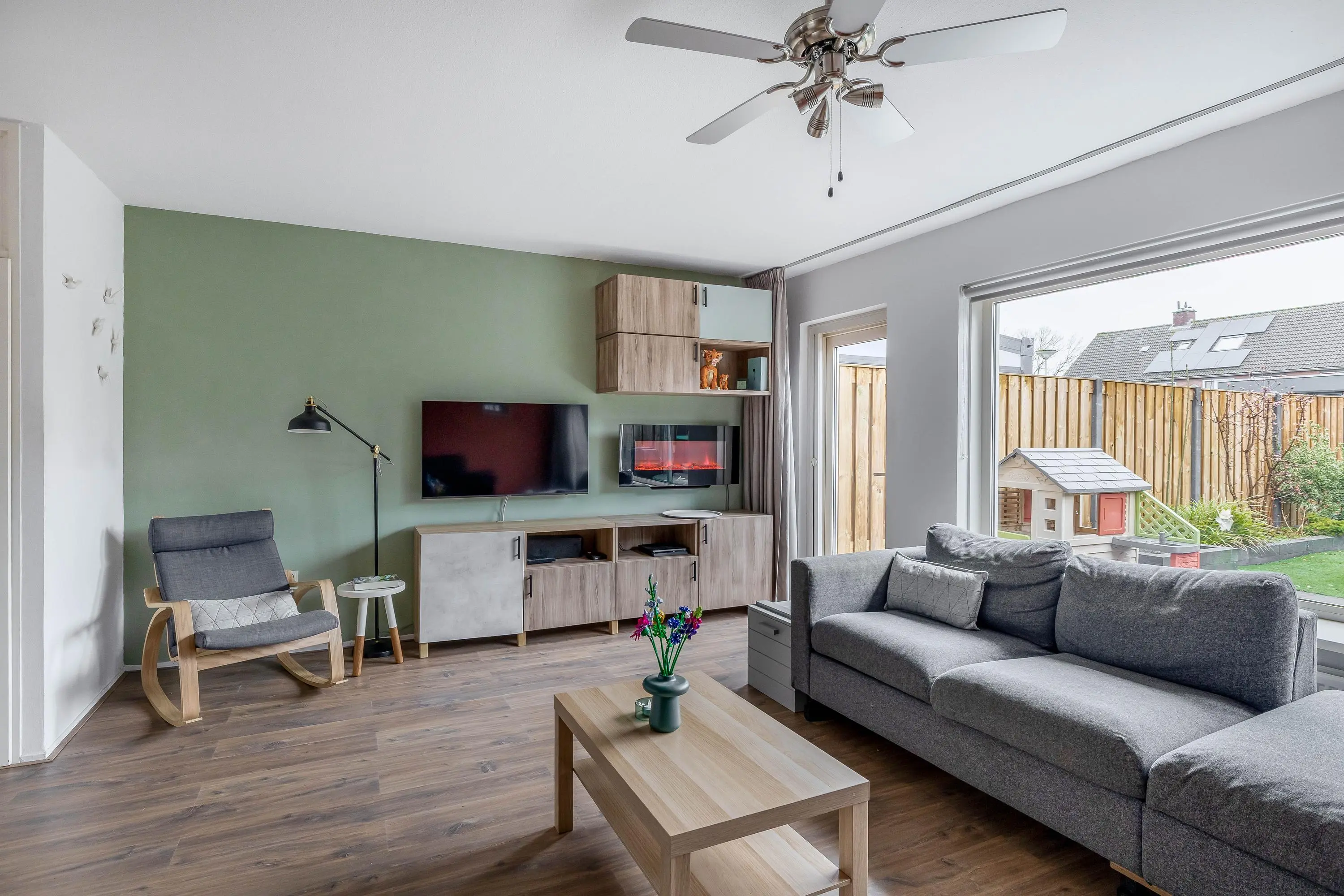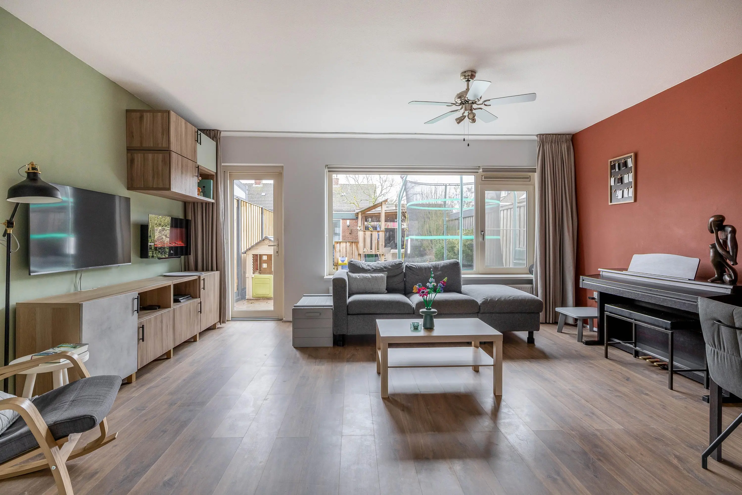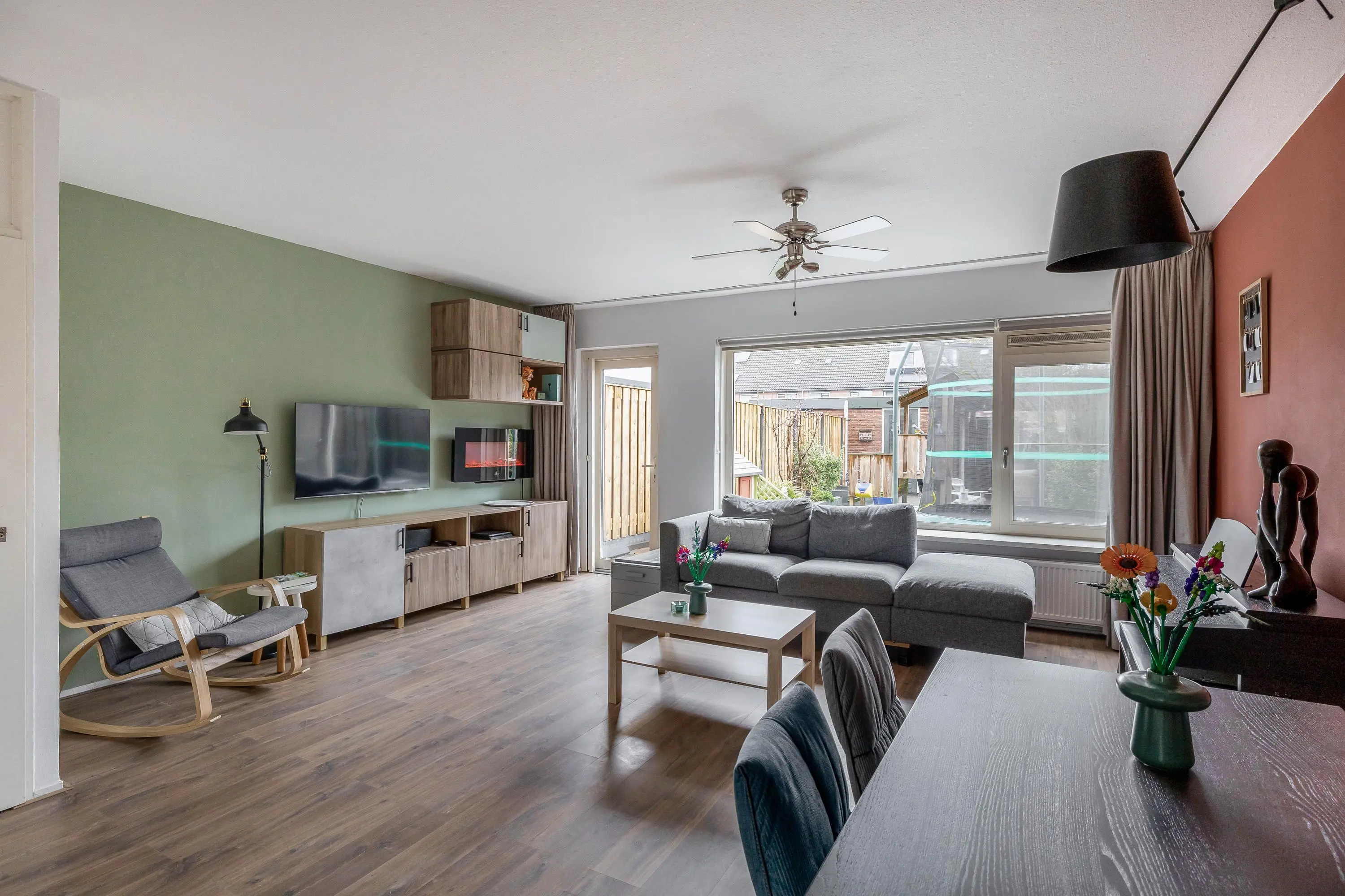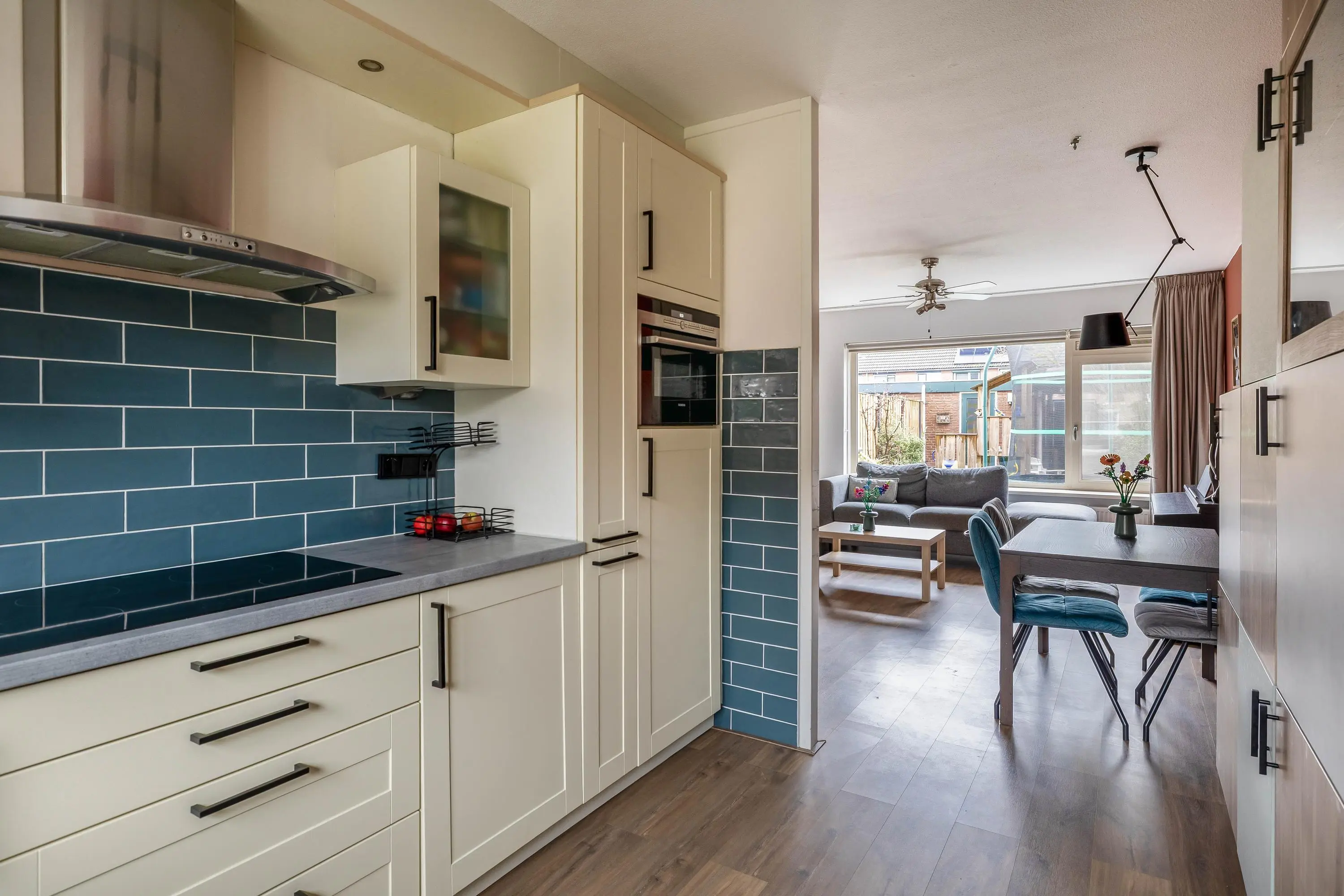 De ruime living geniet van veel natuurlijk daglicht dankzij het grote raam aan de achterzijde, dat is voorzien van een elektrisch zonnescherm wat zorgt voor extra comfort en een aangenaam binnenklimaat. De woonkamer is afgewerkt met strak gestucte wanden en biedt volop ruimte voor een gezellige zithoek. Middels een enkele deur heeft u toegang tot de royale achtertuin. Daarnaast is er voldoende ruimte voor een aparte eethoek en beschikt de woonkamer over een praktische provisiekast.