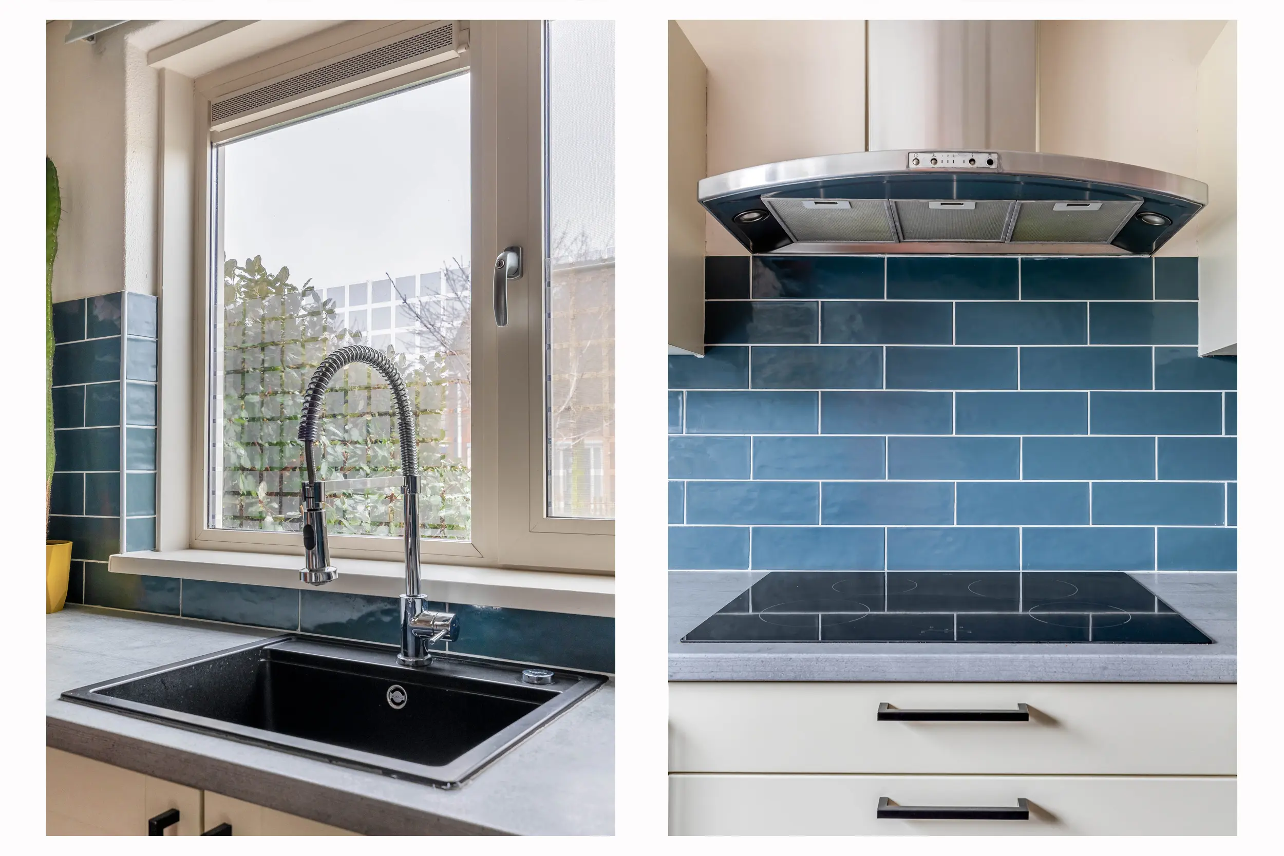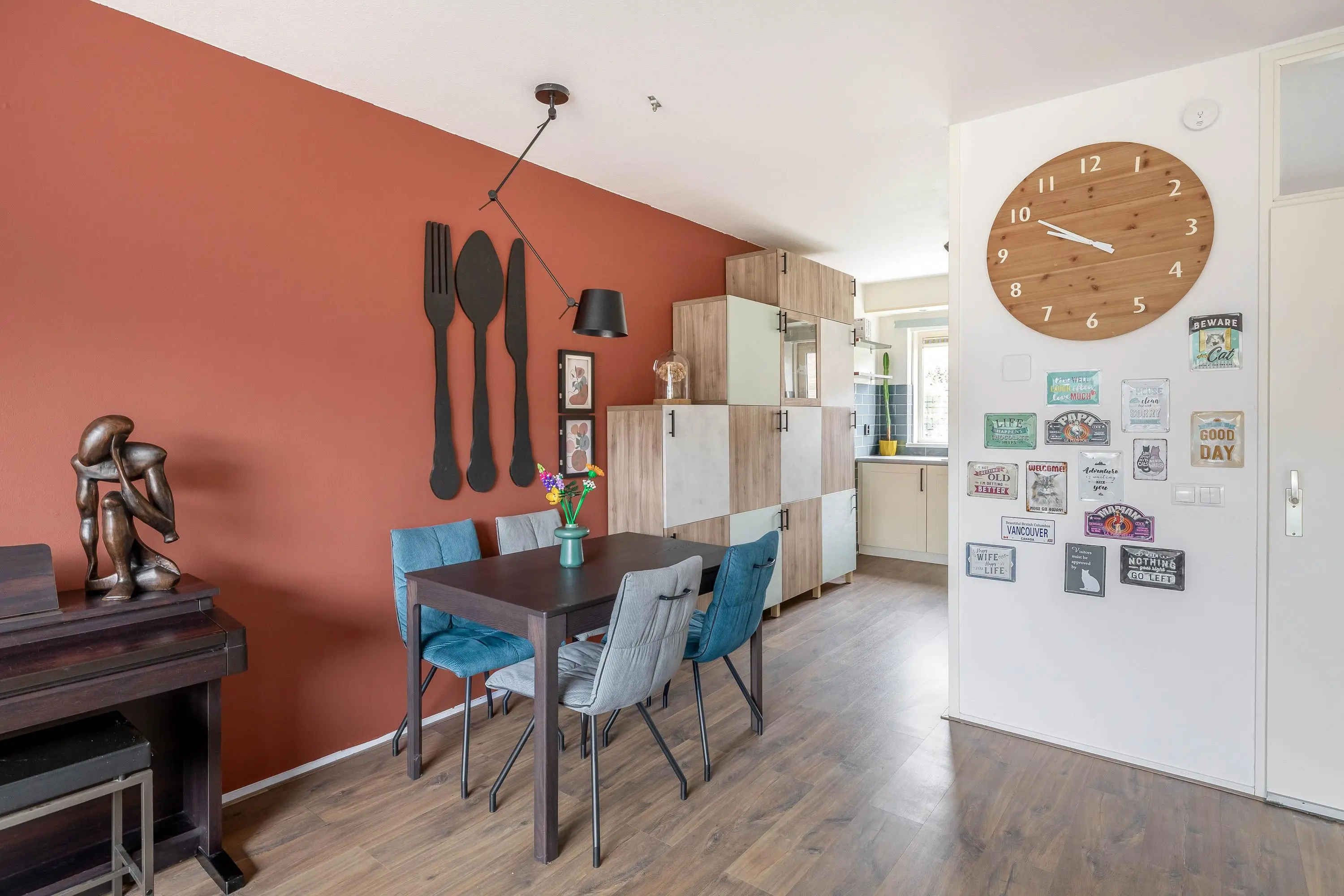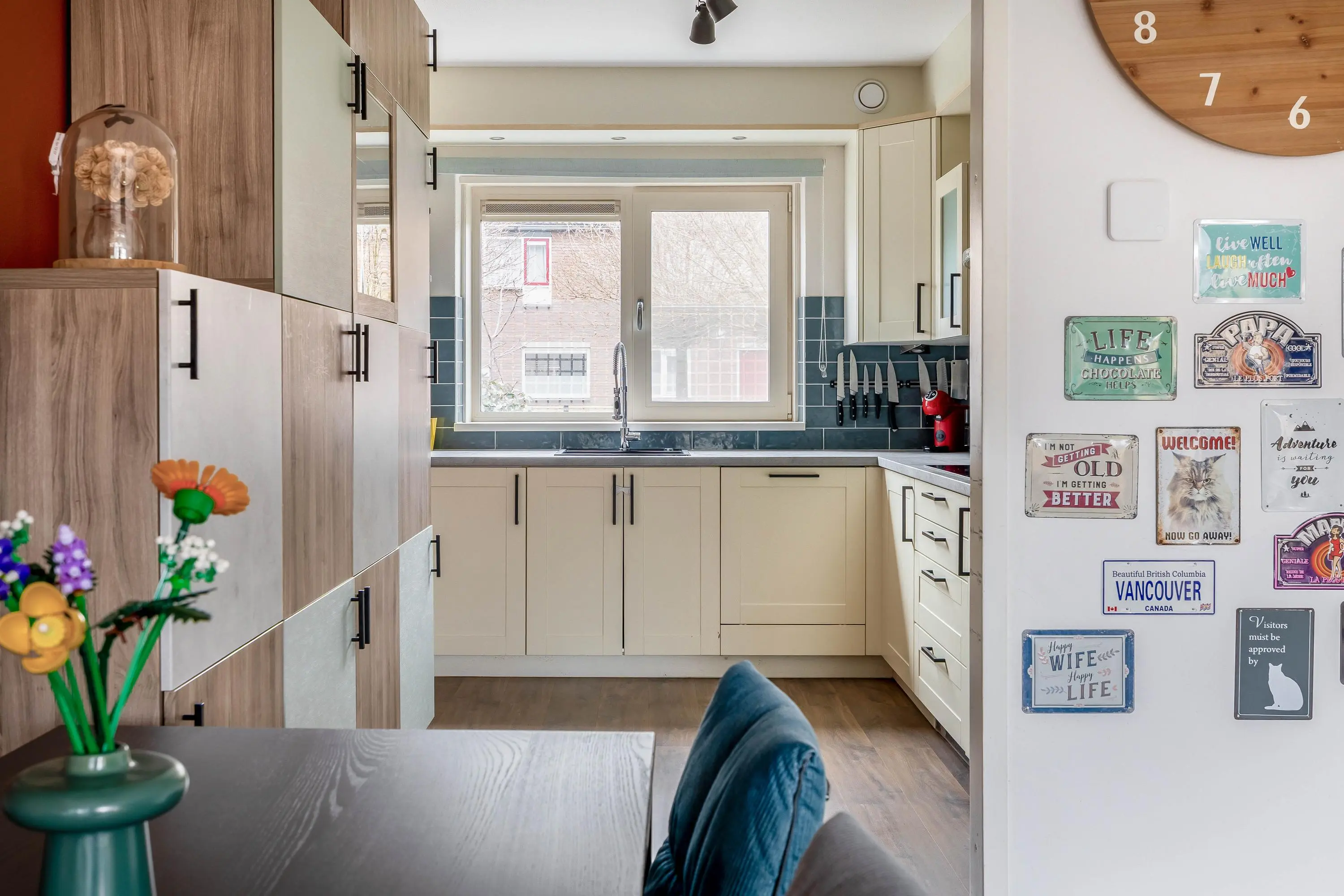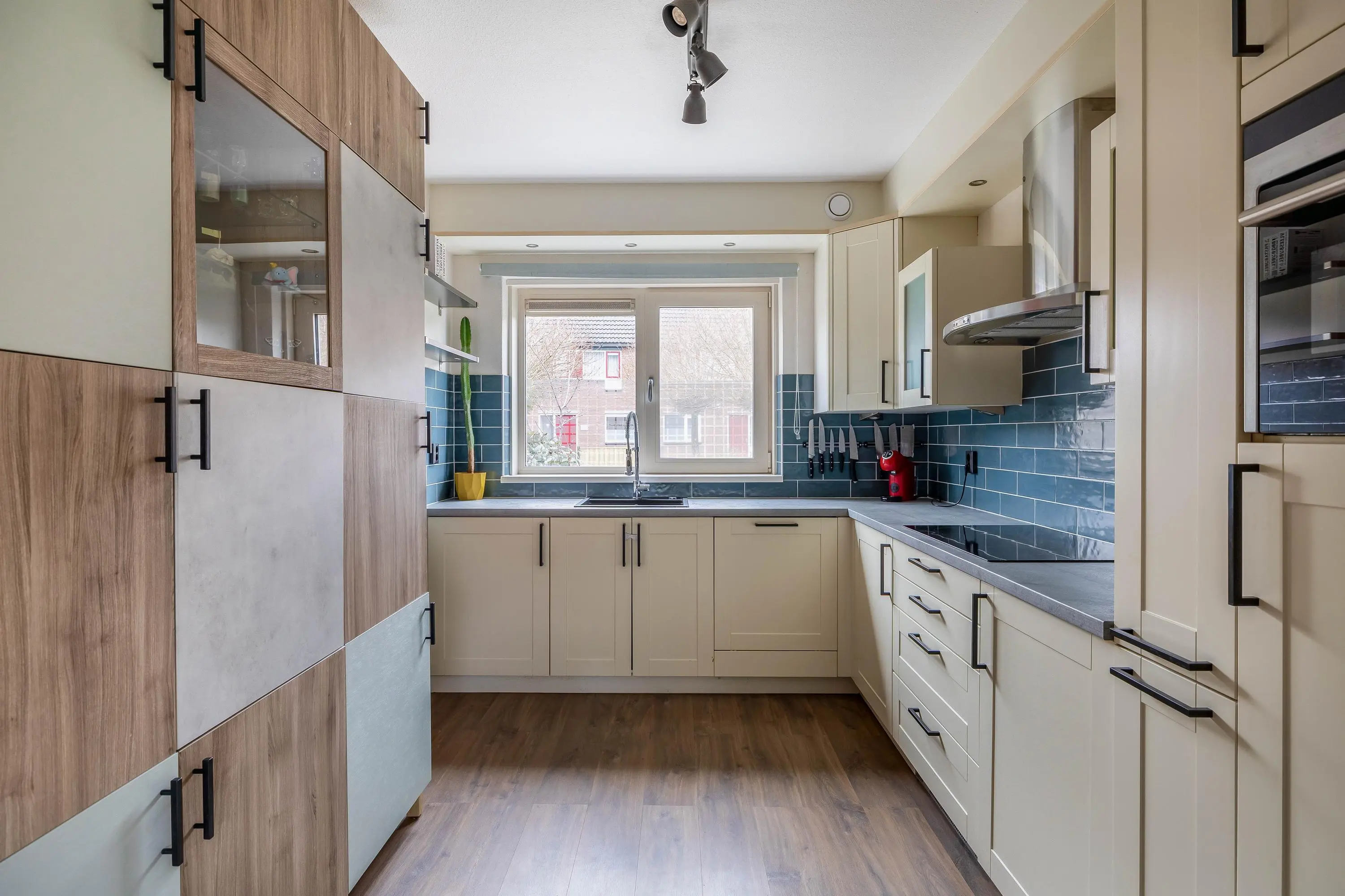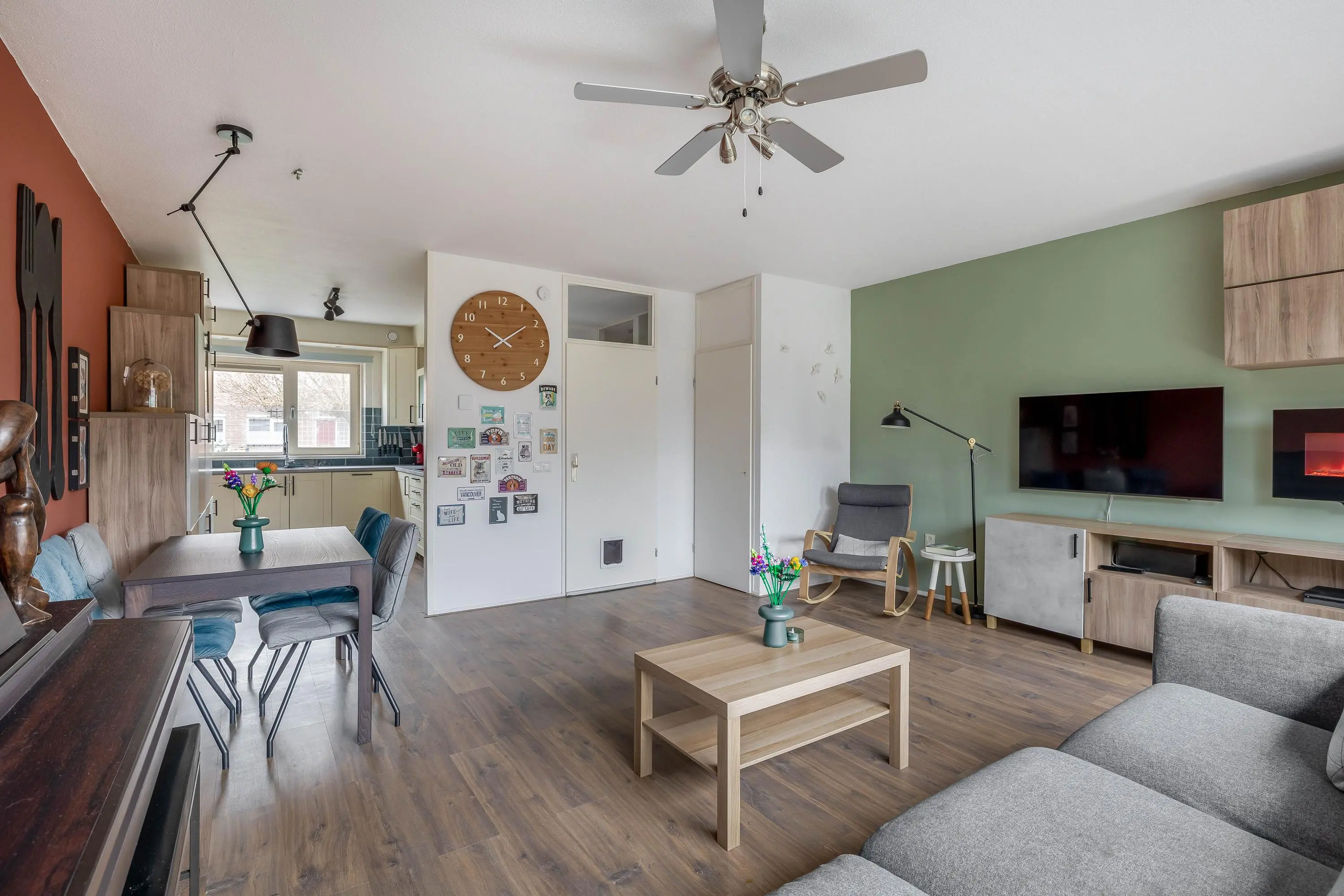 De ruime living geniet van veel natuurlijk daglicht dankzij het grote raam aan de achterzijde, dat is voorzien van een elektrisch zonnescherm wat zorgt voor extra comfort en een aangenaam binnenklimaat. De woonkamer is afgewerkt met strak gestucte wanden en biedt volop ruimte voor een gezellige zithoek. Middels een enkele deur heeft u toegang tot de royale achtertuin. Daarnaast is er voldoende ruimte voor een aparte eethoek en beschikt de woonkamer over een praktische provisiekast.