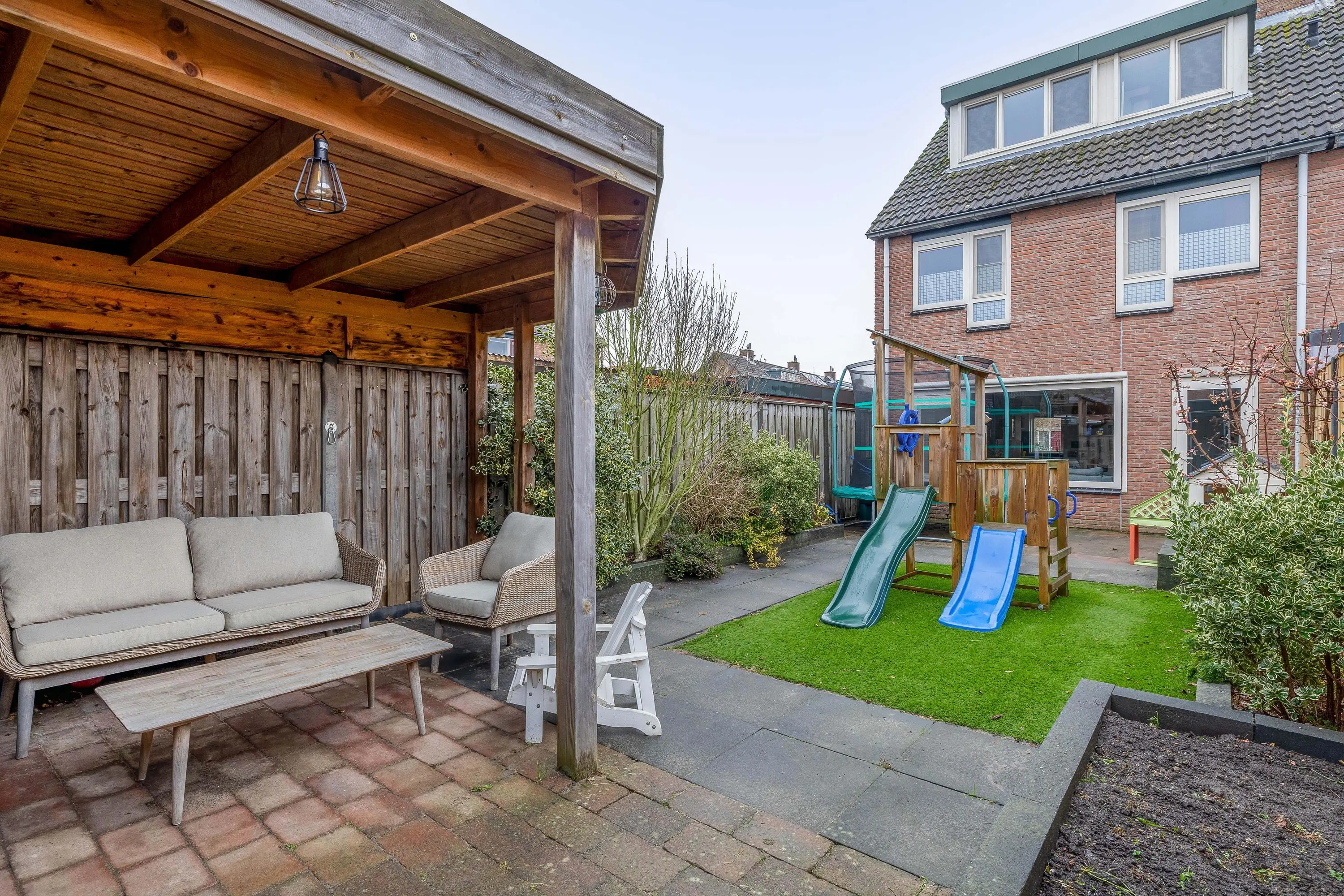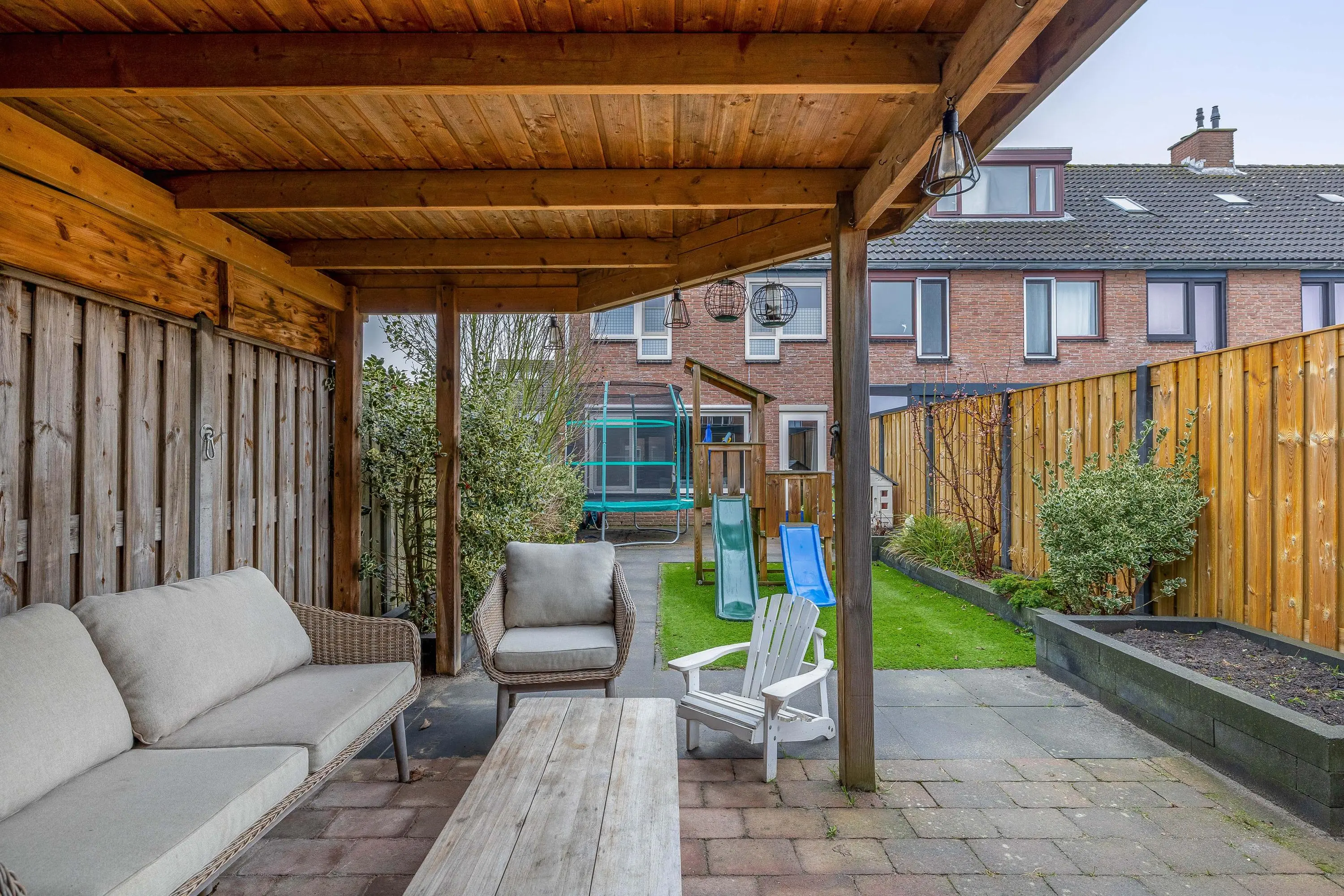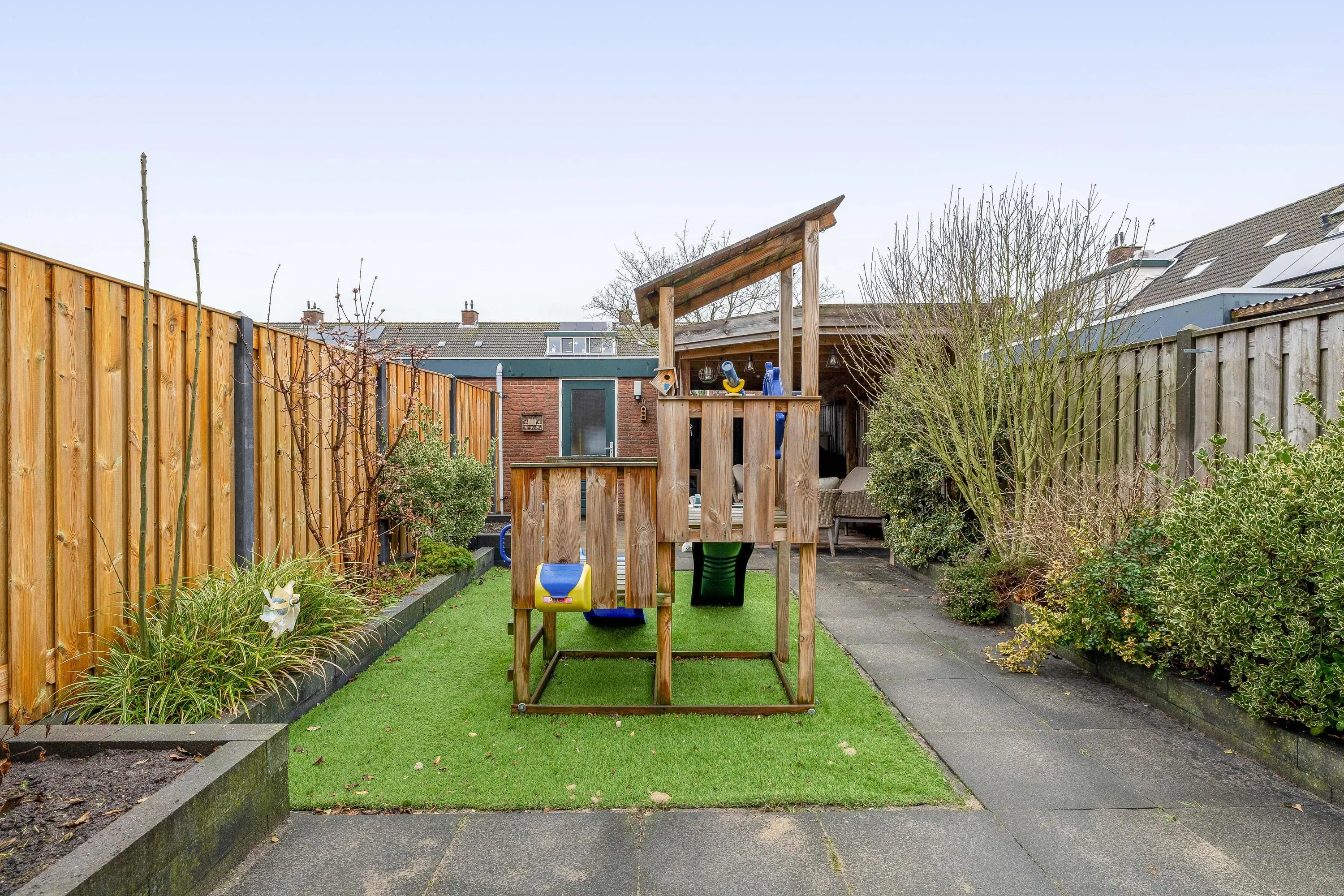 De achtertuin is eveneens grotendeels bestraat en beschikt over een klein kunstgrasgazon en plantenbakken langs de zijkanten. Achterin de tuin bevindt zich een fijne overkapping, ideaal voor het creëren van een gezellige, overdekte zit plek. Tevens is hier een stenen berging aanwezig van circa 7m², voorzien van elektra. De tuin is bereikbaar via een achterom.