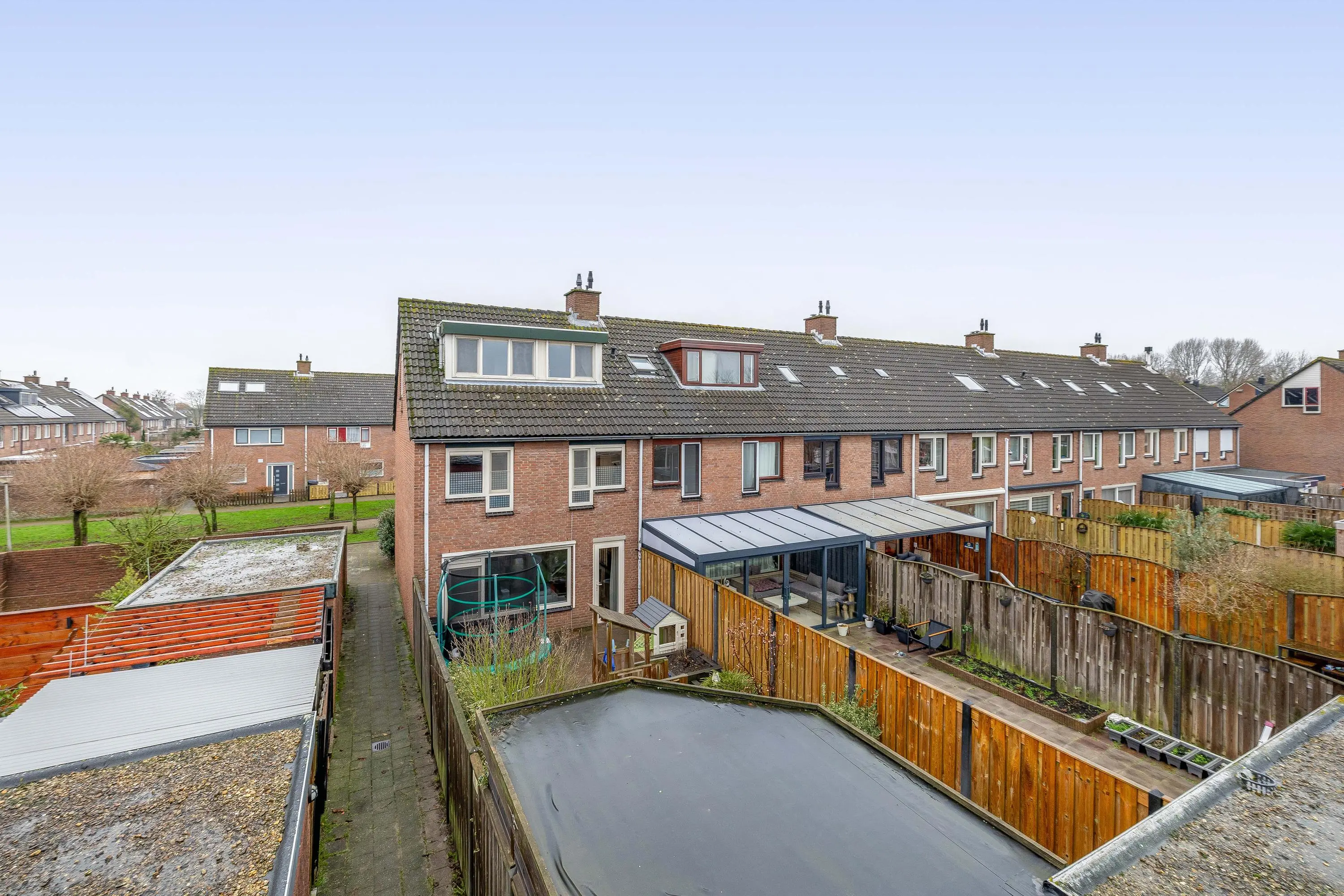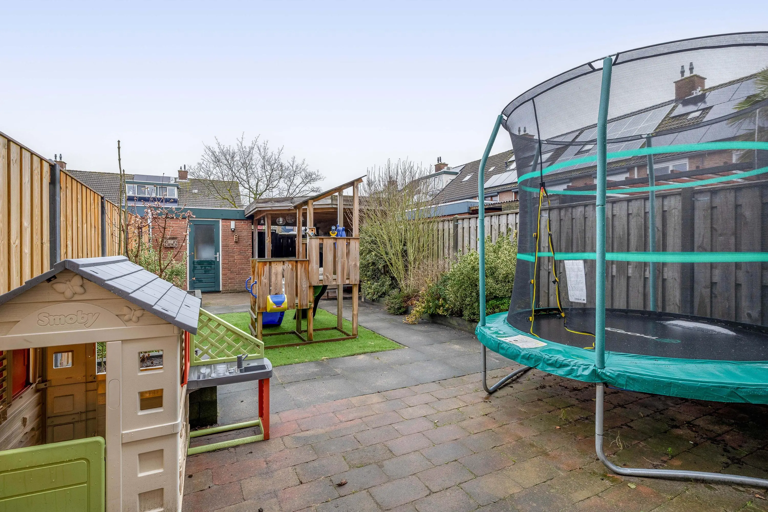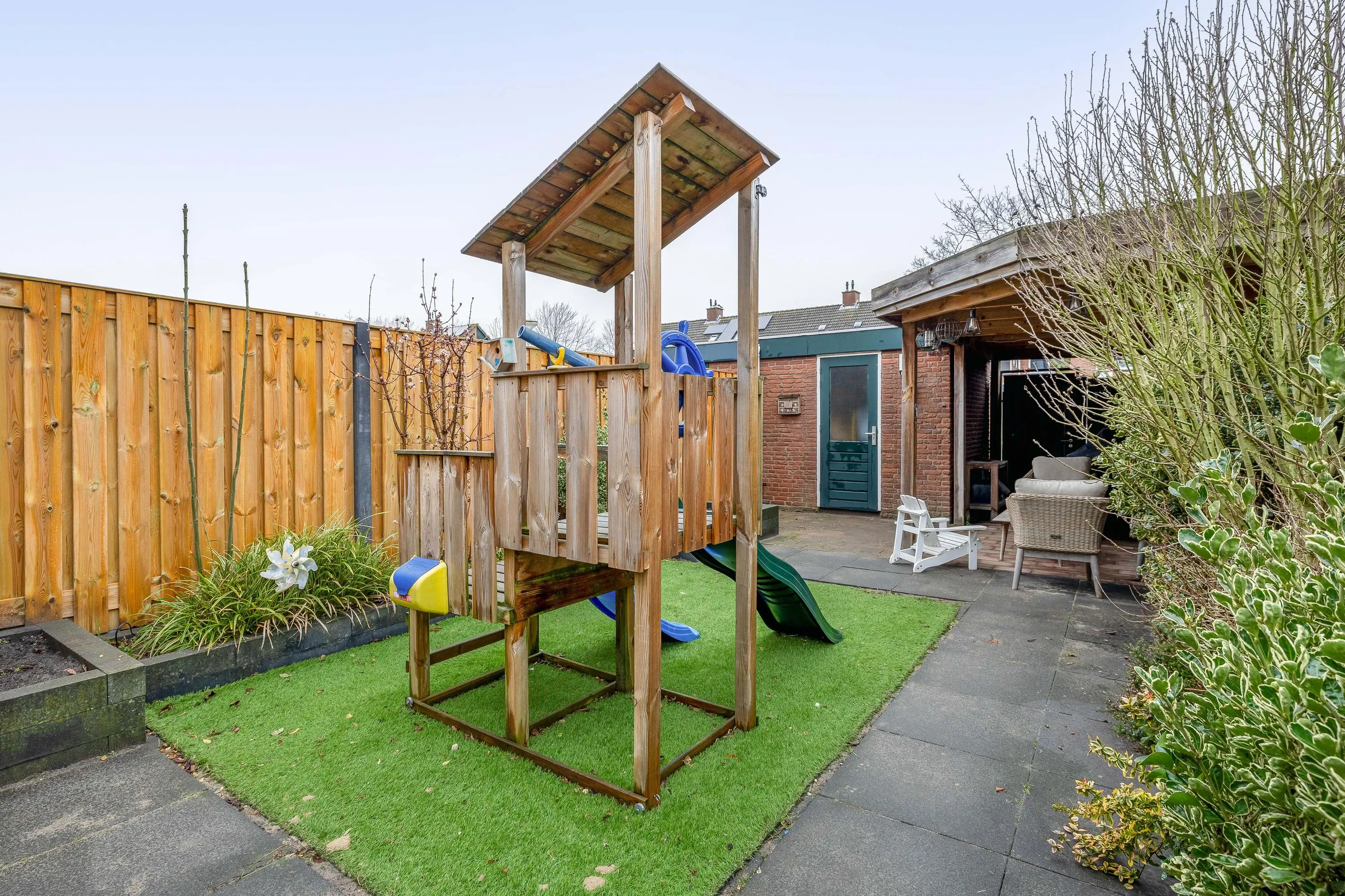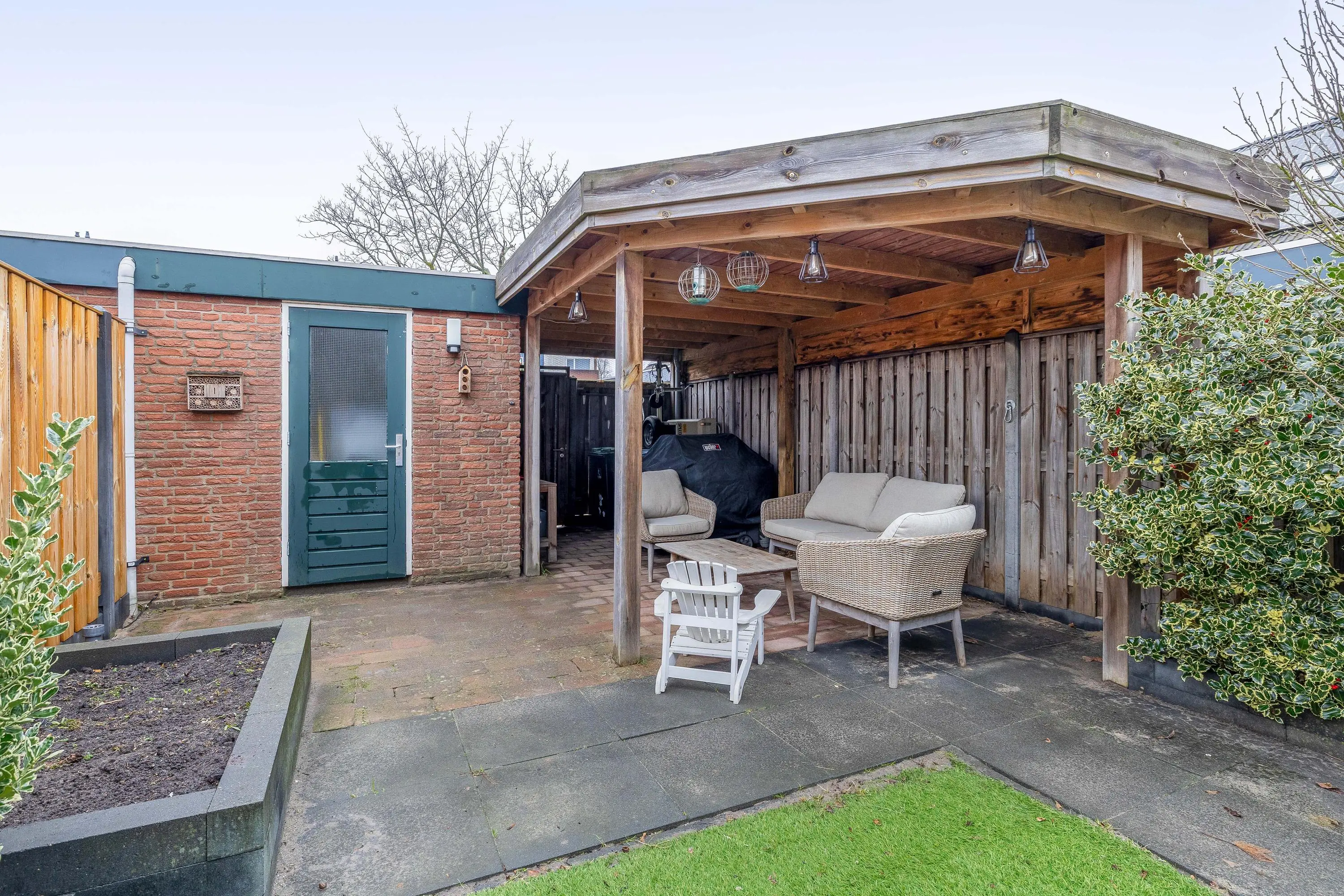 De achtertuin is eveneens grotendeels bestraat en beschikt over een klein kunstgrasgazon en plantenbakken langs de zijkanten. Achterin de tuin bevindt zich een fijne overkapping, ideaal voor het creëren van een gezellige, overdekte zit plek. Tevens is hier een stenen berging aanwezig van circa 7m², voorzien van elektra. De tuin is bereikbaar via een achterom.