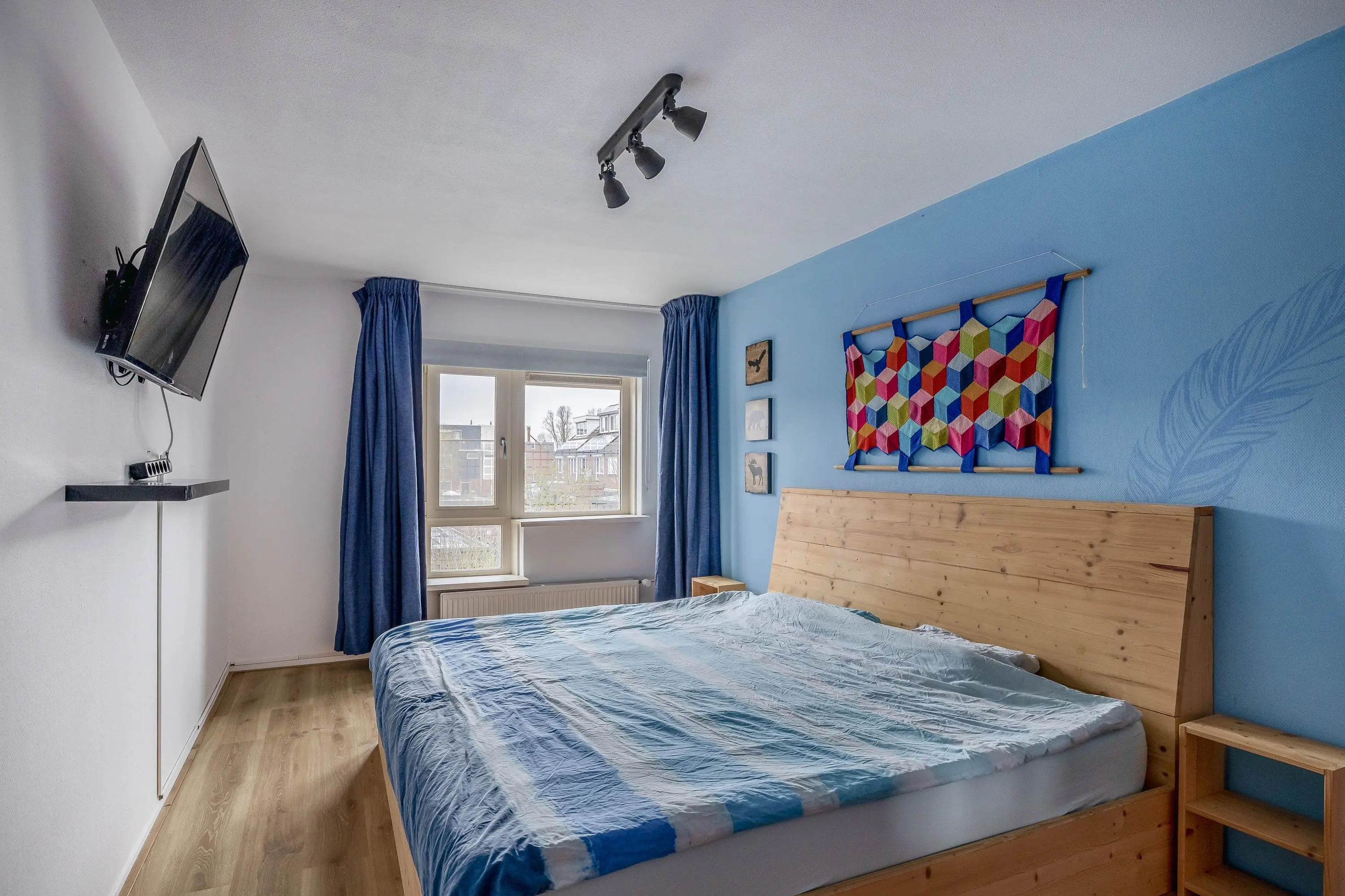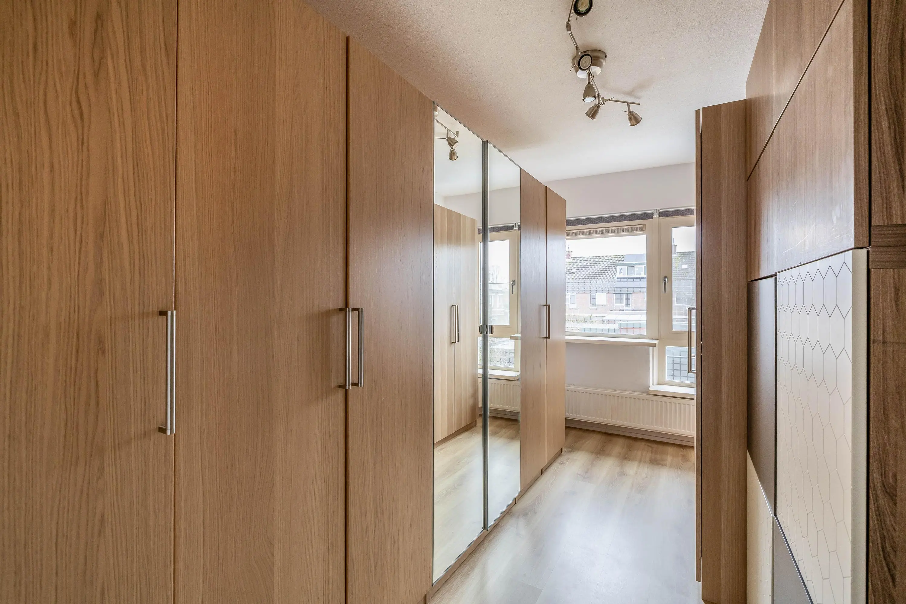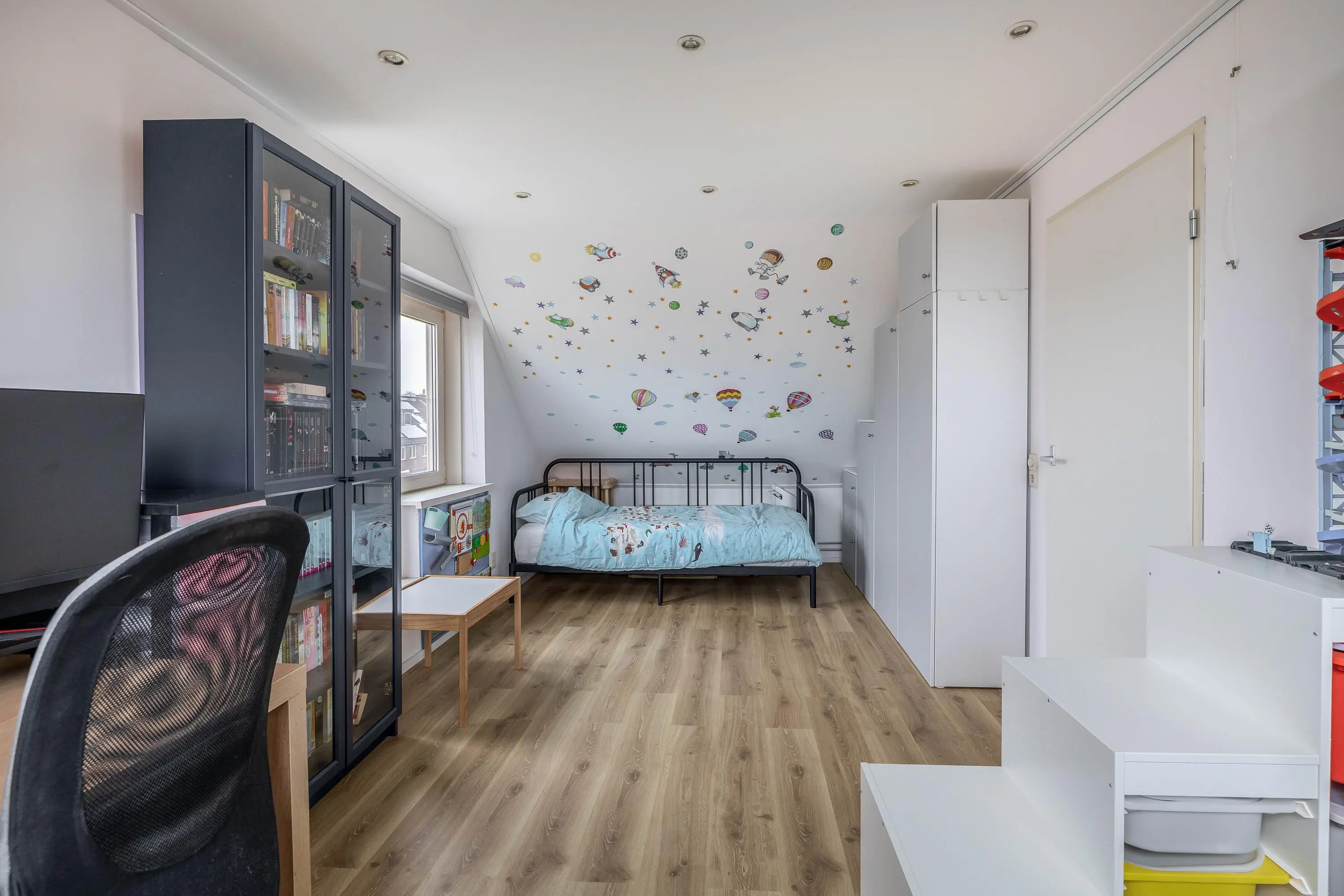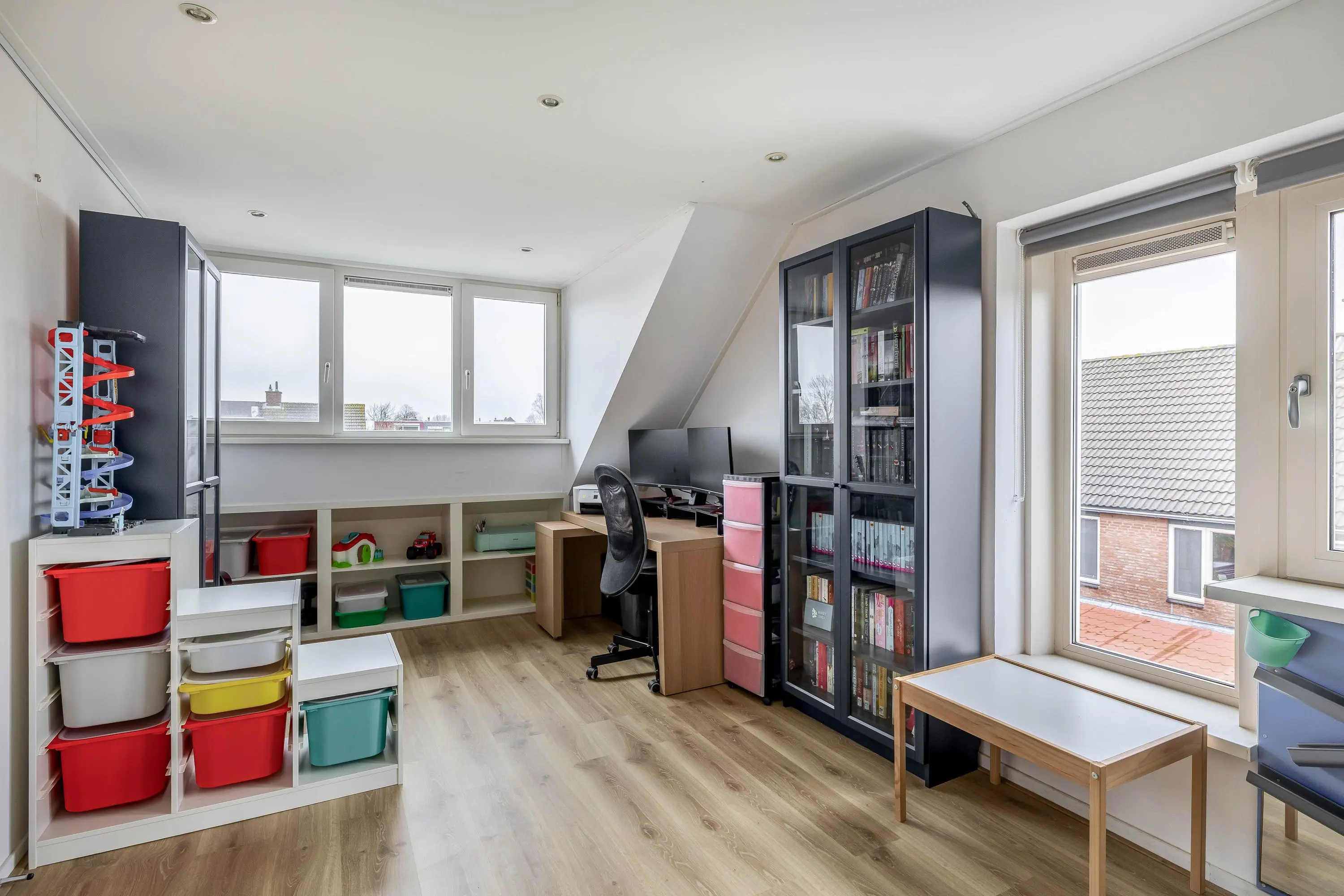 De vierde slaapkamer heeft een oppervlakte van circa 11,5m² en is voorzien van ingebouwde lichtspots in het plafond. Door de dakkapel is de kamer ruim en aangenaam licht. In de wand van de dakkapel is een praktische ingebouwde kastruimte gerealiseerd. De kamer is afgewerkt met strak gestucte en gesausde wanden en plafonds.