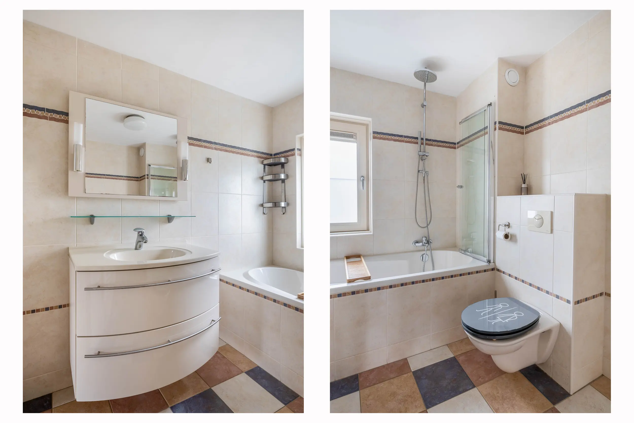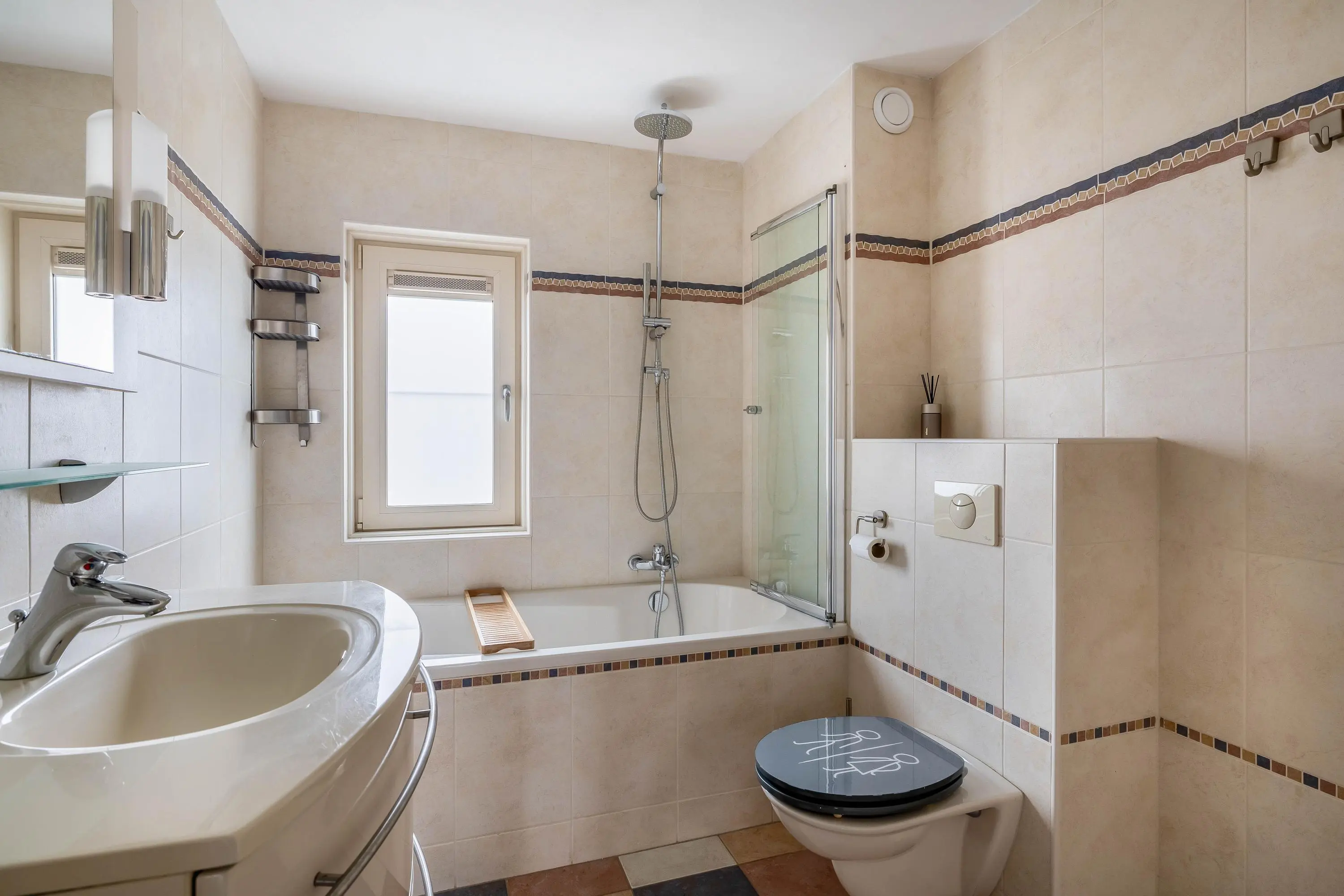 De volledig betegelde badkamer is voorzien van een ligbad met douchemogelijkheid, toilet en wastafelmeubel.