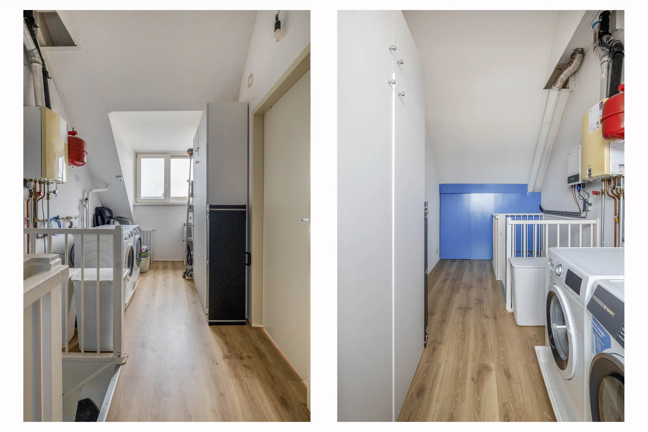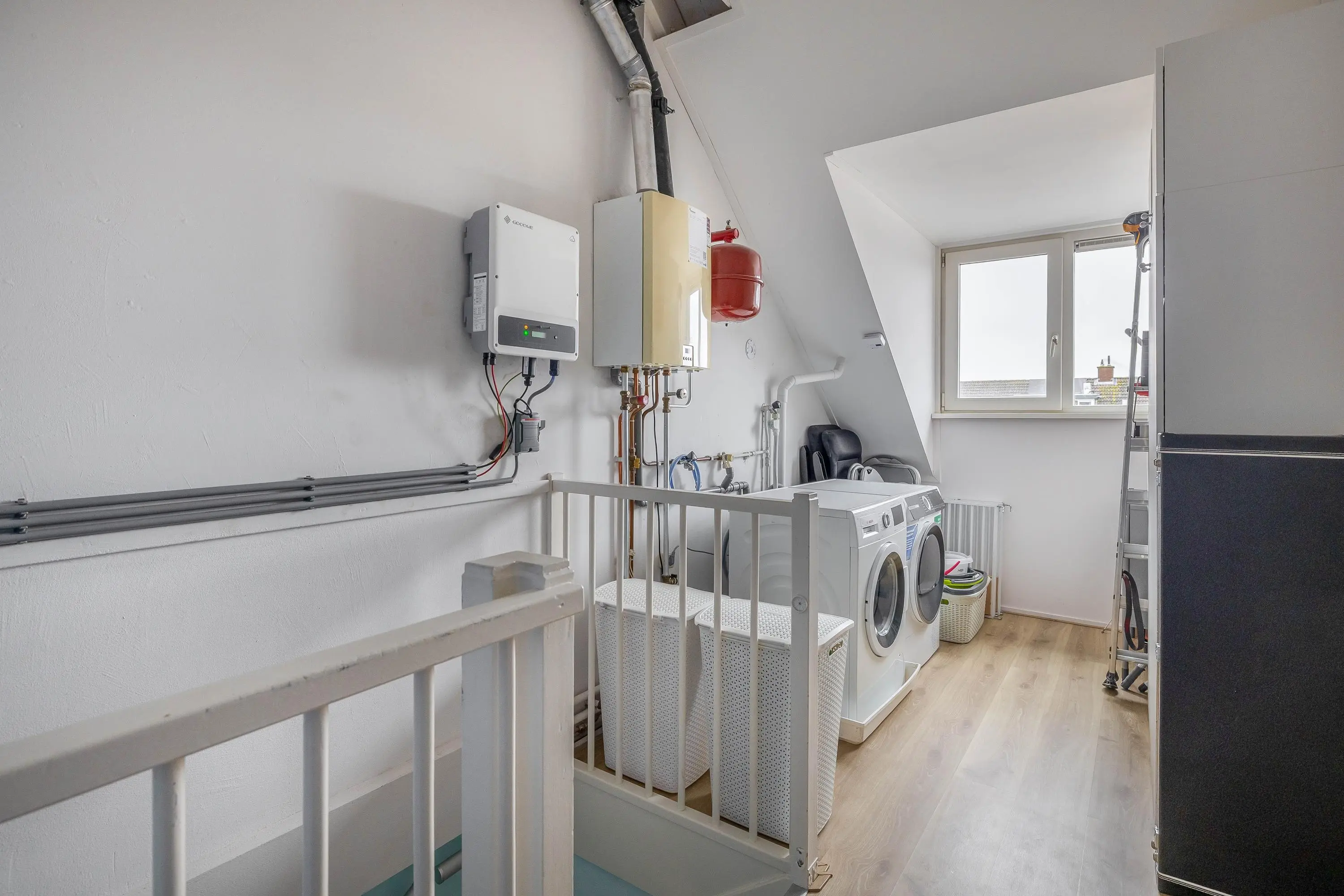 De overloop is afgewerkt met dezelfde laminaatvloer als op de eerste verdieping. Dankzij de aanwezige dakkapel, die volledig is voorzien van rolluiken, is de gehele verdieping vergroot en valt er prettig daglicht binnen. Op de overloop bevinden zich de cv-opstelling, de omvormer voor de zonnepanelen en de aansluitingen voor wasmachine en droger. Daarnaast is er extra bergruimte achter een knieschot.