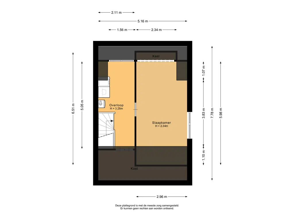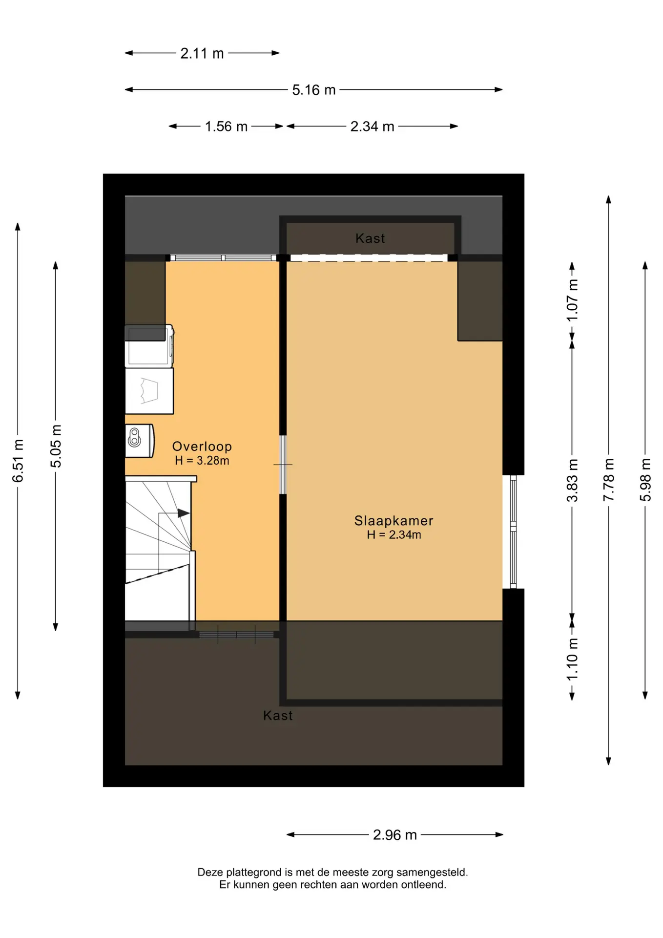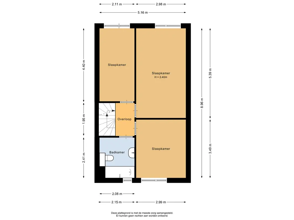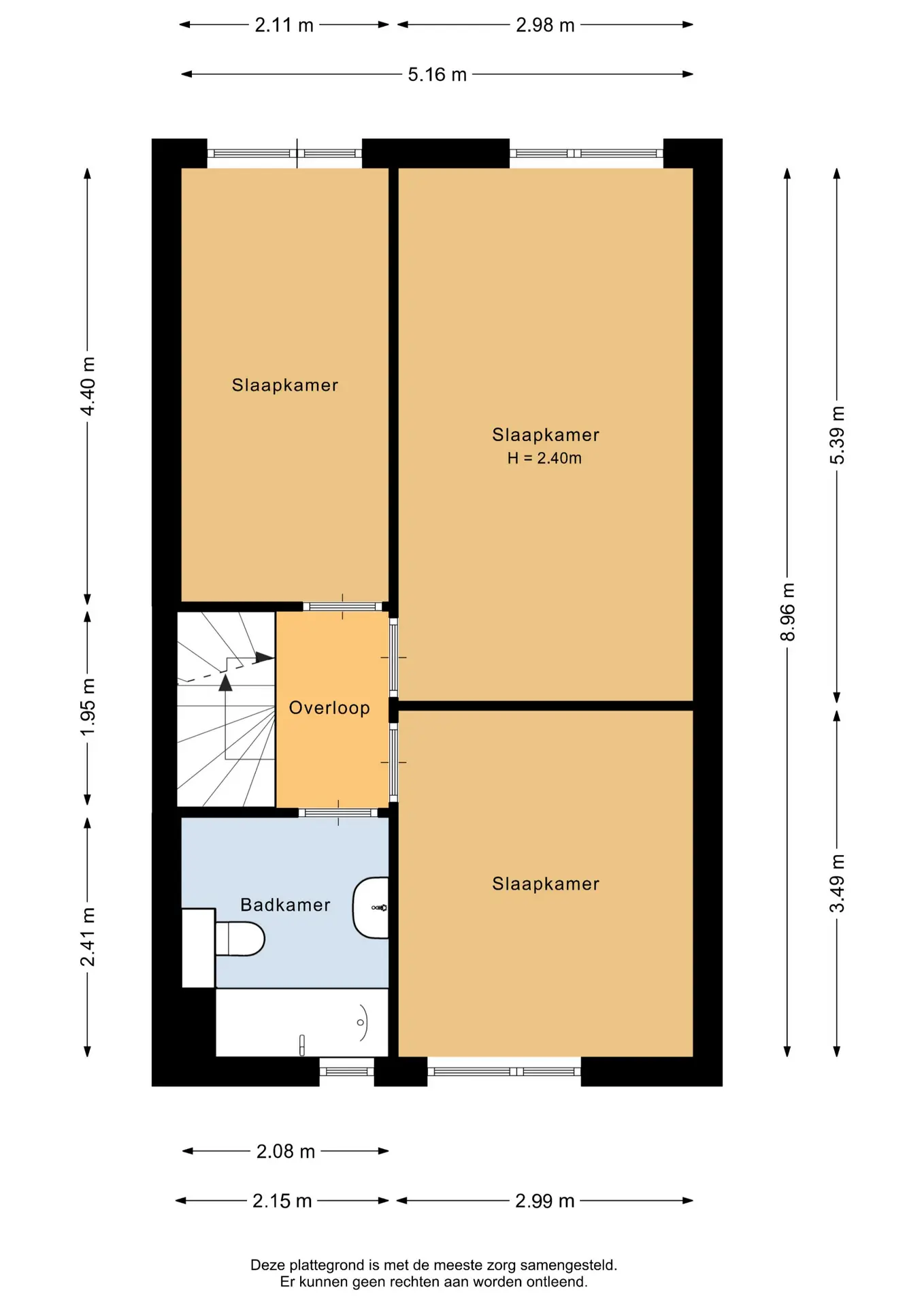 De hoofdslaapkamer is gelegen aan de achterzijde van de woning en heeft een oppervlakte van circa 16m². De tweede slaapkamer bevindt zich aan de voorzijde en meet ongeveer 10,5m². De derde slaapkamer, eveneens aan de achterzijde gelegen, heeft een oppervlakte van circa 9m². Alle slaapkamers zijn afgewerkt met vliesbehang en een spuitplafond.