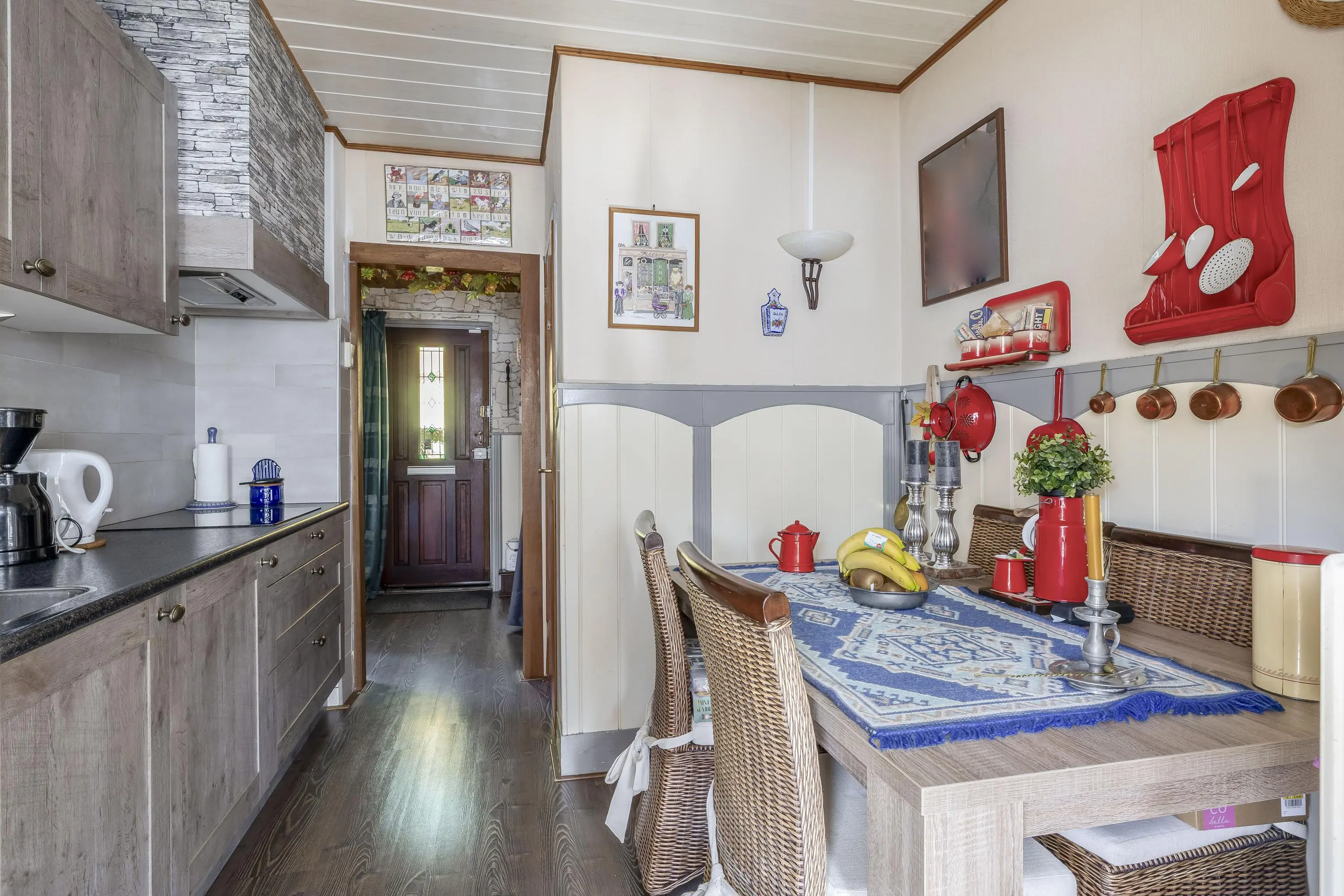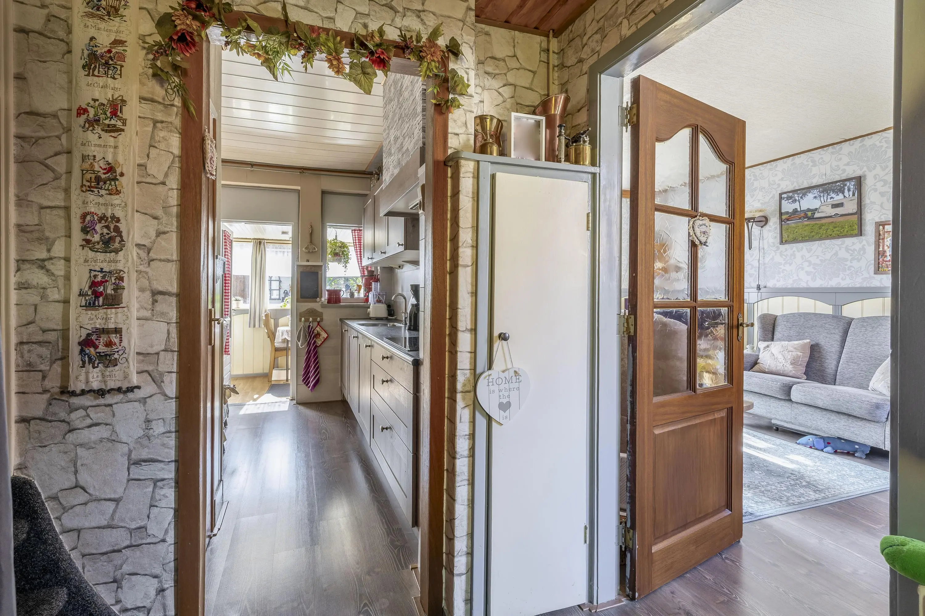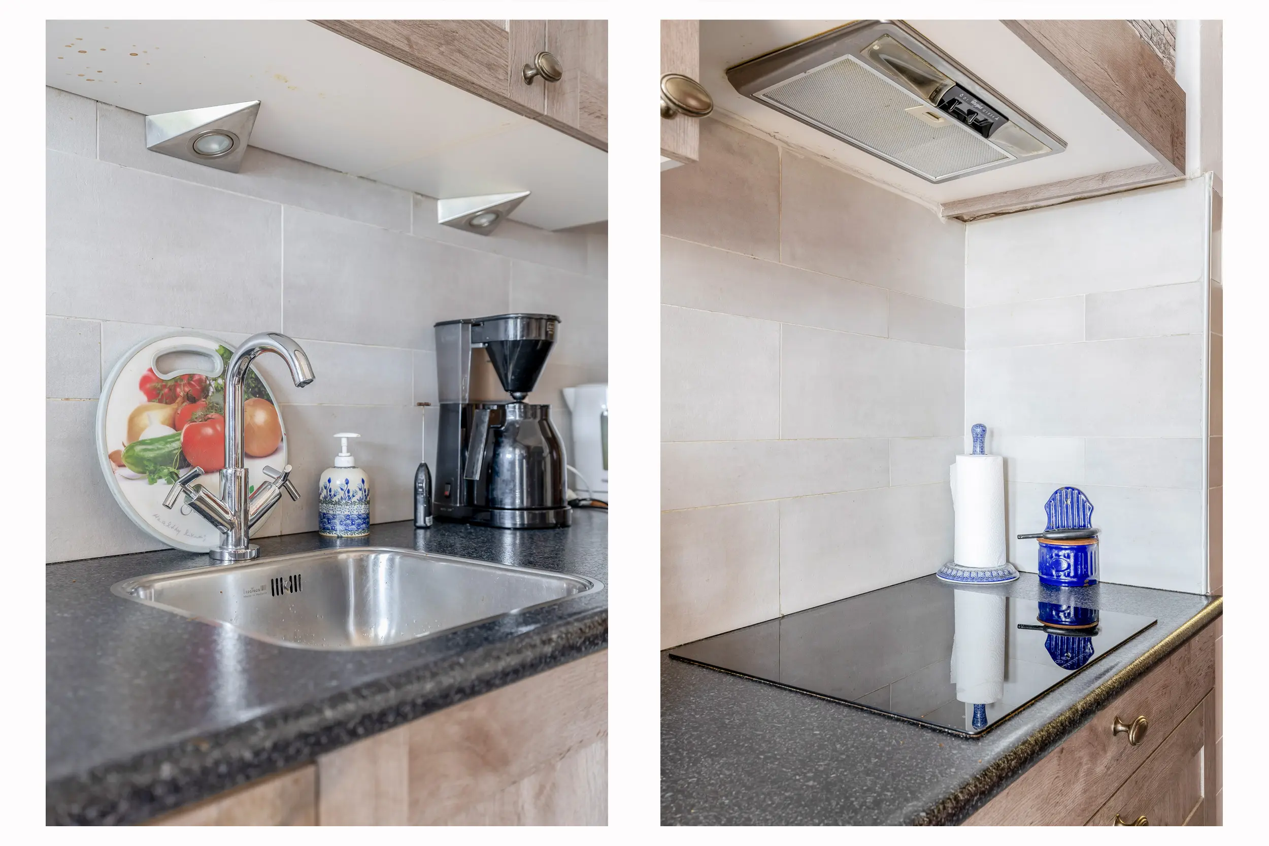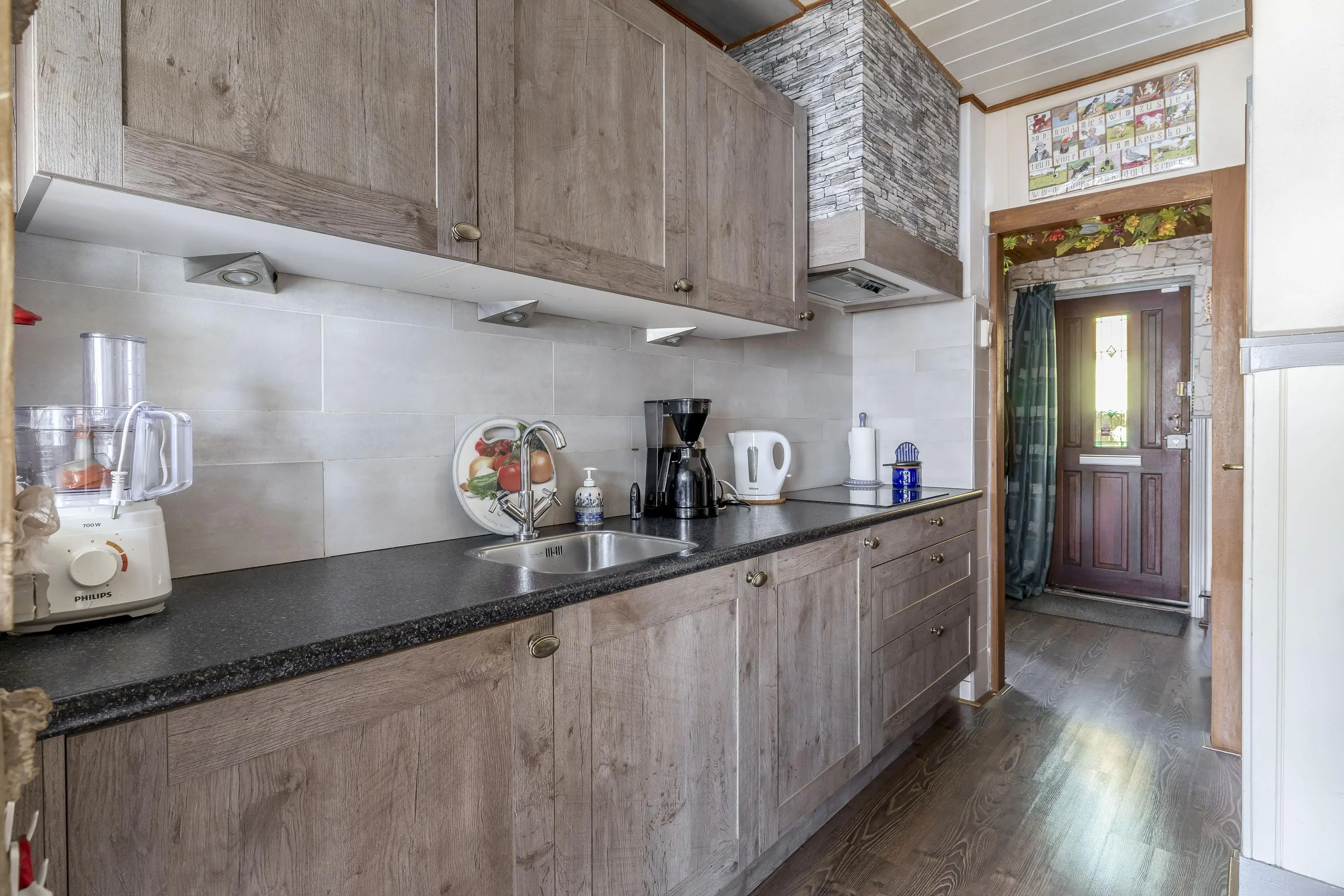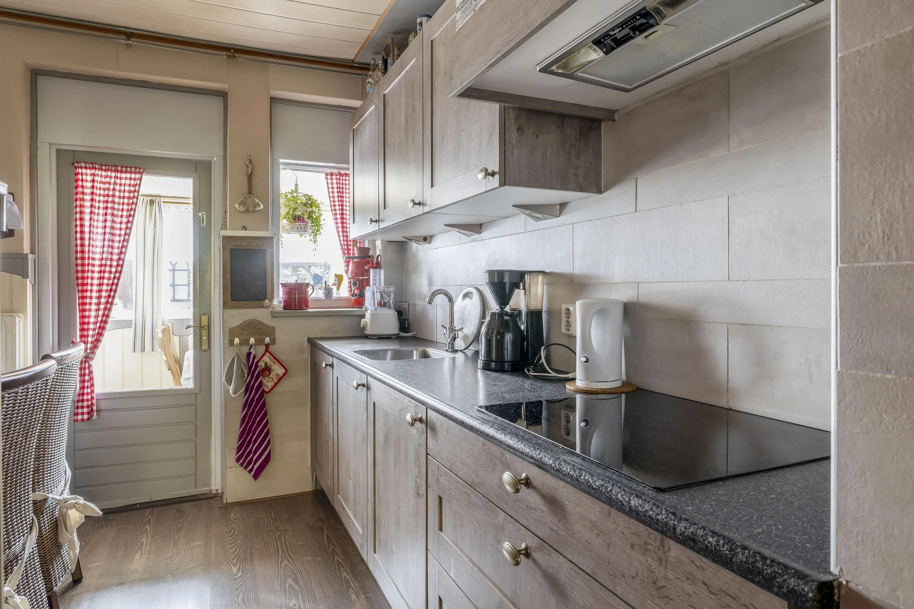 De keuken is praktisch langs de wand opgesteld en uitgerust met een spoelbak, inductiekookplaat, afzuigkap, koelkast en vriezer. Daarnaast beschikt de keuken over een provisiekast. Vanuit de keuken is er toegang tot de bijkeuken. In de bijkeuken bevinden zich de aansluitingen voor de wasmachine en droger. Door de gunstige ligging geniet deze ruimte van daglicht en is deze tevens geschikt als extra bergruimte. Via een enkele deur bereikt u de zonnige achtertuin.