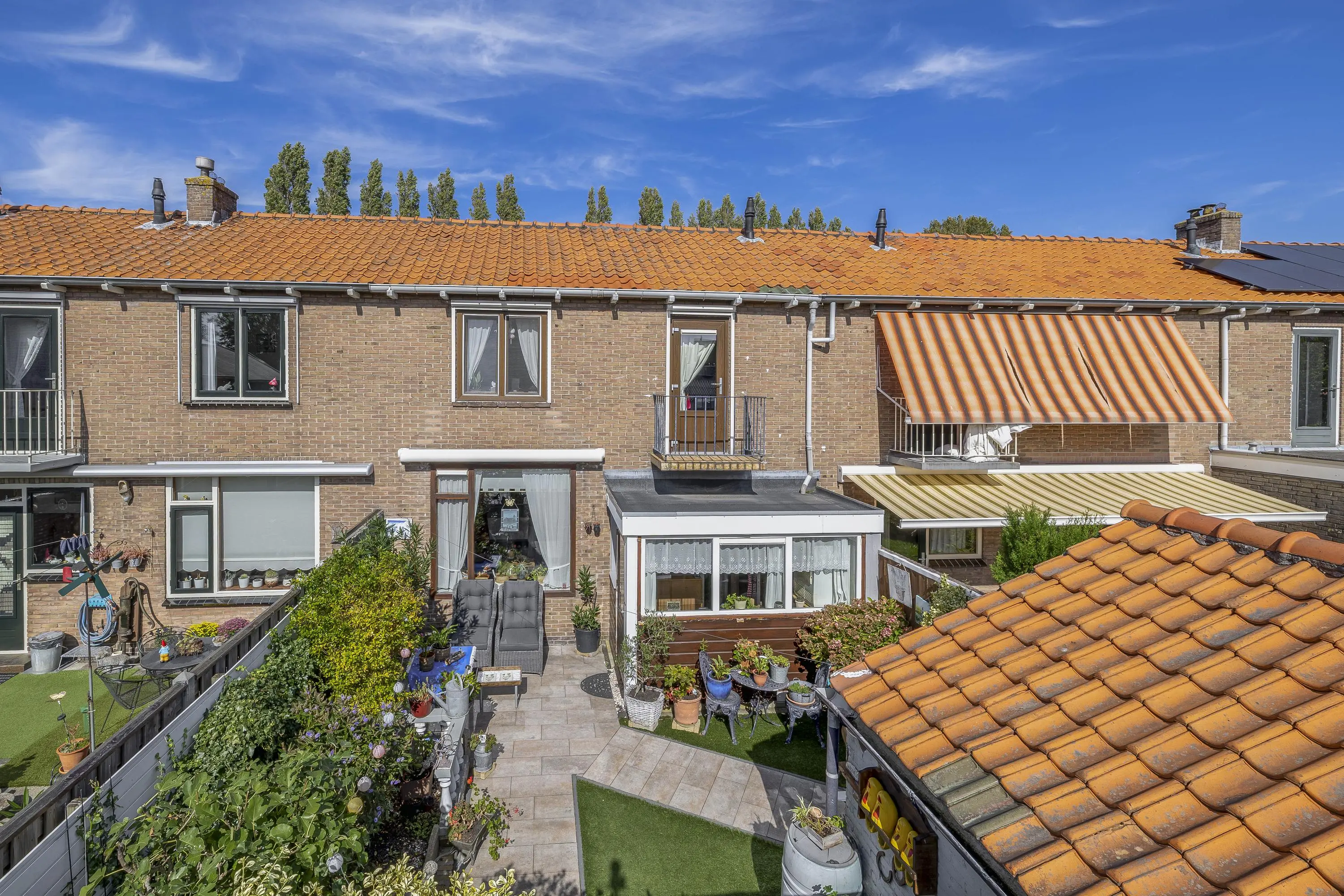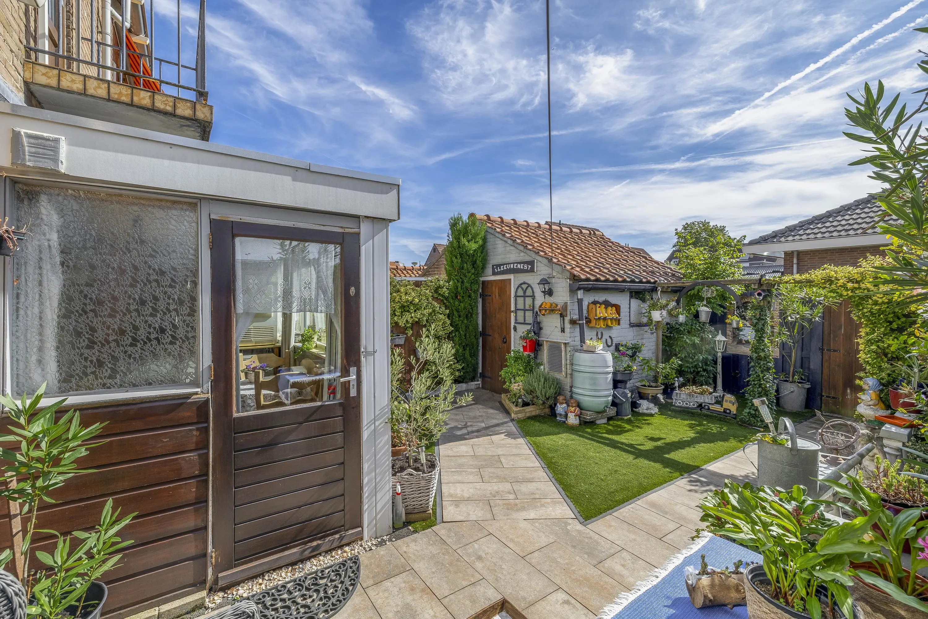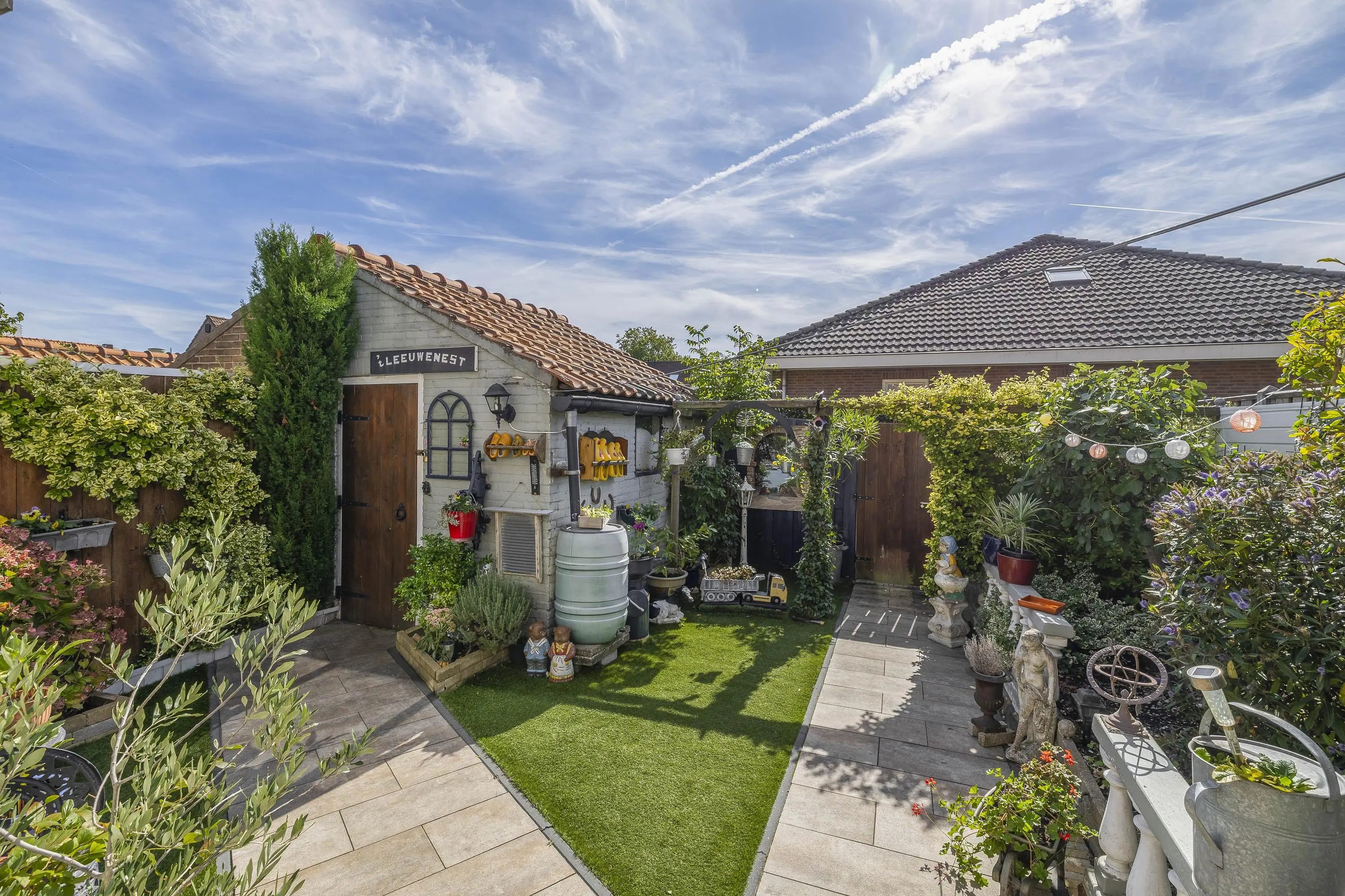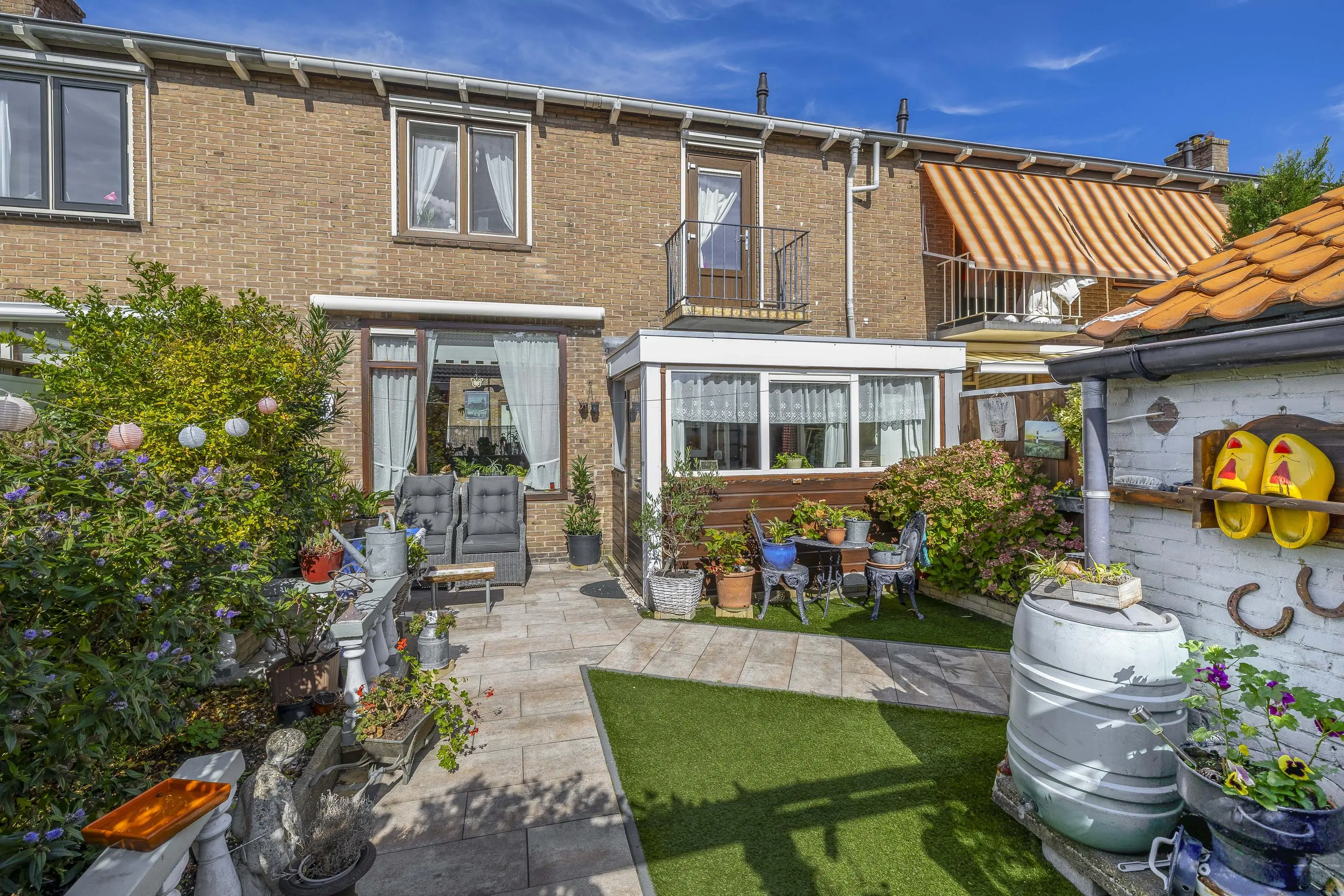 De op het zuidoosten gelegen achtertuin is aangelegd met bestrating, een gedeelte kunstgras en aardeperken langs de zijden voor groene accenten. Dankzij de royale afmetingen biedt de tuin volop mogelijkheden om deze naar eigen wens in te richten. Achter in de tuin bevindt zich een praktische stenen berging, voorzien van elektra. De tuin is tevens bereikbaar via een achterom.