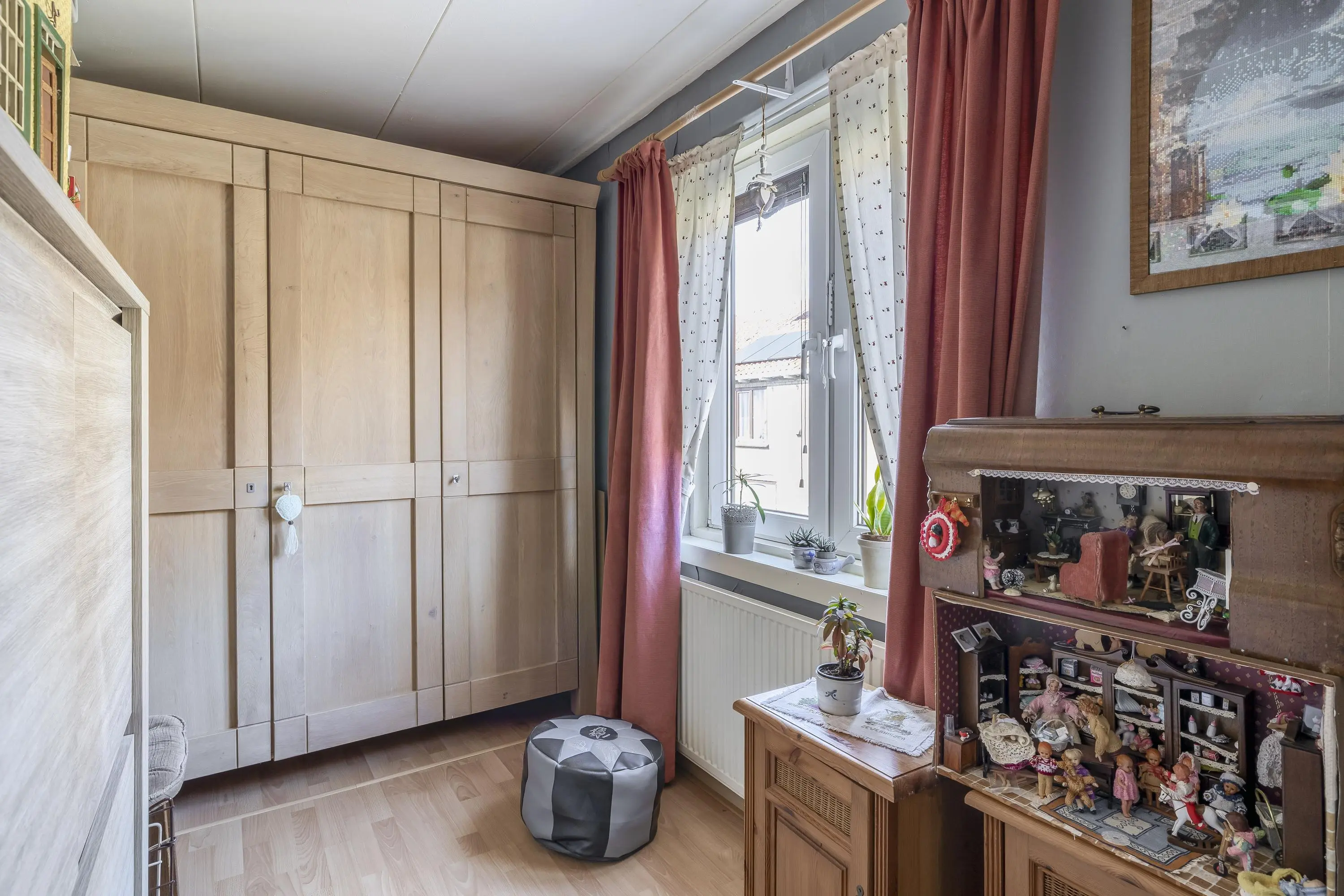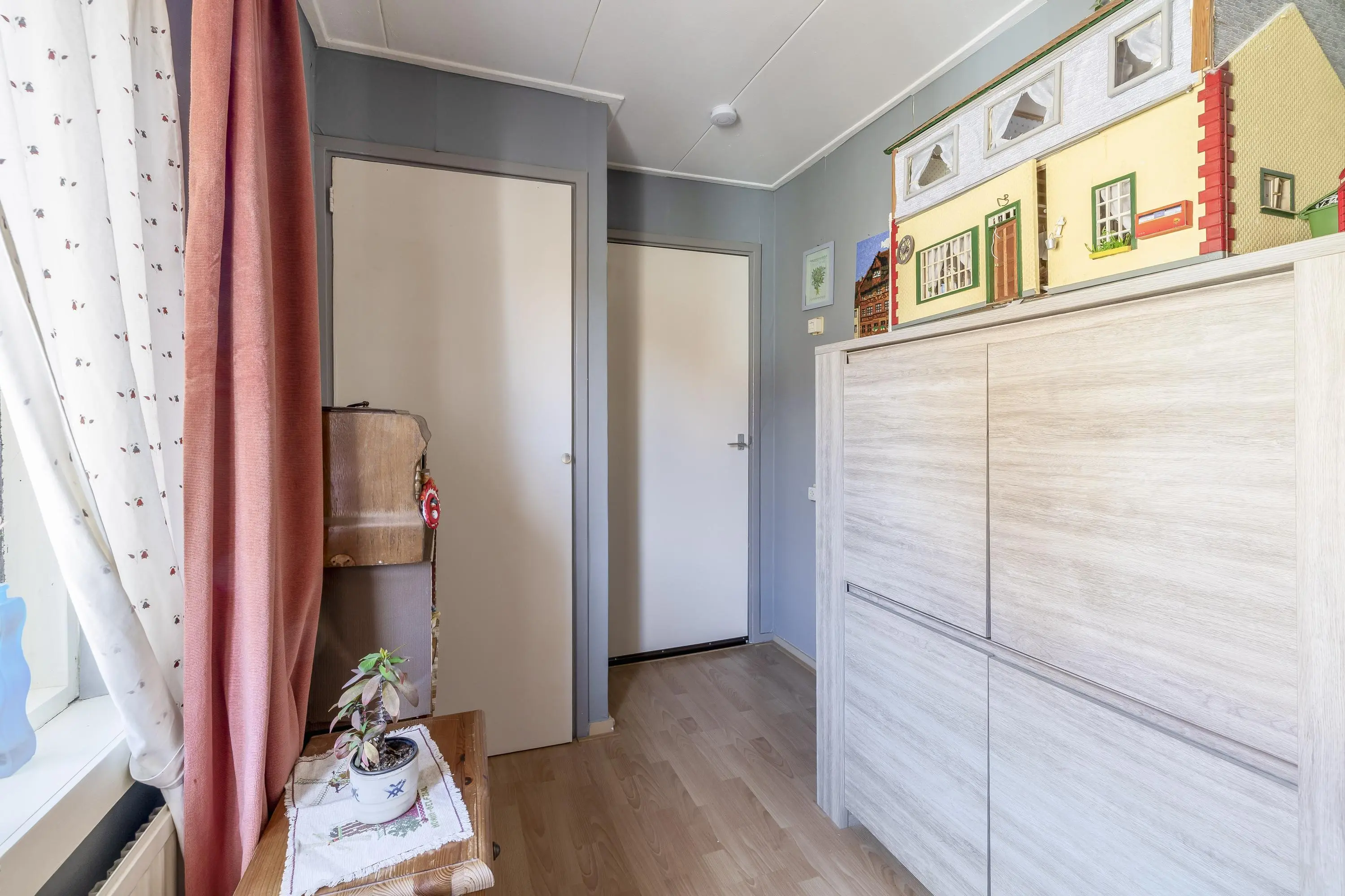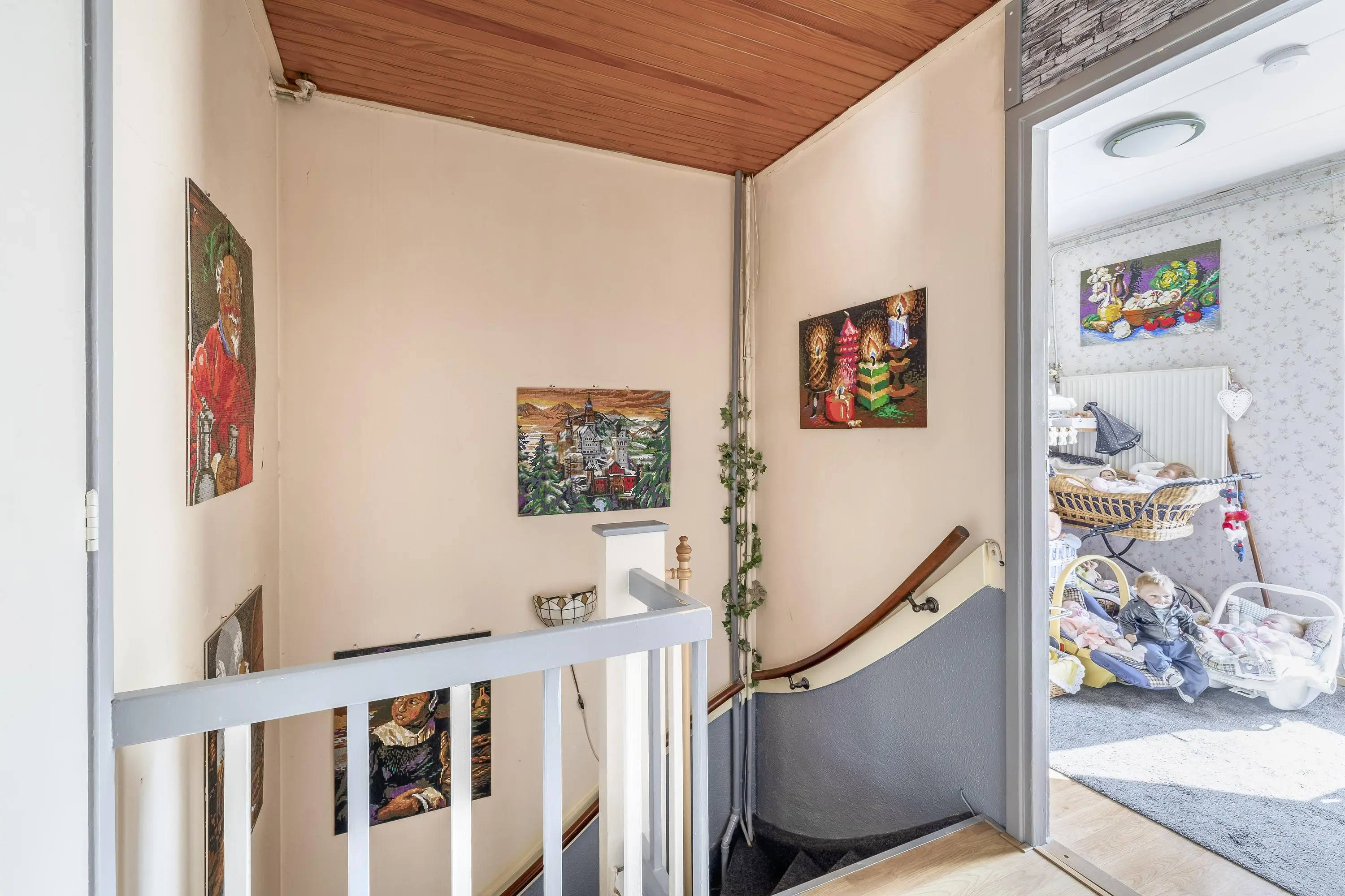 De overloop is voorzien van een nette laminaatvloer die doorloopt in alle slaapkamers. Vanaf de overloop is er toegang tot drie slaapkamers, de badkamer en de vliering.