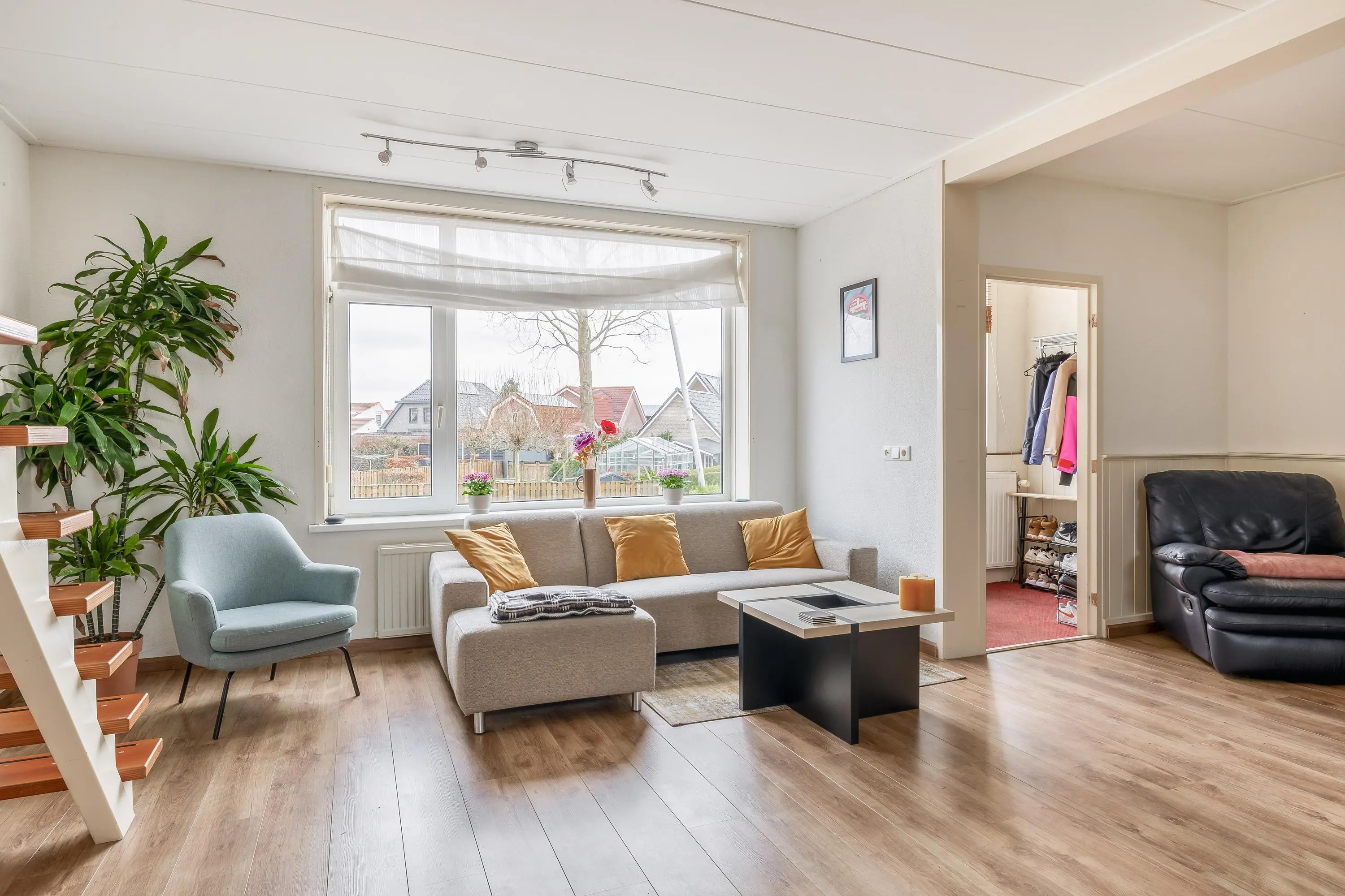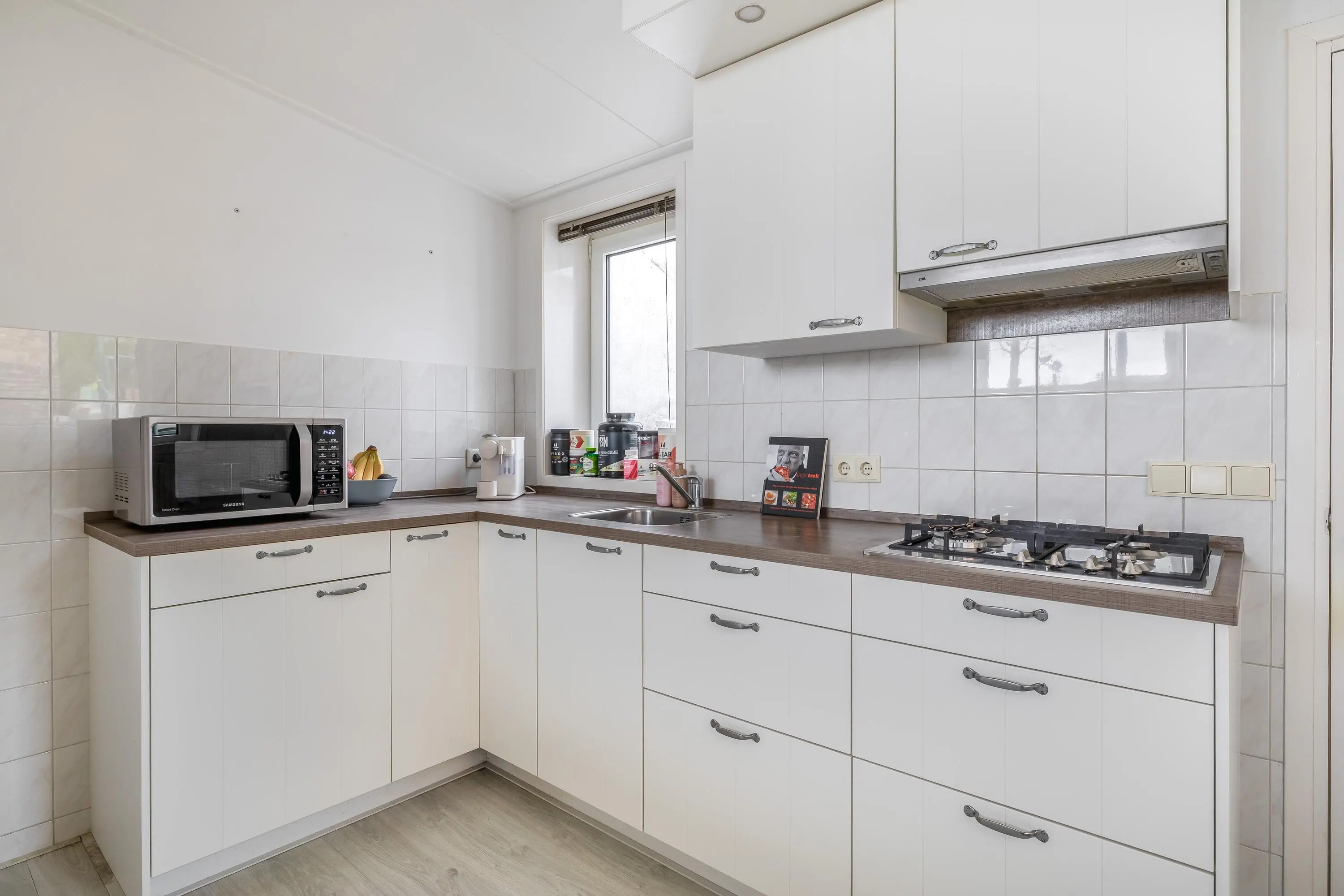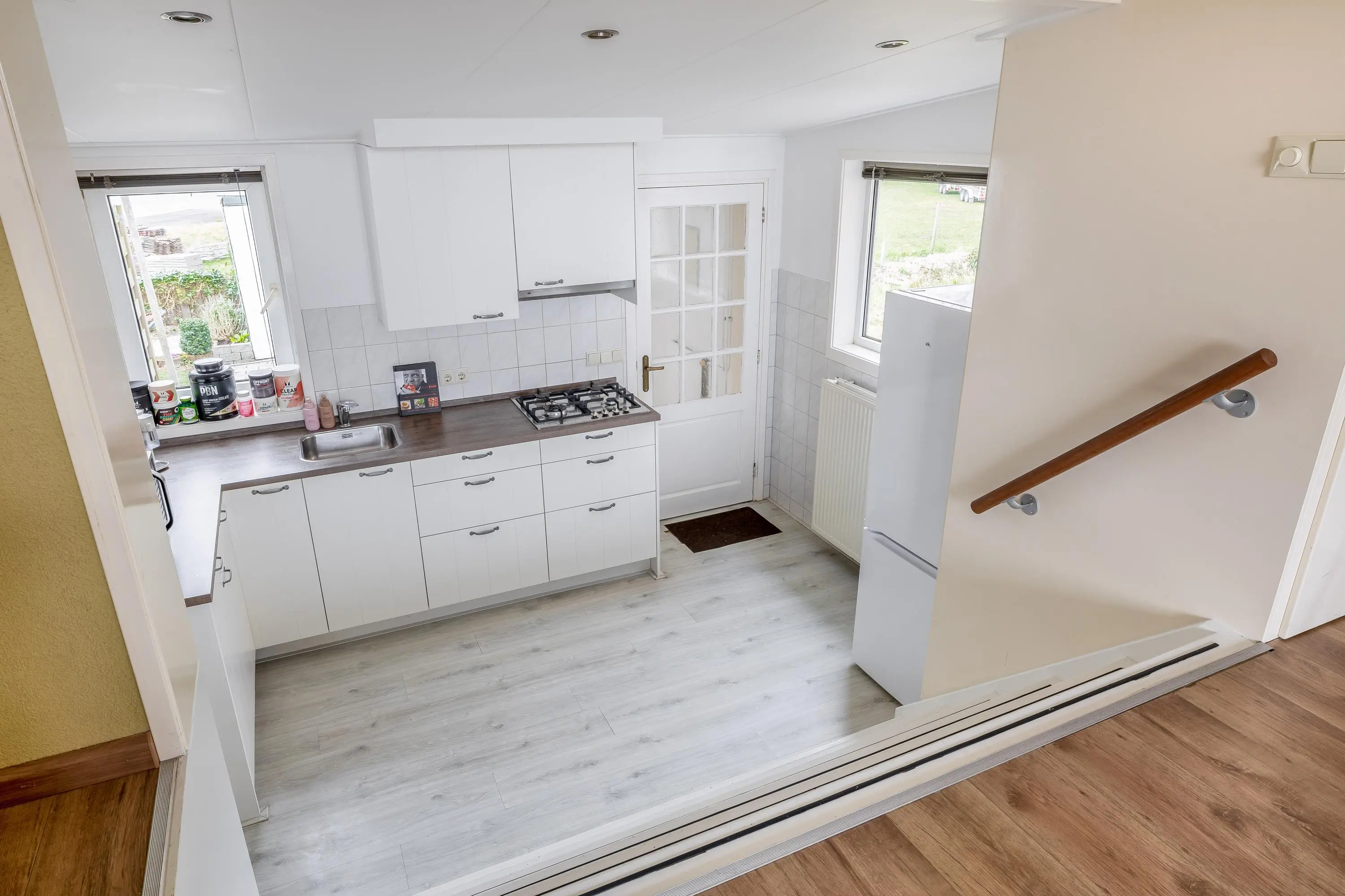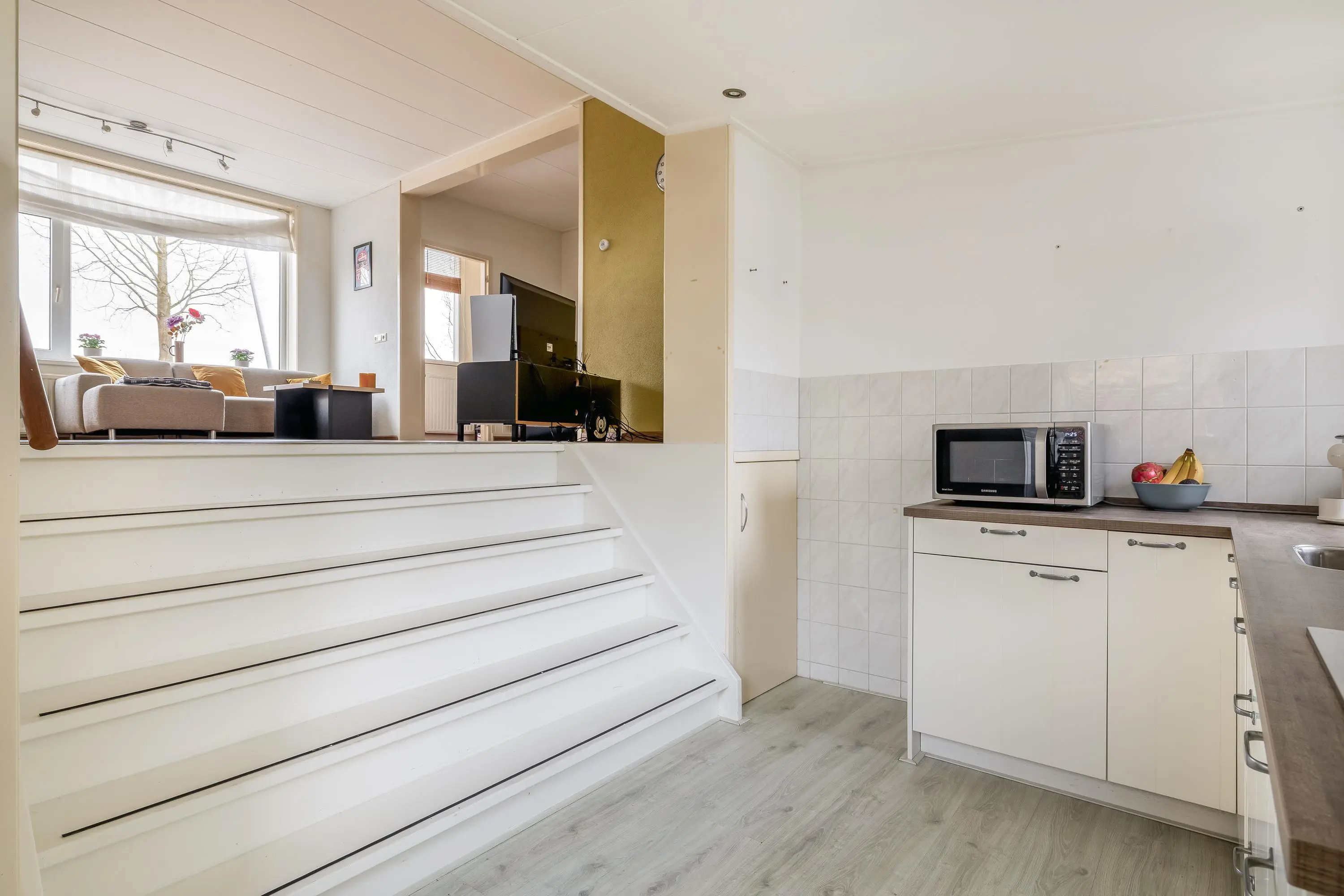 De woonkamer geniet van prettig daglicht en is afgewerkt met een nette laminaatvloer. Dankzij het royale oppervlak is de ruimte speels en flexibel in te delen. De keuken bevindt zich op een lager niveau, wat zorgt voor een ruimtelijk effect en een natuurlijke scheiding tussen wonen en koken. In de woonkamer bevindt zich tevens de trapopgang naar de eerste verdieping en de meterkast. Er is voldoende ruimte voor het creëren van een comfortabele zithoek en een gezellige eethoek, geheel naar eigen wens in te richten.