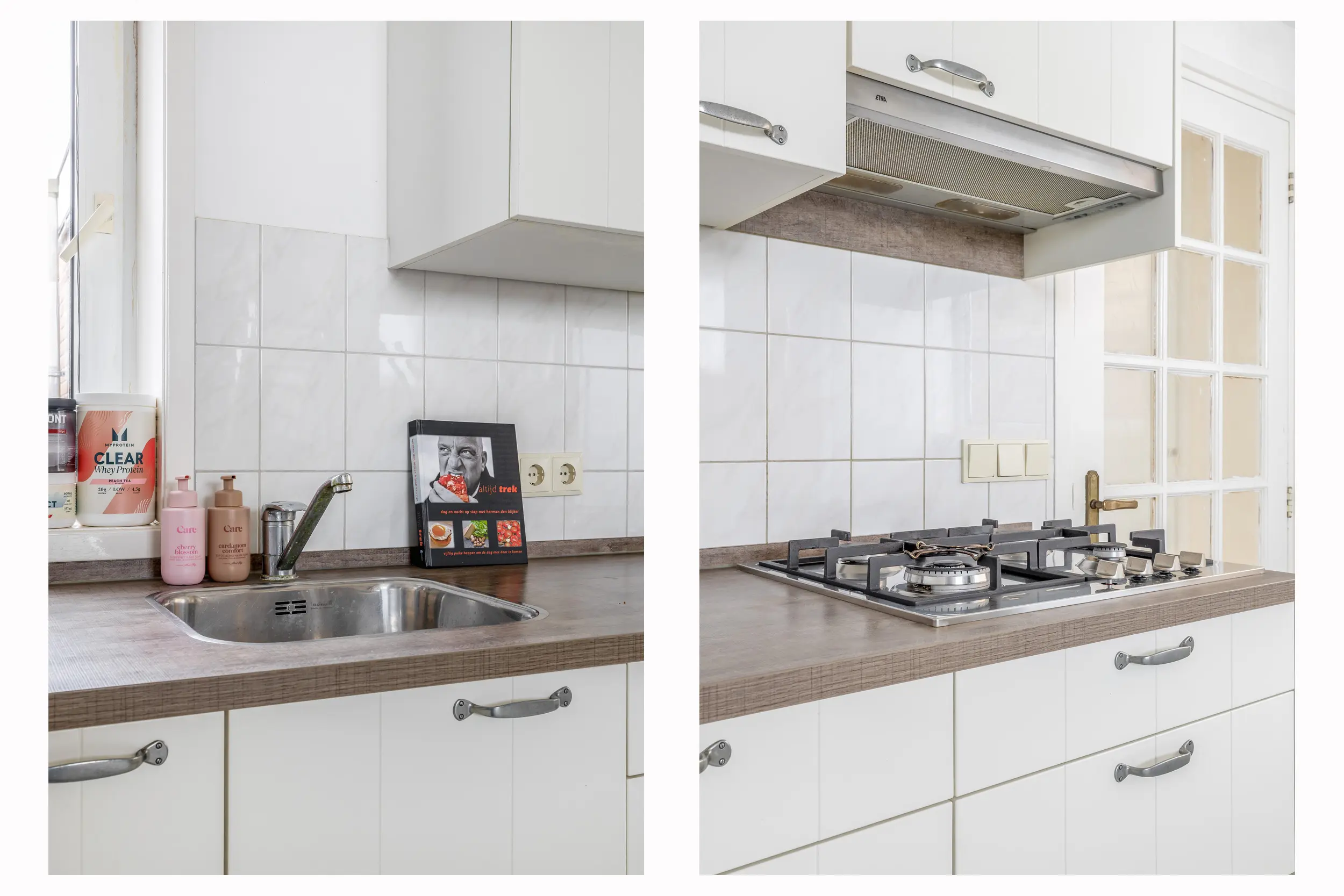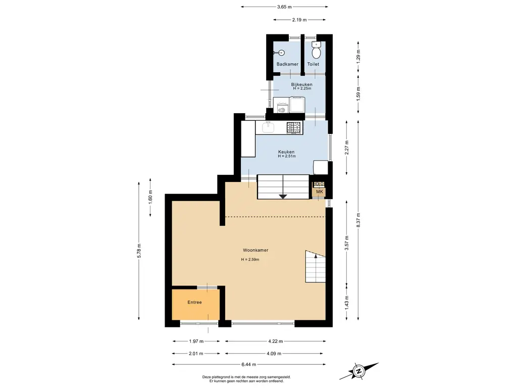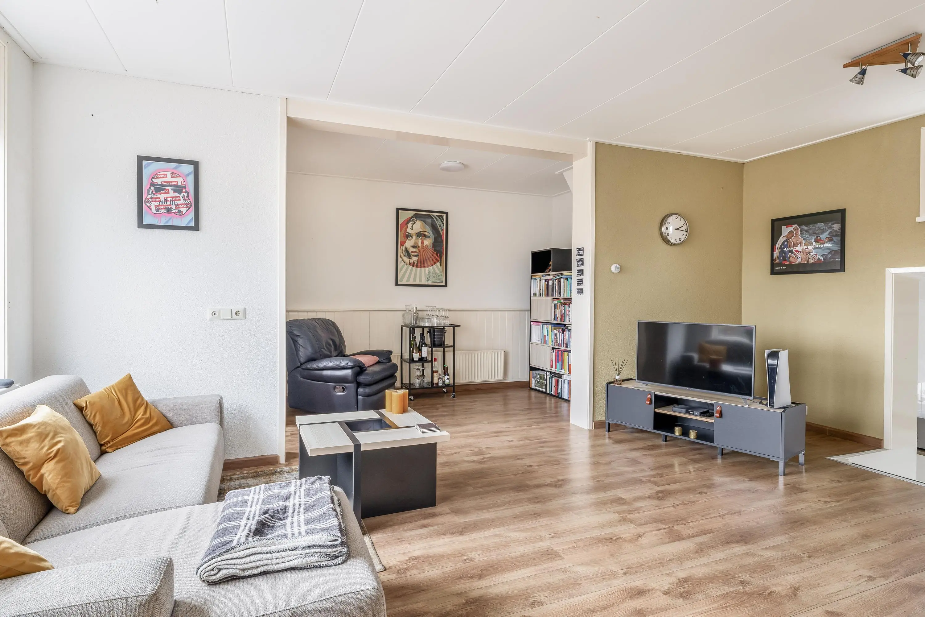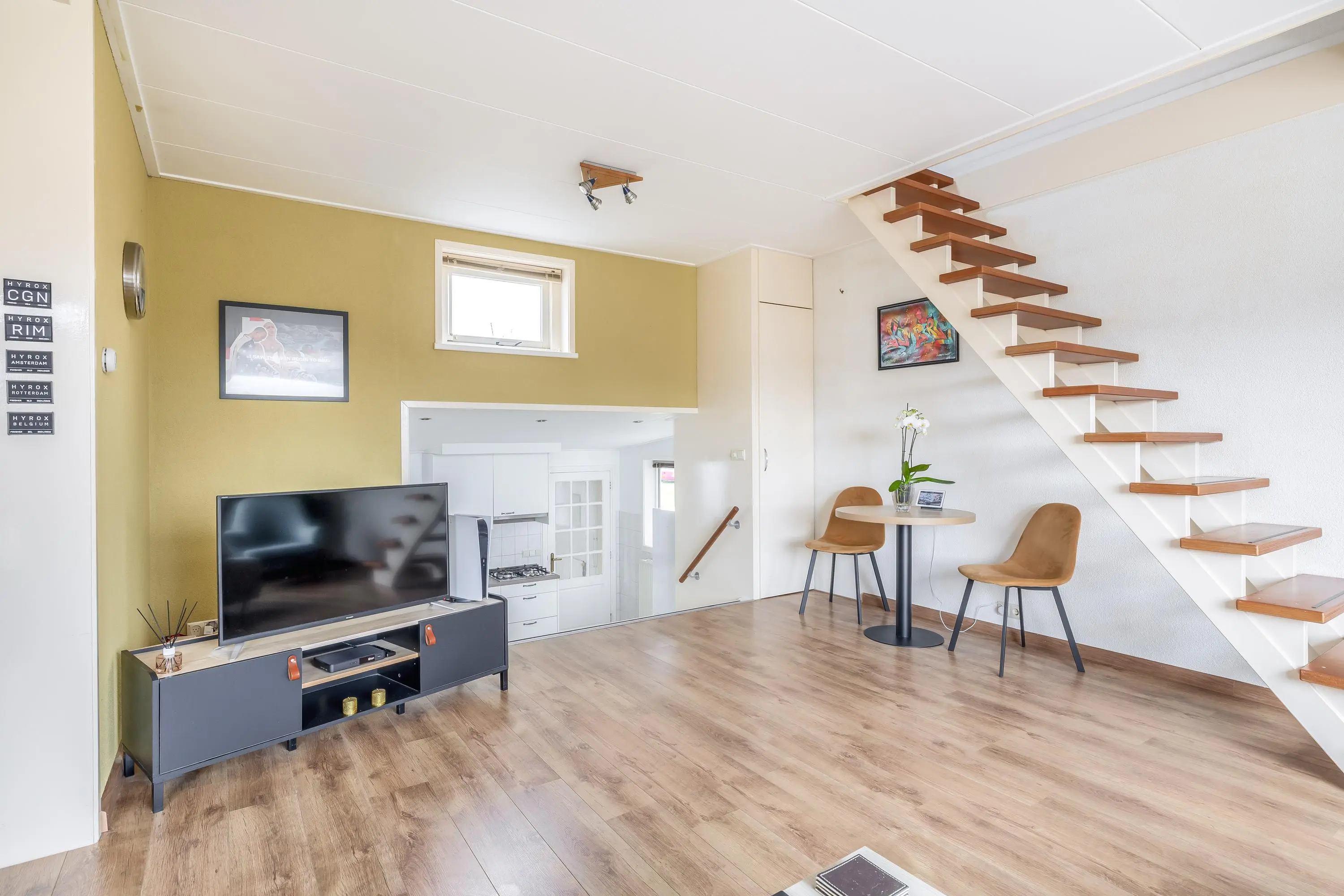 De woonkamer geniet van prettig daglicht en is afgewerkt met een nette laminaatvloer. Dankzij het royale oppervlak is de ruimte speels en flexibel in te delen. De keuken bevindt zich op een lager niveau, wat zorgt voor een ruimtelijk effect en een natuurlijke scheiding tussen wonen en koken. In de woonkamer bevindt zich tevens de trapopgang naar de eerste verdieping en de meterkast. Er is voldoende ruimte voor het creëren van een comfortabele zithoek en een gezellige eethoek, geheel naar eigen wens in te richten.