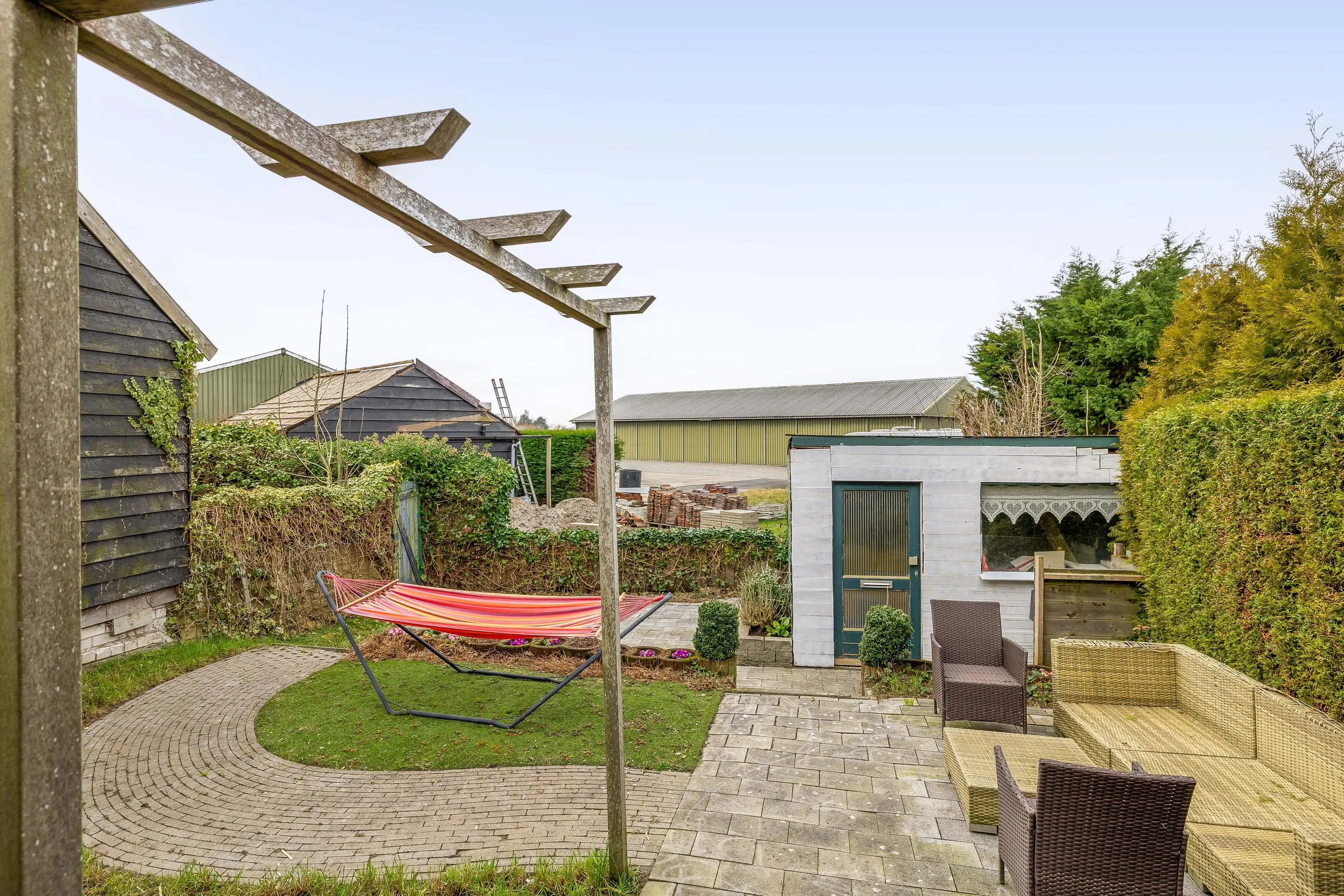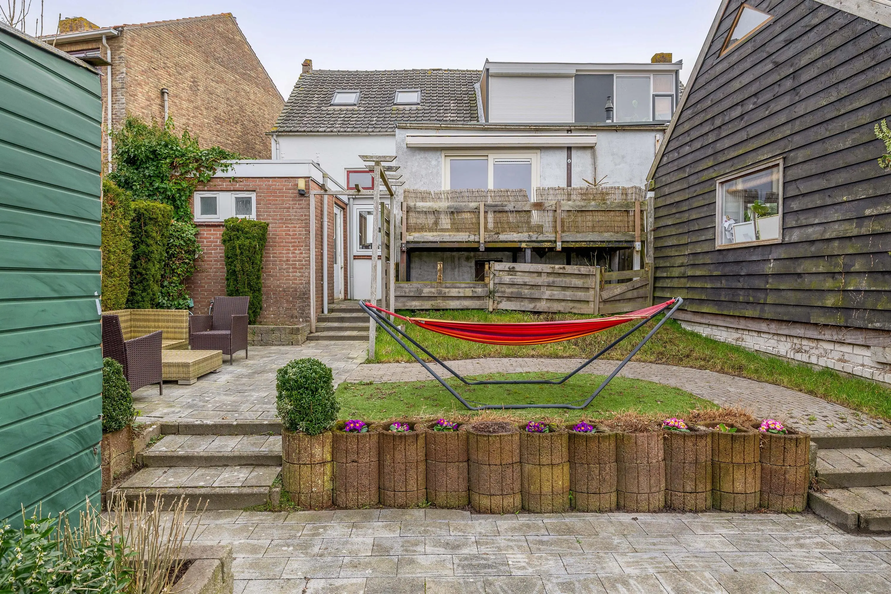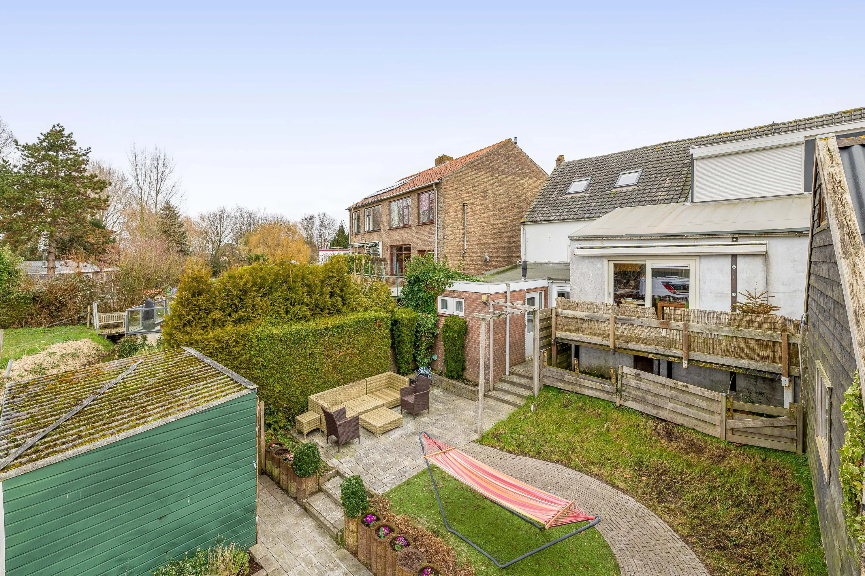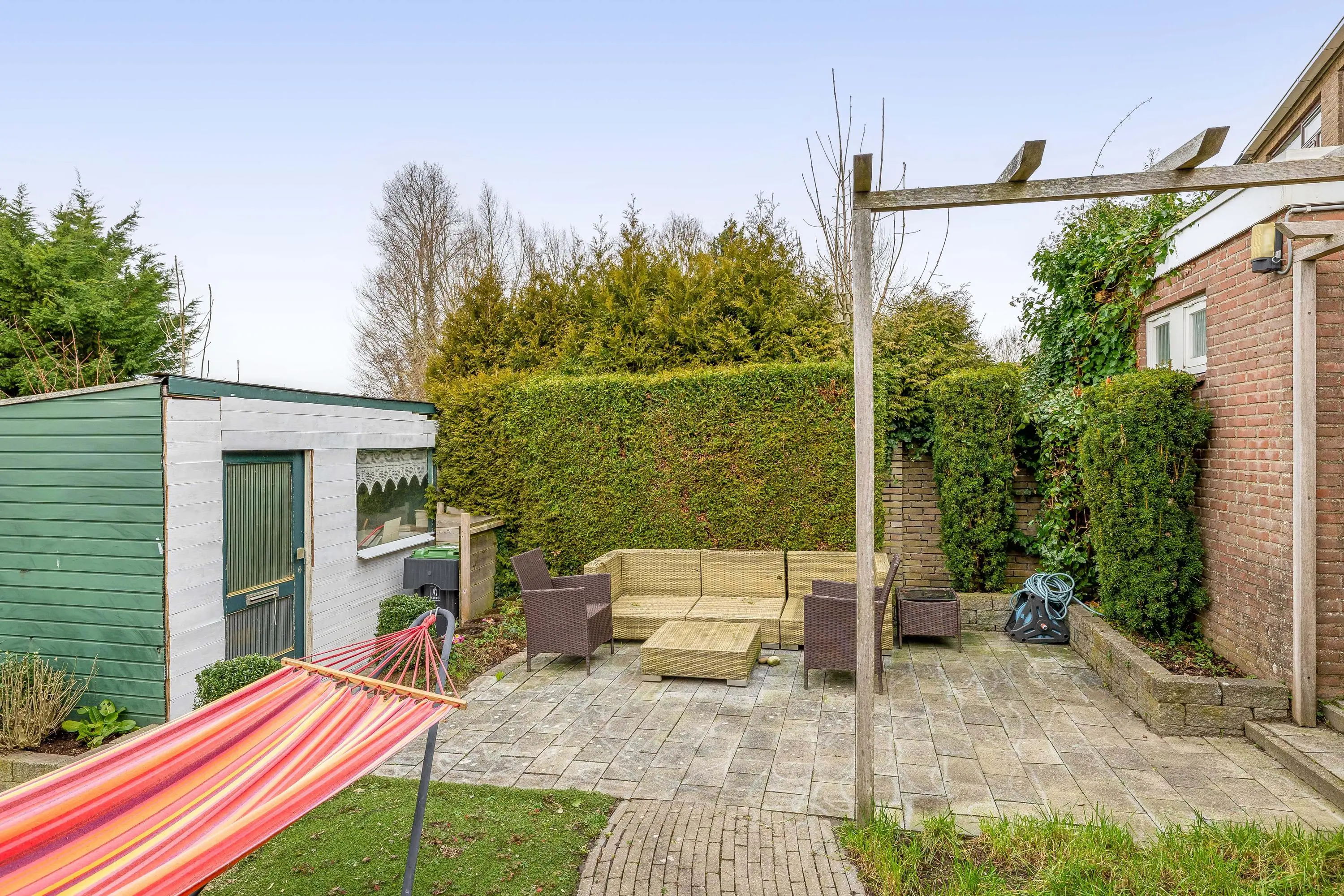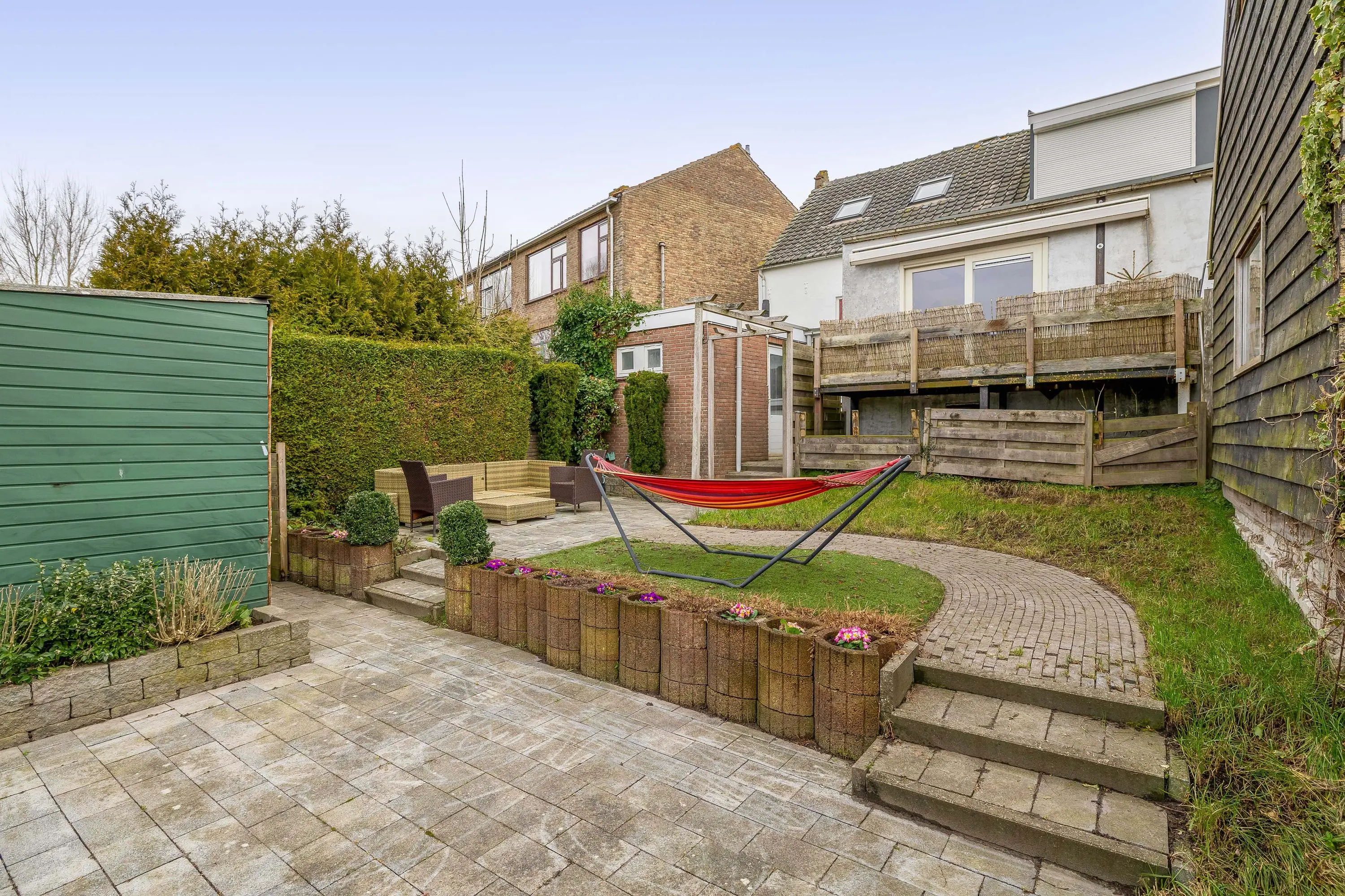 De verzorgde achtertuin is afwisselend aangelegd met meerdere niveaus en biedt een fijne combinatie van groen en terrasruimte. Direct aan de woning bevindt zich een ruim betegeld terras, ideaal voor het plaatsen van een lounge set of eettafel. Het verhoogde gazon met sierlijke, gebogen bestrating en vaste beplanting zorgt voor een sfeervolle uitstraling. Achterin de tuin staat een praktische berging met een oppervlakte van circa 7,5m.