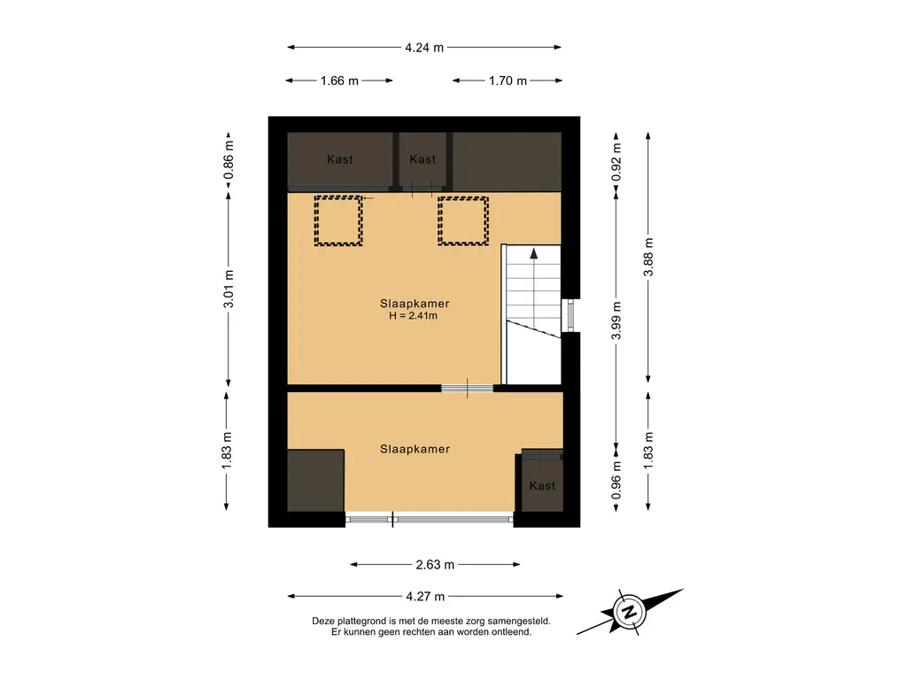 De tweede slaapkamer bevindt zich aan de voorzijde van de woning en is vergroot middels een dakkapel, wat zorgt voor extra ruimte en lichtinval. Deze kamer heeft een oppervlakte van circa 7m² en beschikt eveneens over een praktische inbouwkast.