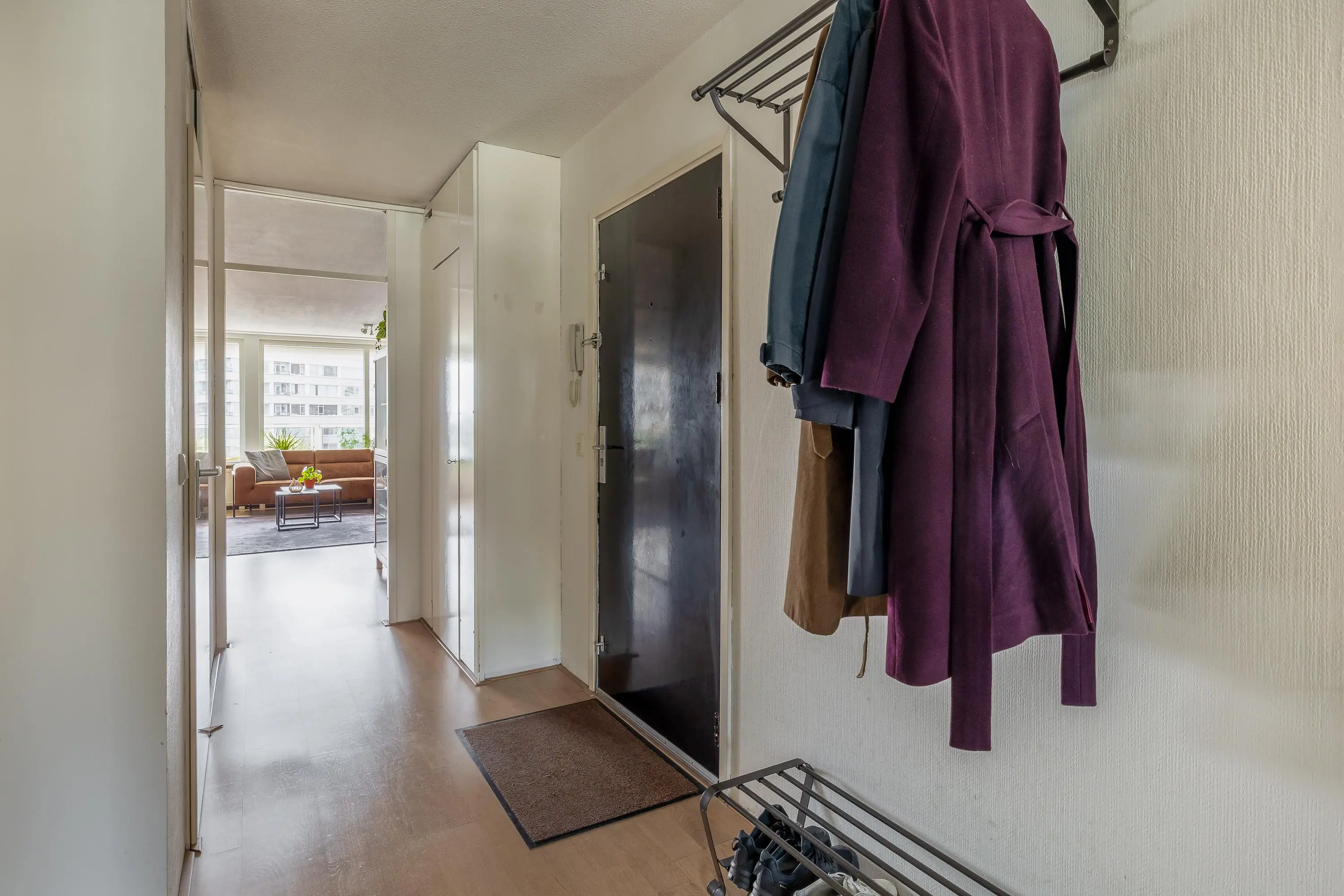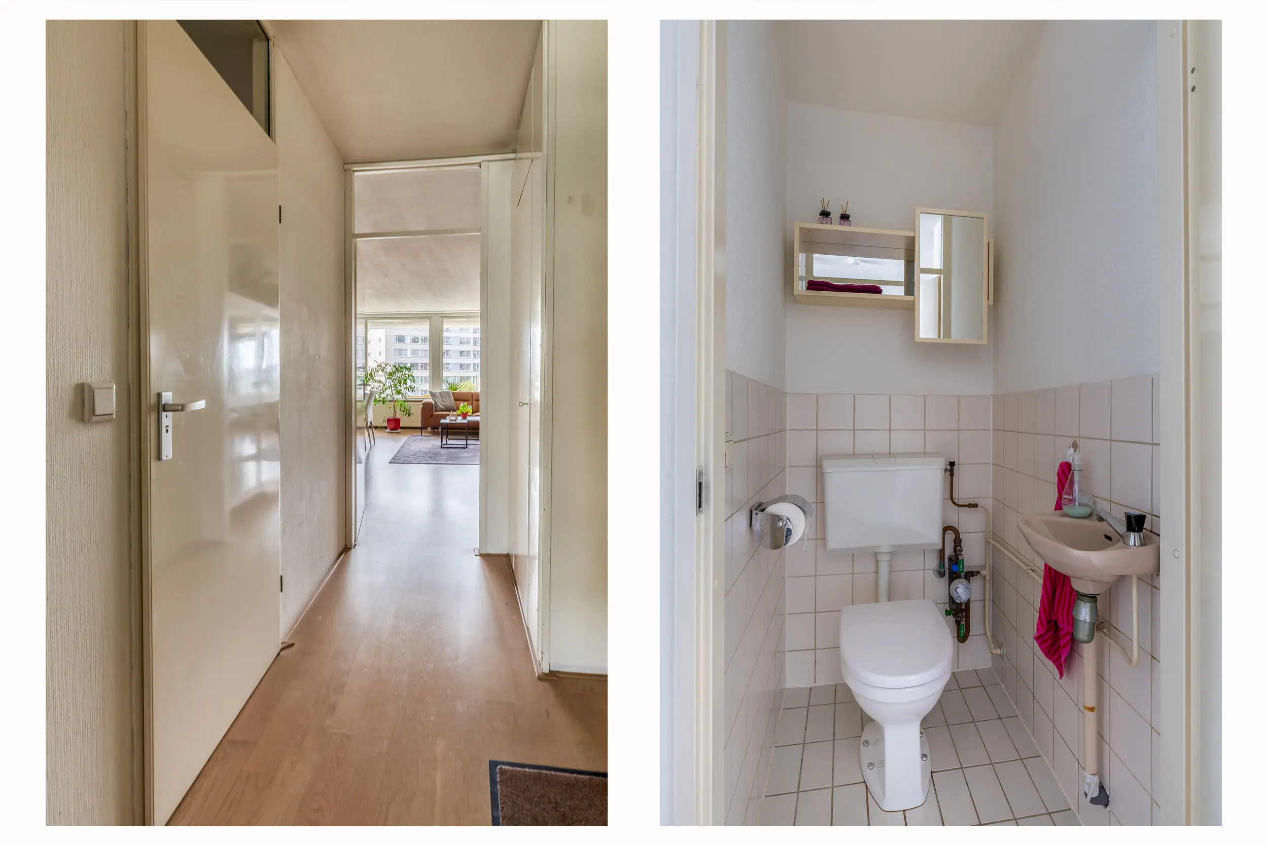Via het gesloten portiek op de begane grond is met de lift of trap het appartement op de 7e etage te bereiken. Op de begane grond zijn ook de bergingen en het bellentableau aanwezig. De entree in de woning is in de hal. Hier is ook de meterkast te vinden. De luxe badkamer heeft als sanitaire voorzieningen een ruime inloopdouche, een wastafel met meubel, designradiator en de aansluitingen voor het witgoed. Verder is er een losse toiletruimte aanwezig welke is voorzien van een toilet en fonteintje. Dan volgt een ruime inloopkast, perfect voor opslagruimte. De twee slaapkamers zijn aan de achterzijde gelegen, beide kamers zijn erg licht door de grote raampartijen. Deze kamers zijn voorzien van HR++ beglazing in kunststof kozijnen. En dan de heerlijke living. Wat een fijne ruimte! Via de woonkamer is de doorgang naar het terras, welke prachtig uitzicht heeft over de Maas en een deel van de skyline van Rotterdam. Door de ligging op het zuidwesten kan je hier tot laat genieten van de zon en mooie zomeravonden. Er is tevens een elektrisch zonnescherm op het terras aanwezig. De open keuken is hier ook te vinden. Deze is wat verouderd en heeft als apparatuur een combi-oven, inductie kookplaat met afzuigkap, koel-/vriescombinatie, vaatwasser, een composiet aanrecht, spoelbak en natuurlijk veel bergruimte in de kastjes.