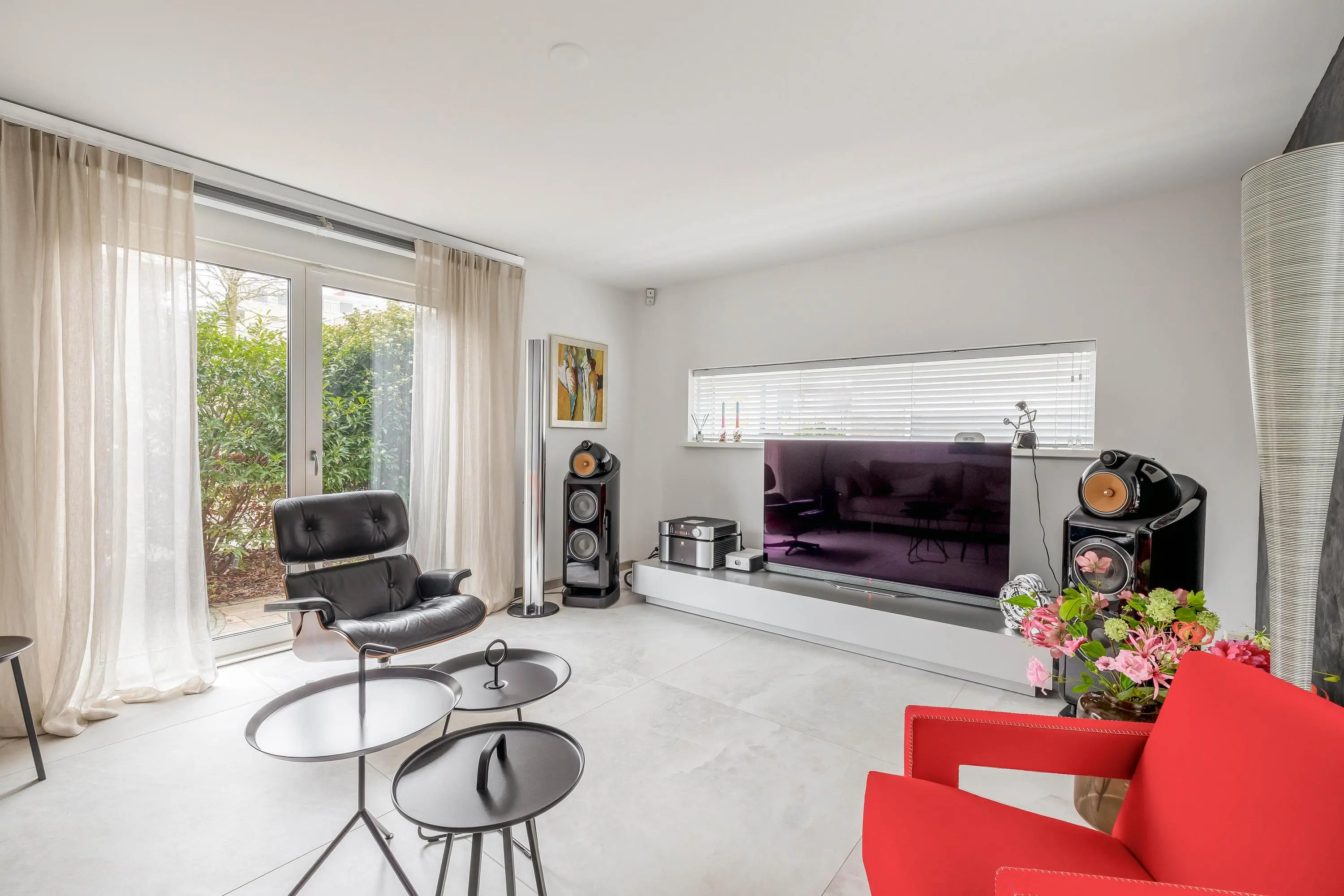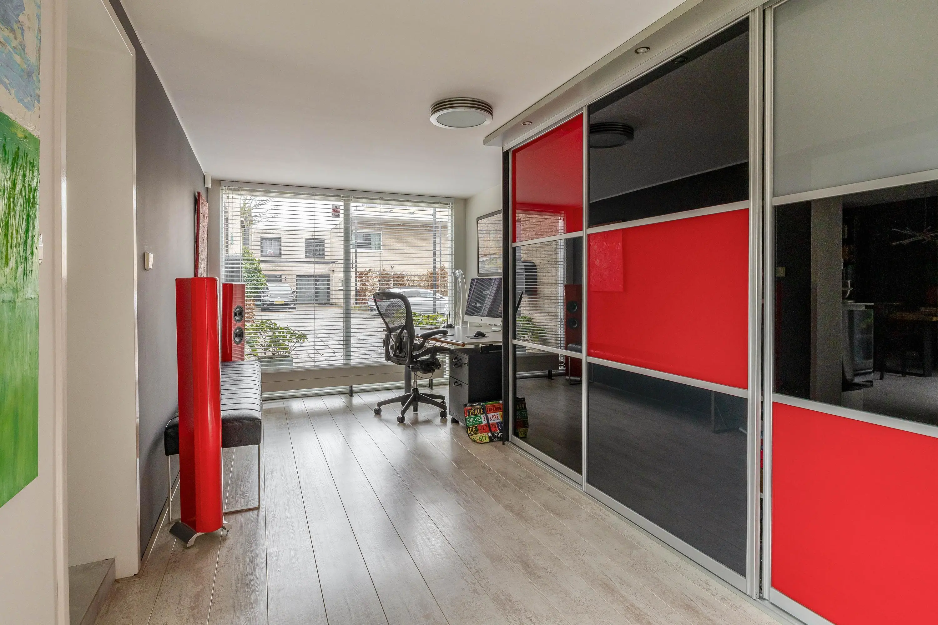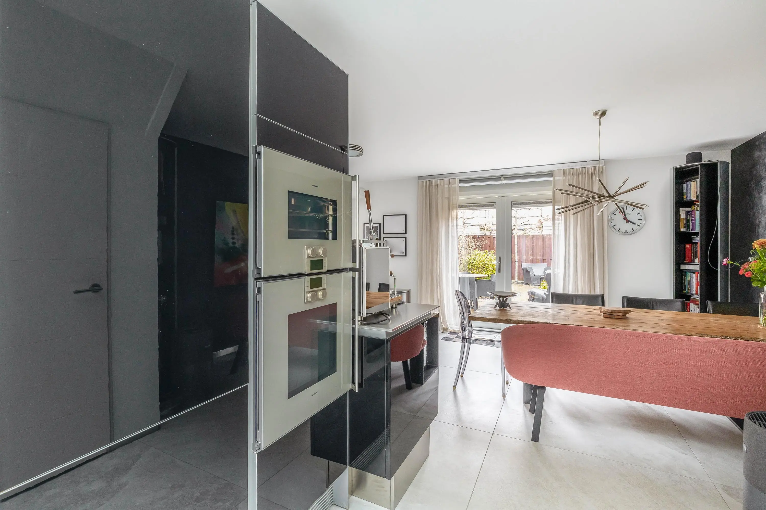 Via een fraaie aluminium deur stap je de woning binnen. Direct valt de dubbele uitwaaiende trap in de vide op. Via 2 routes biedt de trap doorgang naar de slaapverdieping. De blik gaat al snel omhoog naar de lichtstraat die een enorme hoeveelheid natuurlijk daglicht naar binnen laat. Wat een mooie start van deze woning. De entree is verder voorzien van de meterkast, een vaste kast met de wasmachine aansluiting en de C.V.-ketel en een toiletruimte voorzien van een wandcloset en fonteintje. Aan de voorzijde is een gezellige en lichte living te vinden. Via de twee openslaande deuren komt ook weer extra veel licht naar binnen. Het licht wordt versterkt door de lichte keramische vloer. Aan de achterzijde is de luxe woonkeuken gelegen met ook hier twee openslaande deuren. Groot van formaat met meer dan voldoende ruimte voor een gezellige eethoek. De keuken is van alle gemakken voorzien met een vaatwasser, 5-pits inductiekookplaat, afzuigkap, Quooker, heteluchtoven, stoomoven, koel-vriescombinatie. Een droom voor iedere kookliefhebber van het merk Poggenpohl met apparatuur van Miele en Gaggenau. Via de keuken is er een open doorgang naar de extra kamer op de begane grond. Deze is goed te gebruiken als kantoorruimte of hobbykamer. Daarna volgt de losse inpandige berging. In de tuin is ook een vrijstaande schuur aanwezig.