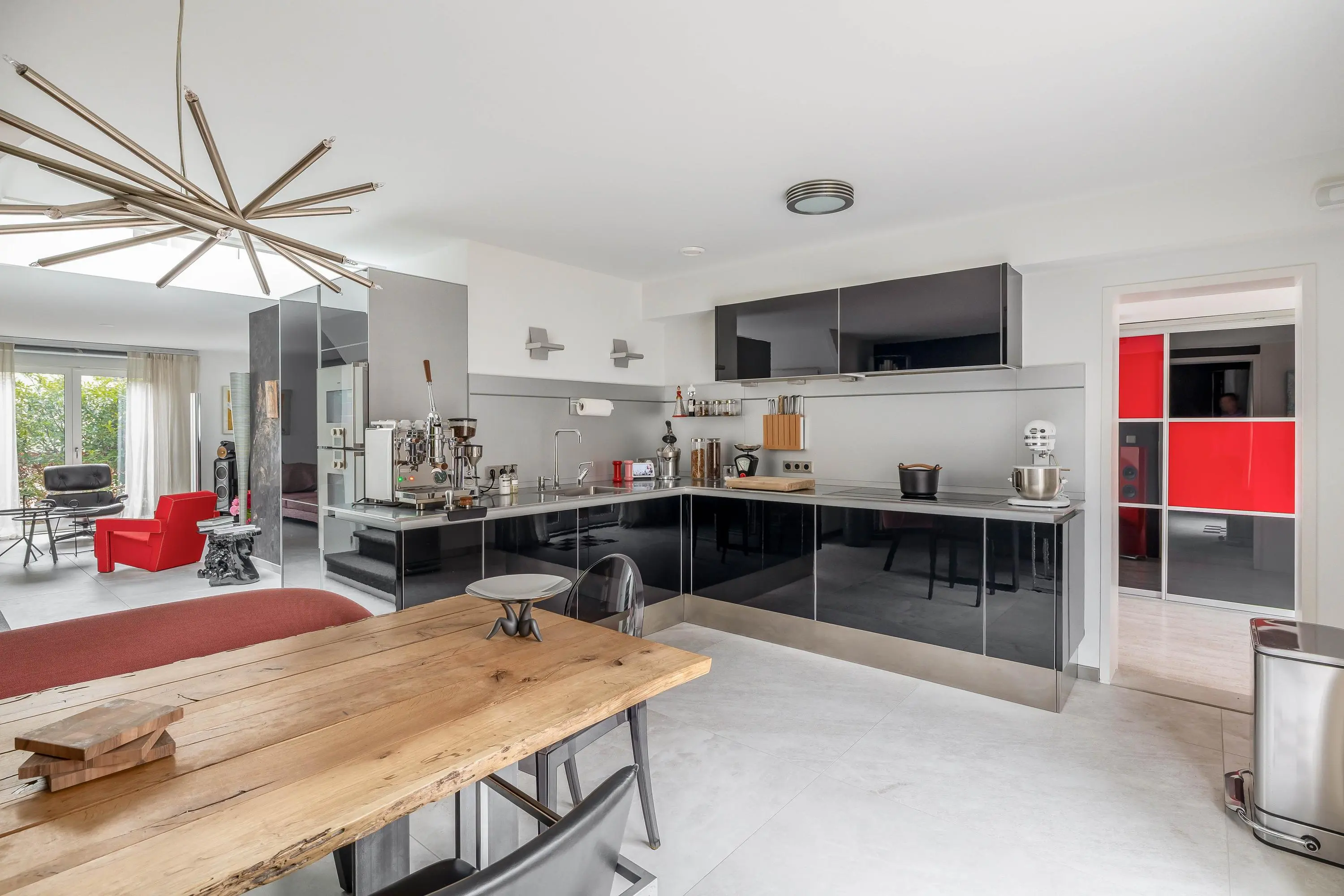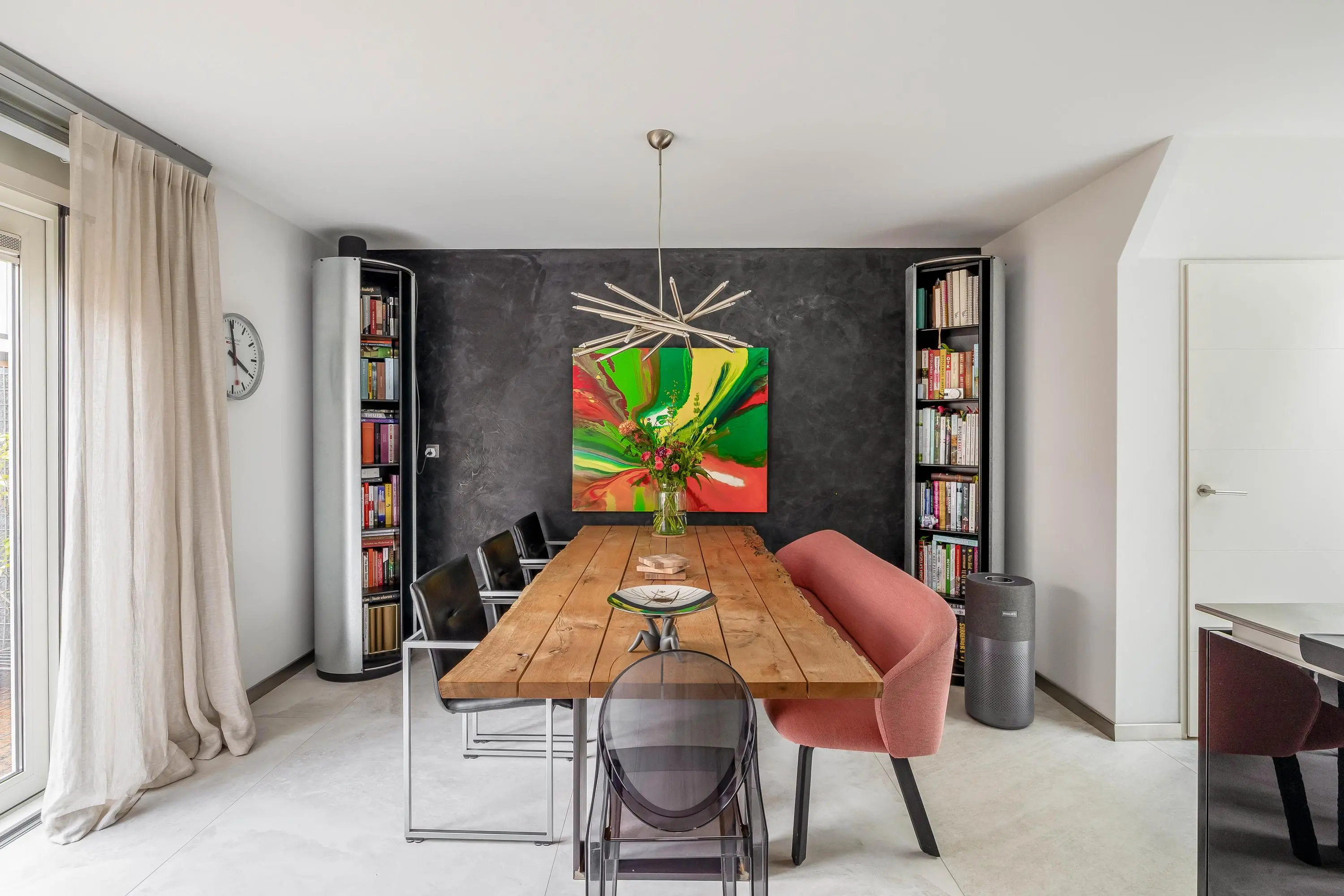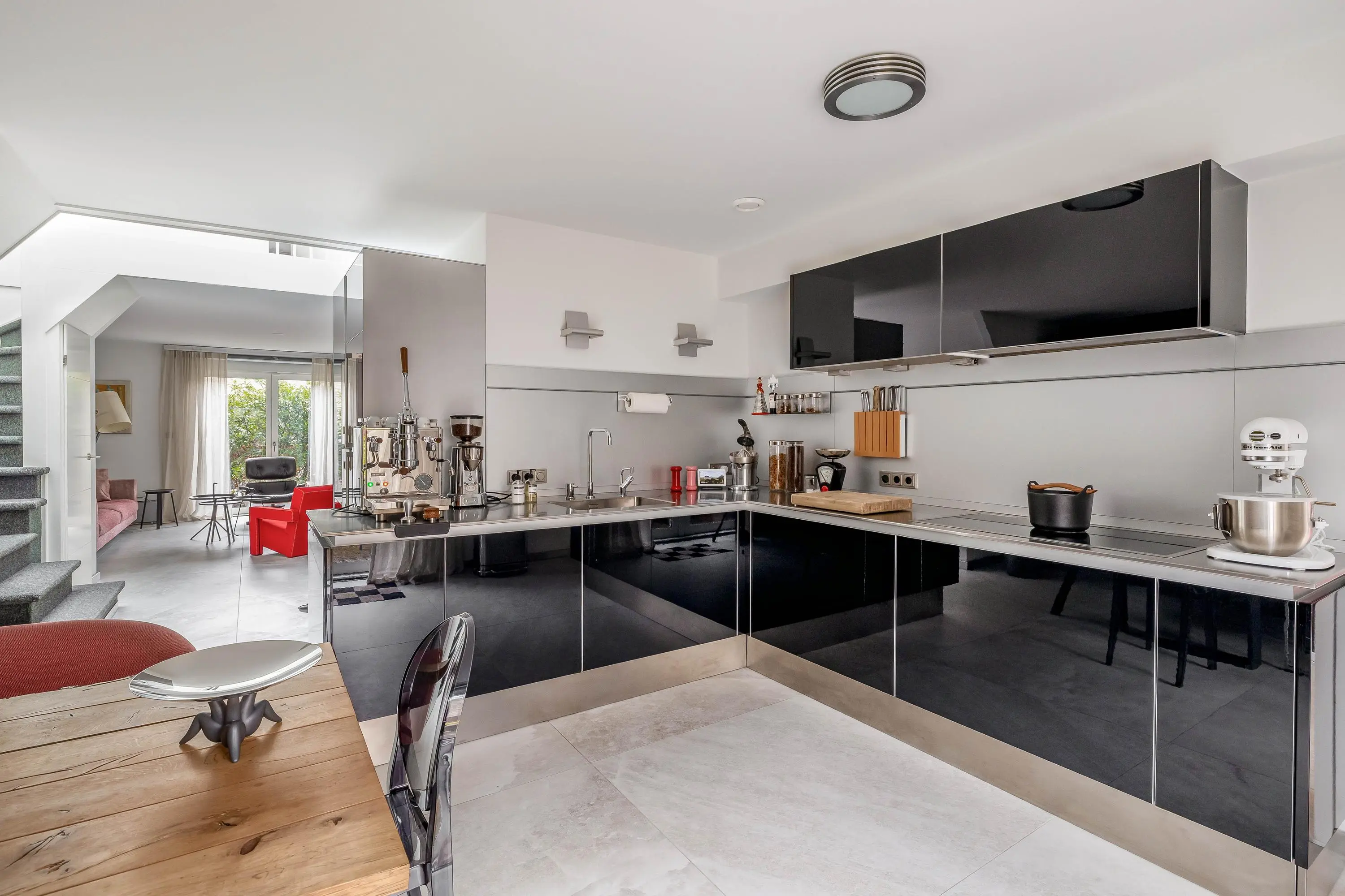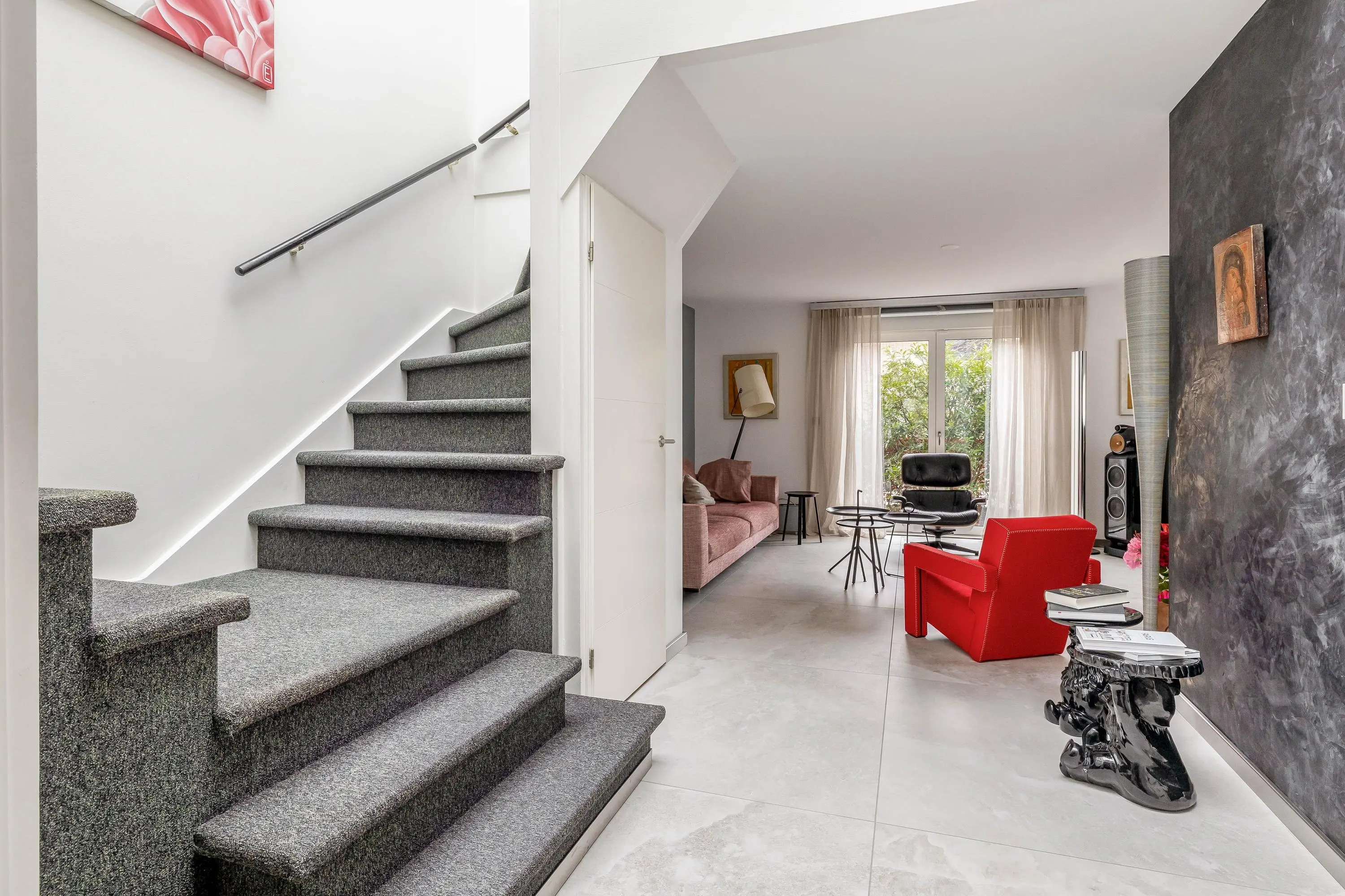 Via een fraaie aluminium deur stap je de woning binnen. Direct valt de dubbele uitwaaiende trap in de vide op. Via 2 routes biedt de trap doorgang naar de slaapverdieping. De blik gaat al snel omhoog naar de lichtstraat die een enorme hoeveelheid natuurlijk daglicht naar binnen laat. Wat een mooie start van deze woning. De entree is verder voorzien van de meterkast, een vaste kast met de wasmachine aansluiting en de C.V.-ketel en een toiletruimte voorzien van een wandcloset en fonteintje. Aan de voorzijde is een gezellige en lichte living te vinden. Via de twee openslaande deuren komt ook weer extra veel licht naar binnen. Het licht wordt versterkt door de lichte keramische vloer. Aan de achterzijde is de luxe woonkeuken gelegen met ook hier twee openslaande deuren. Groot van formaat met meer dan voldoende ruimte voor een gezellige eethoek. De keuken is van alle gemakken voorzien met een vaatwasser, 5-pits inductiekookplaat, afzuigkap, Quooker, heteluchtoven, stoomoven, koel-vriescombinatie. Een droom voor iedere kookliefhebber van het merk Poggenpohl met apparatuur van Miele en Gaggenau. Via de keuken is er een open doorgang naar de extra kamer op de begane grond. Deze is goed te gebruiken als kantoorruimte of hobbykamer. Daarna volgt de losse inpandige berging. In de tuin is ook een vrijstaande schuur aanwezig.