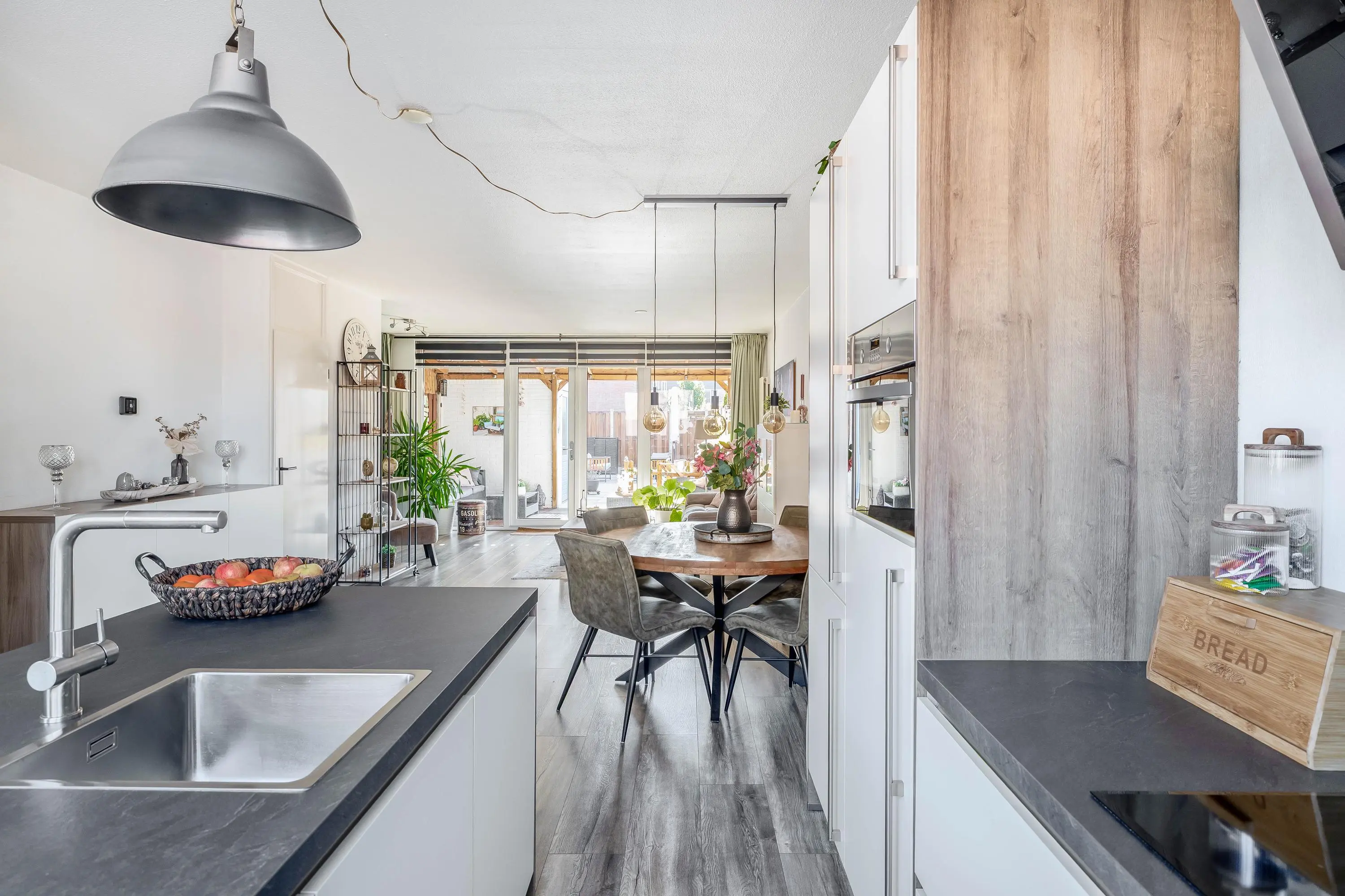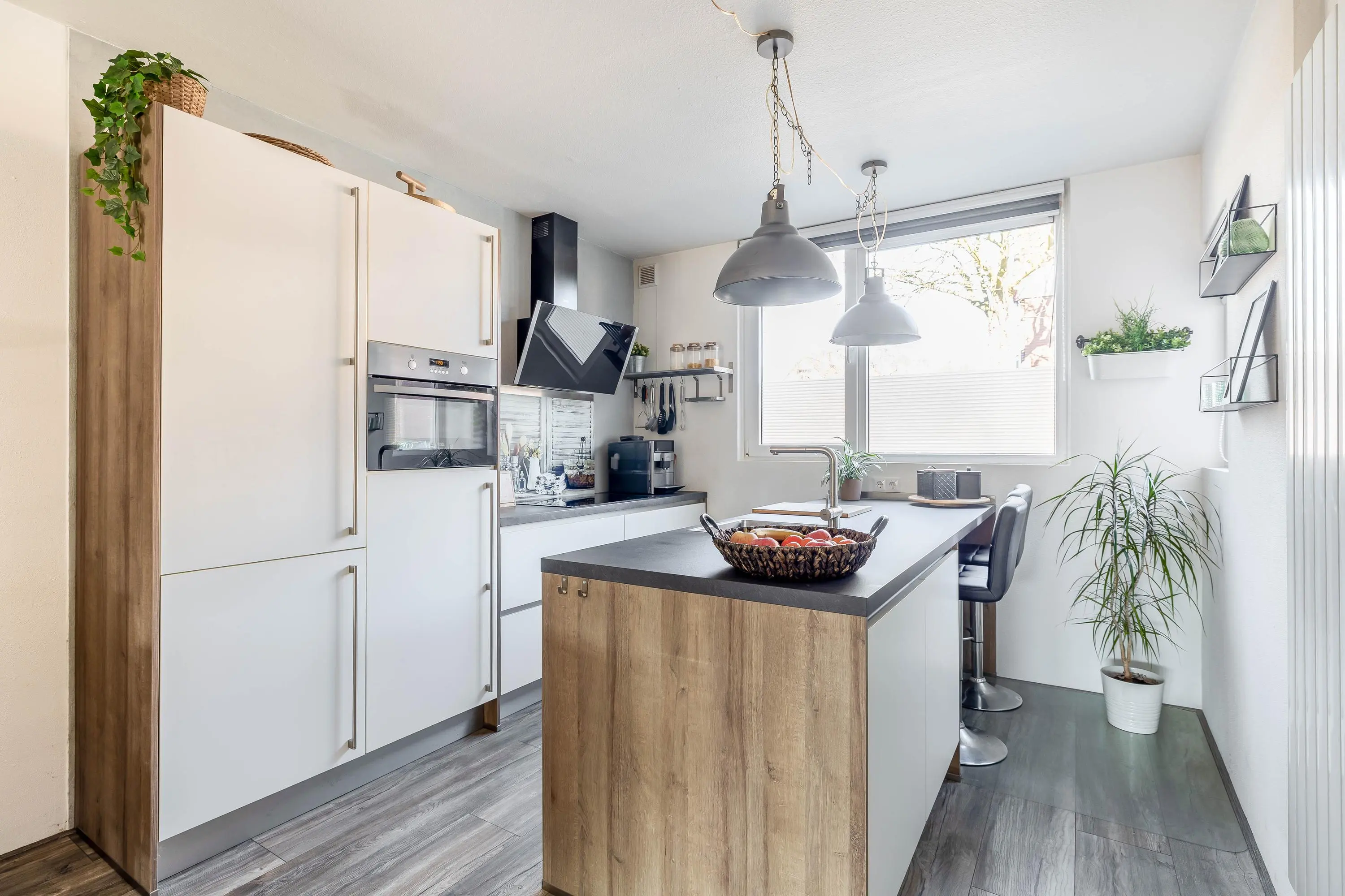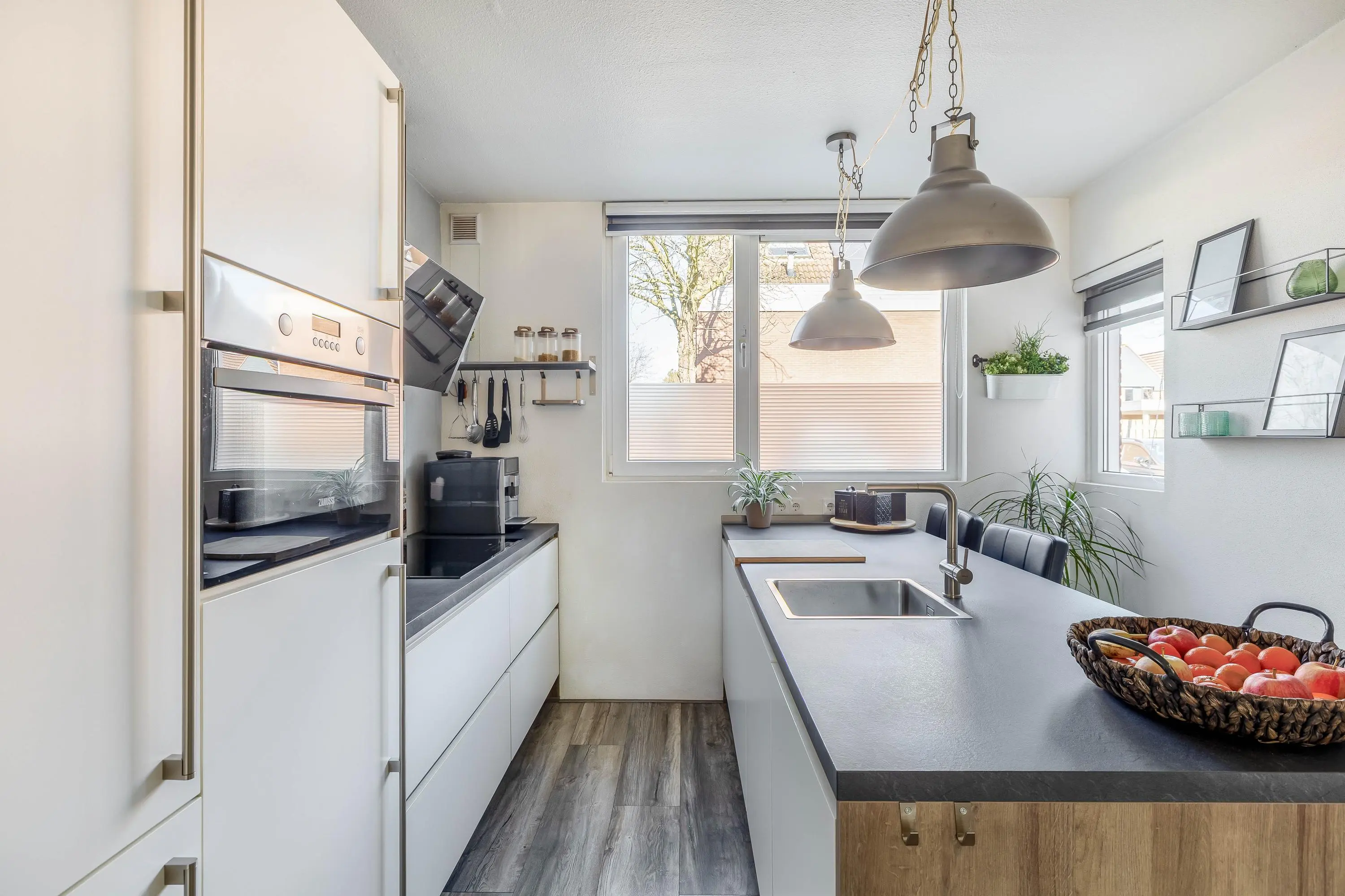 De moderne open keuken is gesitueerd aan de voorzijde van de woning en bestaat uit een wandopstelling met een spoeleiland. De keuken heeft een verzorgde uitstraling en is uitgevoerd in wit met een antraciet werkblad en houten zijpanelen. De wandopstelling is voorzien van een inductiekookplaat, afzuigkap, combi-oven en een koel-/vriescombinatie. Het spoeleiland is praktisch ingericht en uitgerust met een vaatwasser. Daarnaast is er ruimte voor barkrukken, ideaal voor een gezellig zitgedeelte.