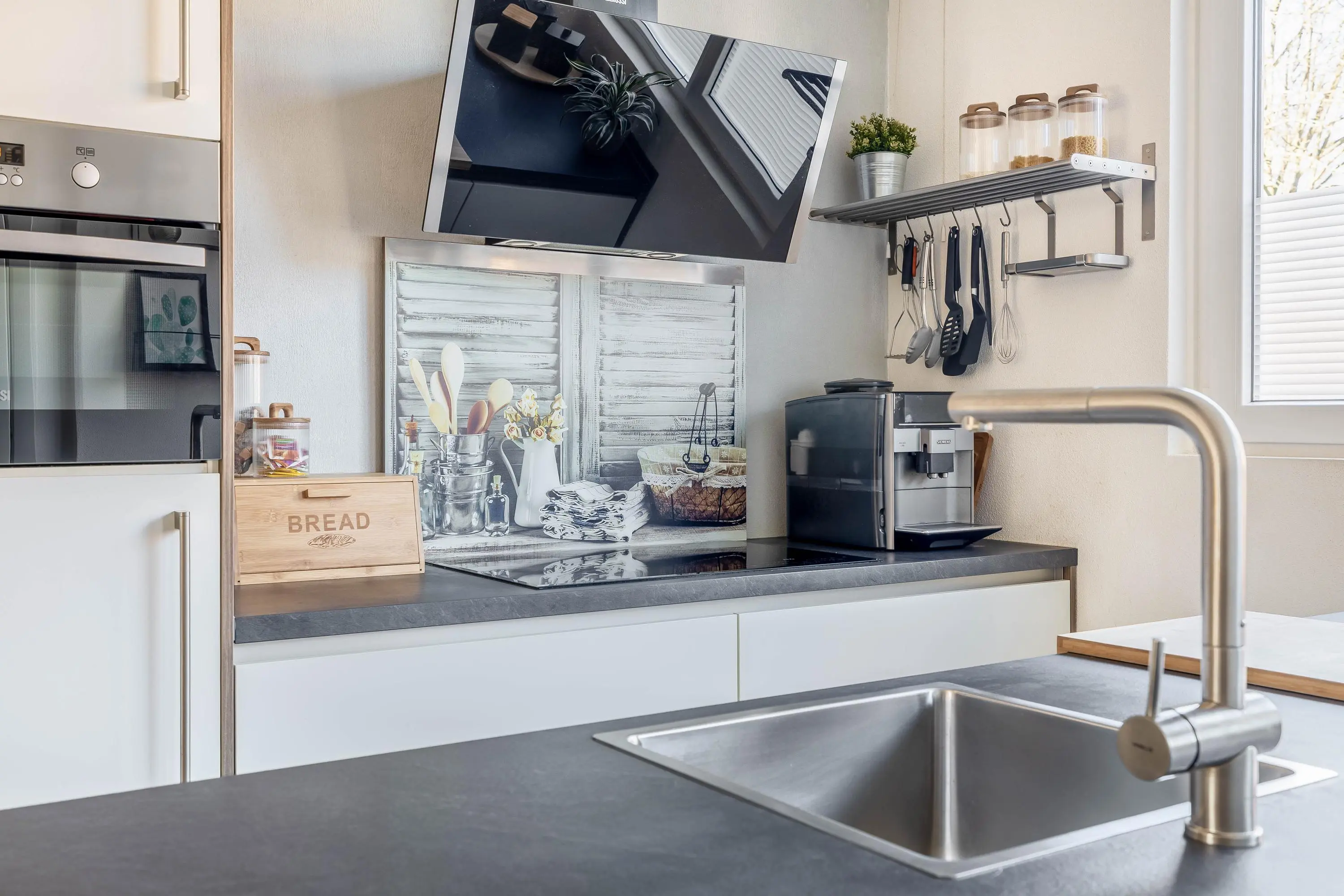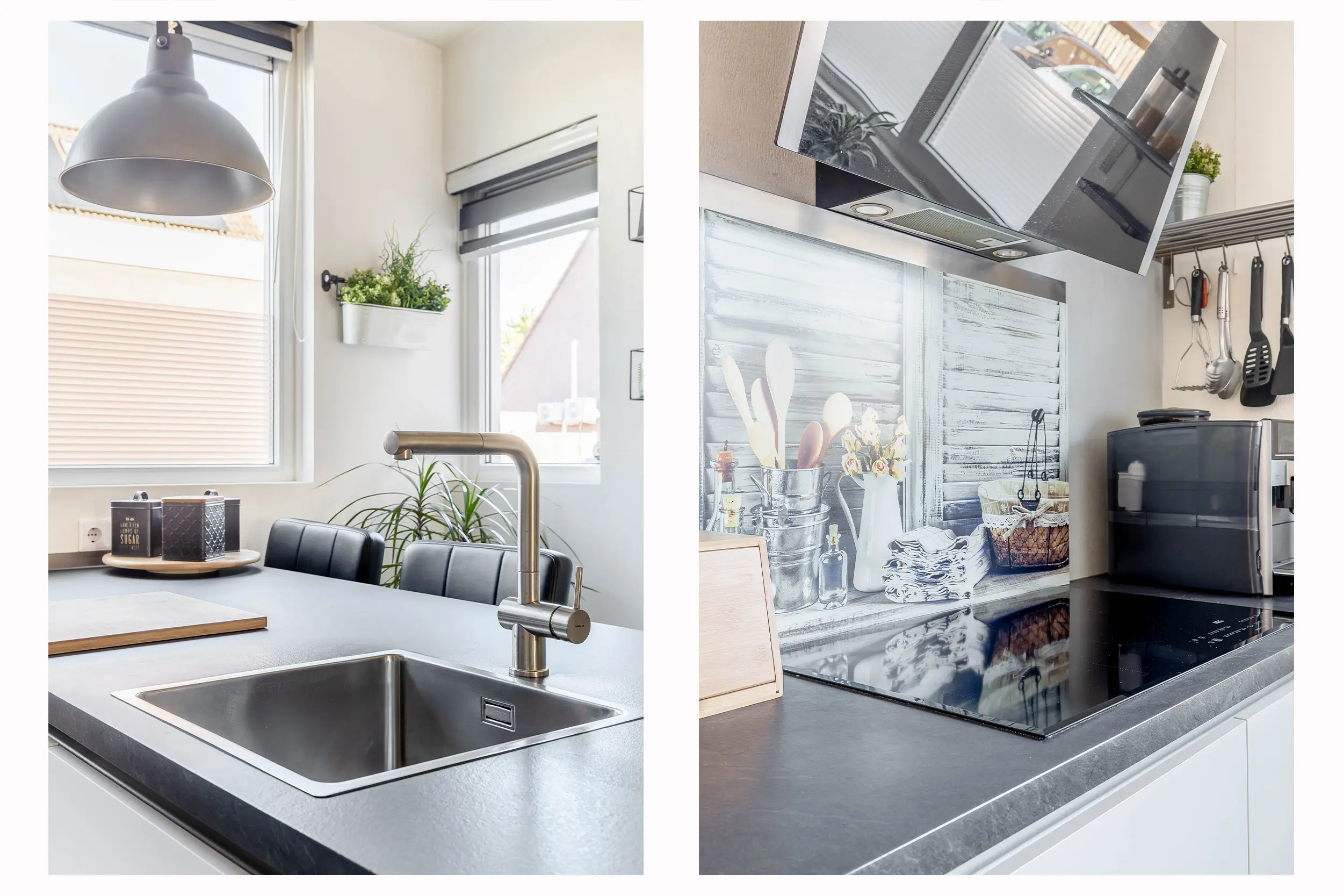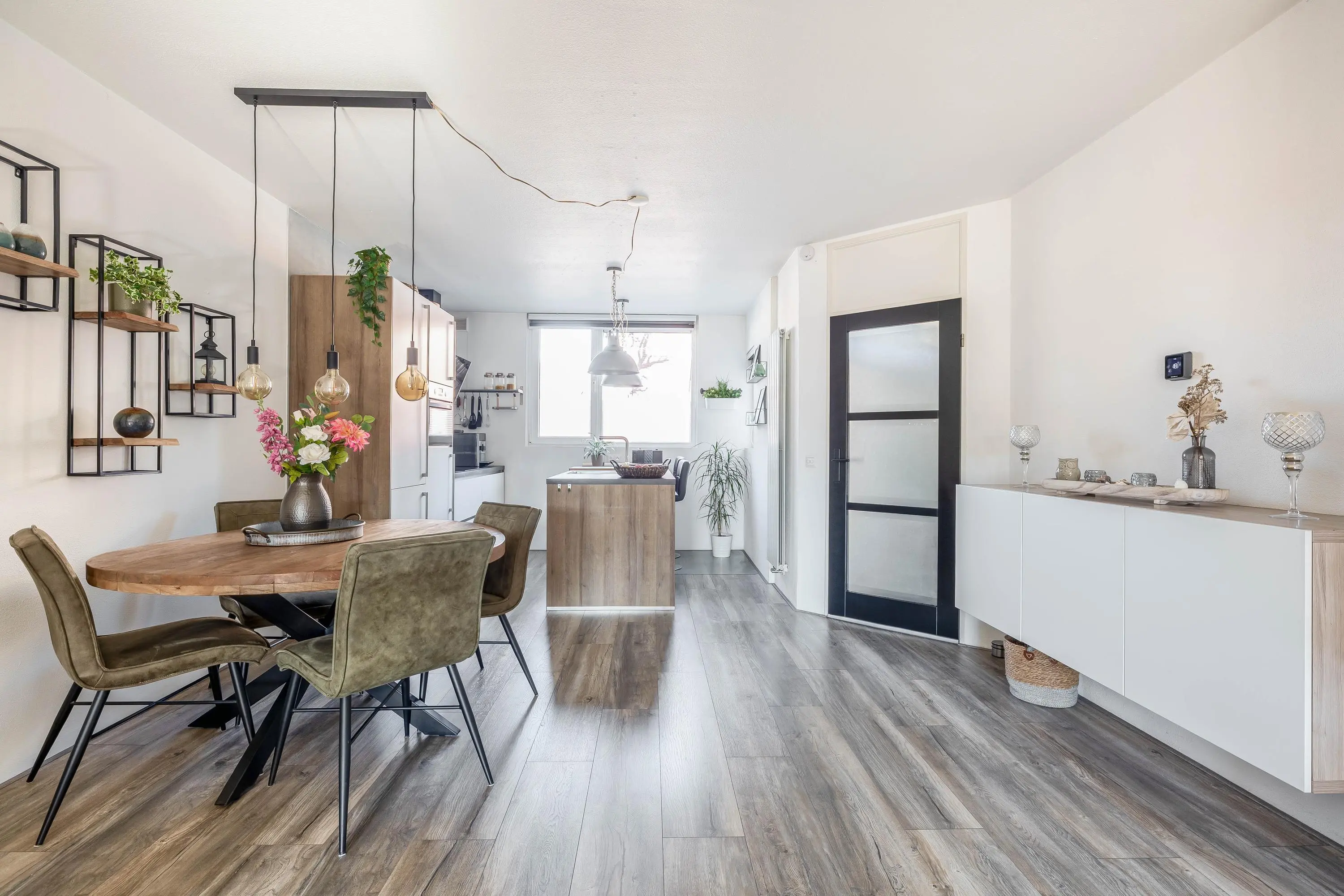 De moderne open keuken is gesitueerd aan de voorzijde van de woning en bestaat uit een wandopstelling met een spoeleiland. De keuken heeft een verzorgde uitstraling en is uitgevoerd in wit met een antraciet werkblad en houten zijpanelen. De wandopstelling is voorzien van een inductiekookplaat, afzuigkap, combi-oven en een koel-/vriescombinatie. Het spoeleiland is praktisch ingericht en uitgerust met een vaatwasser. Daarnaast is er ruimte voor barkrukken, ideaal voor een gezellig zitgedeelte.