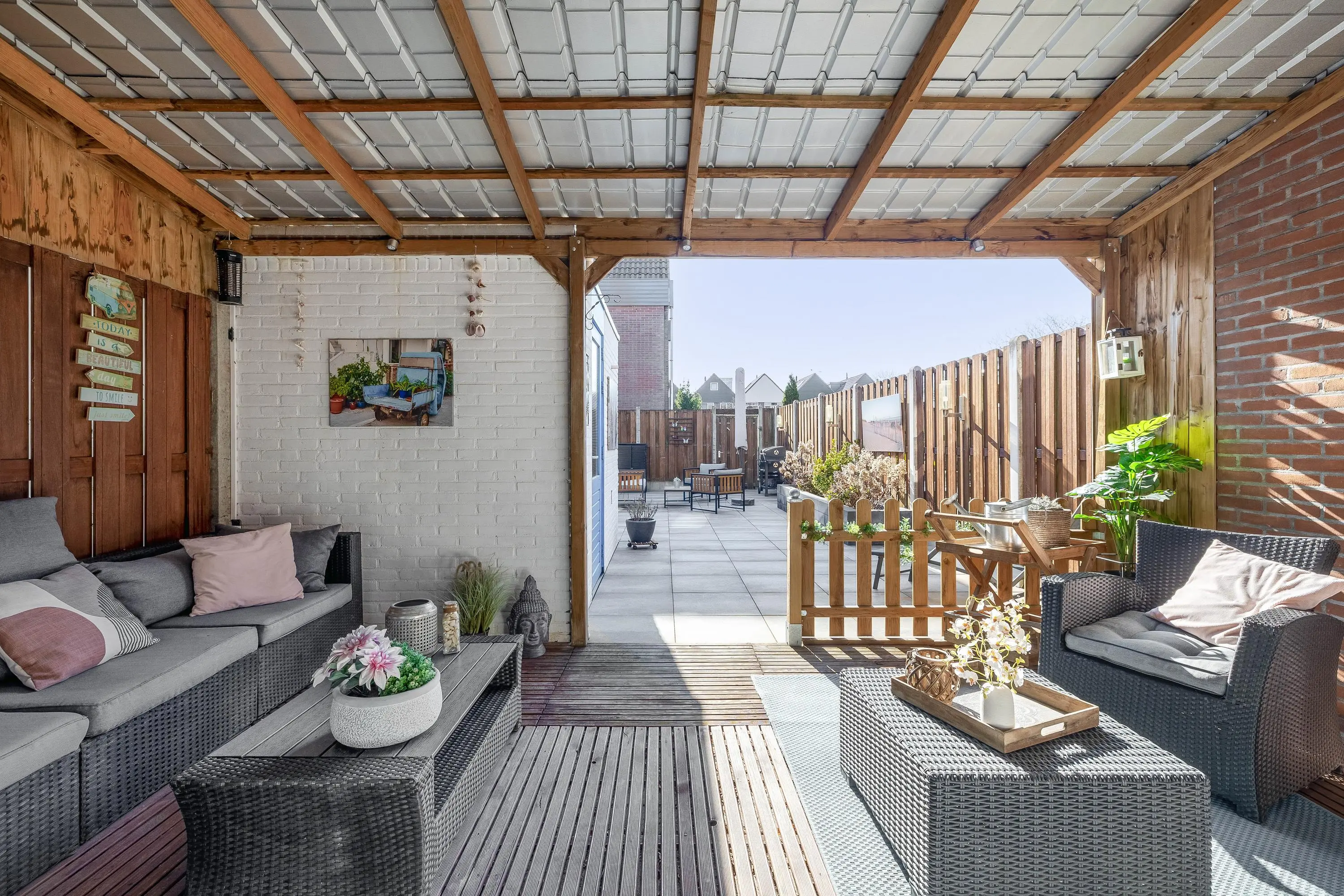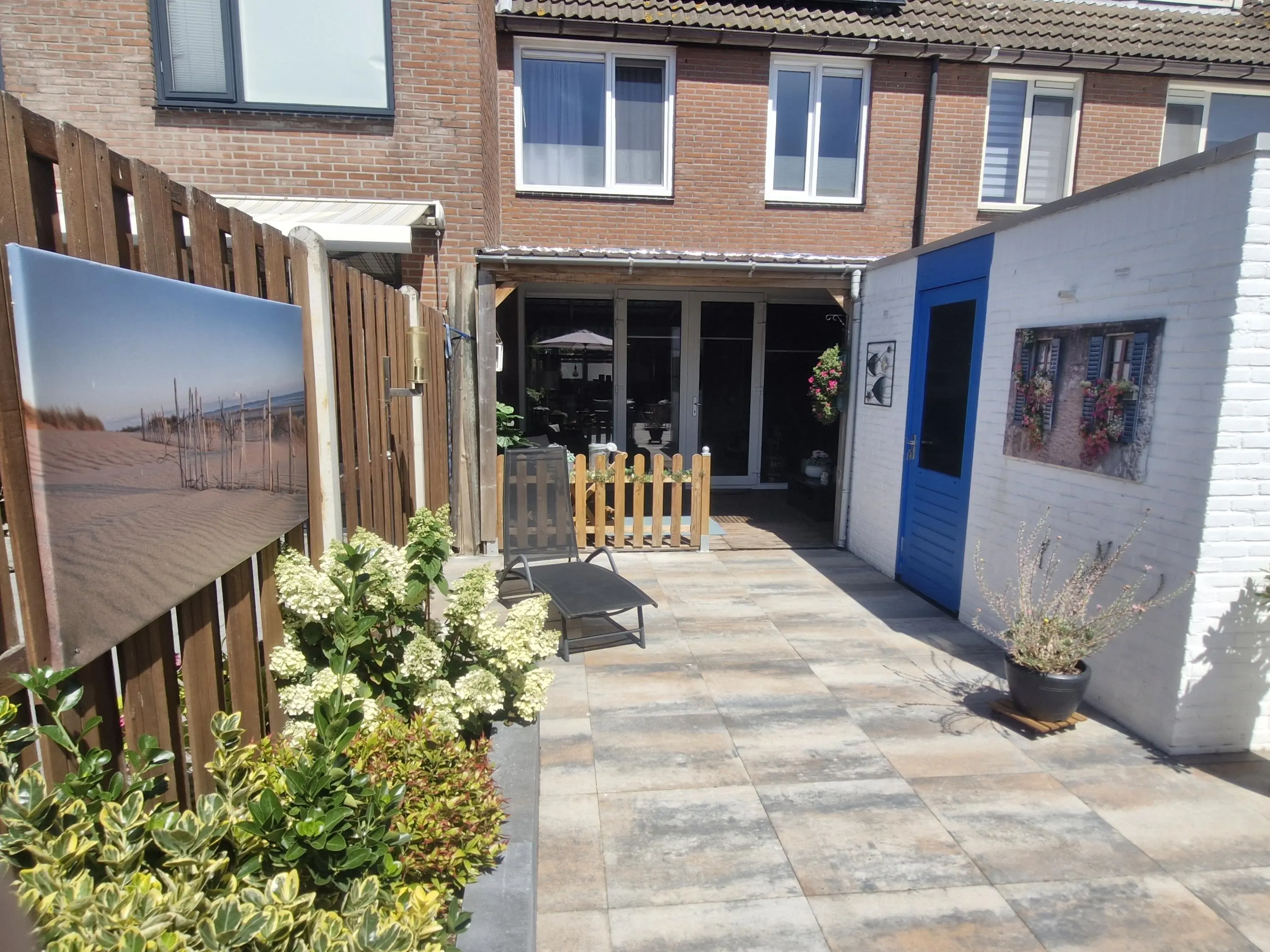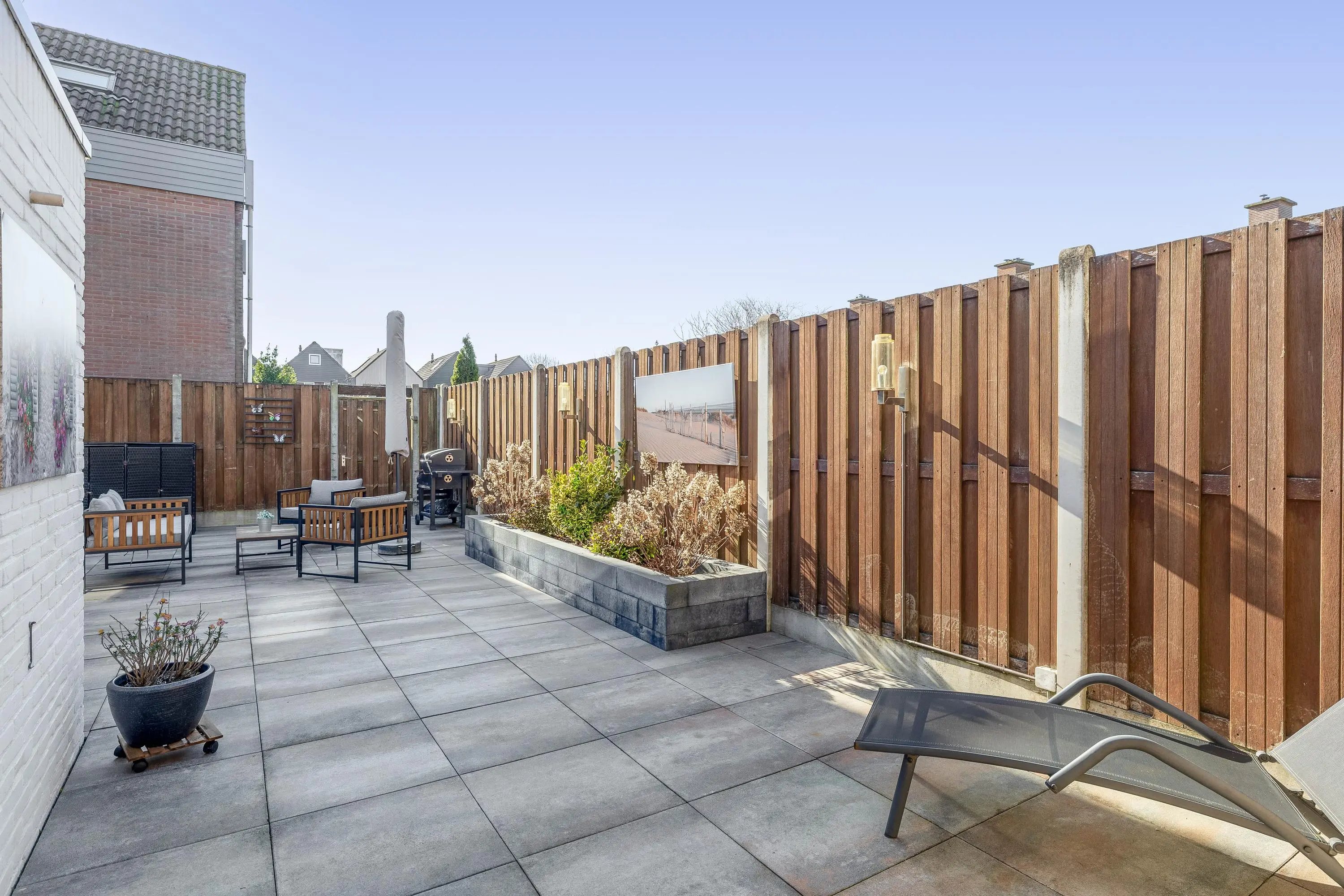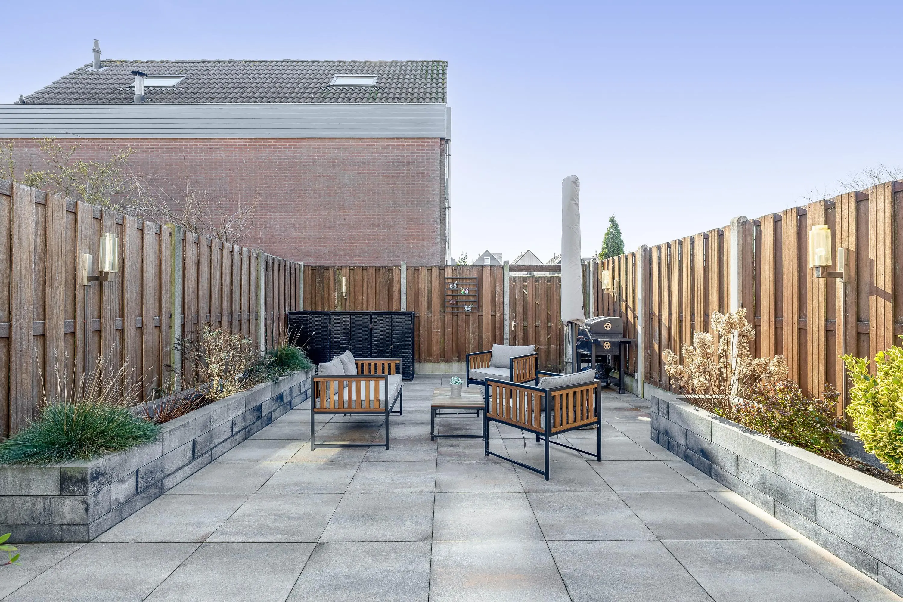 Deze verzorgde achtertuin is een heerlijke plek om te genieten van het buitenleven! Dankzij de gunstige ligging op het zonnige zuiden profiteer je hier al vroeg op de dag van de zon. De tuin is sfeervol aangelegd met een combinatie van strak tegelwerk, aangevuld met een fraaie borders die zorgt voor groene accenten. Onder de ruime overkapping van circa 15m² kun je het hele jaar door comfortabel zitten, perfect voor lange zomeravonden. In de achtertuin bevindt zich tevens een praktische stenen berging van circa 6m², voorzien van elektra. De tuin is bovendien bereikbaar via een handige achterom.