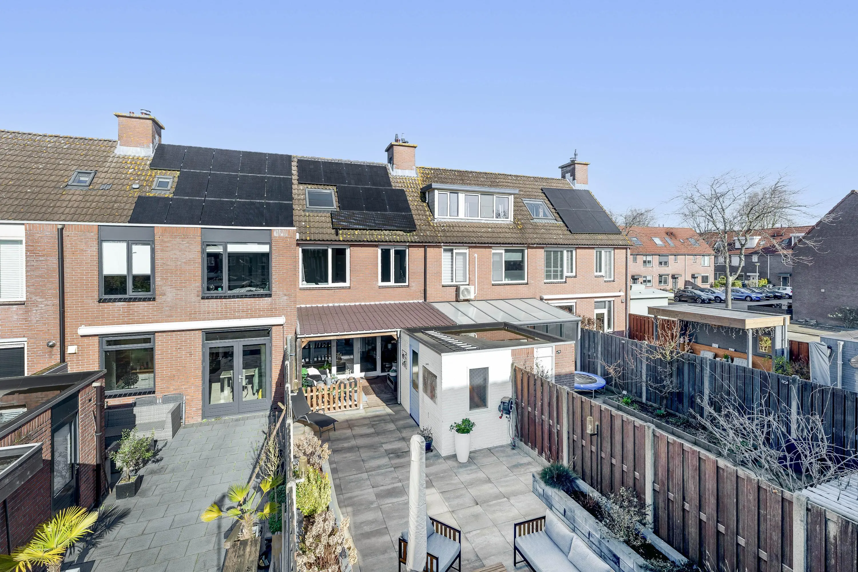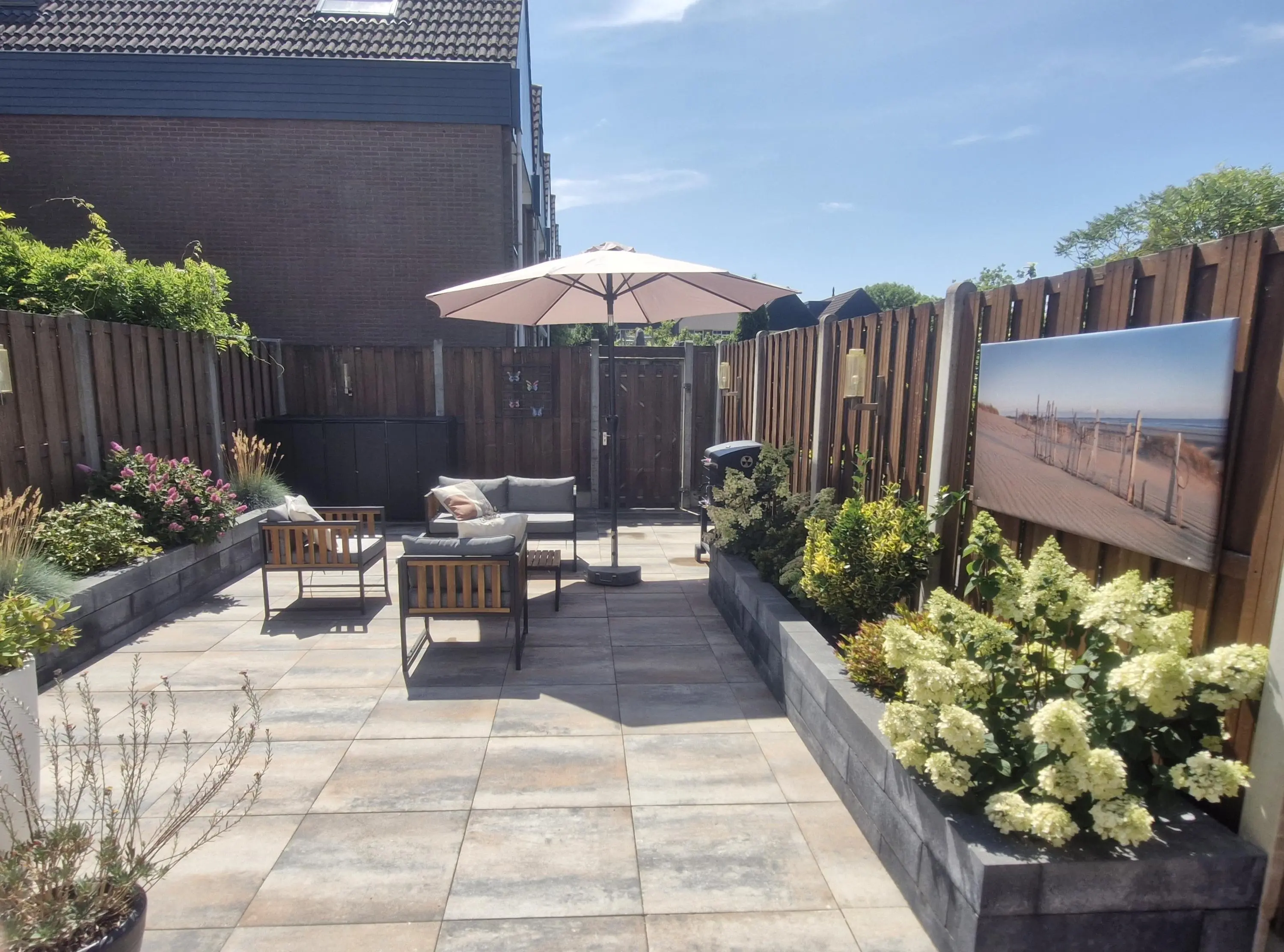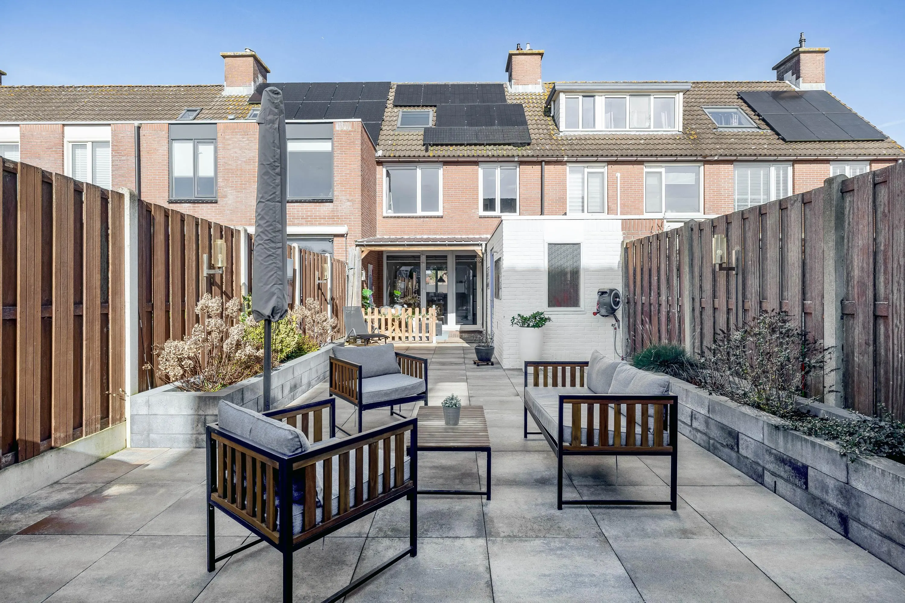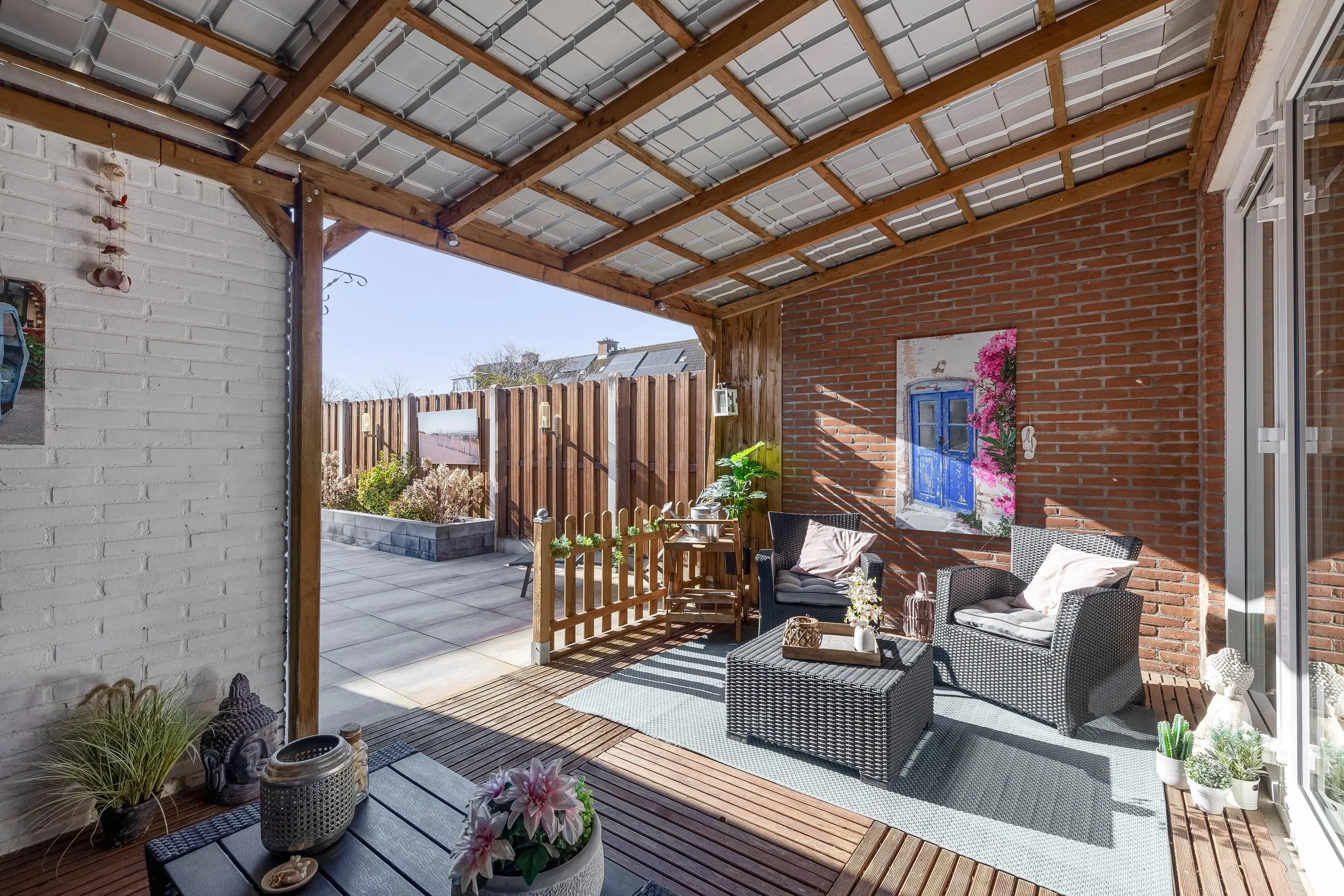 Deze verzorgde achtertuin is een heerlijke plek om te genieten van het buitenleven! Dankzij de gunstige ligging op het zonnige zuiden profiteer je hier al vroeg op de dag van de zon. De tuin is sfeervol aangelegd met een combinatie van strak tegelwerk, aangevuld met een fraaie borders die zorgt voor groene accenten. Onder de ruime overkapping van circa 15m² kun je het hele jaar door comfortabel zitten, perfect voor lange zomeravonden. In de achtertuin bevindt zich tevens een praktische stenen berging van circa 6m², voorzien van elektra. De tuin is bovendien bereikbaar via een handige achterom.