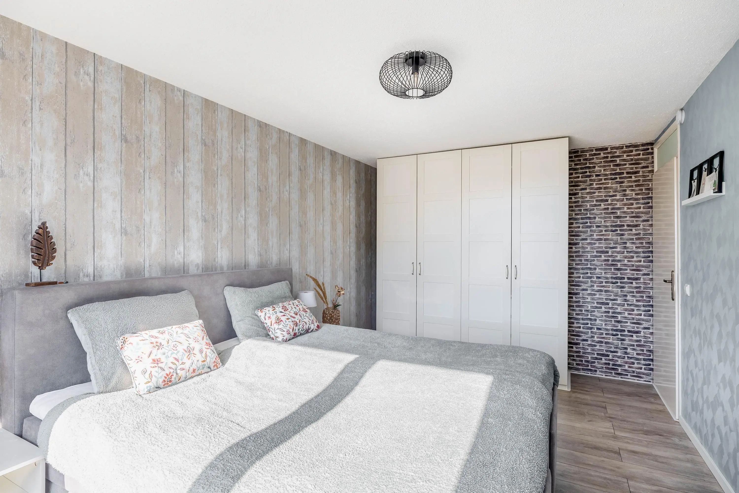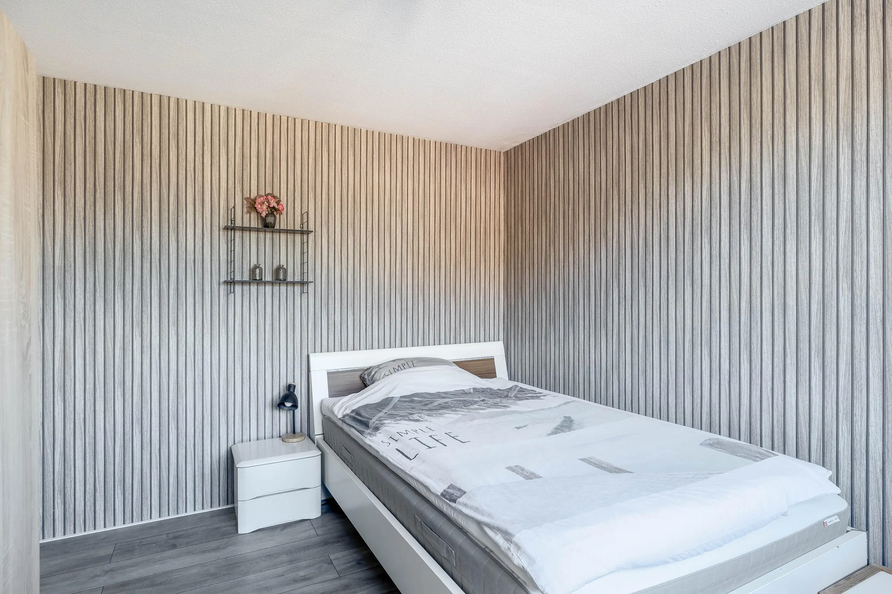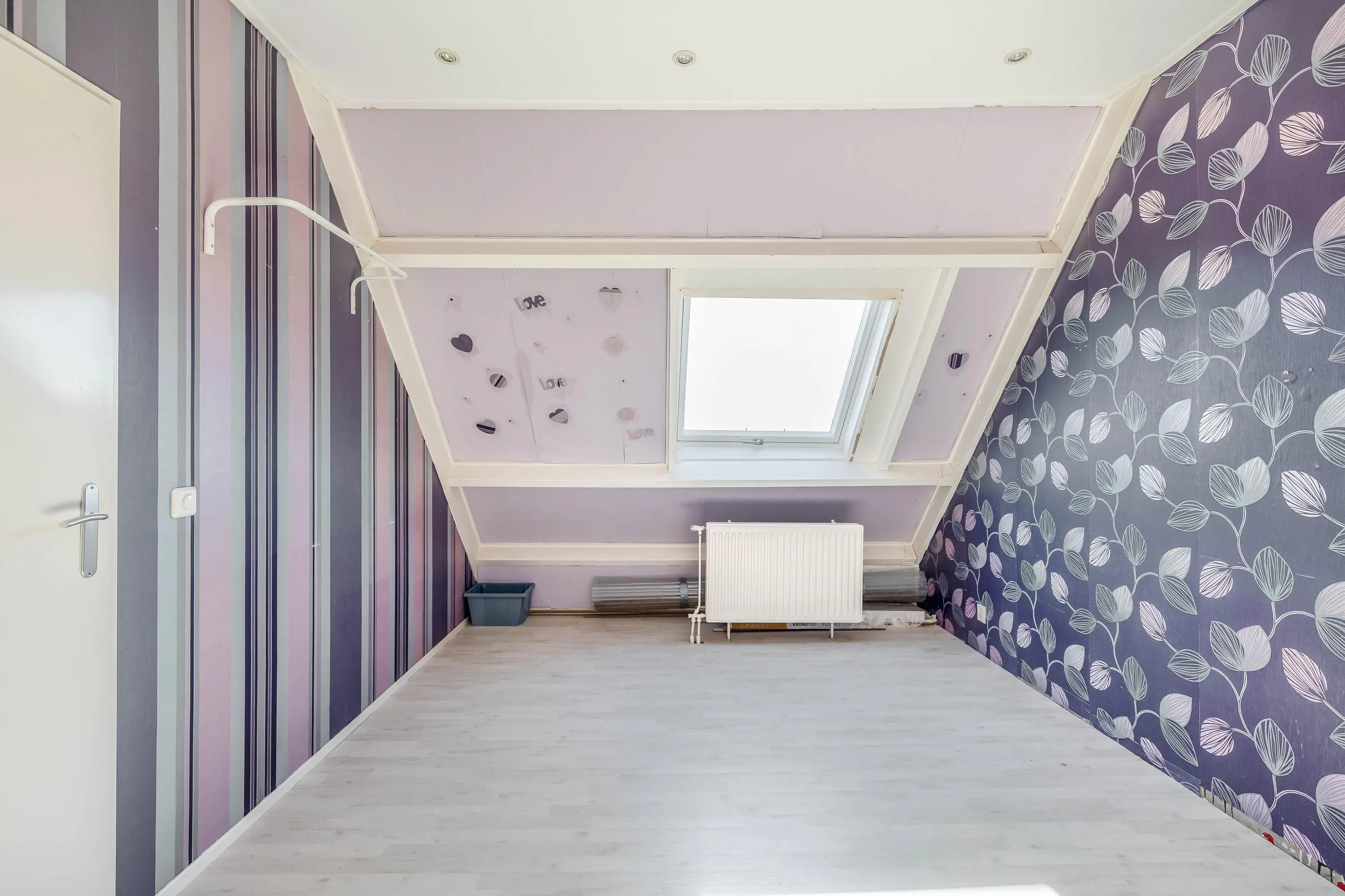 De slaapkamer is afgewerkt met dezelfde laminaatvloer als de overloop, wat zorgt voor een uniforme uitstraling. Met een oppervlakte van circa 12m² is dit een fijne ruimte. De kamer is verder afgewerkt met behangwanden en voorzien van een dakraam.