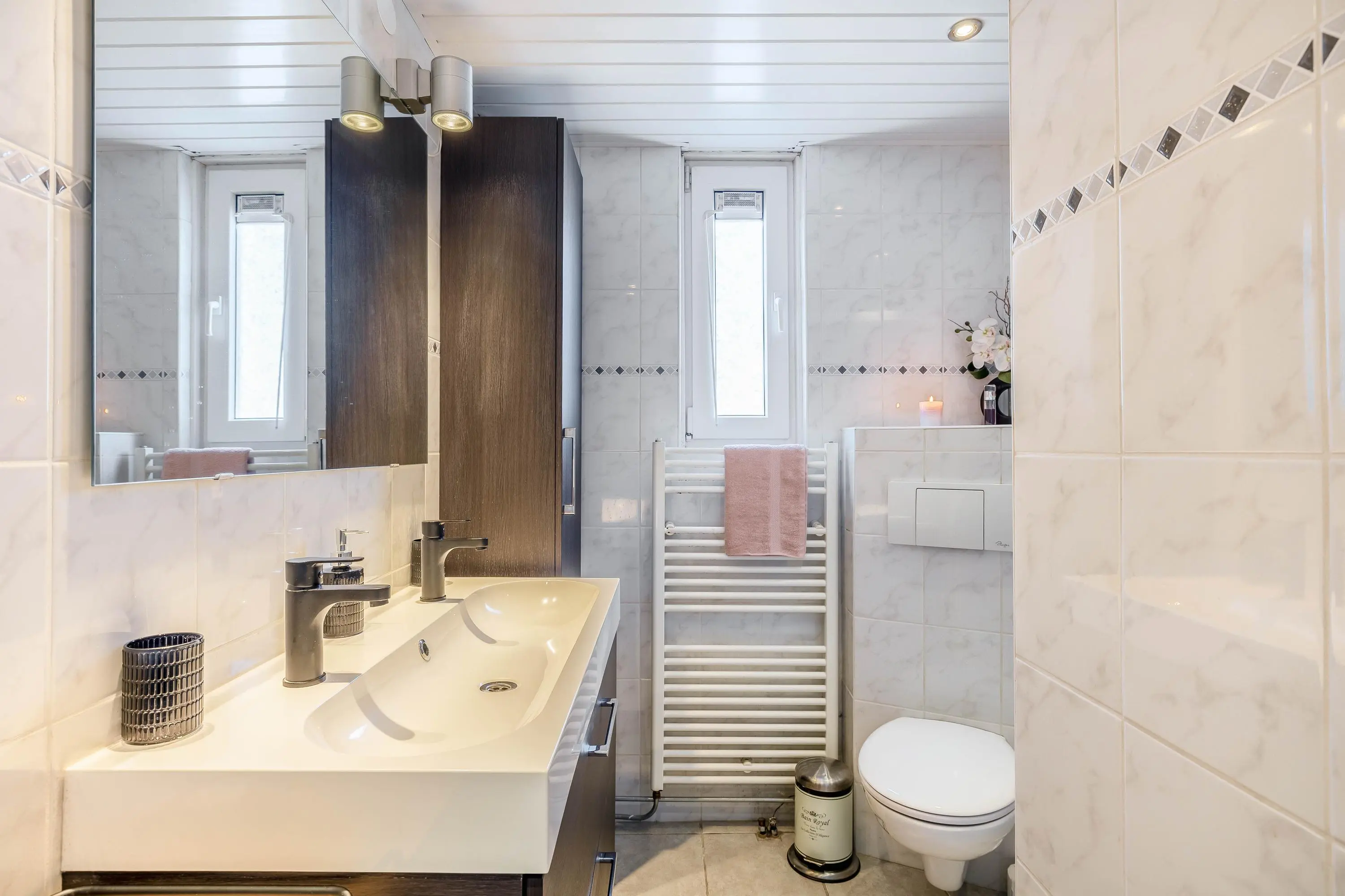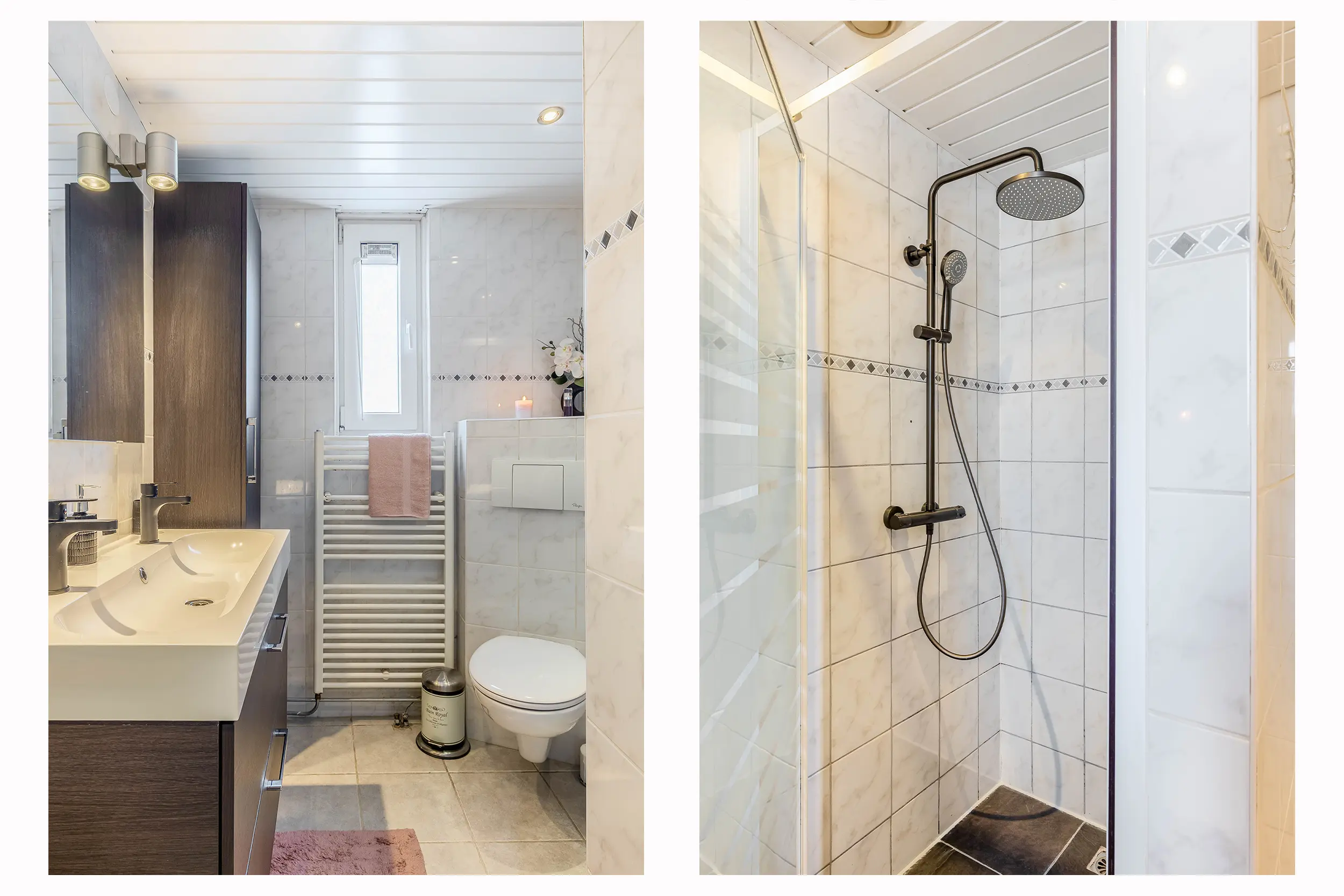 De volledig betegelde badkamer is uitgerust met een douche, toilet, handdoekradiator en een wastafelmeubel met dubbele wasbak en bijpassende kast.