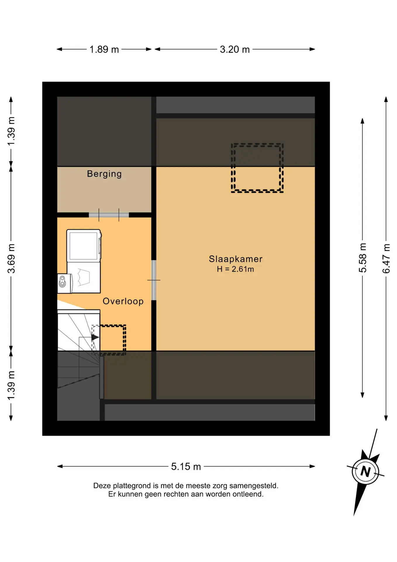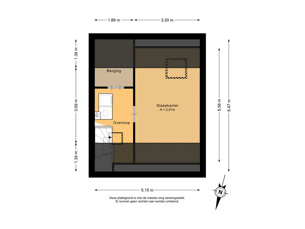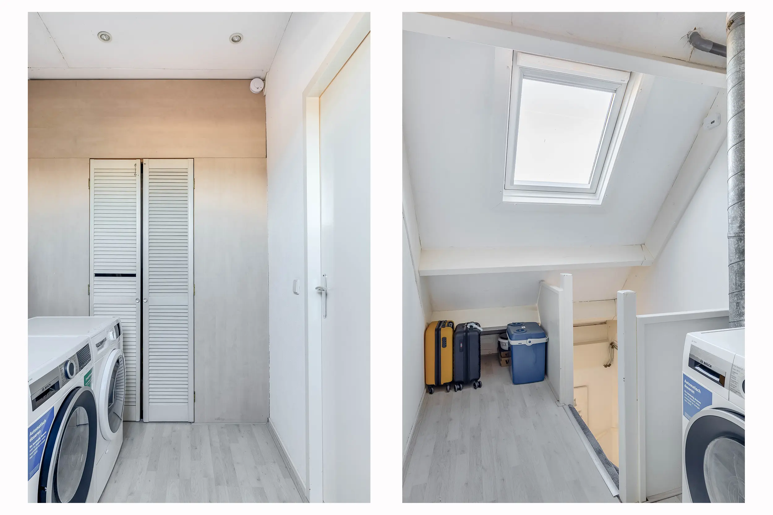 De overloop is afgewerkt met een laminaatvloer en voorzien van een dakraam, wat zorgt voor natuurlijke lichtinval. Hier bevinden zich tevens de cv-opstelling en de aansluitingen voor de wasmachine en droger. Vanaf de overloop is er toegang tot een praktische bergruimte en de slaapkamer.