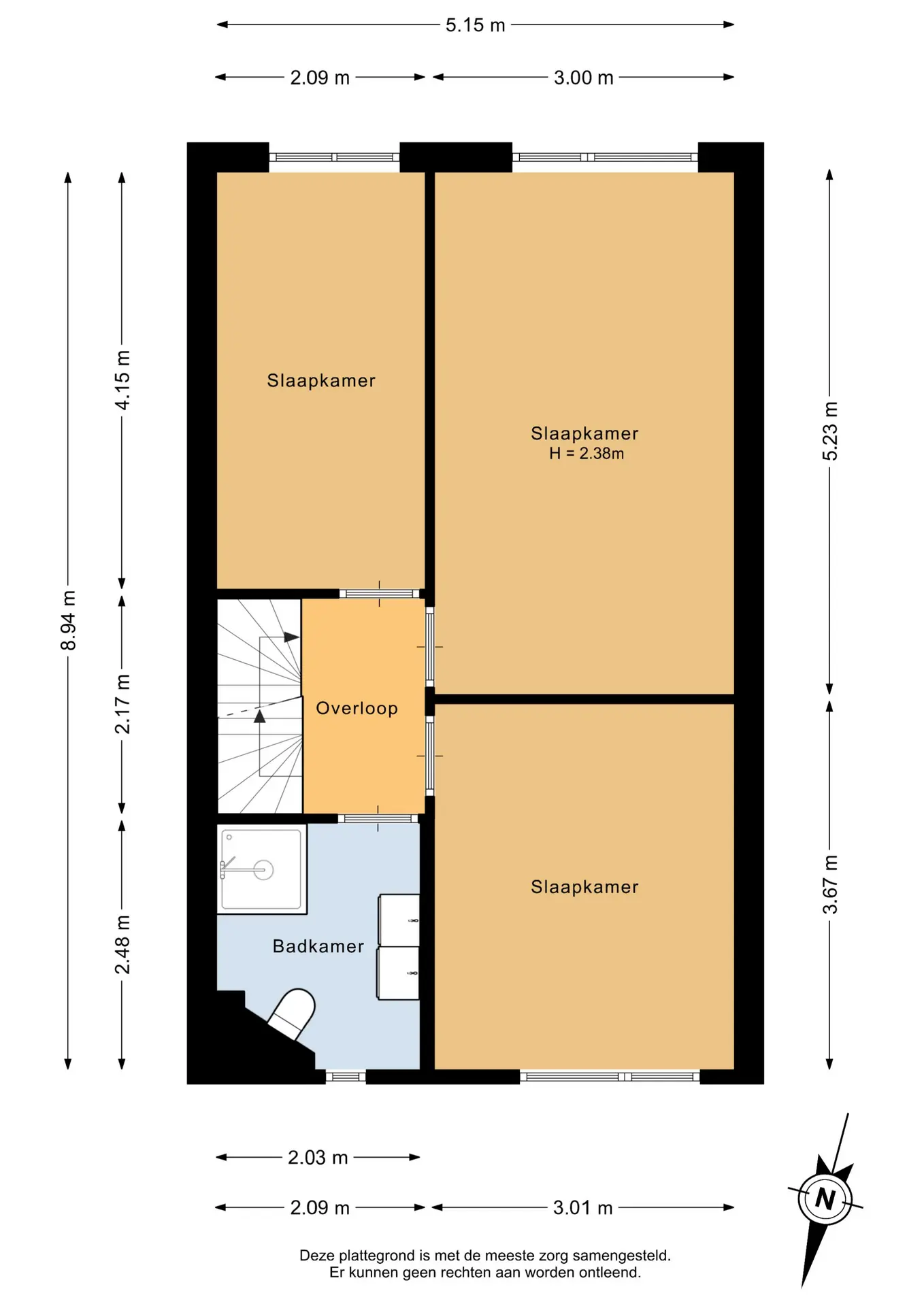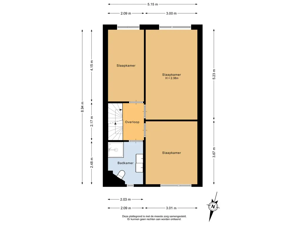 De hoofdslaapkamer is gelegen aan de achterzijde van de woning en heeft een oppervlakte van circa 15,5m². De tweede slaapkamer bevindt zich aan de voorzijde en meet circa 11m². De derde slaapkamer, eveneens aan de achterzijde, heeft een oppervlakte van ongeveer 8,5m². Alle slaapkamers zijn voorzien van behangwanden en een laminaatvloer en beschikken over een prettige lichtinval.
