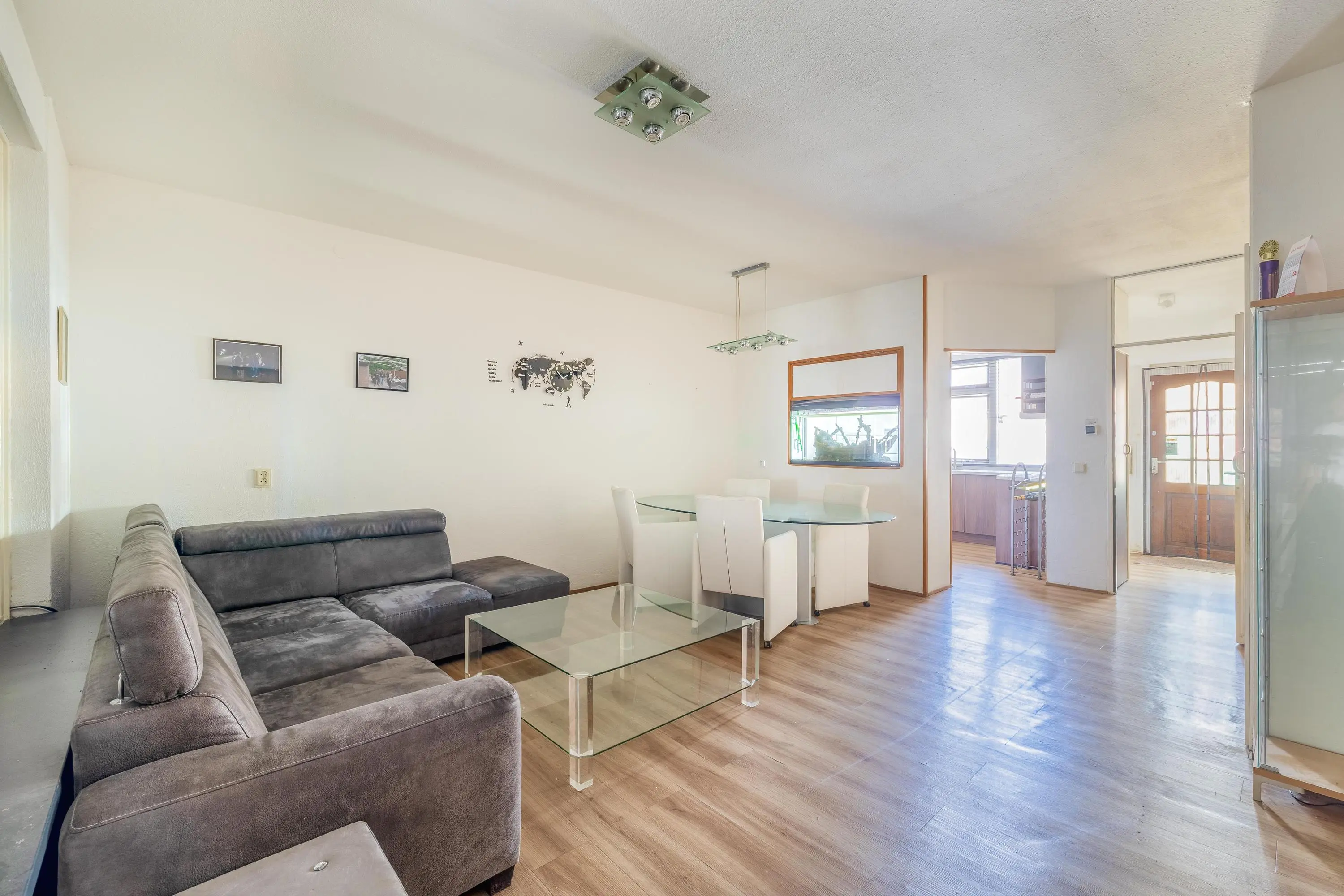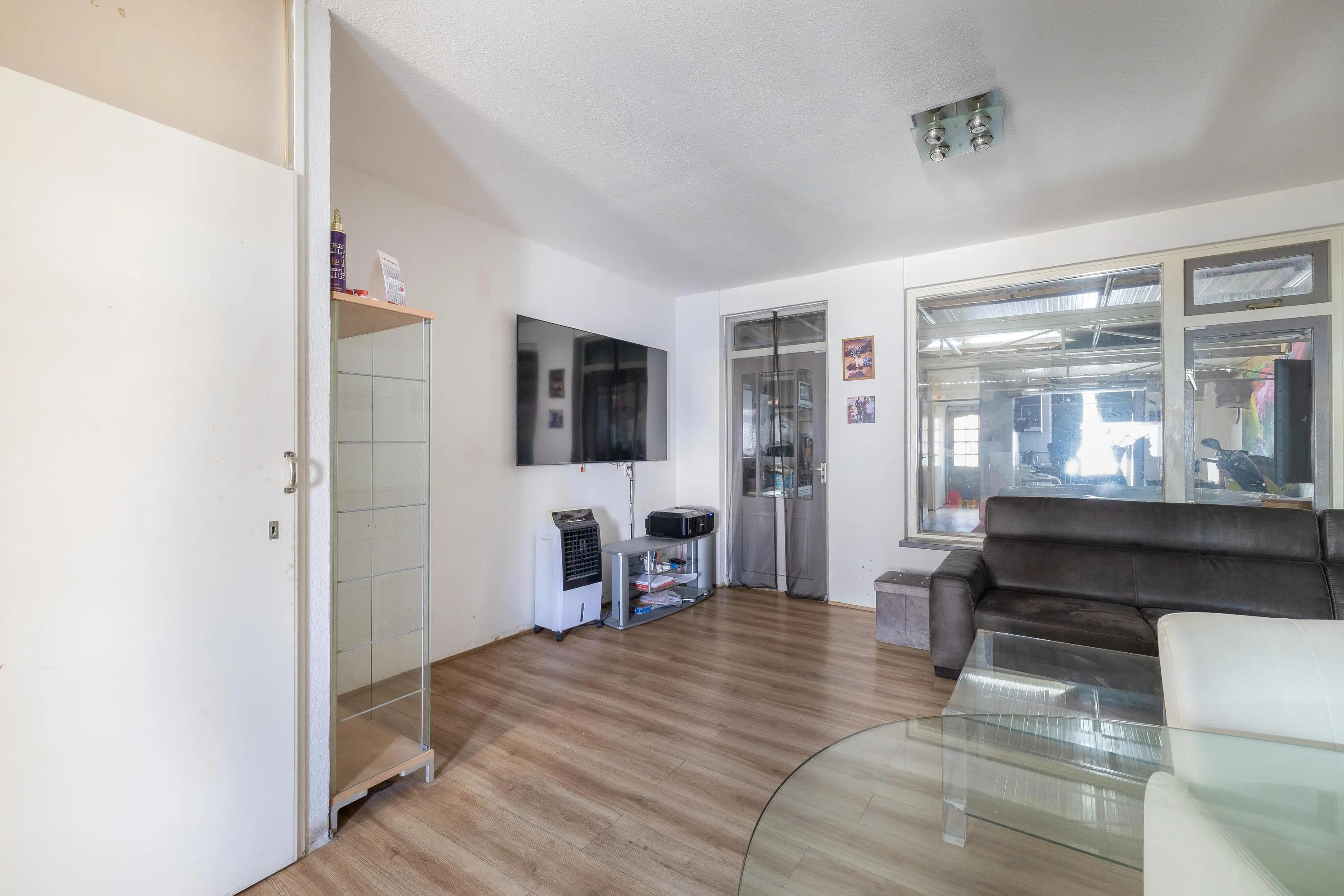 De woonkamer biedt voldoende ruimte voor een comfortabele zithoek én een eethoek. Daarnaast is er een praktische provisiekast aanwezig, ideaal voor extra opslag. Vanuit de woonkamer is er toegang tot een multifunctionele ruimte, die naar wens kan worden ingericht.