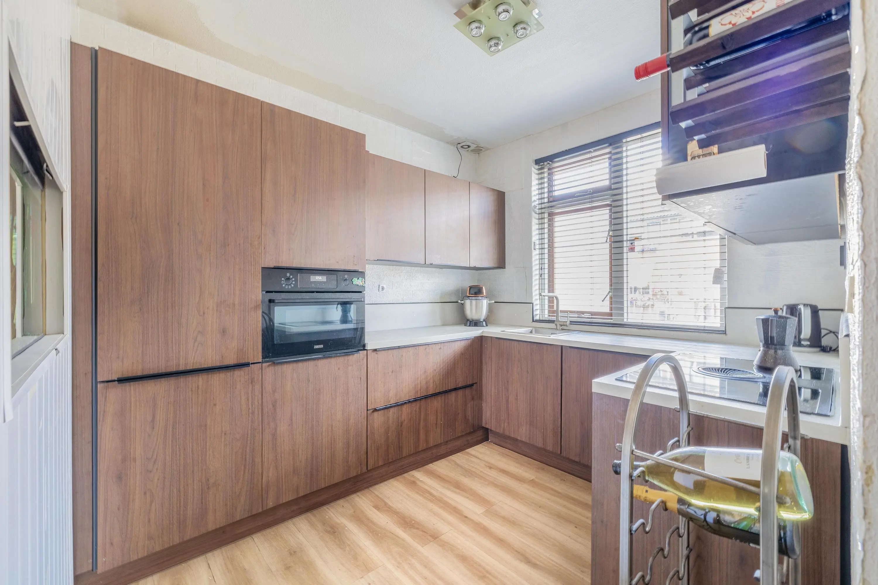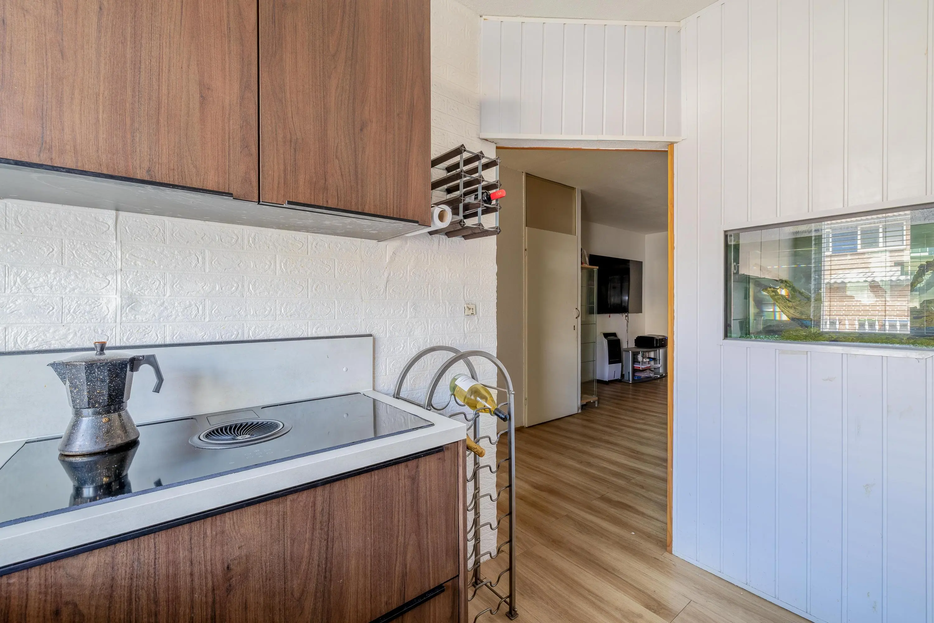 De halfopen keuken (2022) heeft een warme, houten uitstraling en is voorzien van moderne inbouwapparatuur, waaronder een inductiekookplaat met geïntegreerde afzuiging, een combimagnetron, vaatwasser en koelkast.