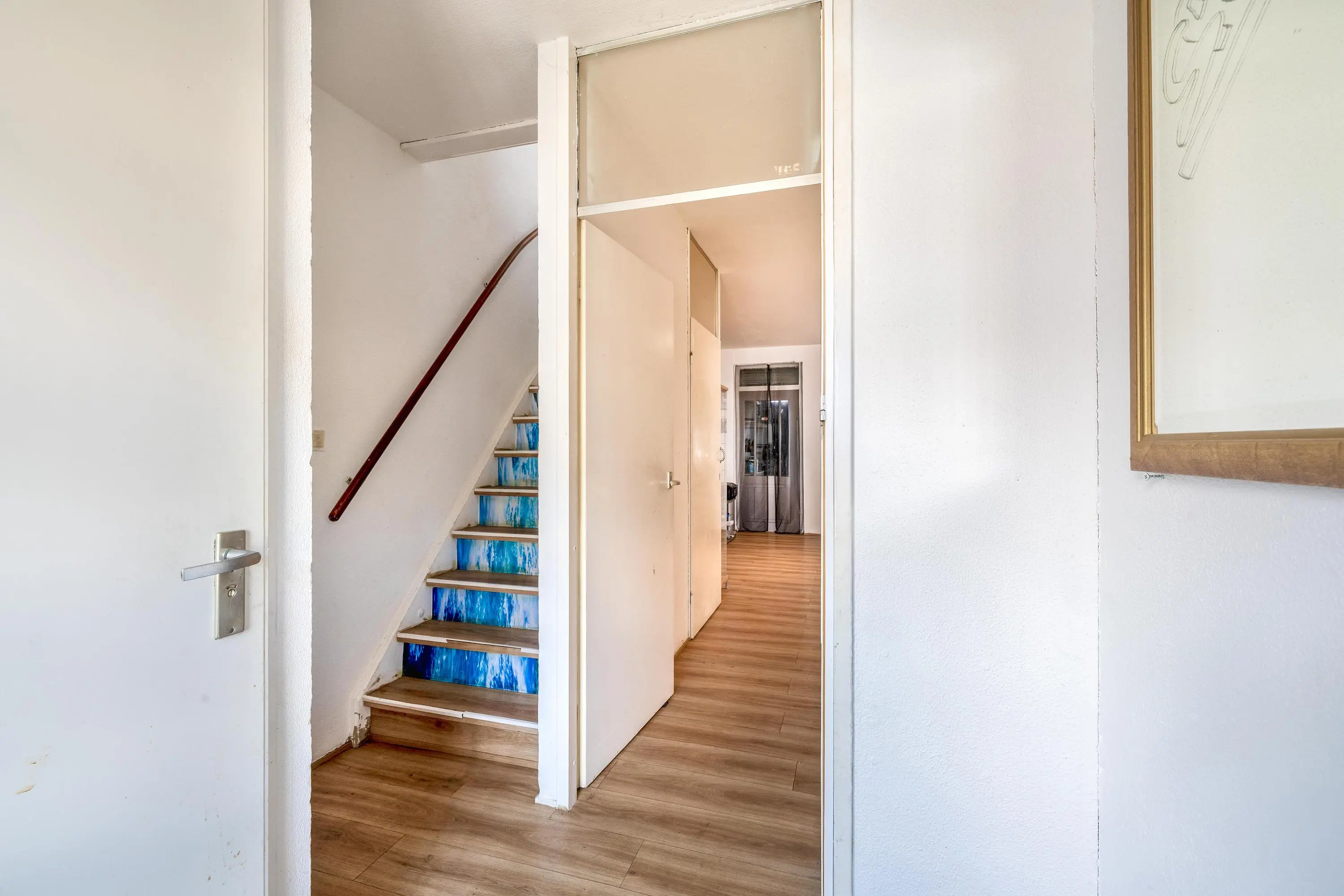 De overloop is voorzien van een betegelde vloer en biedt toegang tot drie slaapkamers, de badkamer en de trap naar de tweede verdieping.