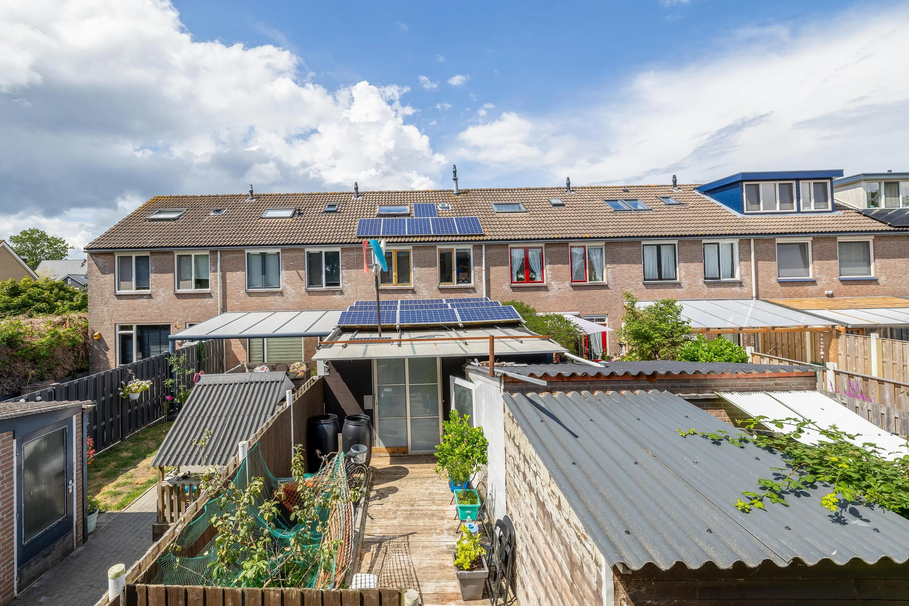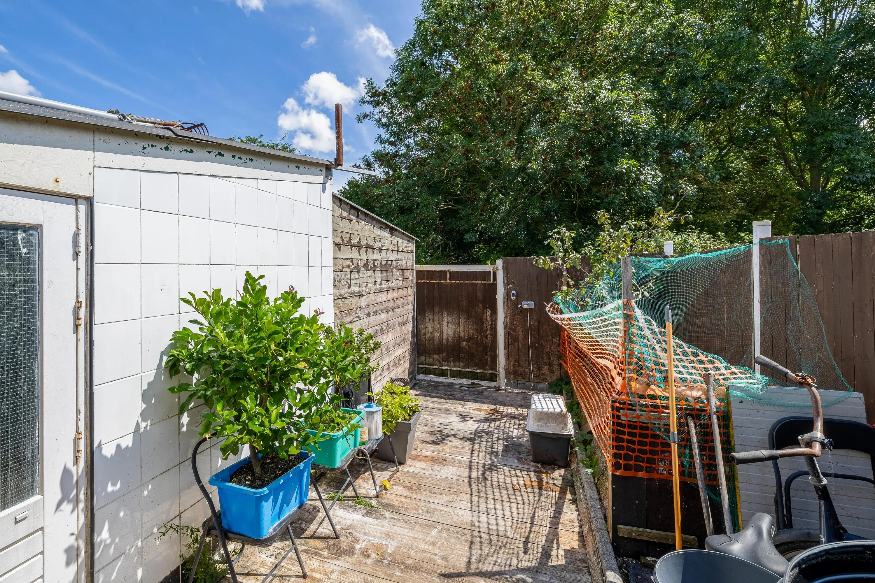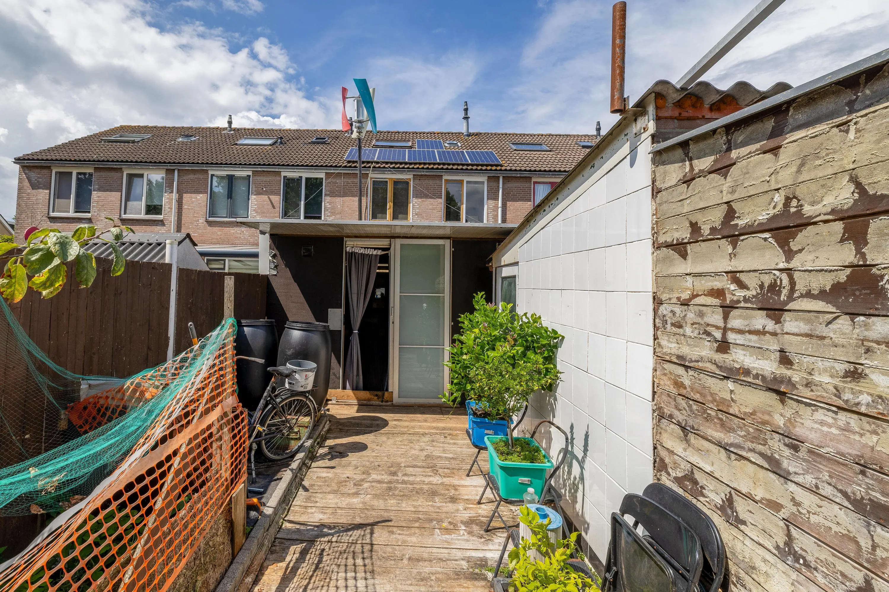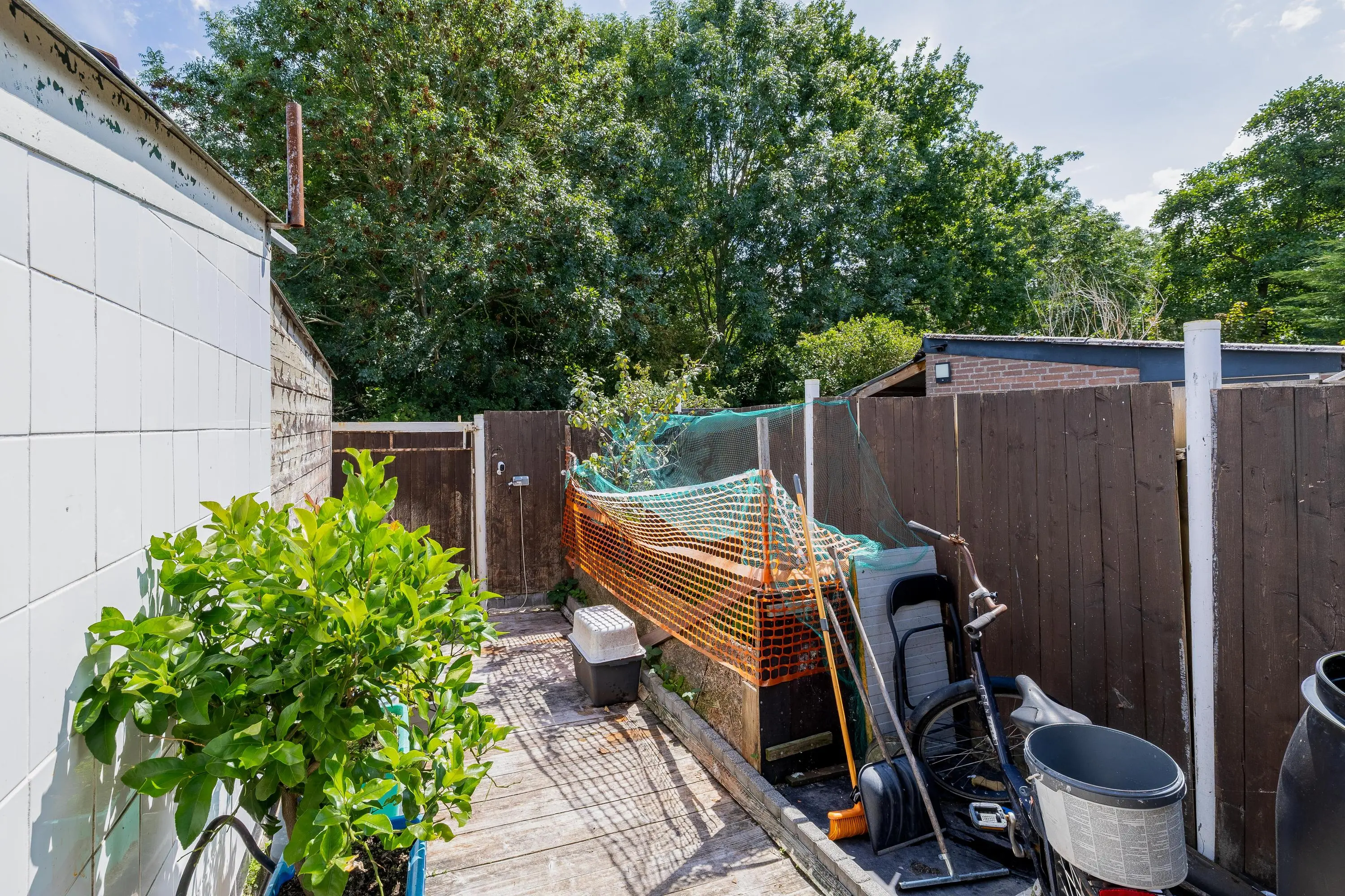 De achtertuin is gelegen op het zuidoosten en is grotendeels afgewerkt met houten vlonderplanken. In de tuin bevindt zich een vrijstaande berging met een oppervlakte van circa 10m².
