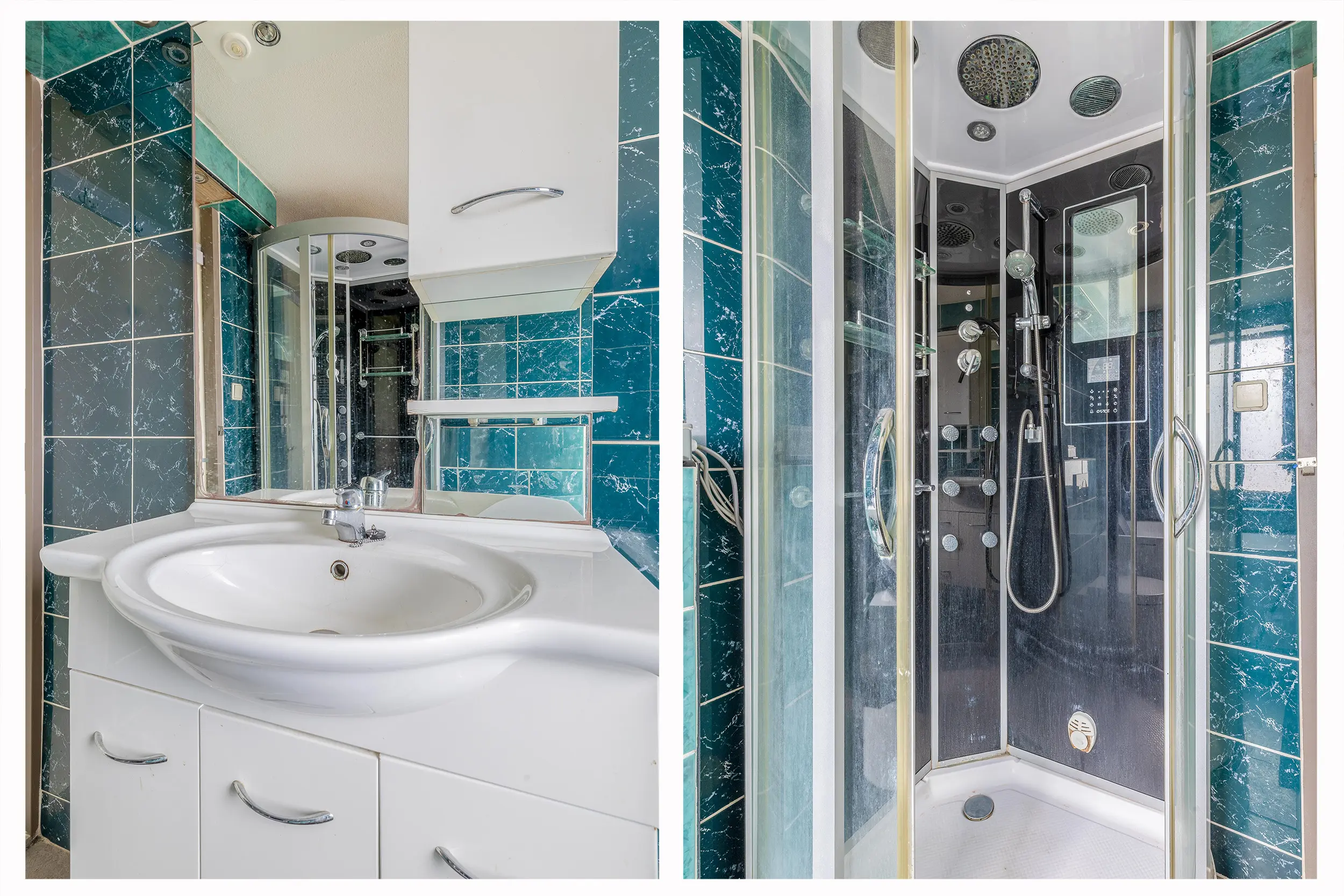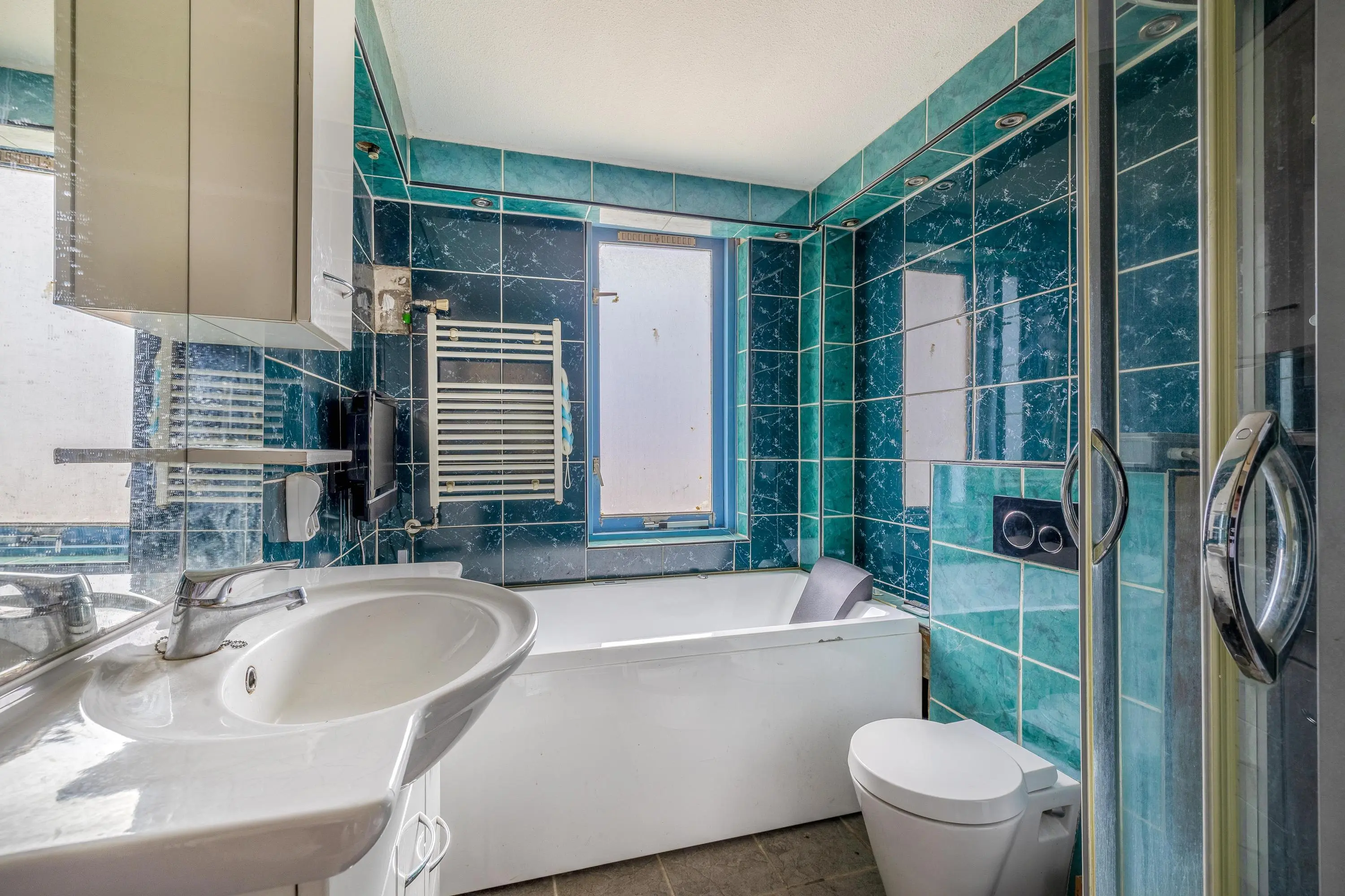 De volledig betegelde badkamer is voorzien van een ligbad, douchecabine, toilet en een wastafel.