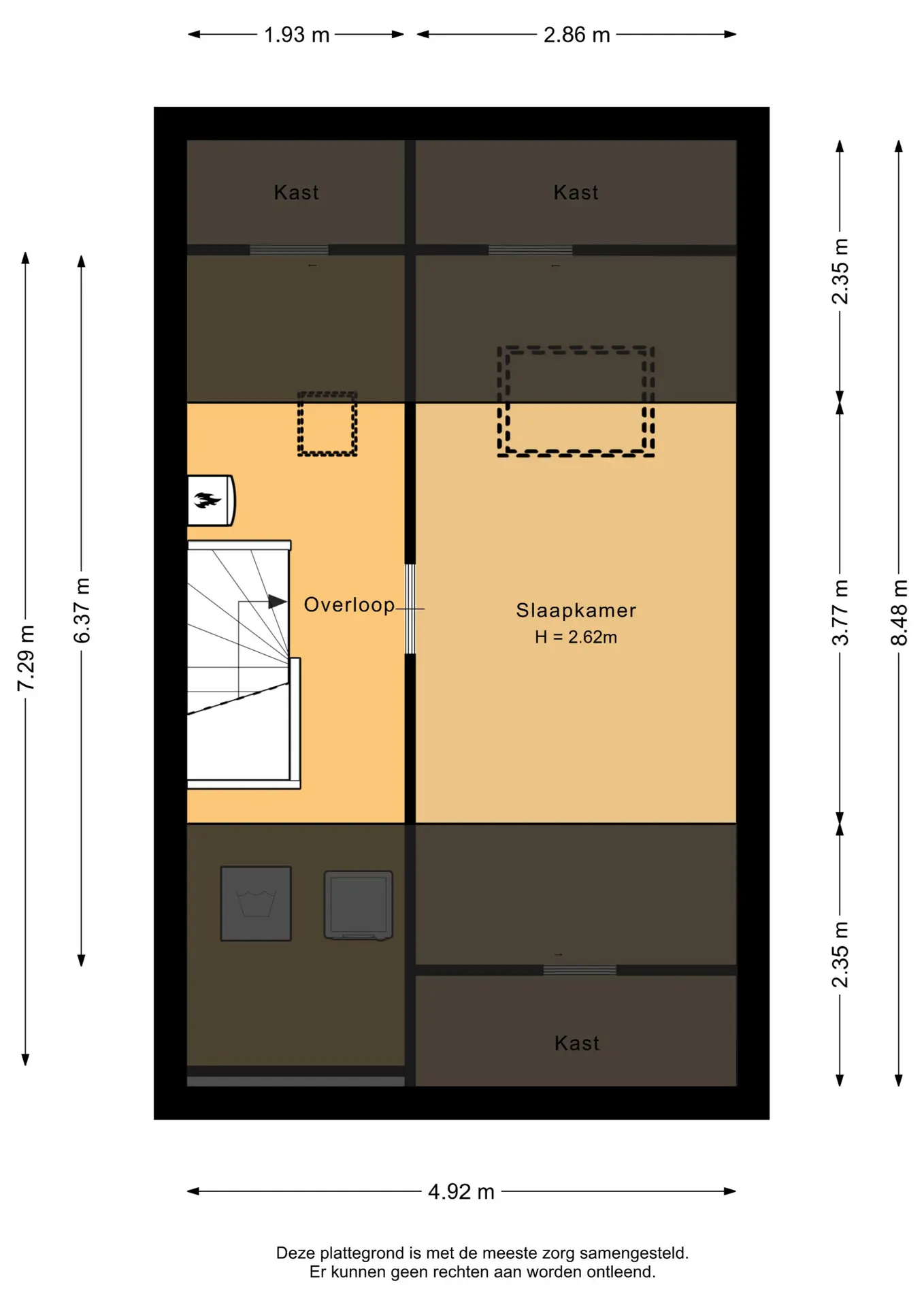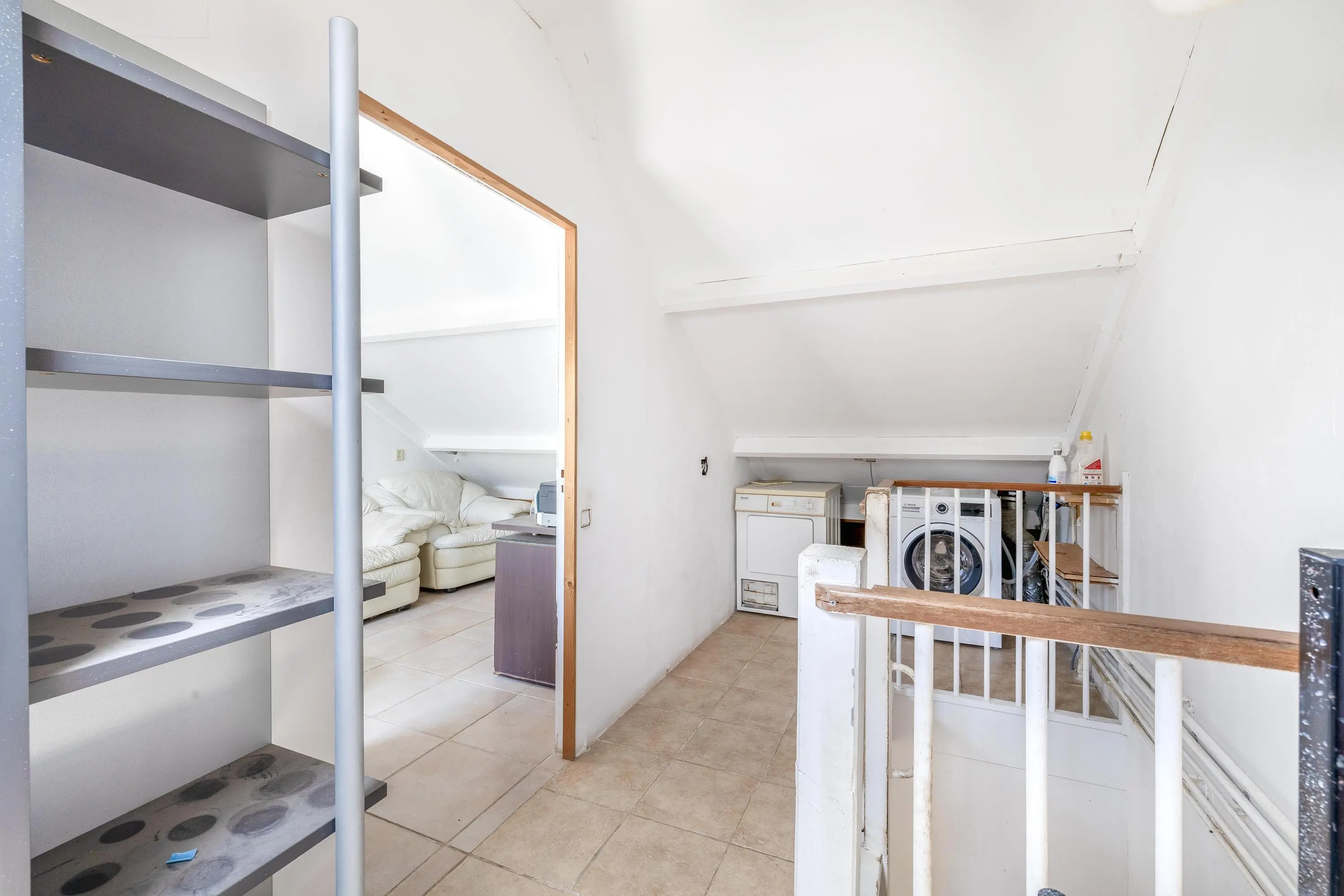 De overloop op de tweede verdieping is, net als die op de eerste verdieping, afgewerkt met een betegelde vloer. Hier bevinden zich de aansluitingen voor de wasmachine en droger, de opstelplaats van de cv-ketel en extra bergruimte. Vanaf de overloop heeft u toegang tot de vierde slaapkamer.
