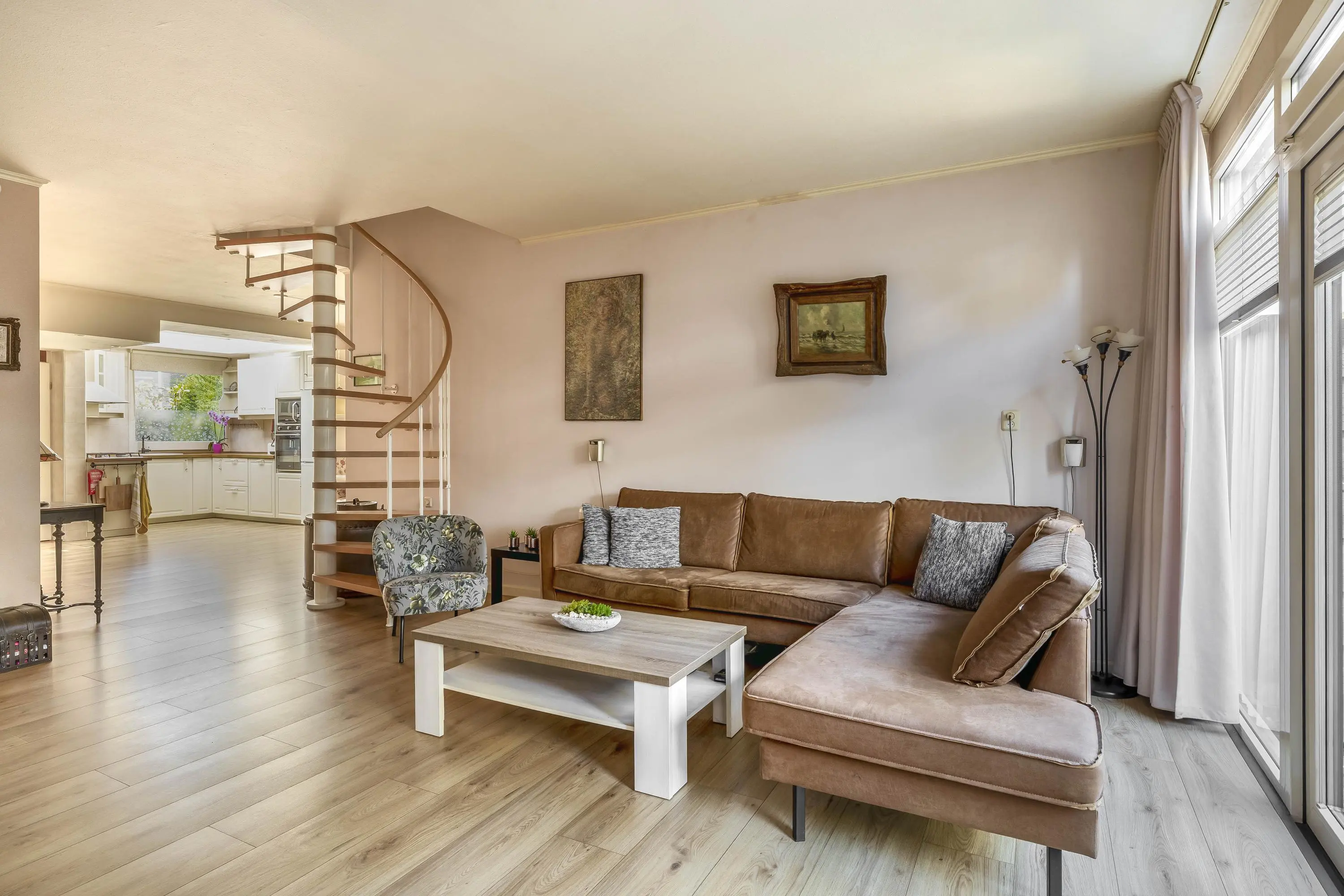 De entree in de woning is in de open hal. Aan de linkerzijde is de toiletruimte aanwezig, deze is voorzien van een wandcloset en een fonteintje. Dan volgt daarna de inpandige berging. Hier is ook de wasmachine aansluiting te vinden. Wat een praktische plek. Tegenover de toiletruimte is de meterkast aanwezig. De entree in de grote open ruimte is in de keuken. De keuken is geplaatst in een U-opstelling en heeft een uitgebreid en divers aanbod aan (inbouw)apparatuur. Denk hierbij aan een gaskookplaat, oven, magnetron, koelkast, vaatwasser, spoelbak en natuurlijk veel kastruimte. Voor de doorgang naar de woonkamer is er plek voor een fijne eethoek. De open trapopgang bevindt zich net voor de royale living. Veel ruimte voor een grote en gezellige zithoek. Openslaande deuren geven toegang naar de achtertuin. Aan de voorzijde is tevens een fijne werkkamer te vinden met een schuifpui naar de voortuin. Deze kamer is ook goed om te zetten naar een slaapkamer.
