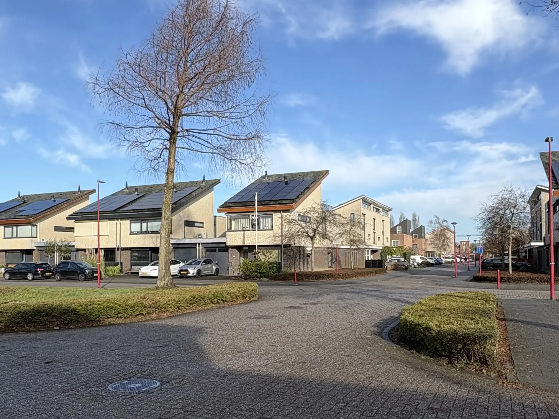 De voortuin biedt de mogelijkheid om de auto op eigen terrein te parkeren en geeft direct toegang tot de garage, waarbij een buitenkraan het buitenonderhoud extra gemakkelijk maakt.