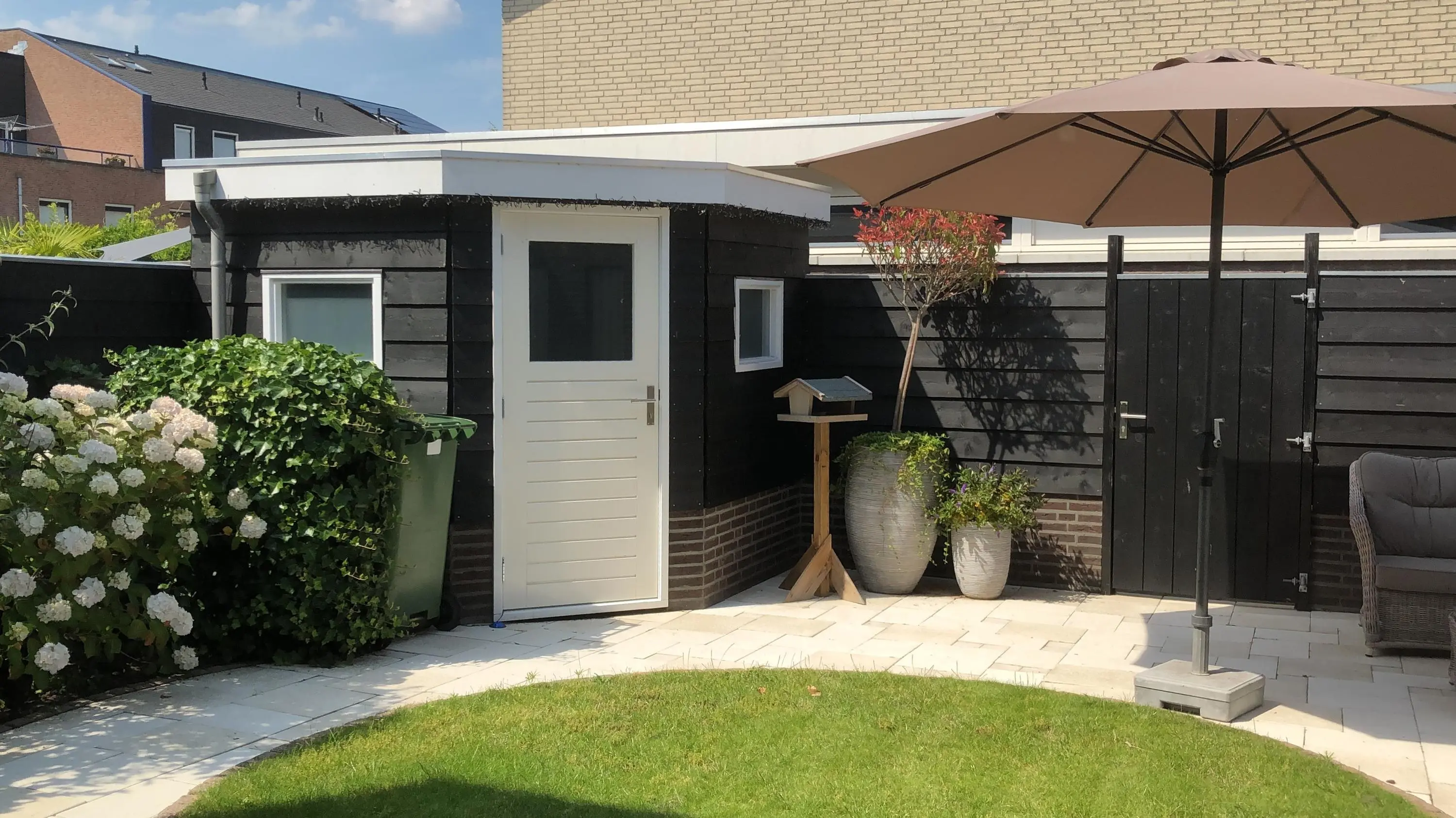 De achtertuin heeft een verzorgde en sfeervolle uitstraling. In het midden ligt een mooi groen gazon, omringd door beplanting en een plantenbak die samen voor een natuurlijke, rustige sfeer zorgen. De ruimte leent zich uitstekend voor het creëren van een fijne zitplek waar je heerlijk kunt genieten van de buitenlucht. Achter in de tuin bevindt zich een berging met elektra en ook hier is een buitenkraan aanwezig. Via de achterom is de tuin bovendien gemakkelijk bereikbaar.
