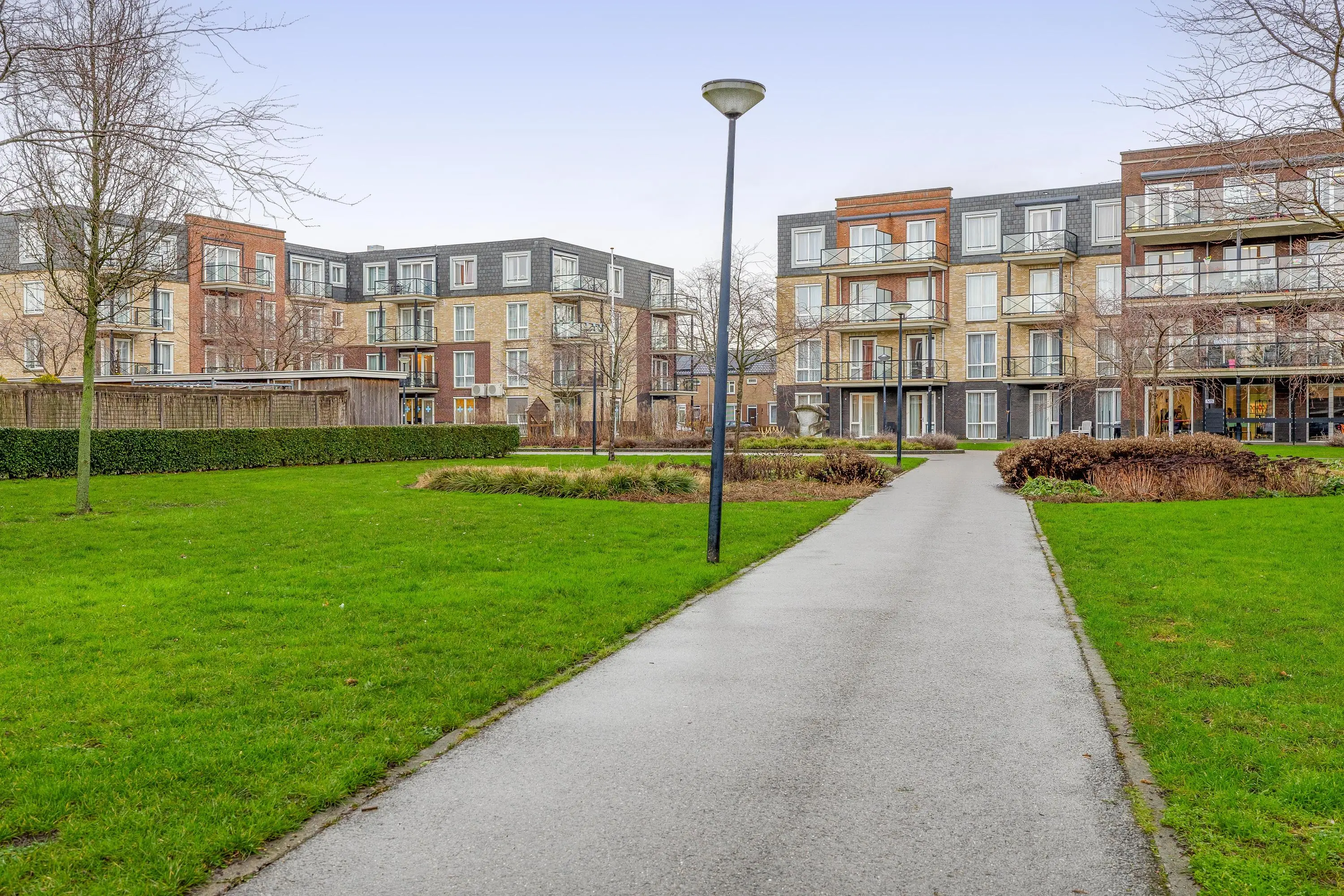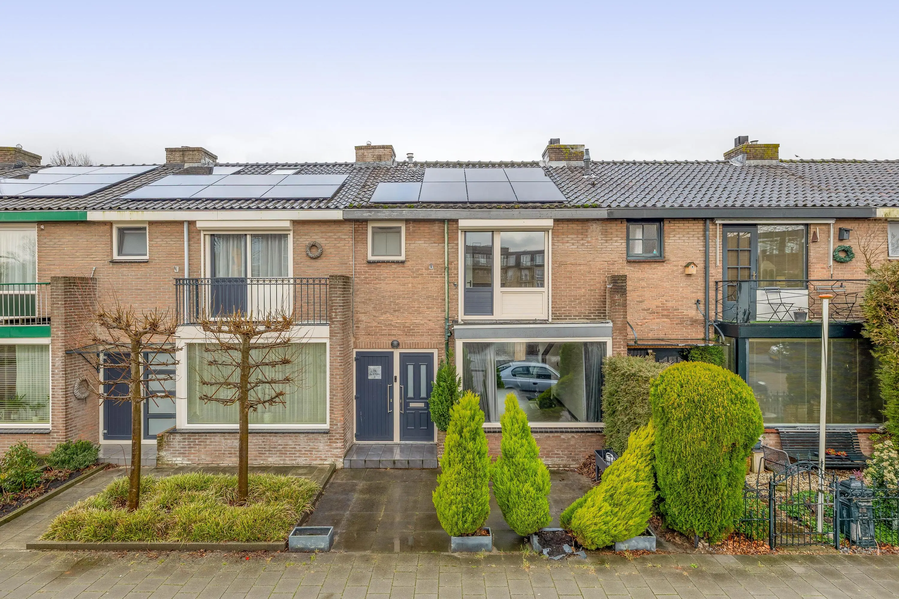 De voortuin is volledig betegeld en biedt toegang tot de meterkast. Aan één zijde is de tuin afgezet met een heg, wat zorgt voor een groene en verzorgde uitstraling.