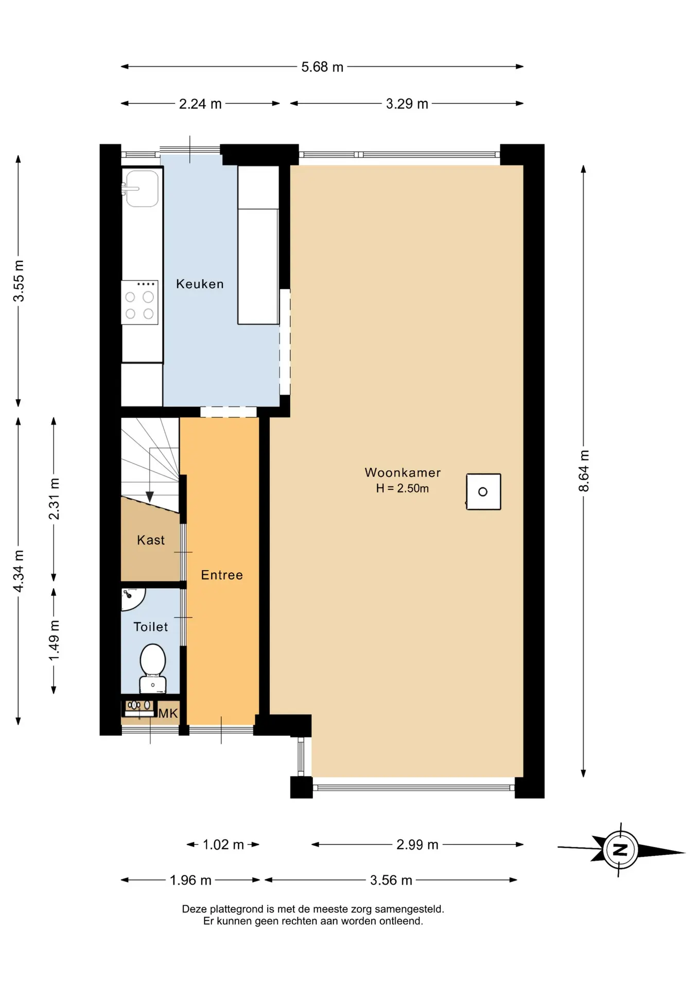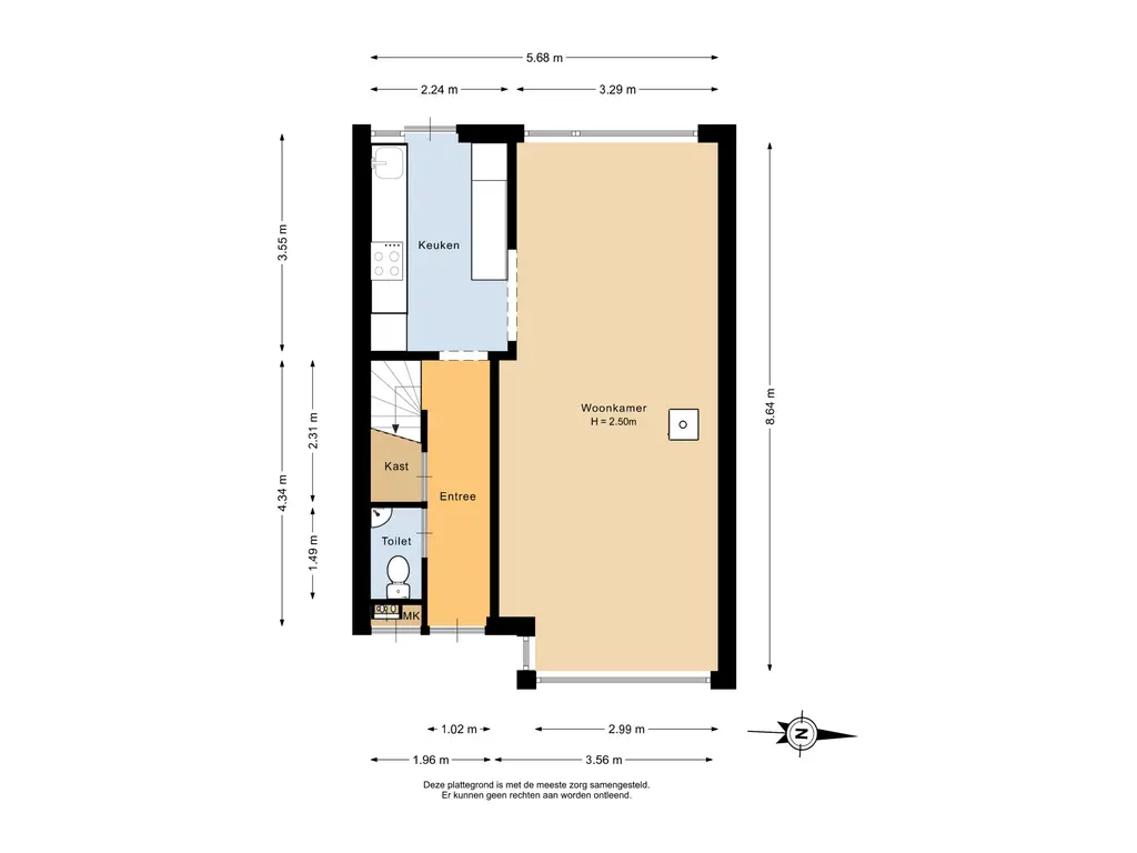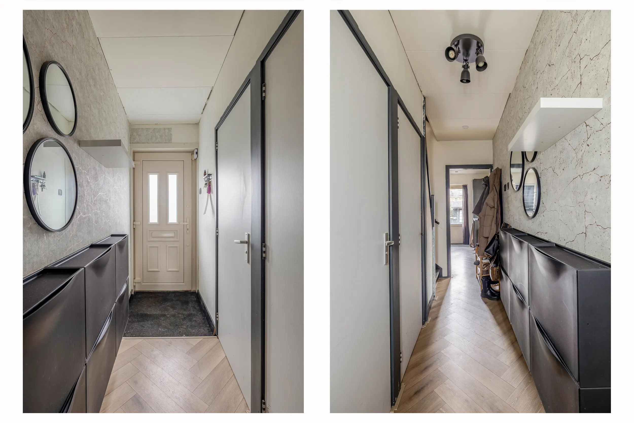 Entree/hal met een laminaat visgraatvloer voorzien van vloerverwarming (hoofdverwarming), welke doorloopt over de gehele begane grond. Vanuit de hal is er toegang tot het separate toilet, de trapopgang naar de eerste verdieping met een praktische trapkast en de keuken.