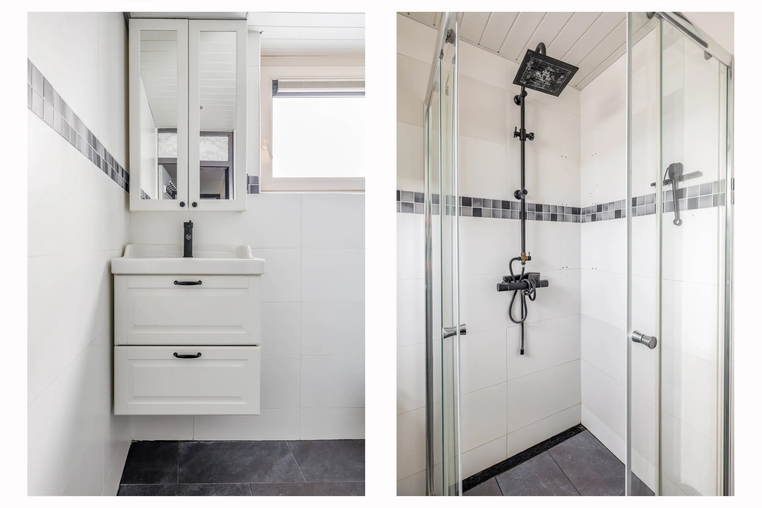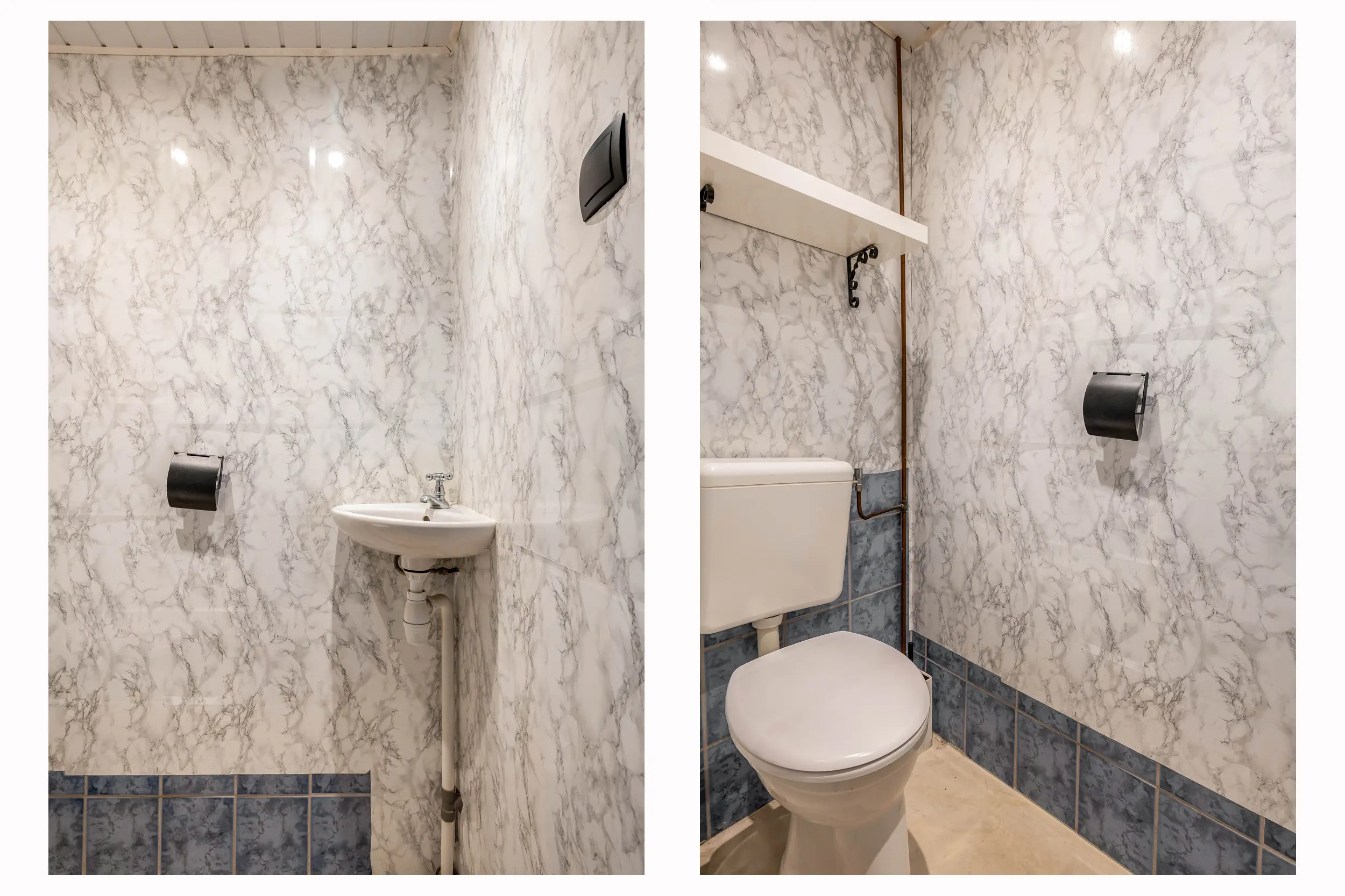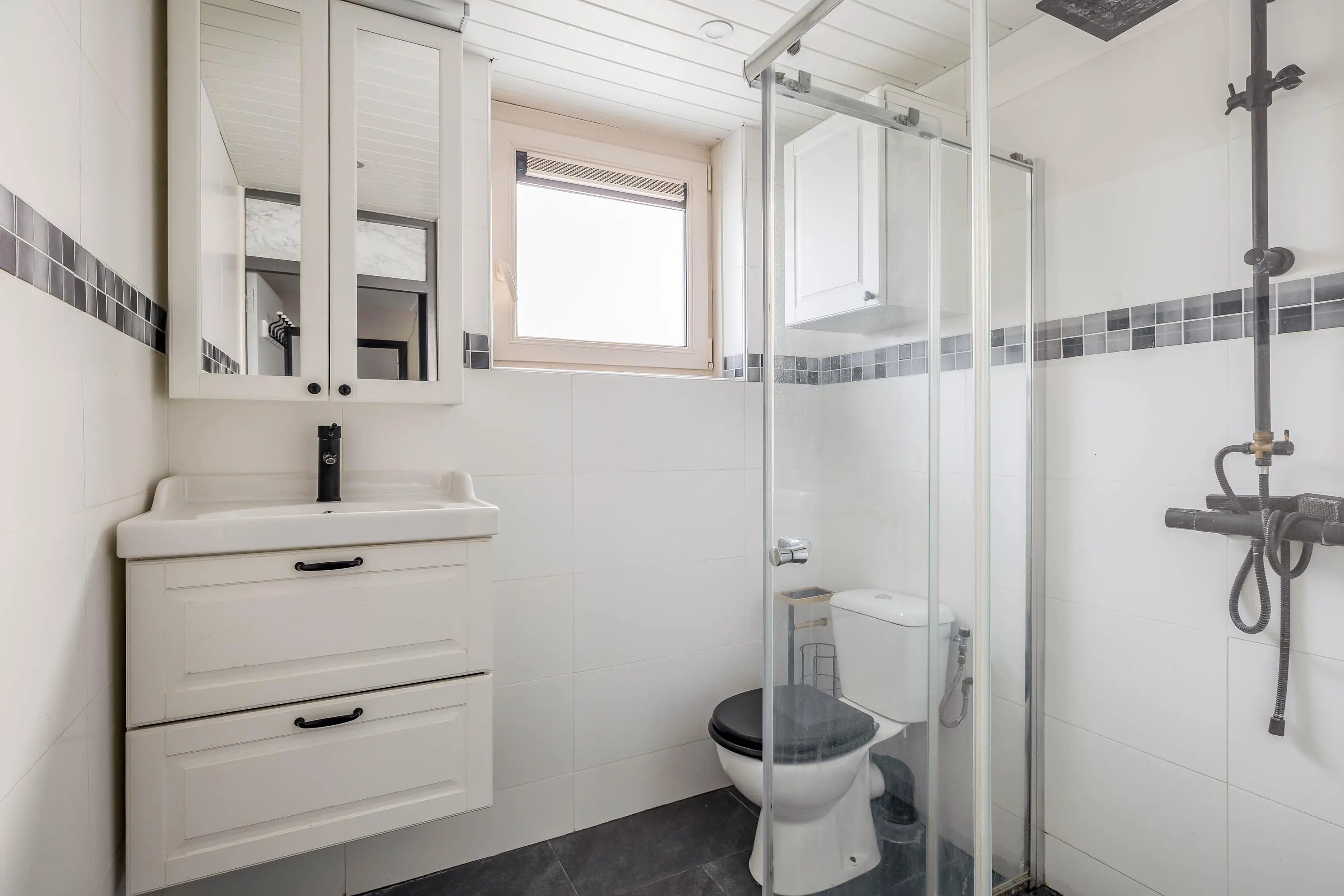 De volledig betegelde badkamer is voorzien van een douche, toilet en wastafel. Dankzij het aanwezige raam is natuurlijke ventilatie mogelijk.
