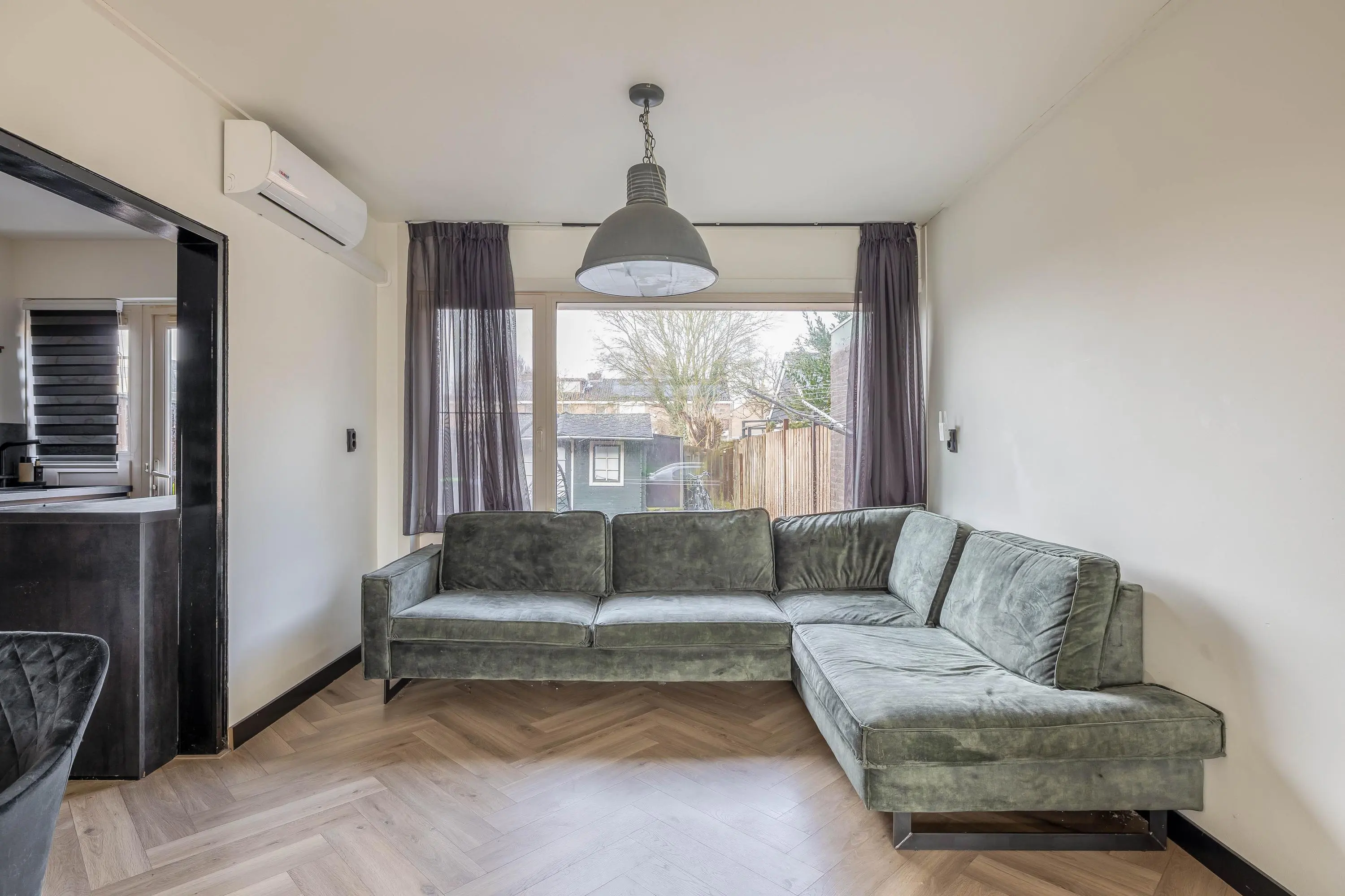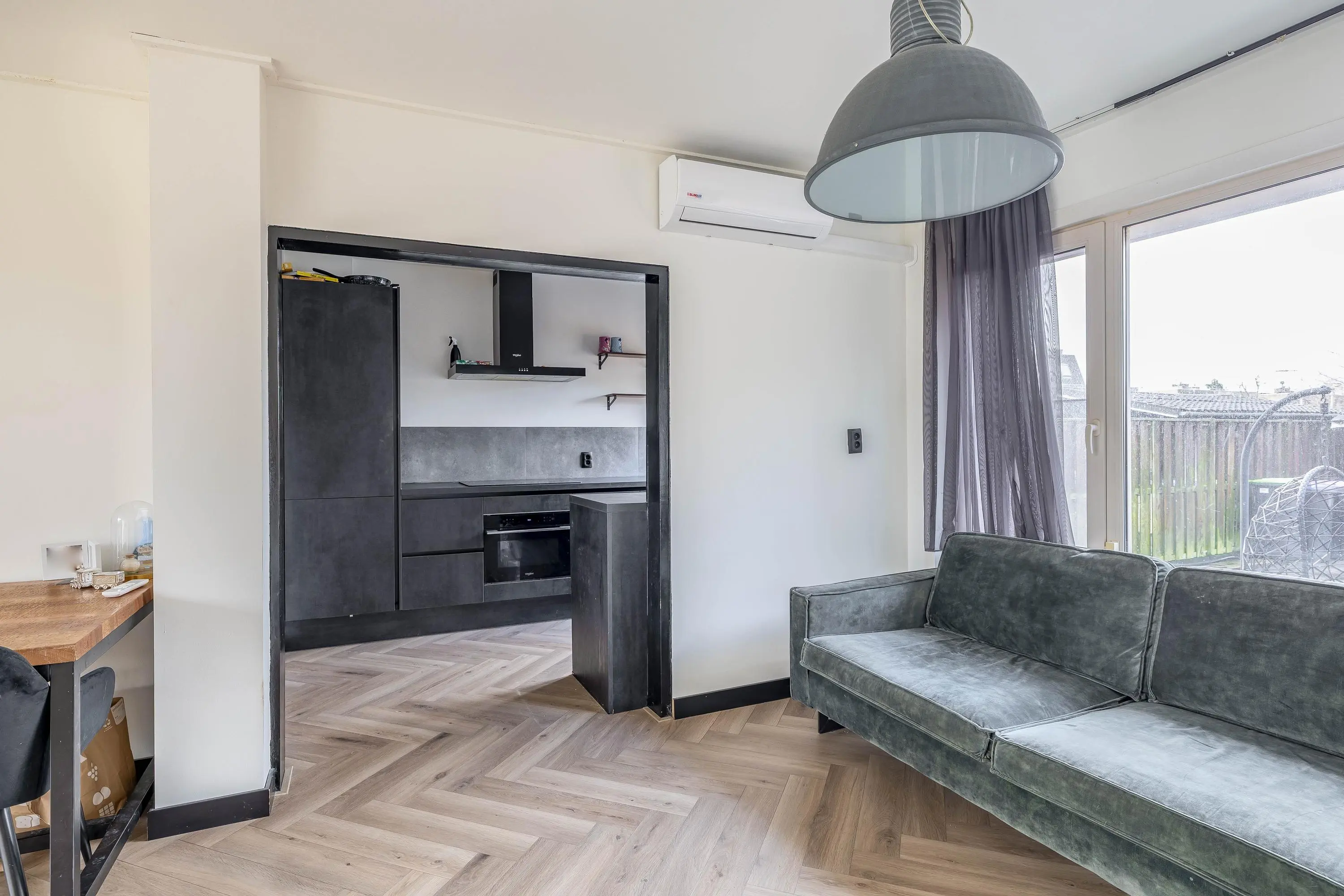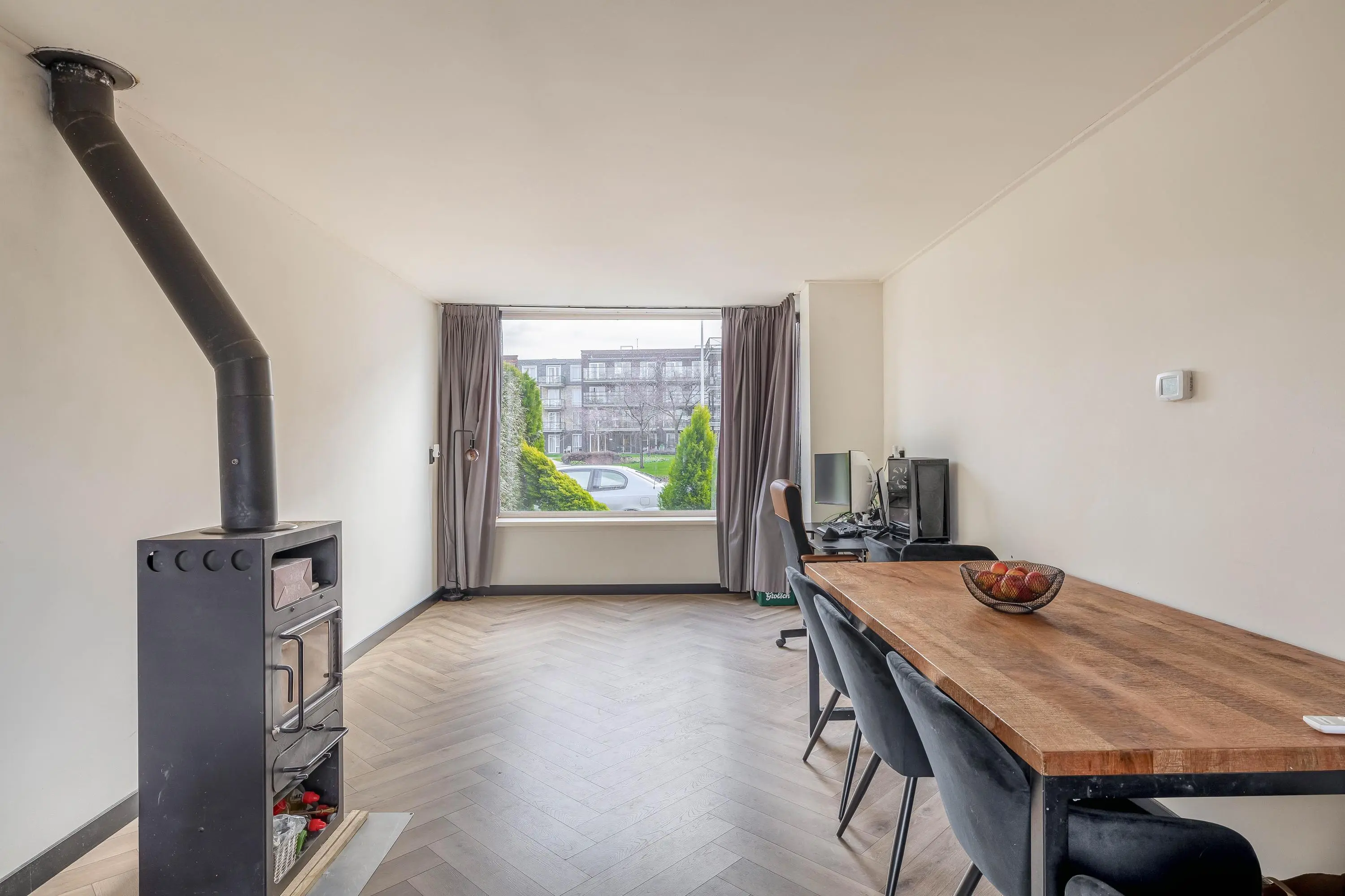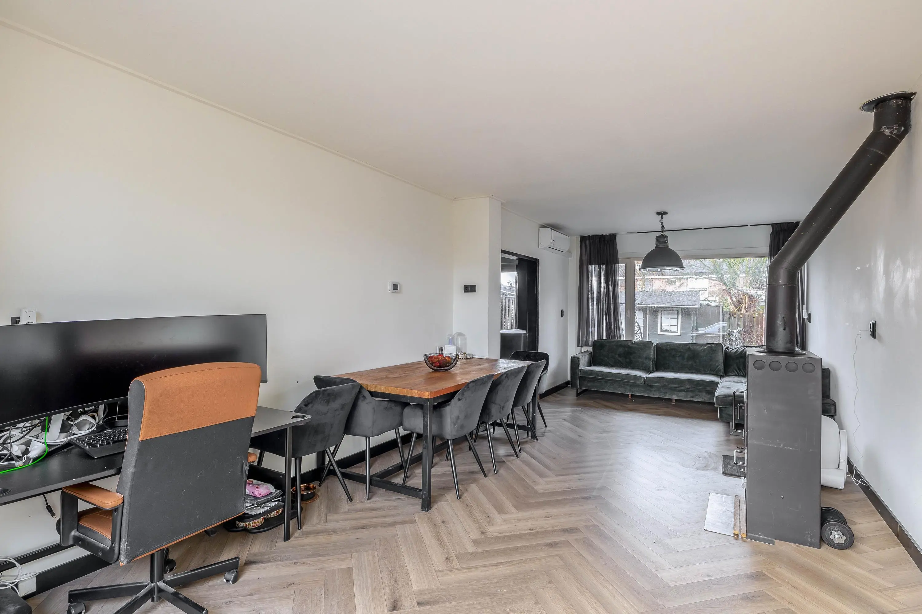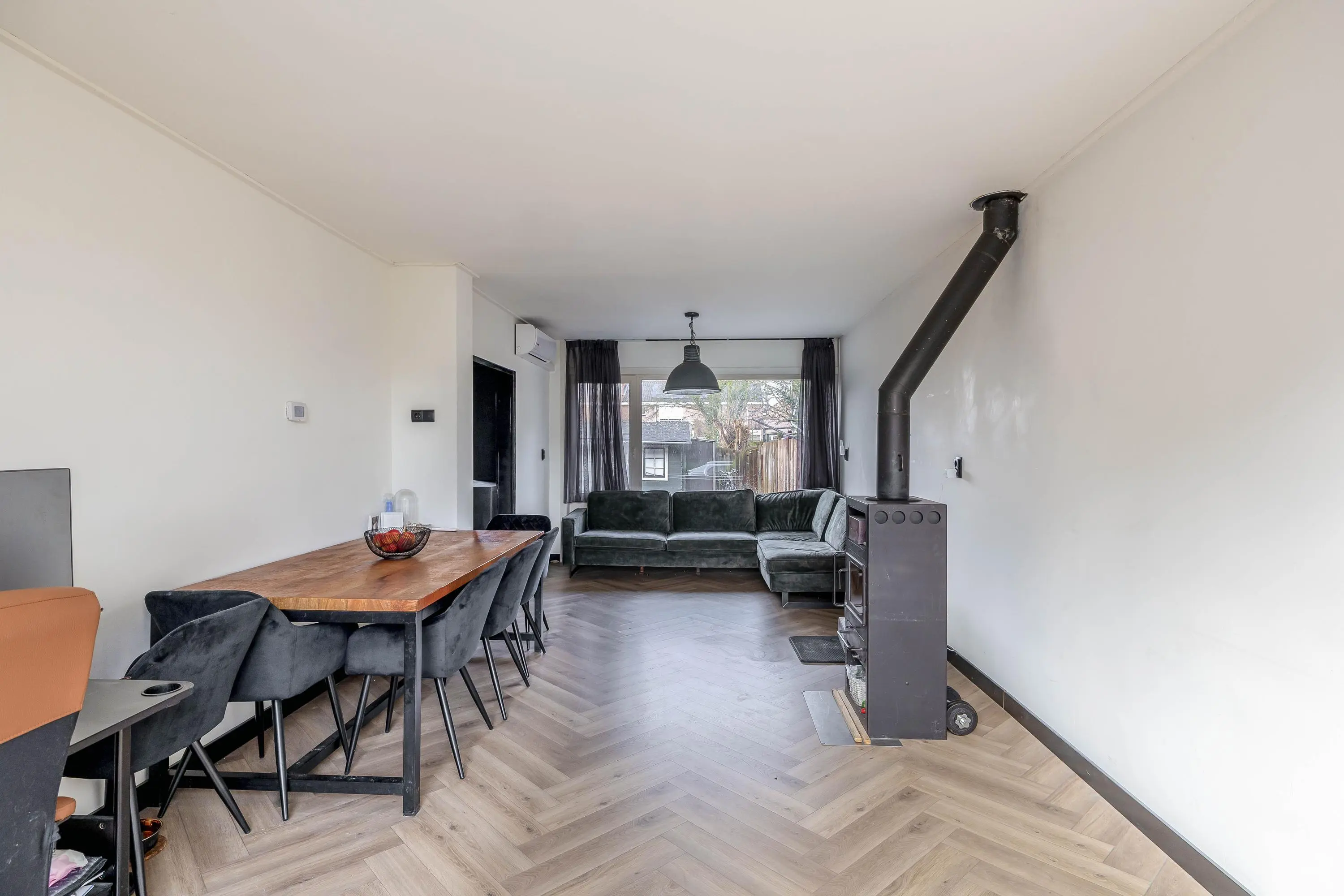 De living is ruim opgezet en geniet van prettig daglicht dankzij de raampartijen aan zowel de voor- als achterzijde, waarbij het raam aan de achterzijde is voorzien van een zonnescherm. Er is voldoende ruimte voor een gezellige zit- en eethoek. Daarnaast is de woonkamer voorzien van een houtkachel en airconditioning (2024).