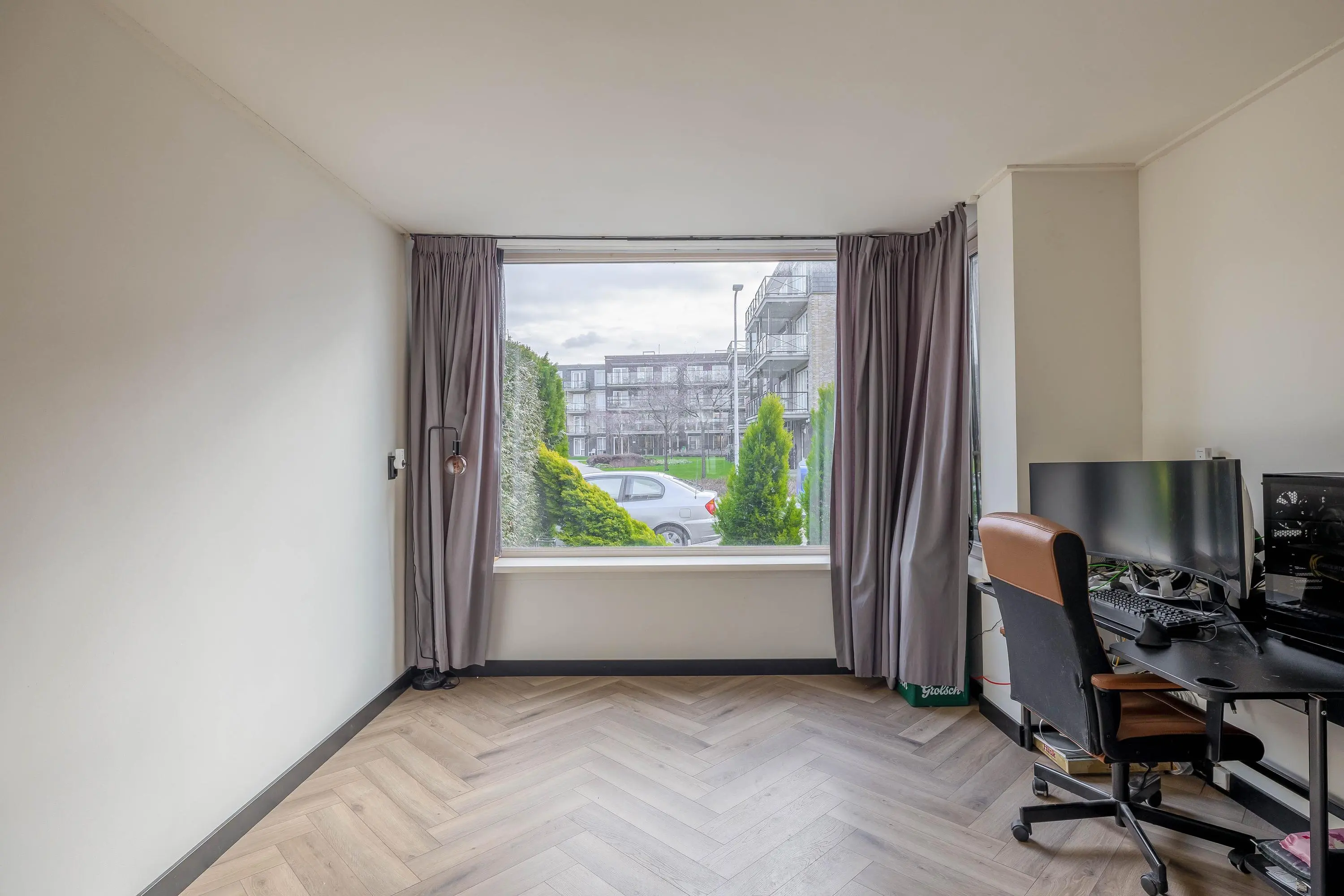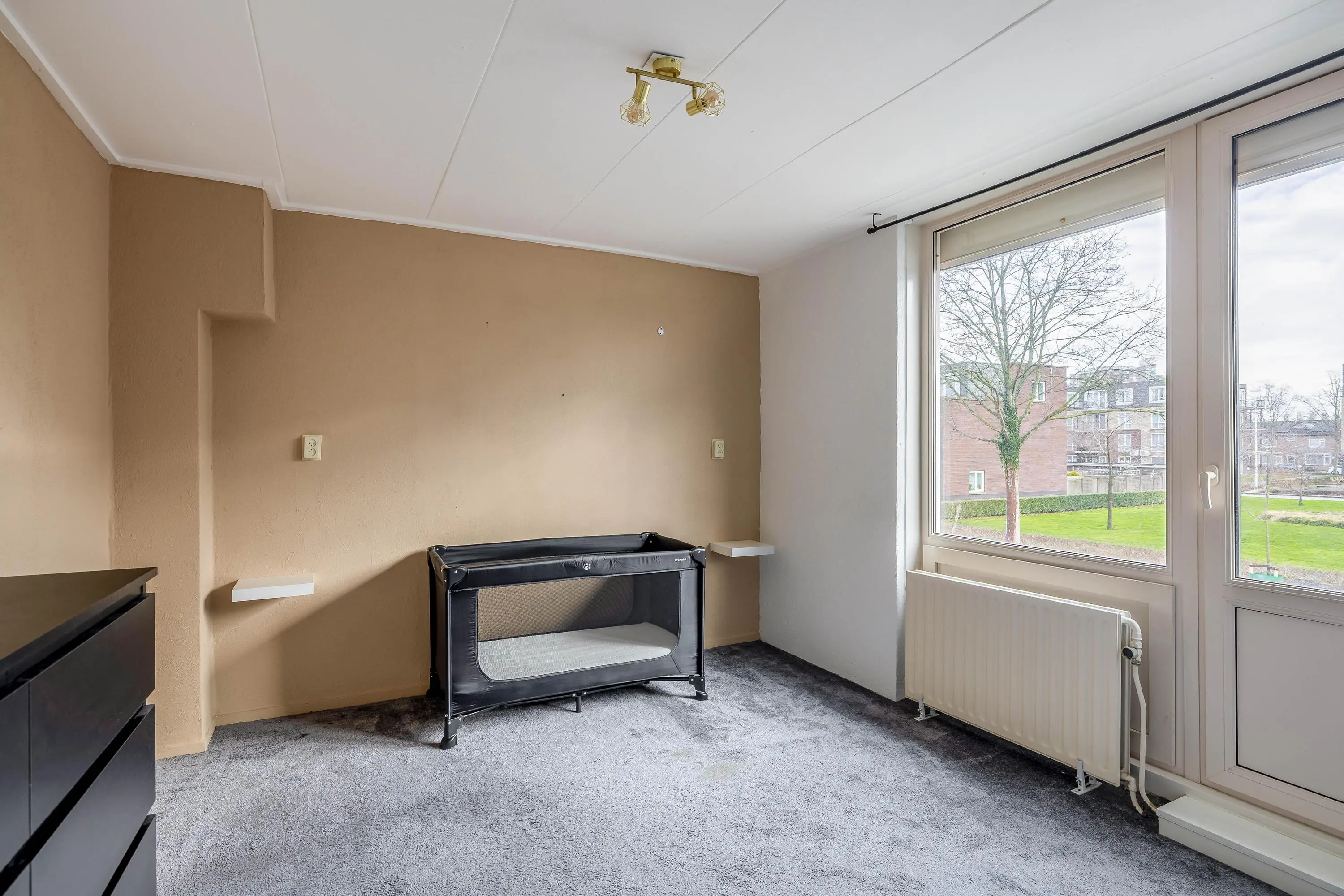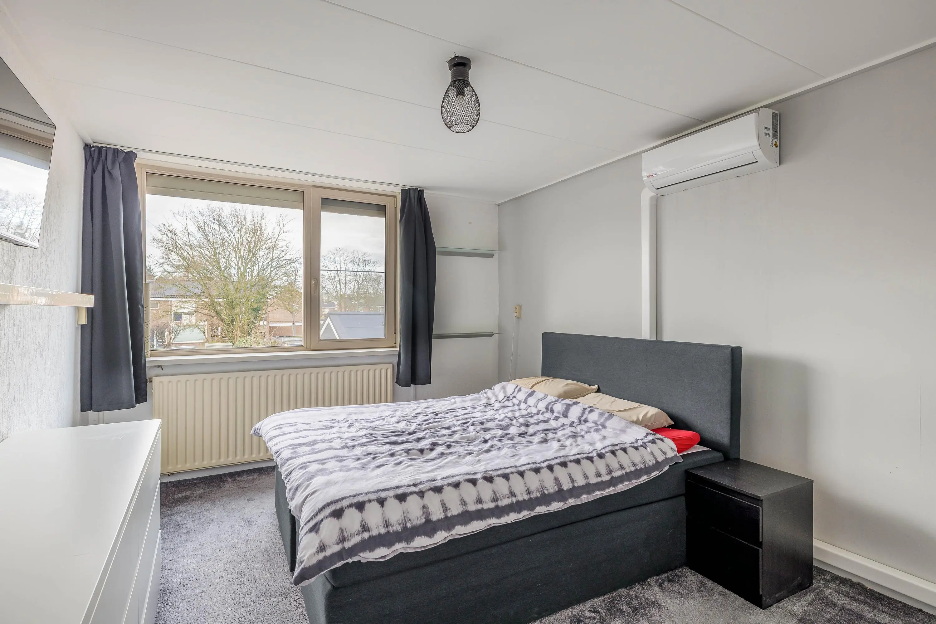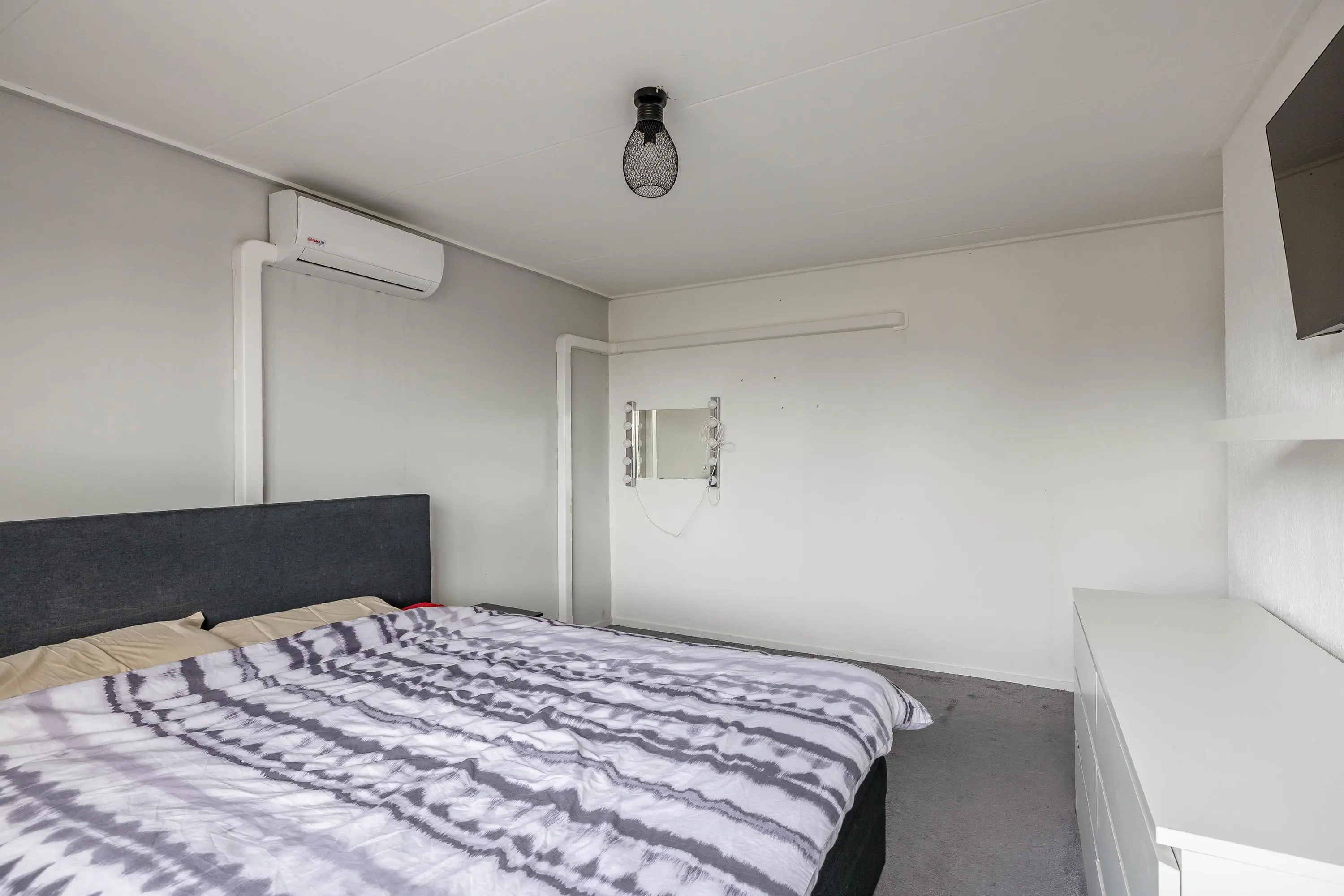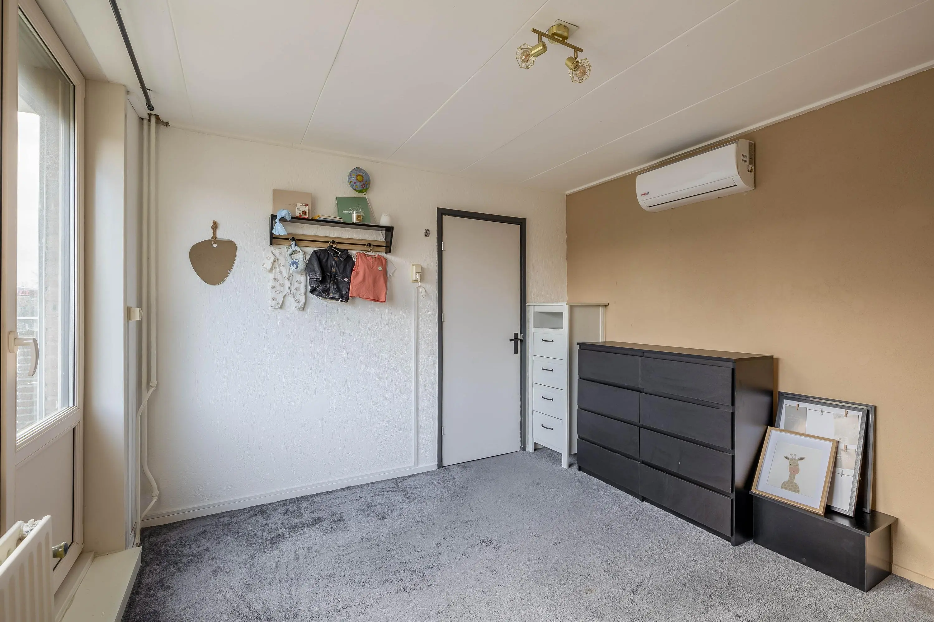 De hoofdslaapkamer bevindt zich aan de achterzijde van de woning en heeft een oppervlakte van circa 14m². Deze kamer is voorzien van airconditioning uit 2024 en een rolluik, wat zorgt voor extra comfort en verduistering. De tweede slaapkamer ligt aan de voorzijde en is circa 12m² groot. Ook deze kamer beschikt over airconditioning uit 2024 en een rolluik. Via een enkele deur is het balkon bereikbaar.