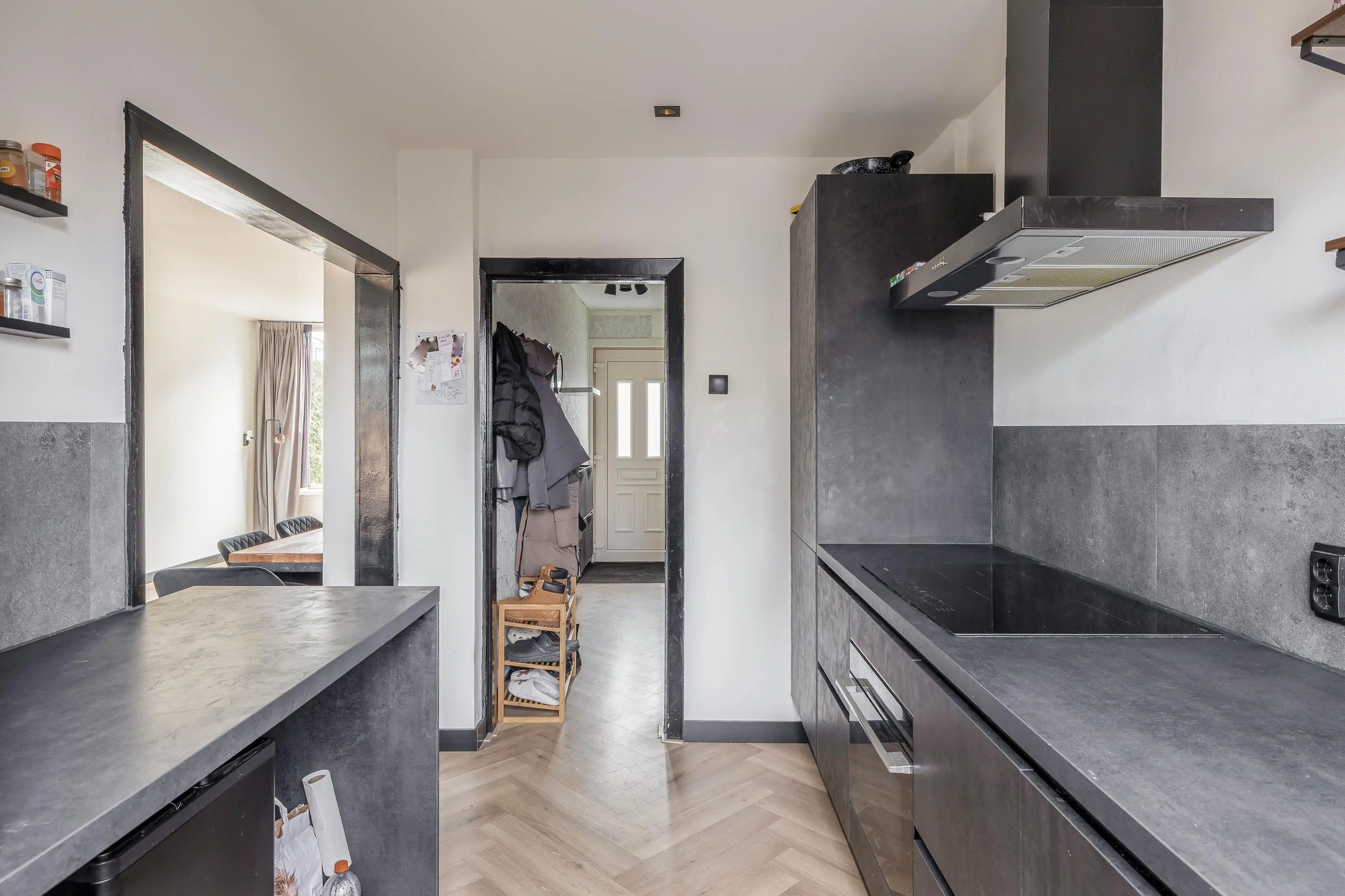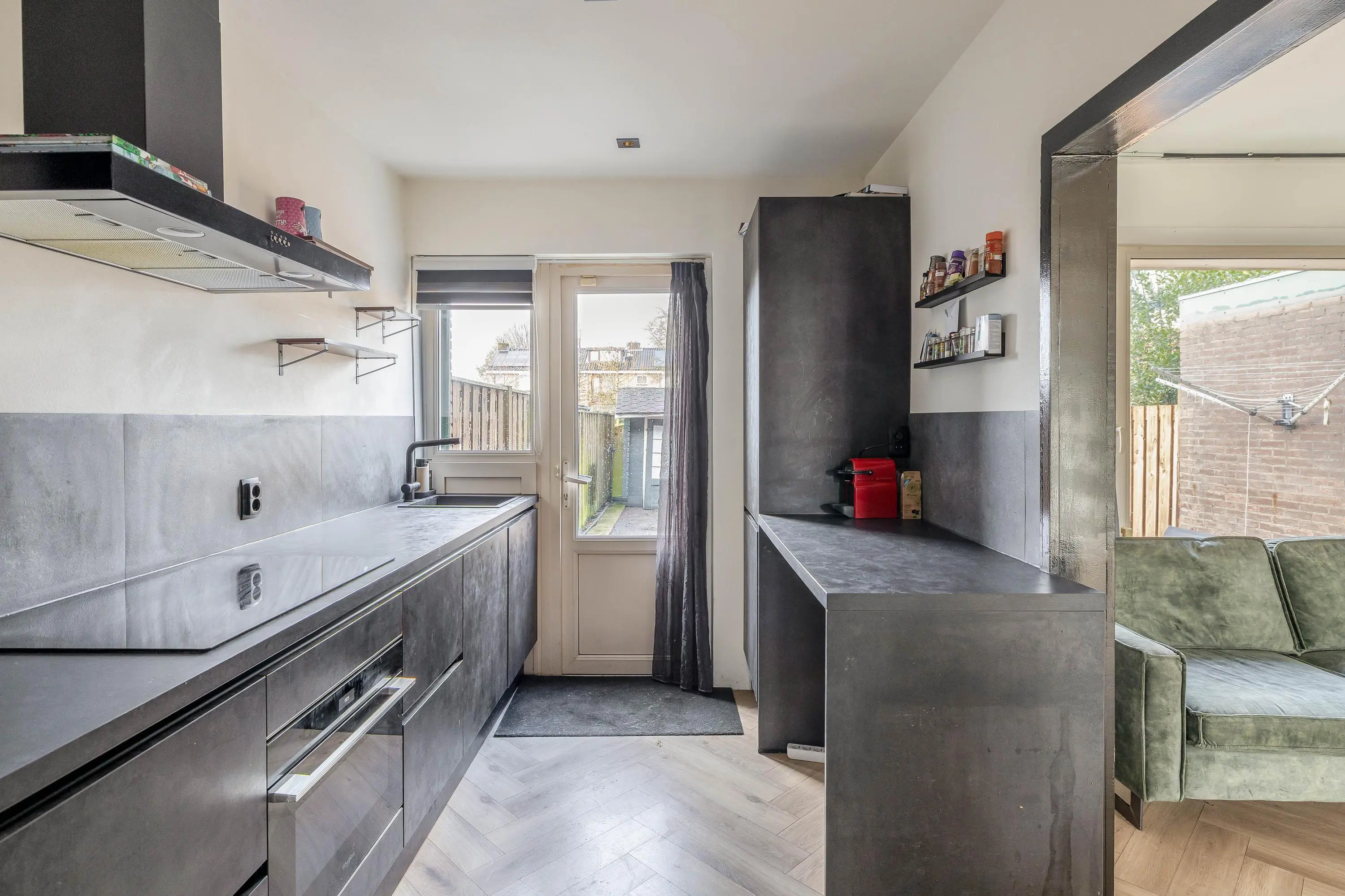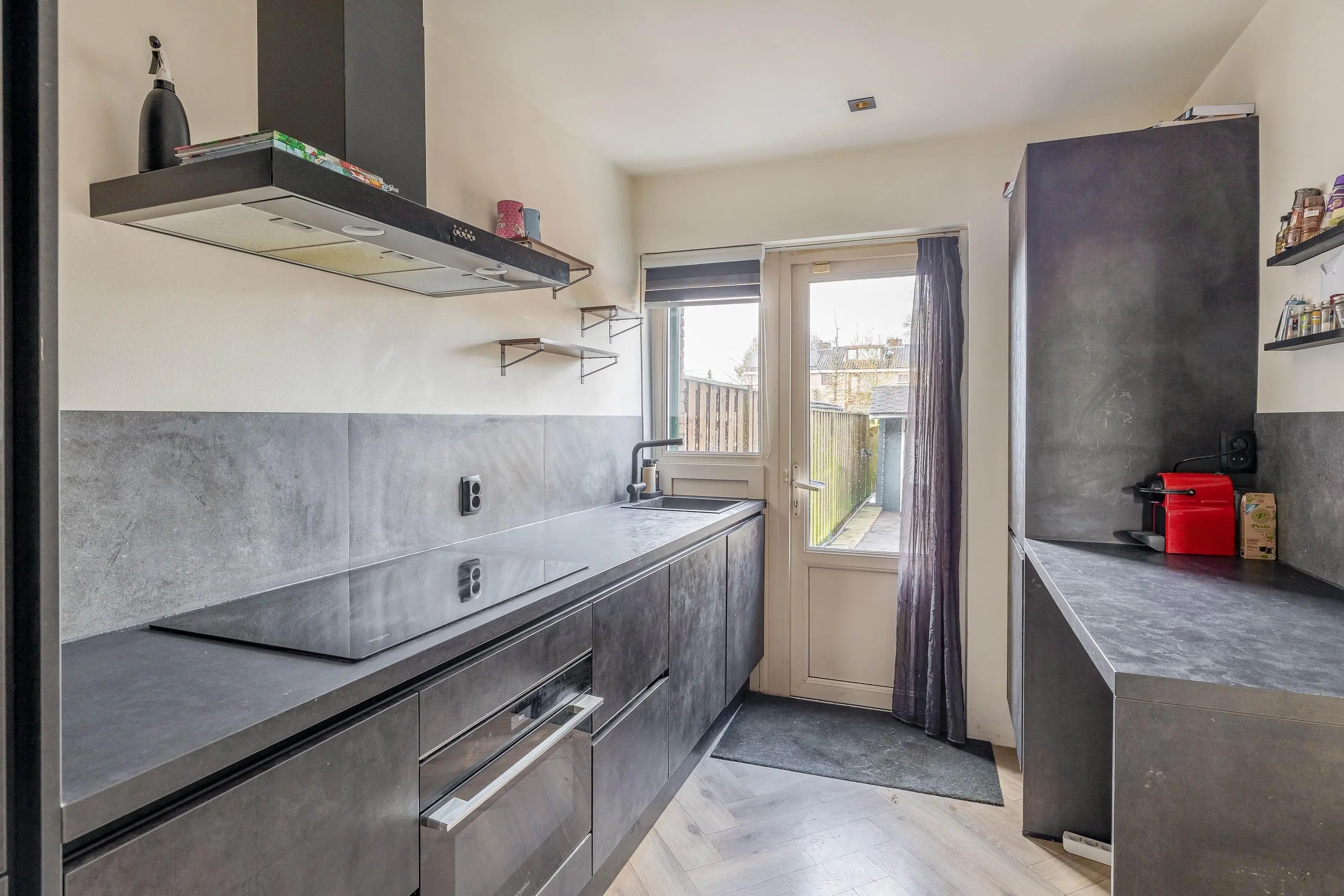 De moderne keuken uit 2023 is uitgerust met diverse inbouwapparatuur, waaronder een inductiekookplaat, afzuigkap, combimagnetron, vaatwasser en een koel-/vriescombinatie. Via een enkele deur is de achtertuin bereikbaar.
