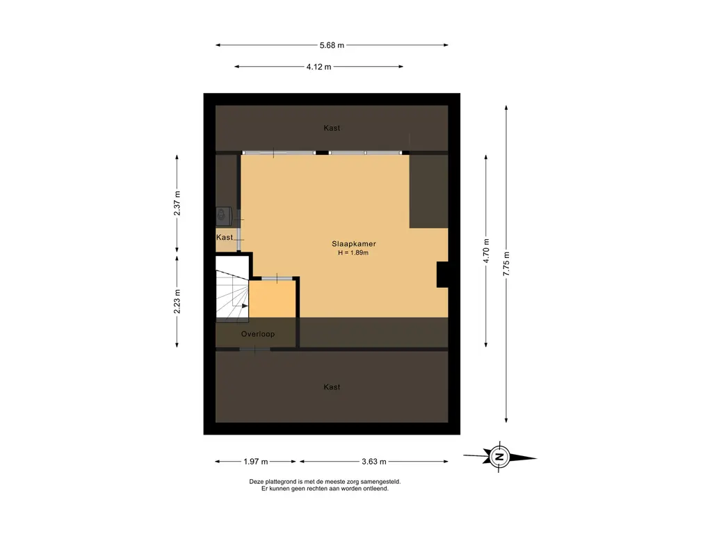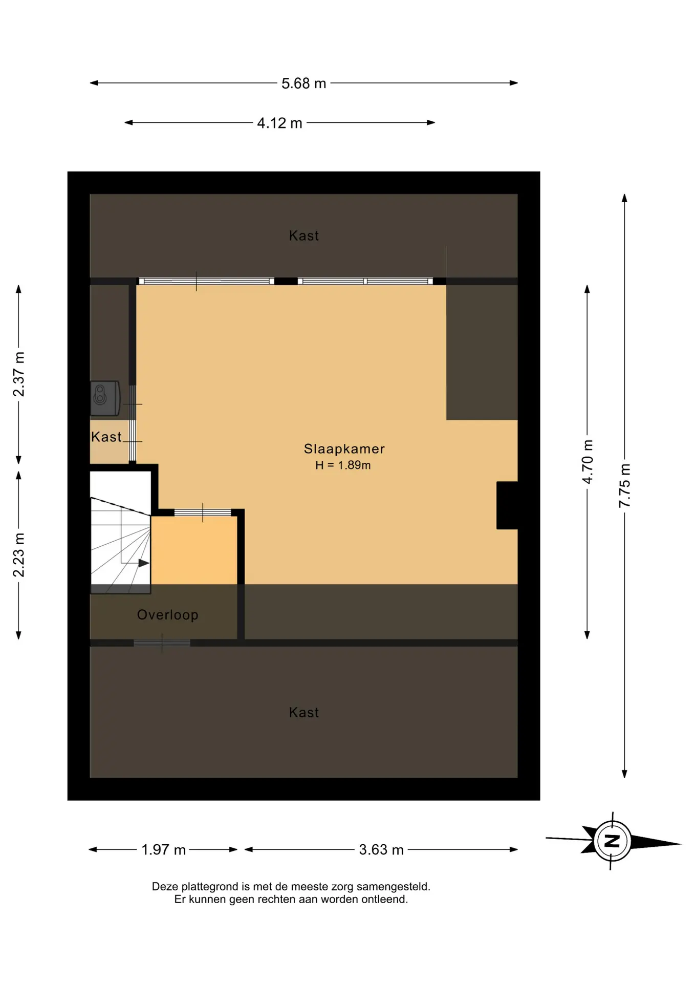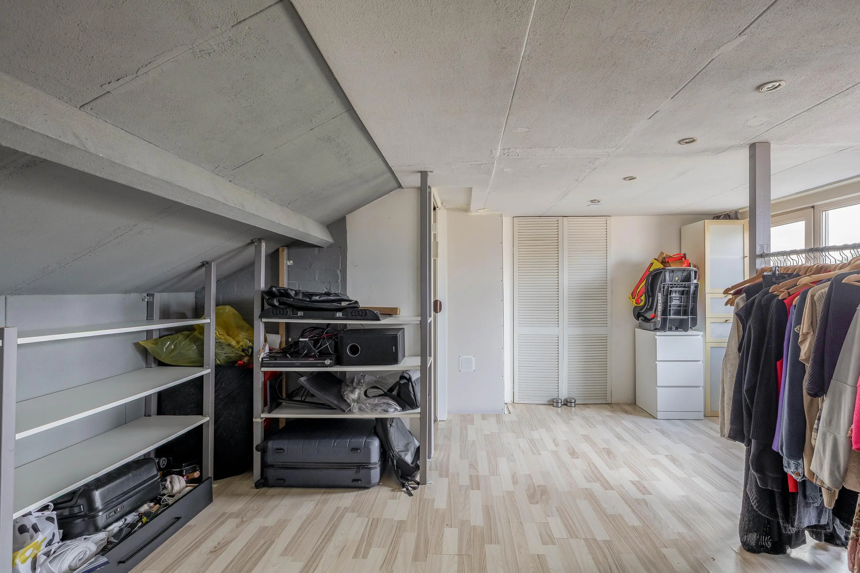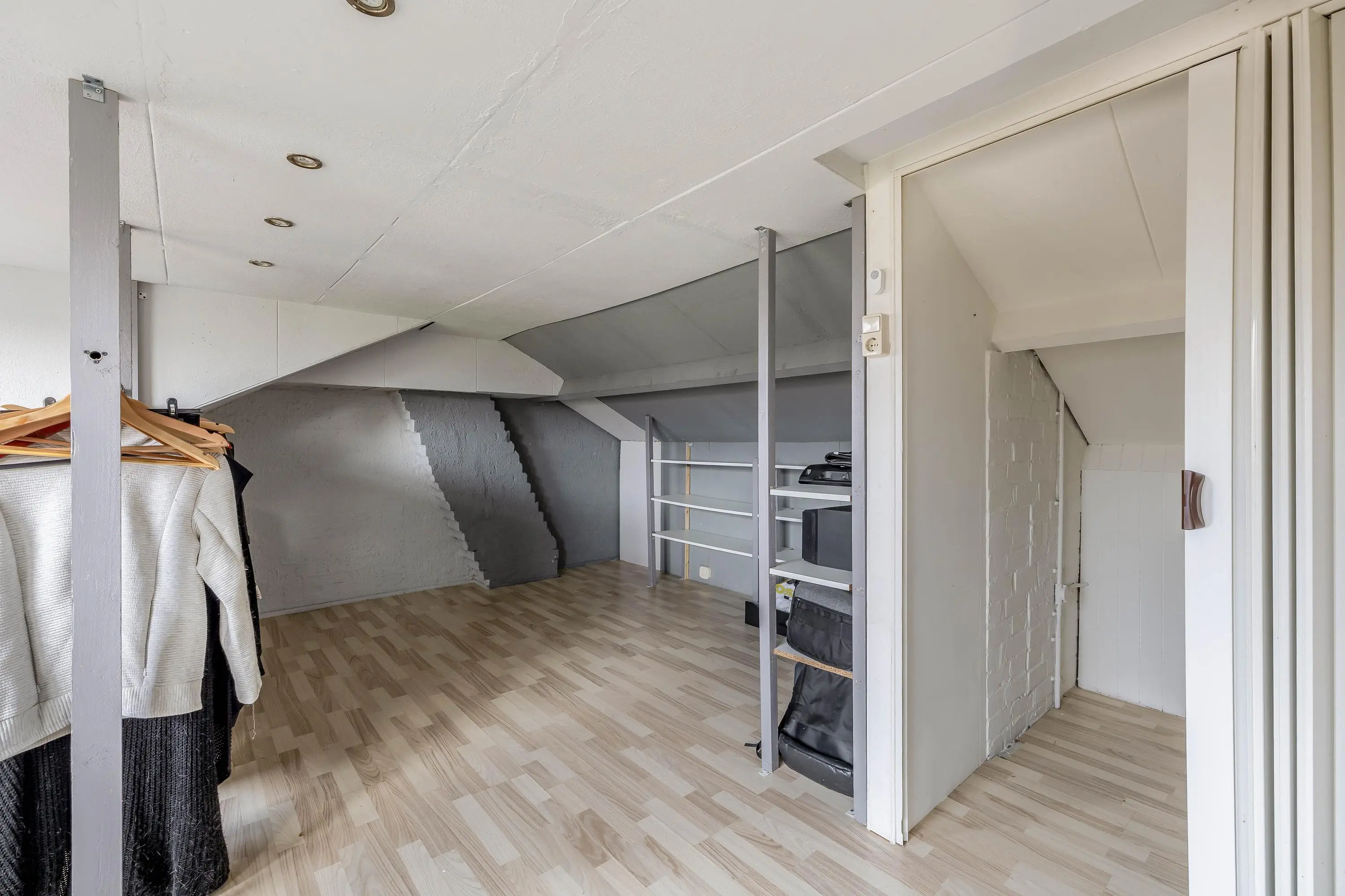 De zolder beschikt over een ruime oppervlakte met voldoende bergruimte en is uitstekend geschikt om in te delen als extra slaapkamer. De kamer is voorzien van een inbouwkast met daarin de cv-opstelling. Dankzij de kunststof dakkapel is de ruimte vergroot en geniet deze van prettig daglicht. Omdat de stahoogte maar 1,89 meter is wordt deze ruimte niet als woonruimte gerekend.