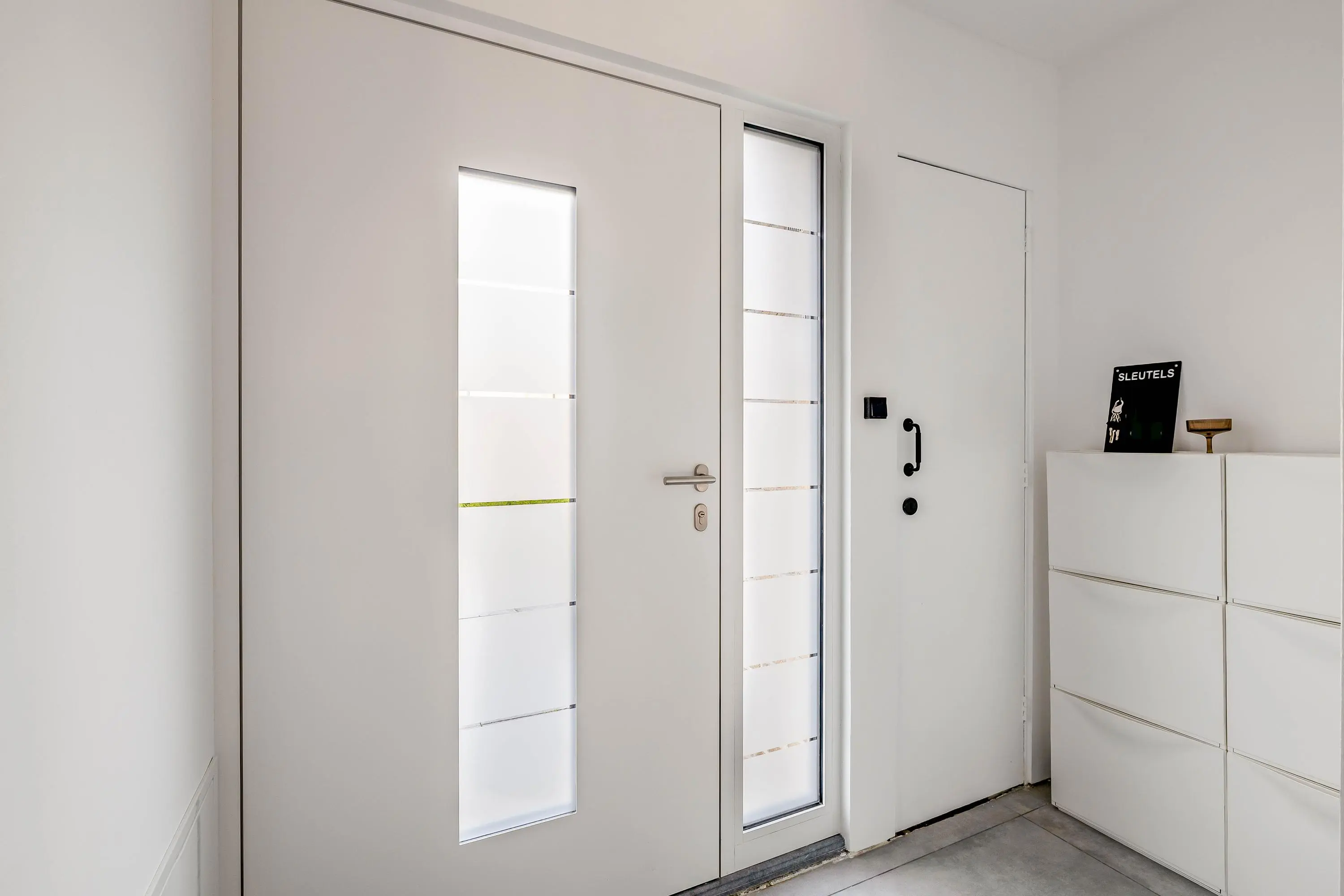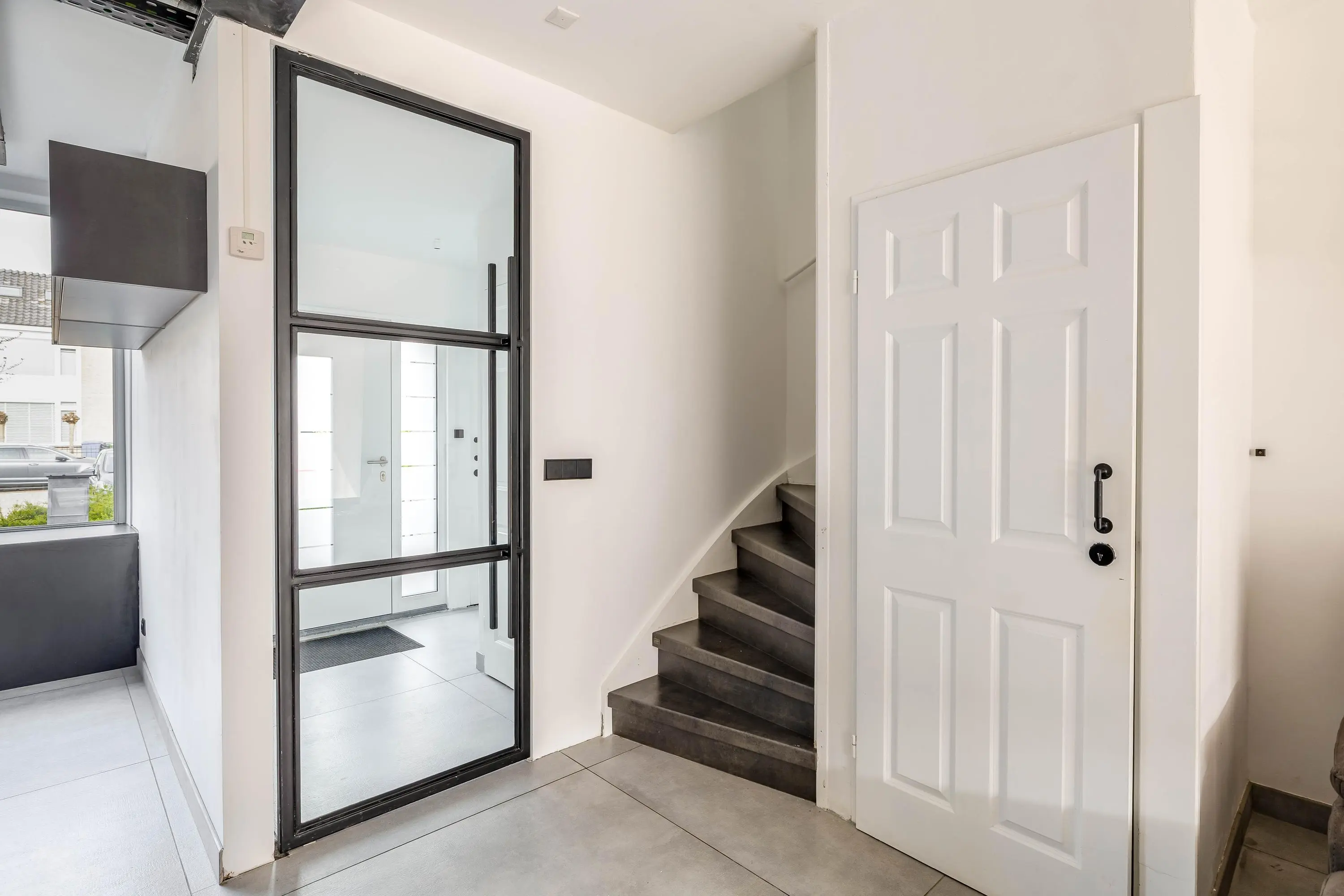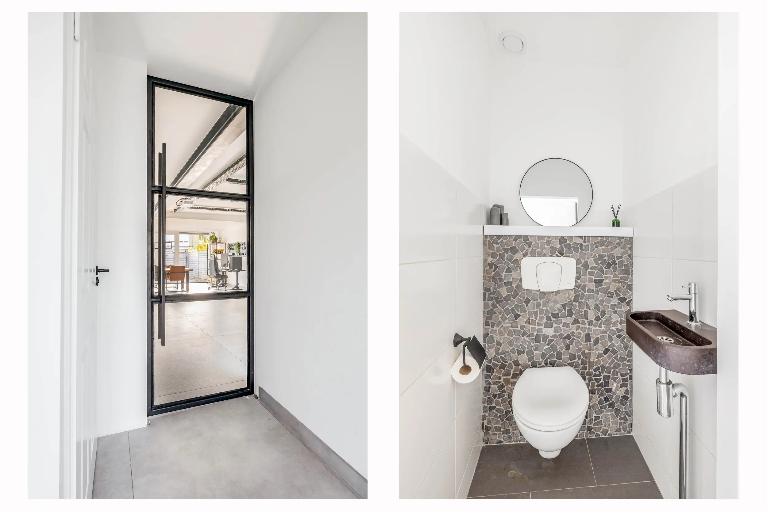 Bij binnenkomst treft u een strak afgewerkte hal met een meterkast en een moderne toiletruimte. Een eyecatcher in de hal is de zwarte stalen taatsdeur met glas, die toegang biedt tot de living en direct voor een ruimtelijk effect zorgt. De vloer is afgewerkt met een plavuizen vloer voorzien van vloerverwarming, welke doorloopt over de gehele begane grond.