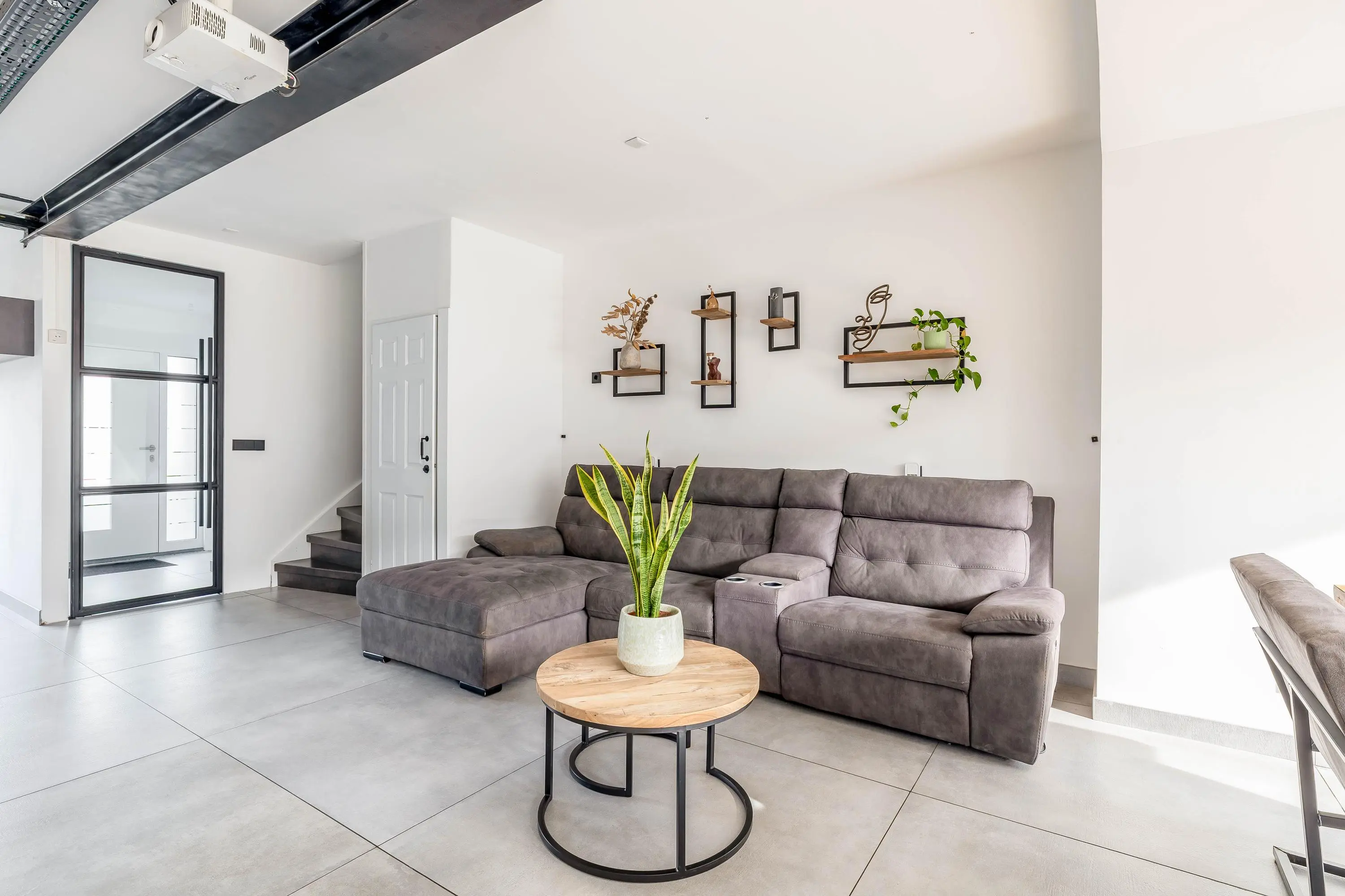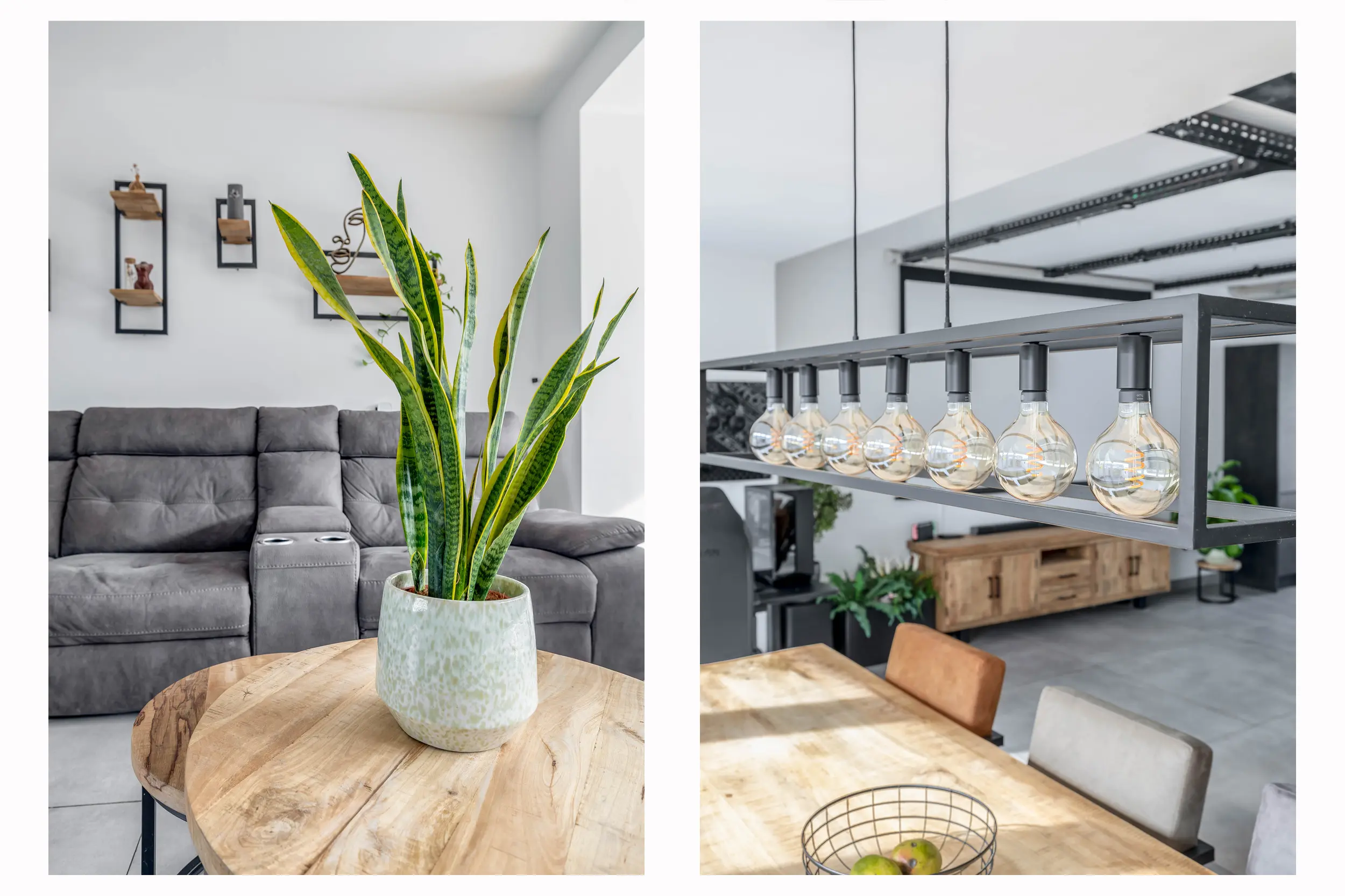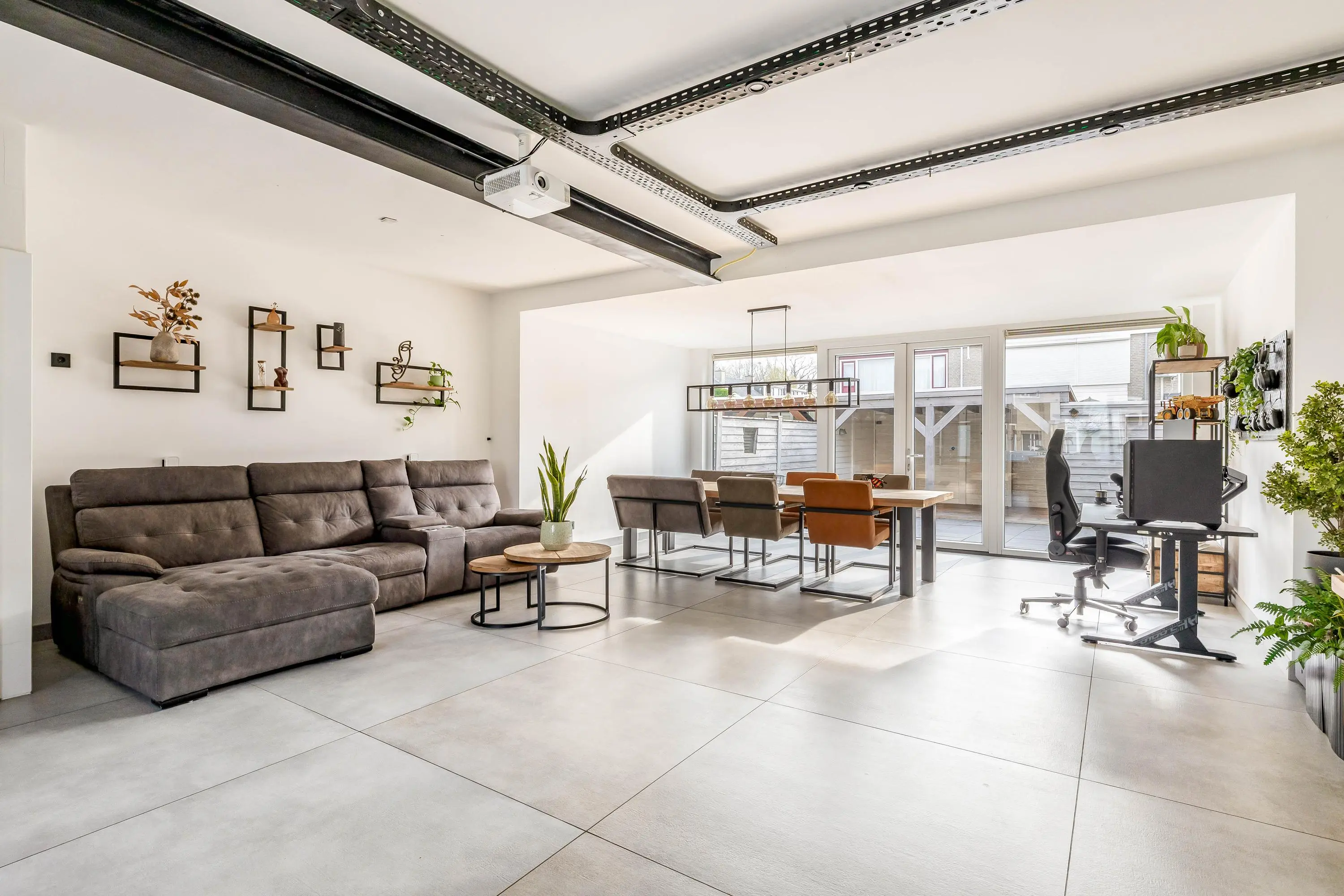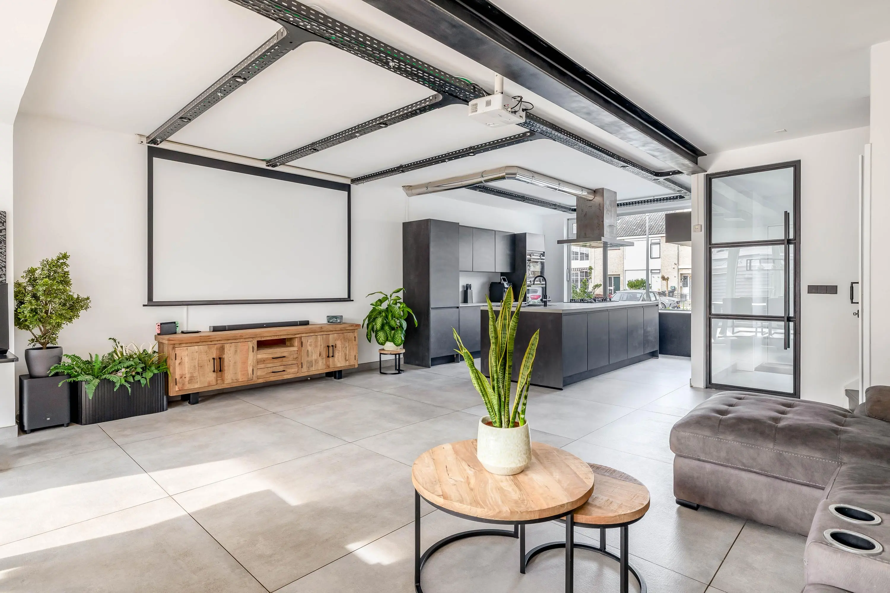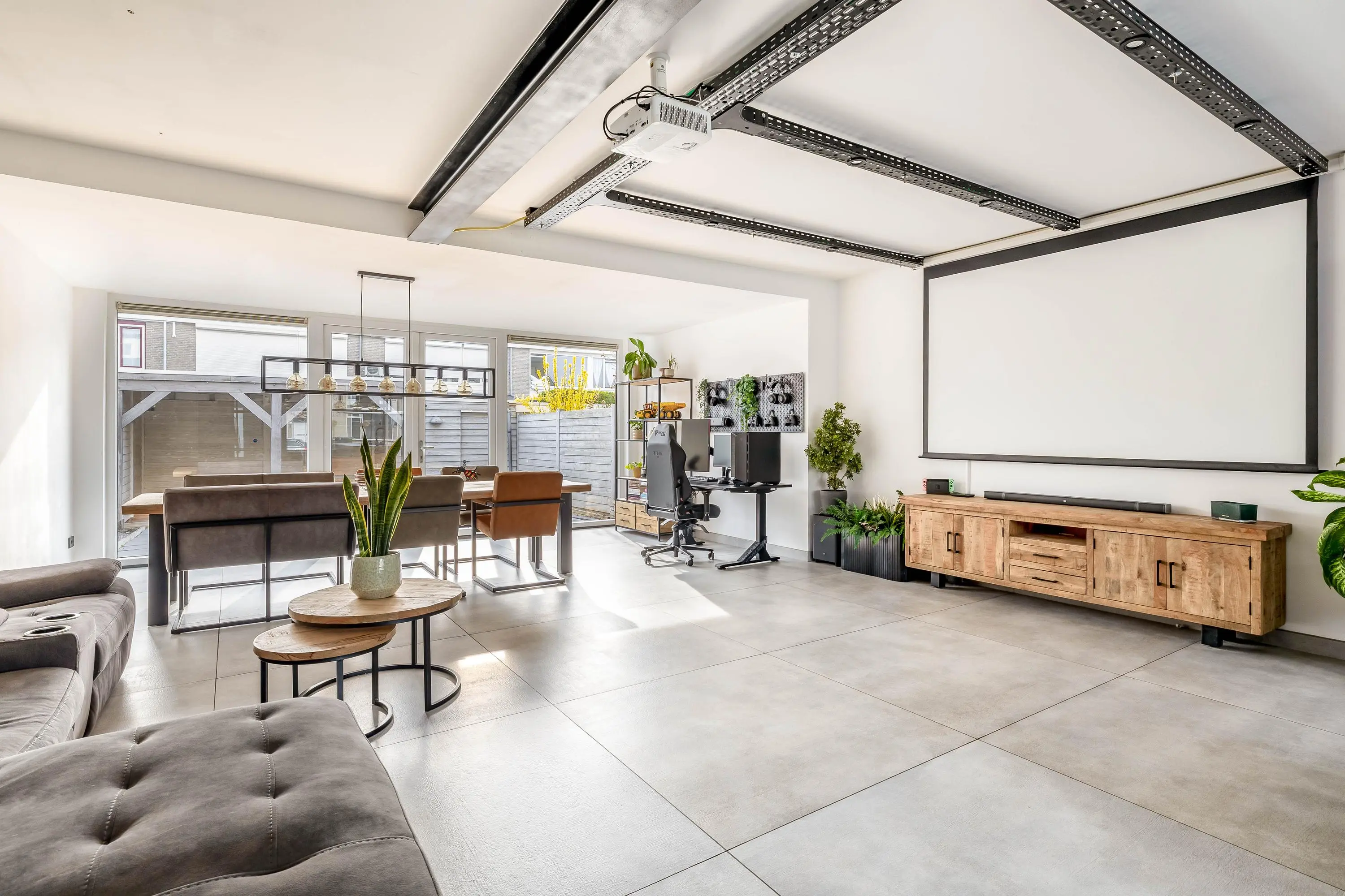 De royale, uitgebouwde living heeft een industriële uitstraling door de zichtbare stalen balk en zwarte kabelgoten aan het plafond. De achterzijde bestaat volledig uit een glazen pui met openslaande deuren naar de tuin, wat zorgt voor een prachtige lichtinval. De woonkamer is momenteel ingericht als home cinema met een groot projectiescherm en beamer. Dankzij de ruime opzet is er voldoende plek voor een aparte zithoek en een ruime eettafel. In de leefruimte bevindt zich tevens de Upstairs trapopgang naar de eerste verdieping met een praktische trapkast, waarbij de trap subtiel wordt geaccentueerd door geïntegreerde verlichting langs de treden.