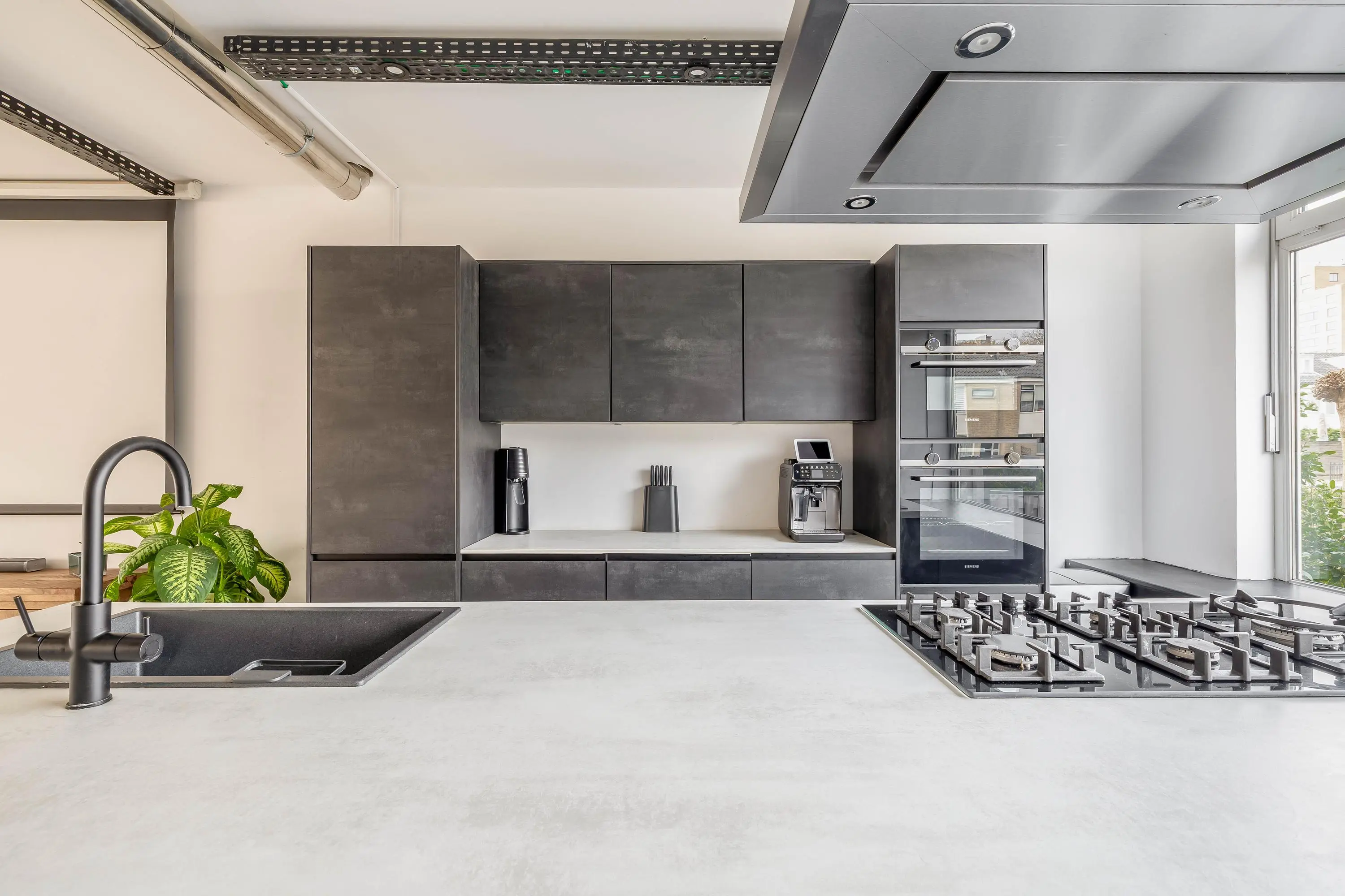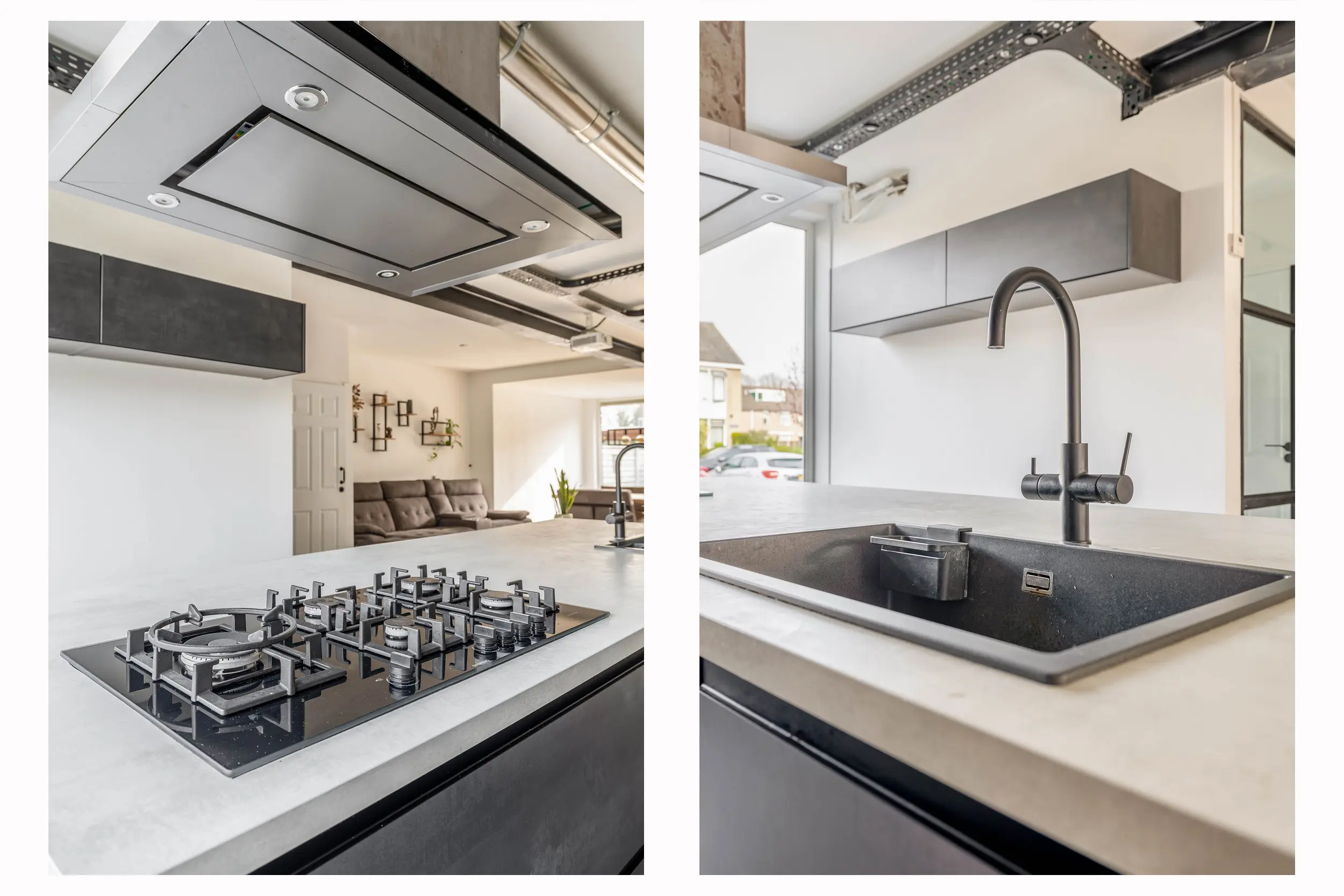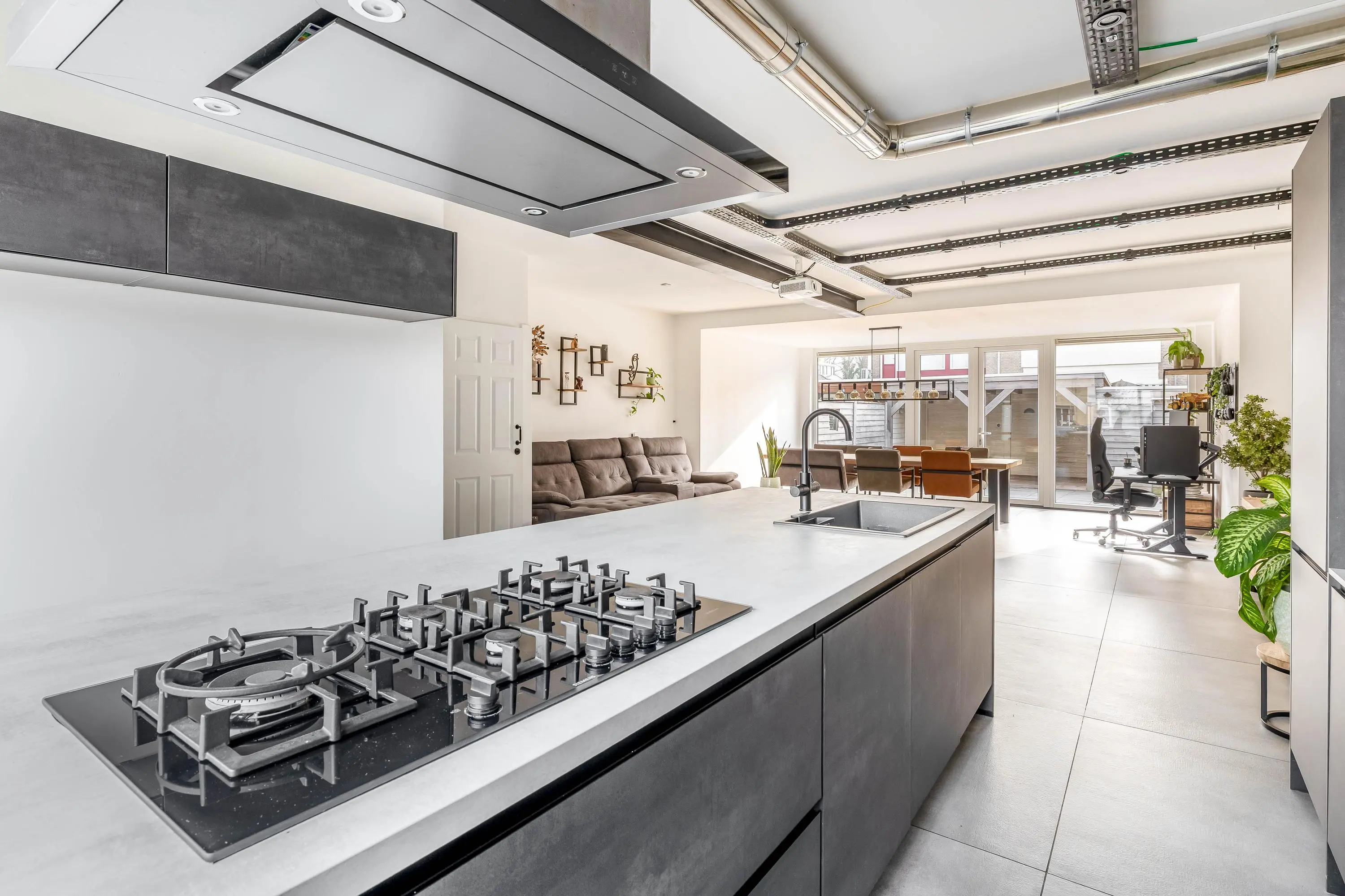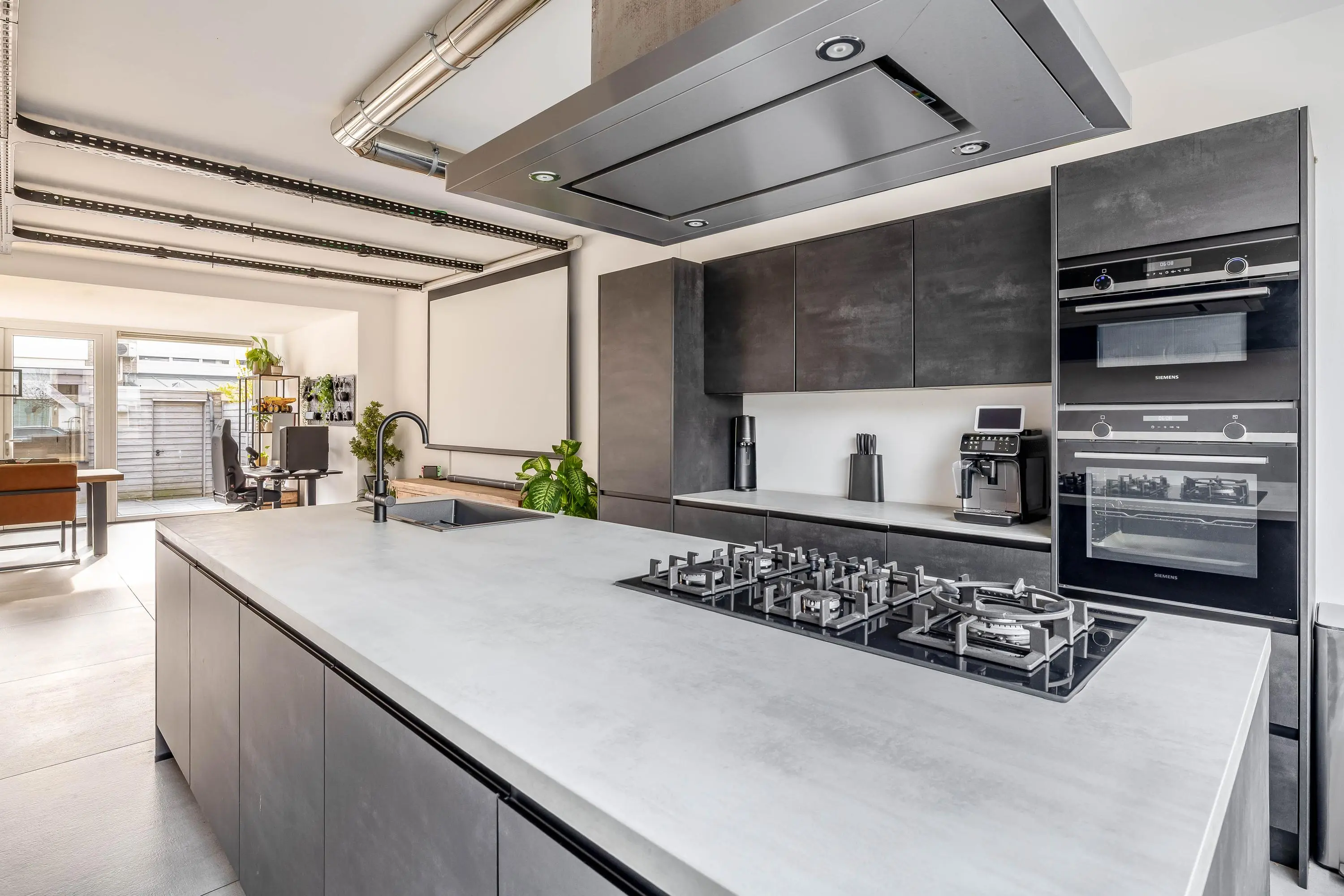 De open designkeuken is een droom voor elke kookliefhebber. Het middelpunt is het riante kookeiland met een strak donker werkblad en een bargedeelte. De gehele keuken is uitgevoerd in dezelfde stijl en sluit naadloos aan op de industriële look van de woning. De keuken is volledig uitgerust met hoogwaardige Siemens inbouwapparatuur, waaronder een 5-pits gaskookplaat, afzuigkap, spoelbak, oven, combi-oven, vaatwasser, Quooker en een koel-/vriescombinatie.