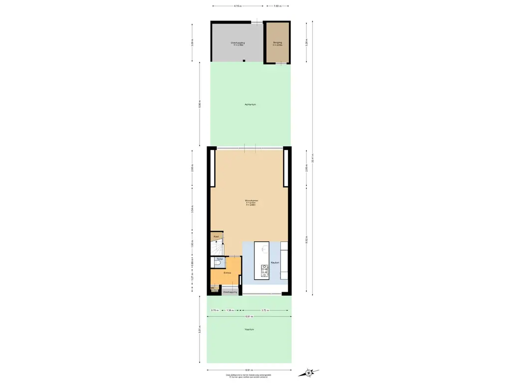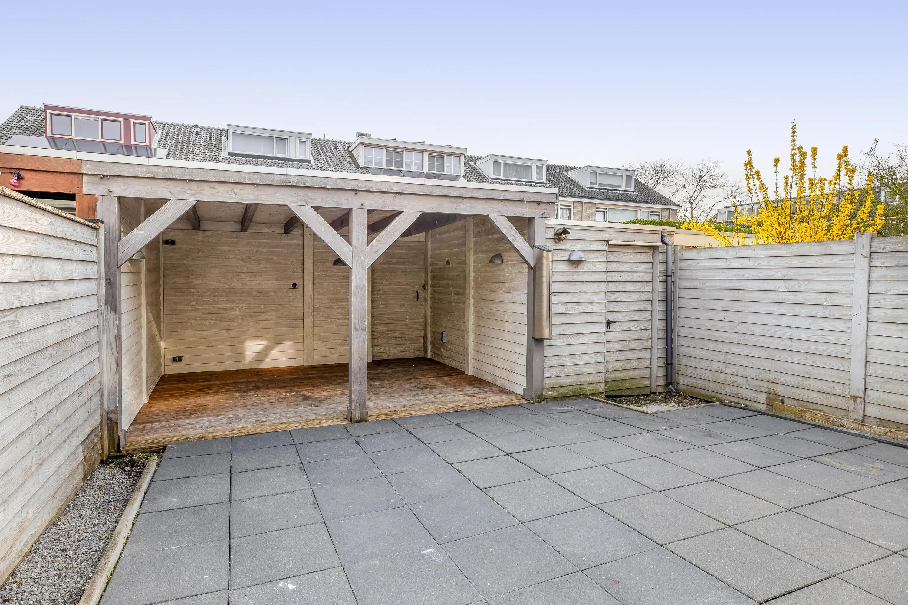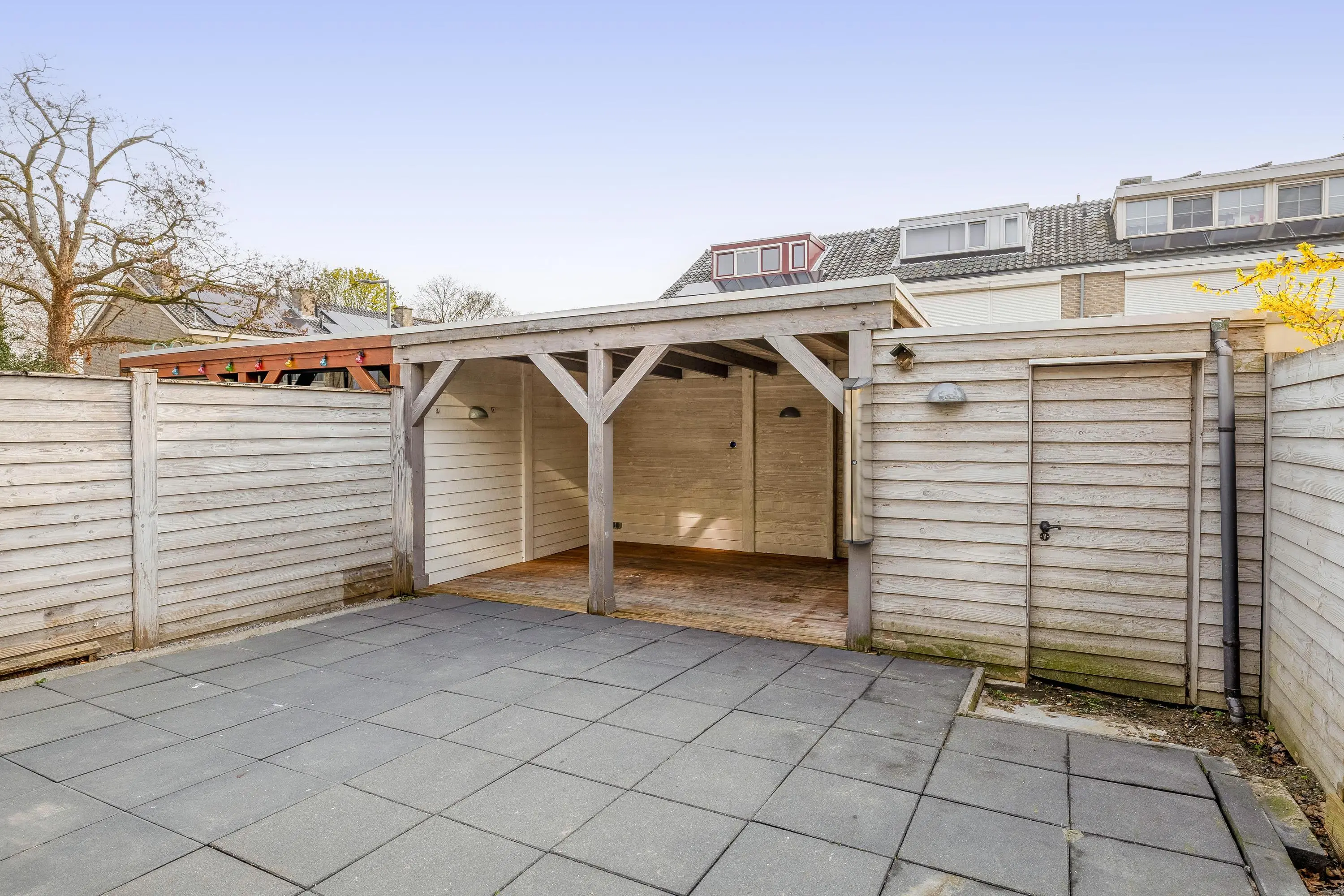 De diepe achtertuin is gelegen op het zonnige zuiden en grotendeels bestraat met donkere tegels. Achterin de tuin bevindt zich een houten berging met daaraan een robuuste overkapping en vlonderterras, ideaal voor een loungehoek. Tevens is de tuin bereikbaar middels een achterom.