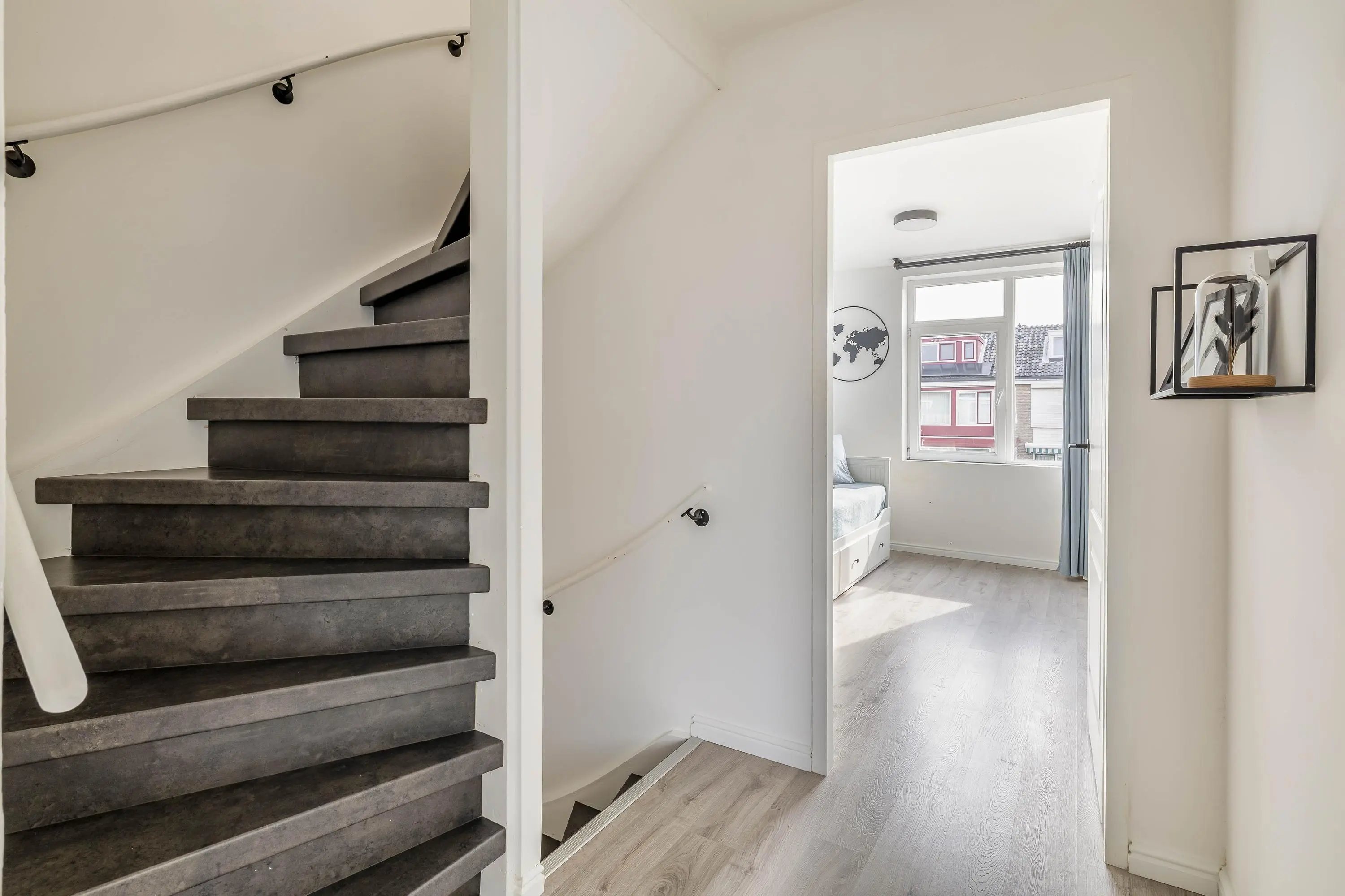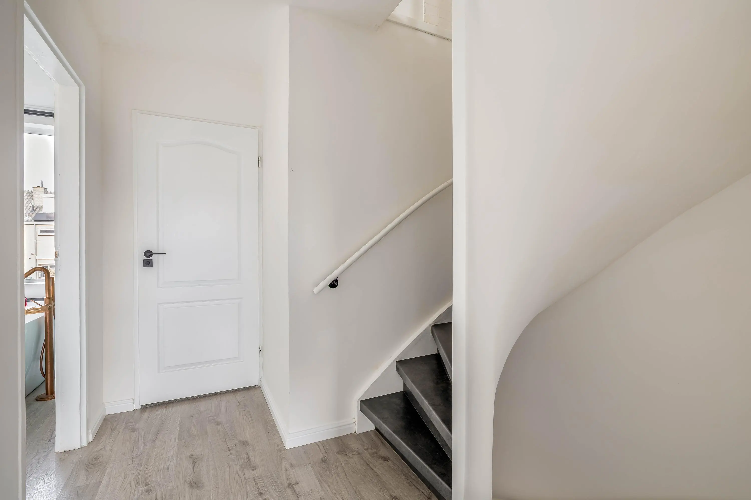 De overloop, voorzien van een nette laminaatvloer die naadloos doorloopt in de slaapkamers, biedt toegang tot de slaapkamers en de badkamer. De trap van de eerste naar de tweede verdieping is eveneens in dezelfde stijl uitgevoerd en voorzien van geïntegreerde verlichting.